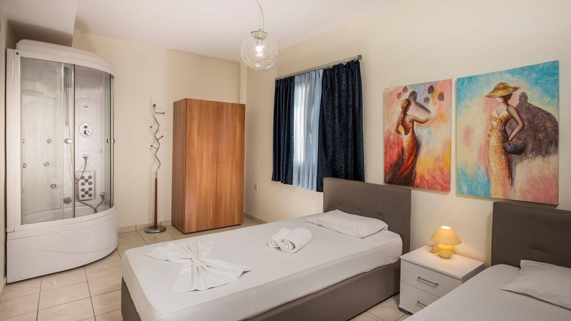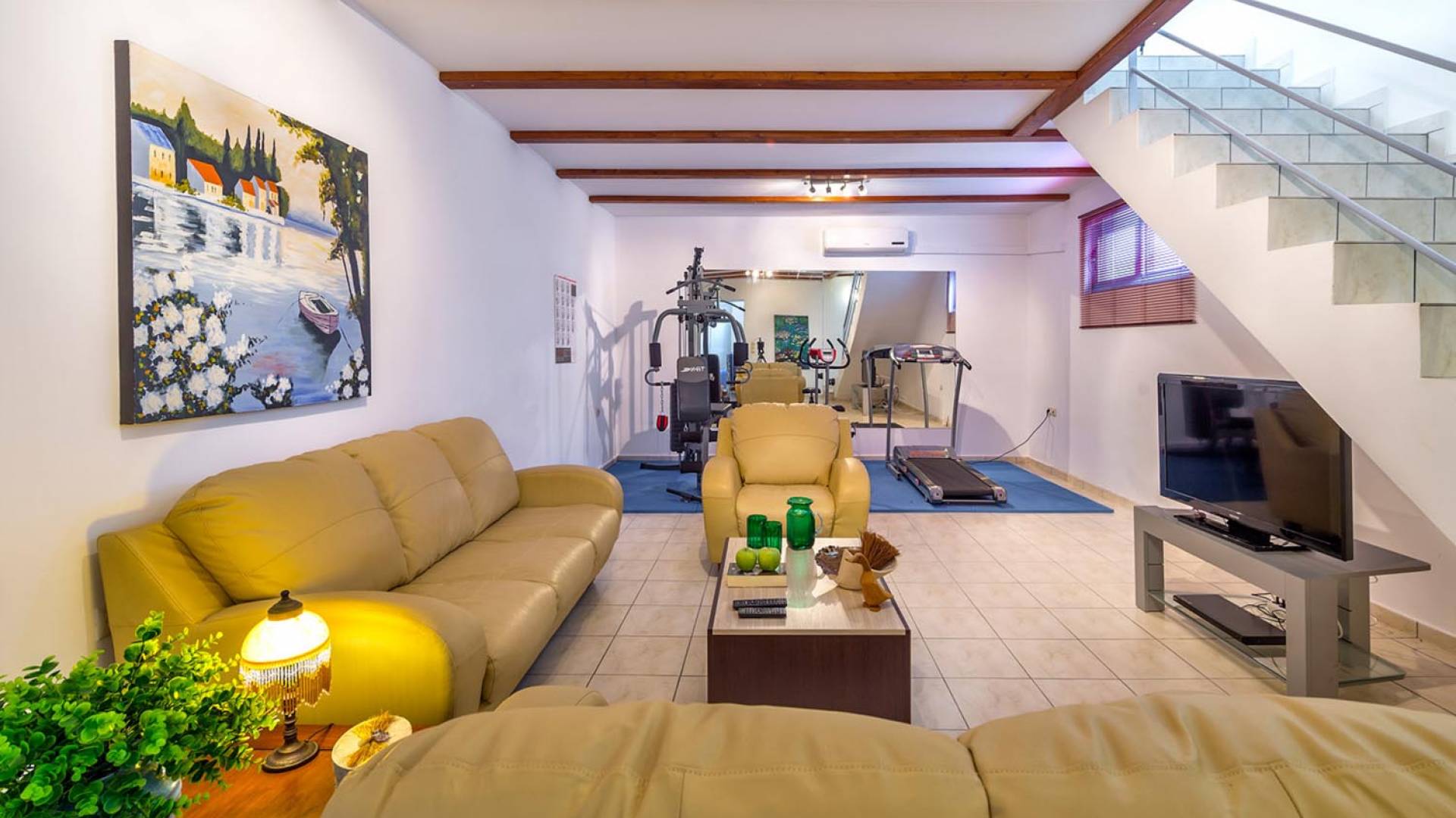 At the basement we can see internal/external stair case, glass window and door, luxury sitting room, bar, satellite TV, DVD player, two bed/double bed room with air blower. All rooms and spaces are air conditioned. Pollo Villas Chania are a great choice for family or friends holidays in Crete island. With nice decoration, private pool, all mod cons and this unique location, near to the sandy beach, are the best value for money villas in West Crete.