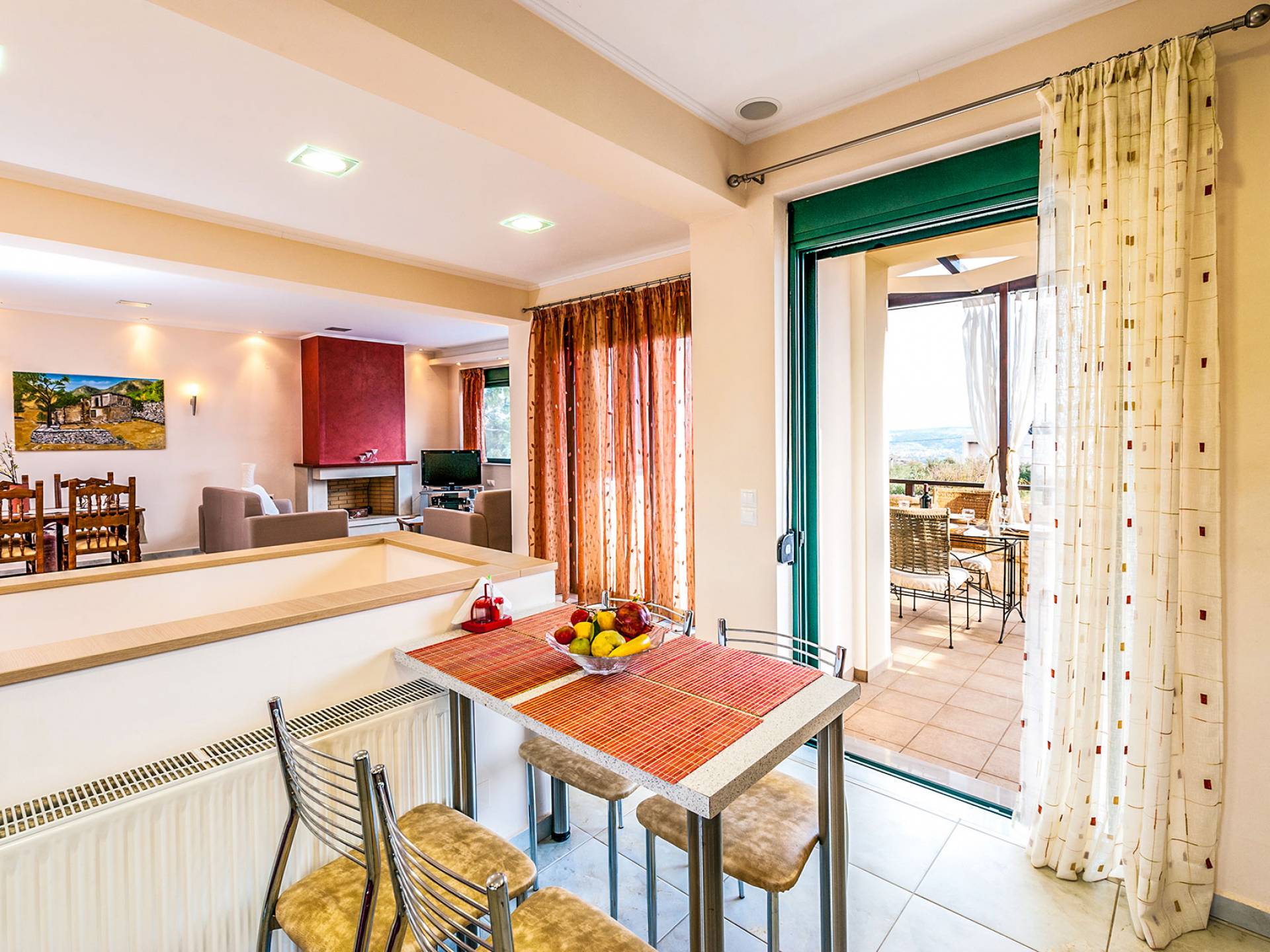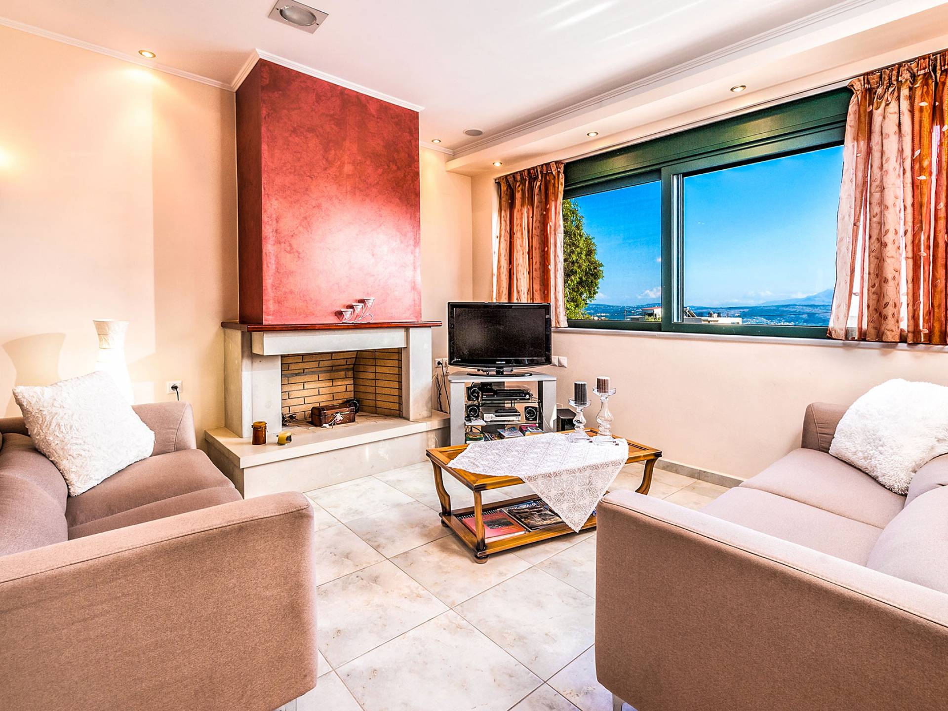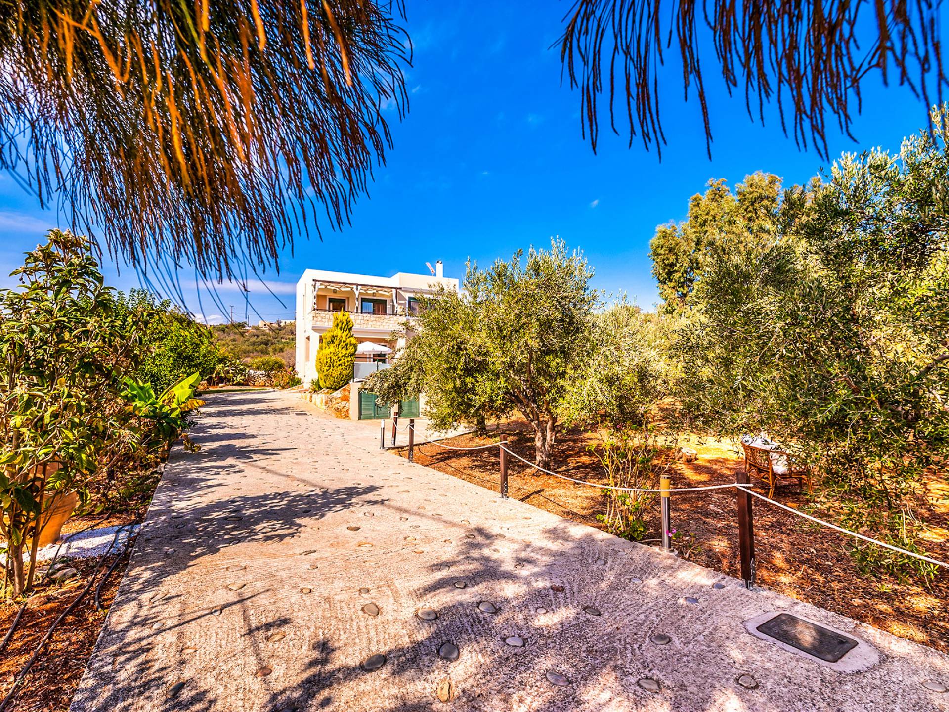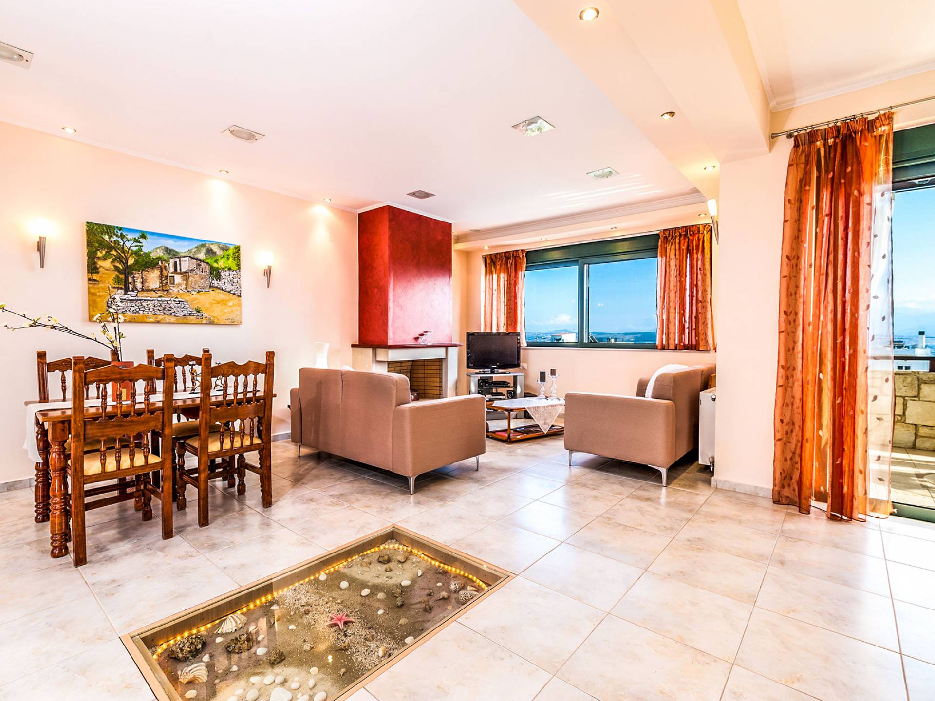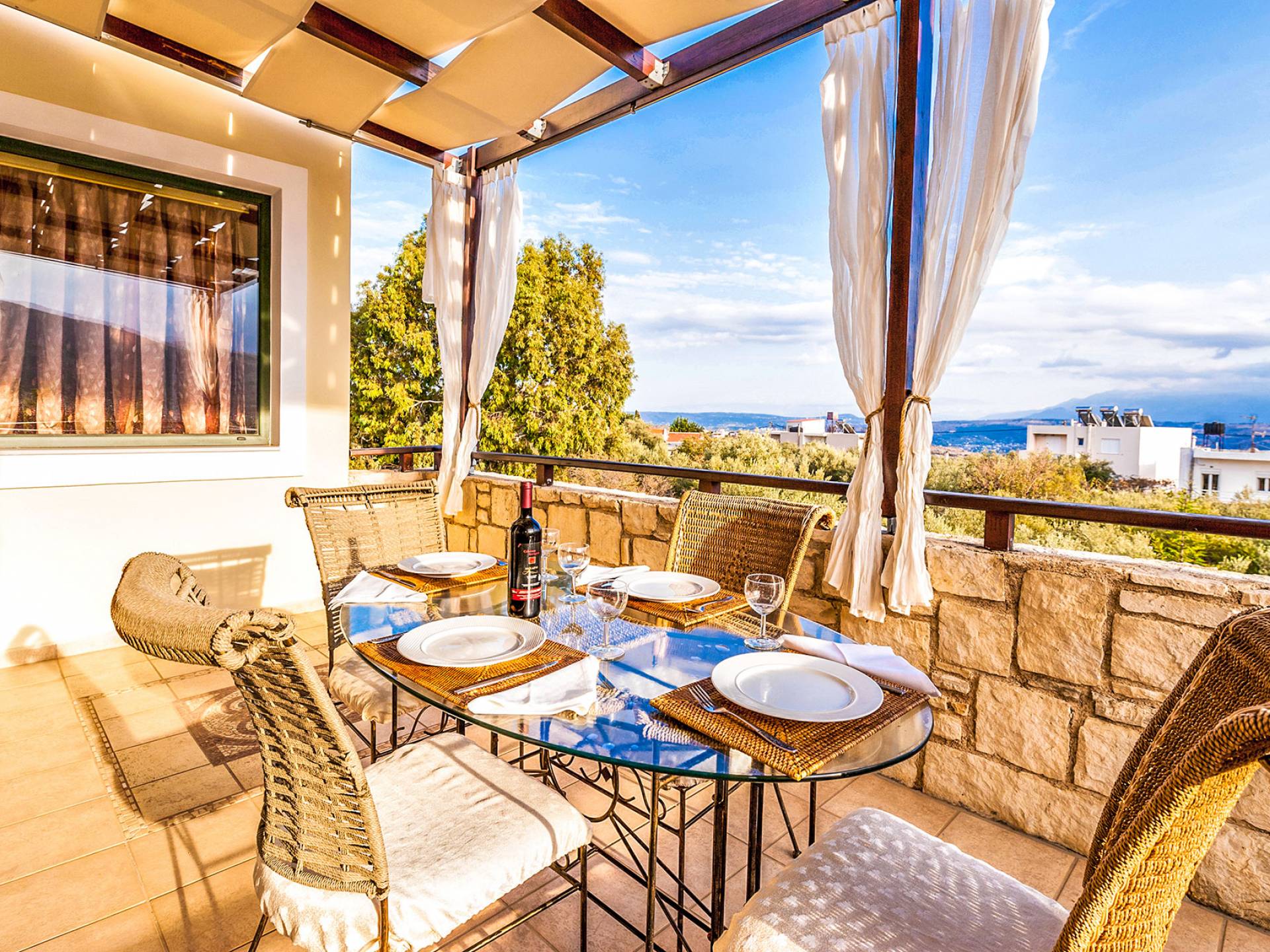 The upper floor: With an open plan space, consists out of a roomy sitting room with fireplace, a dining area, one WC and a modern kitchen fully-equipped with a big refrigerator, an electric kitchen, a dish-washing machine, and a dining table. Furthermore, it has a large veranda with an amazing mountain view. Rena Villa Chania is located just 4 km away from the sandy beach of Kalives. Also a small beach, Kalami beach is just 2km from the villa. Traditional tavernas and mini-markets are less than a five-minute walk away. Additionally, the ancient town of Aptera has located a 15-minute walk away.