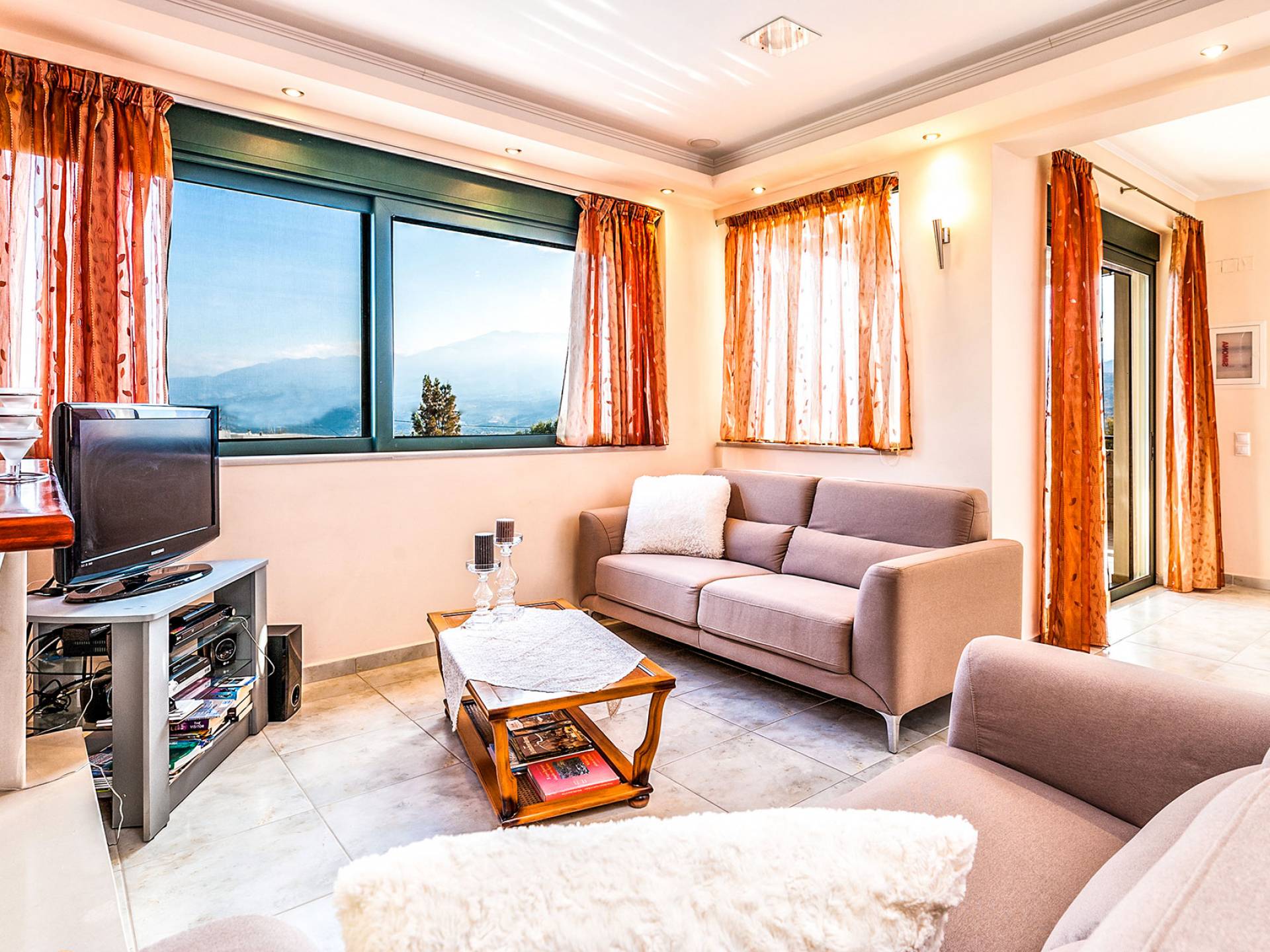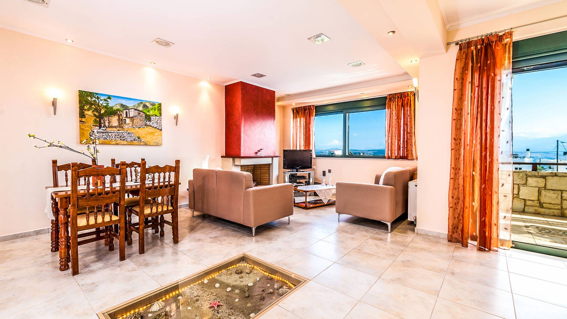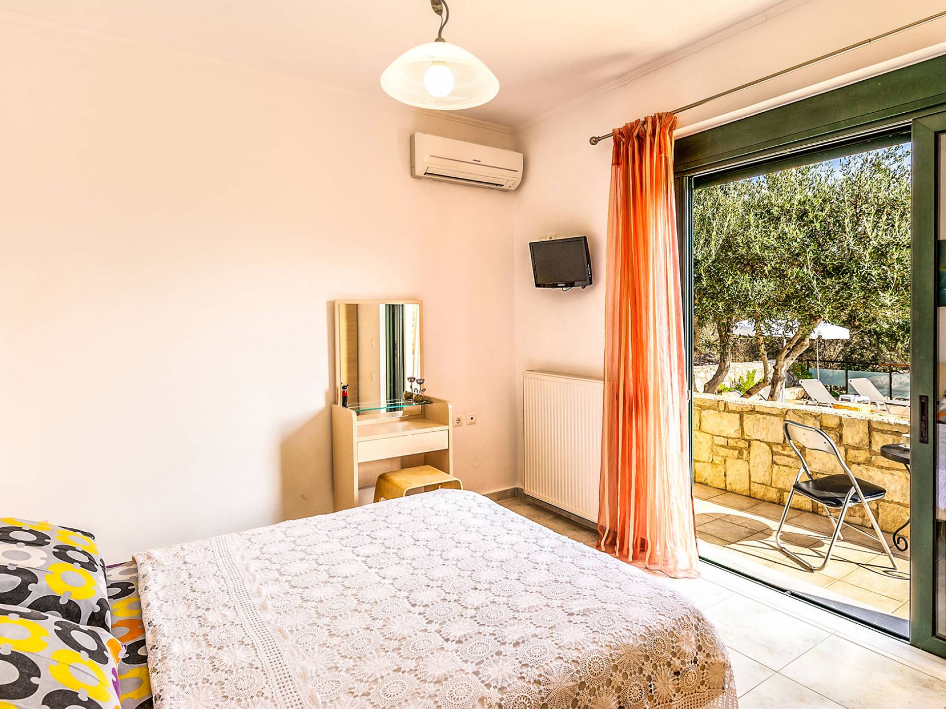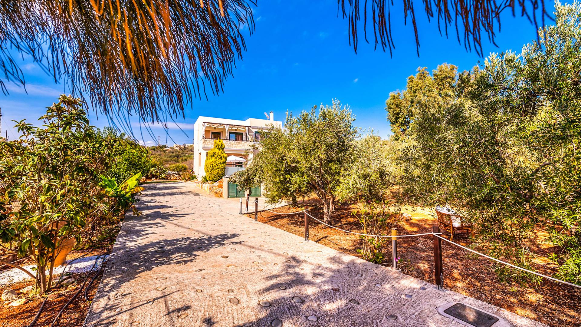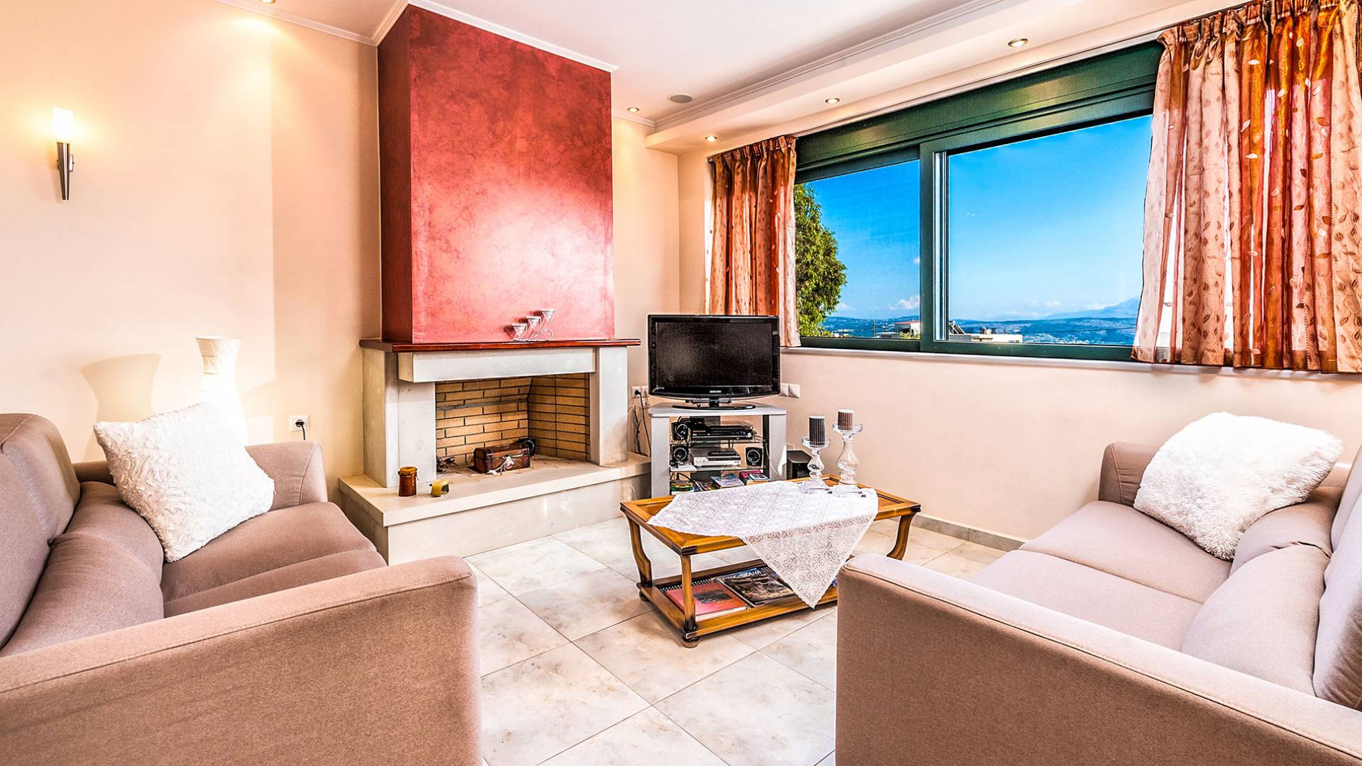 The upper floor: With an open plan space, consists out of a roomy sitting room with fireplace, a dining area, one WC and a modern kitchen fully-equipped with a big refrigerator, an electric kitchen, a dish-washing machine, and a dining table. Furthermore, it has a large veranda with an amazing mountain view. Rena Villa Chania is located just 4 km away from the sandy beach of Kalives. Also a small beach, Kalami beach is just 2km from the villa. Traditional tavernas and mini-markets are less than a five-minute walk away. Additionally, the ancient town of Aptera has located a 15-minute walk away.