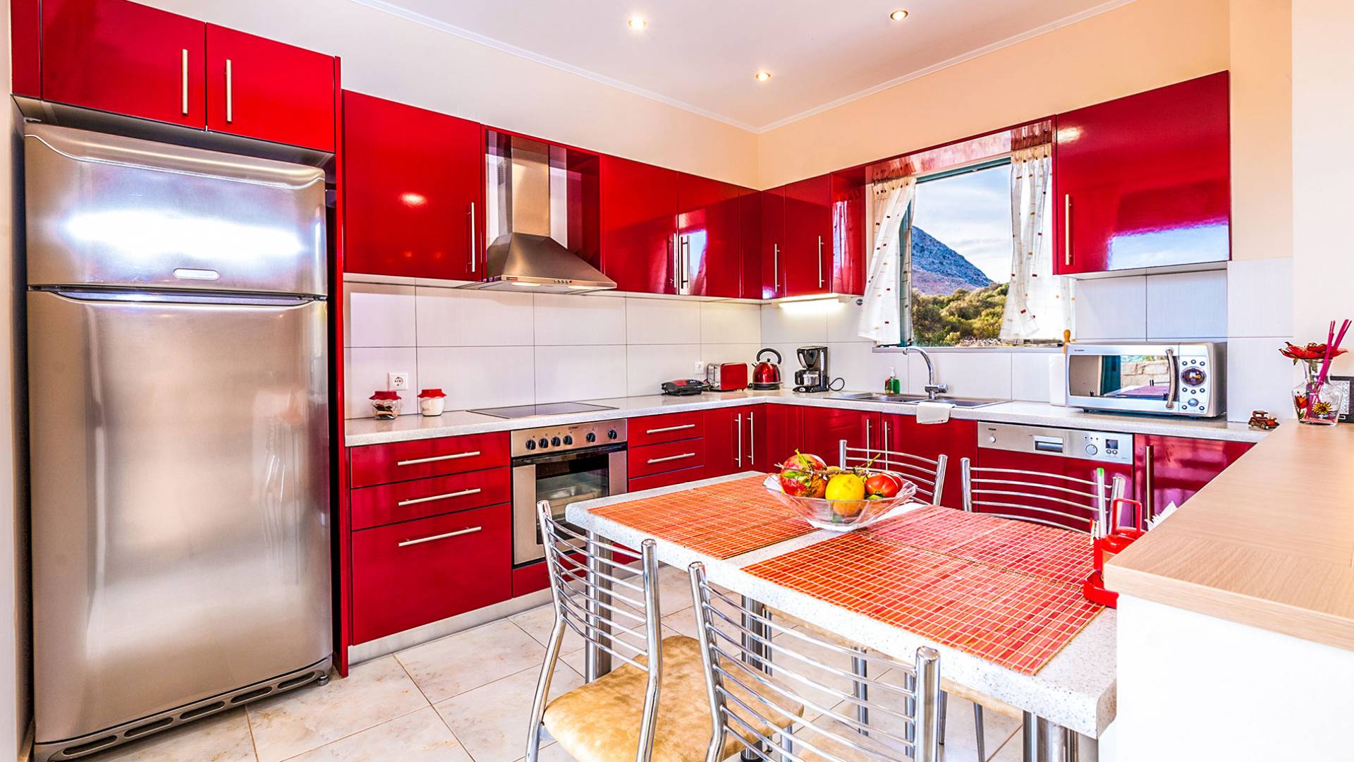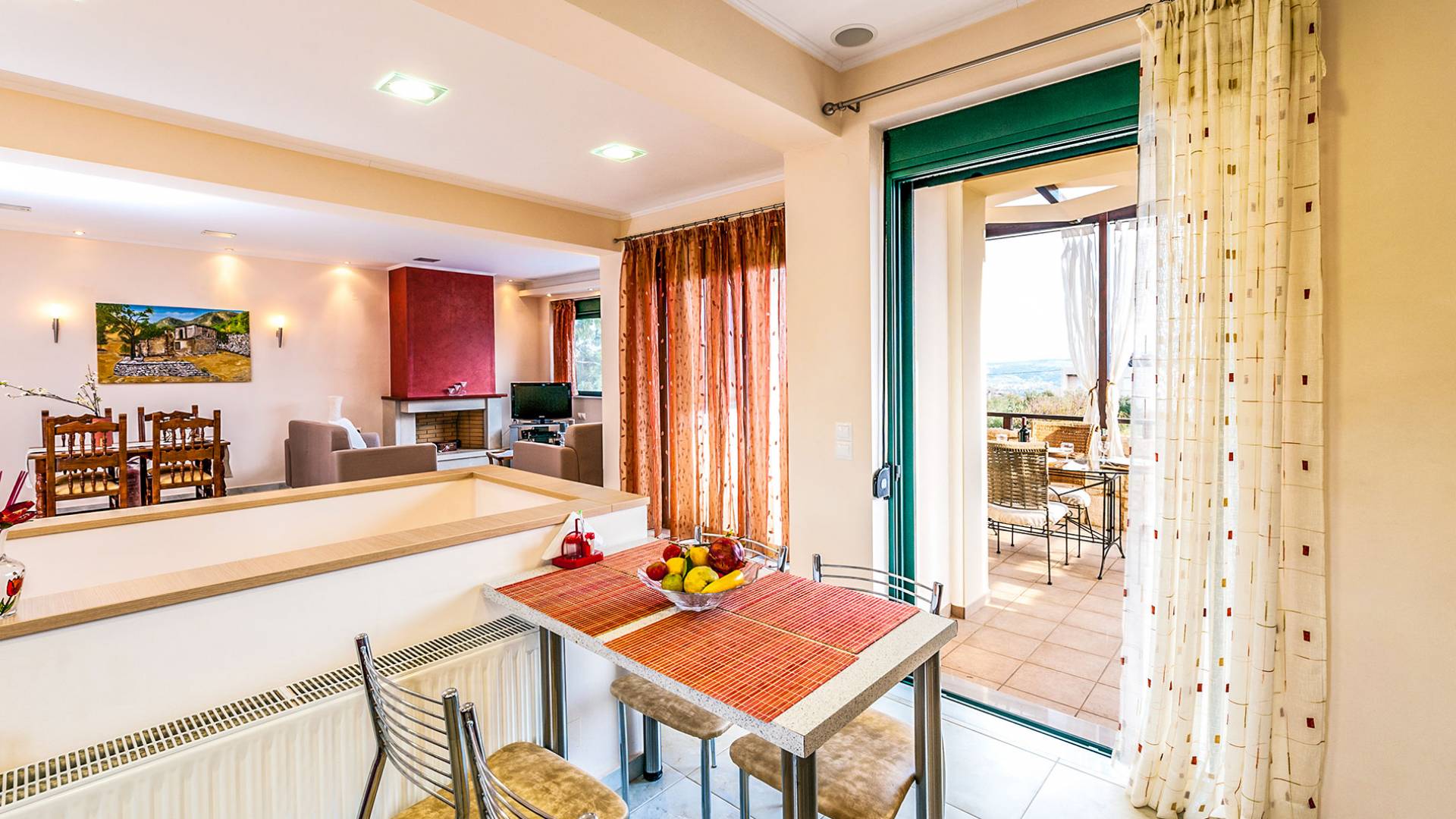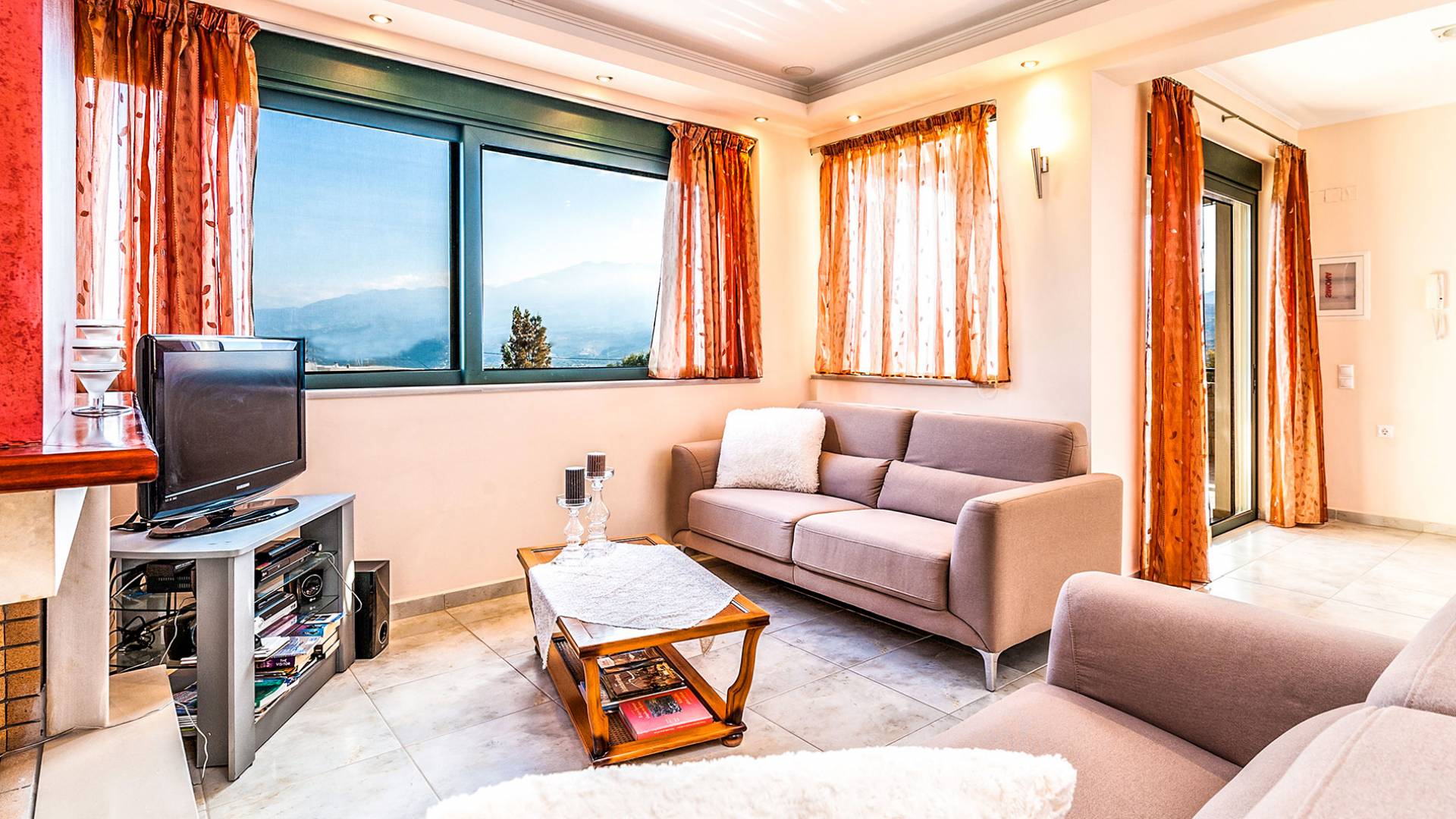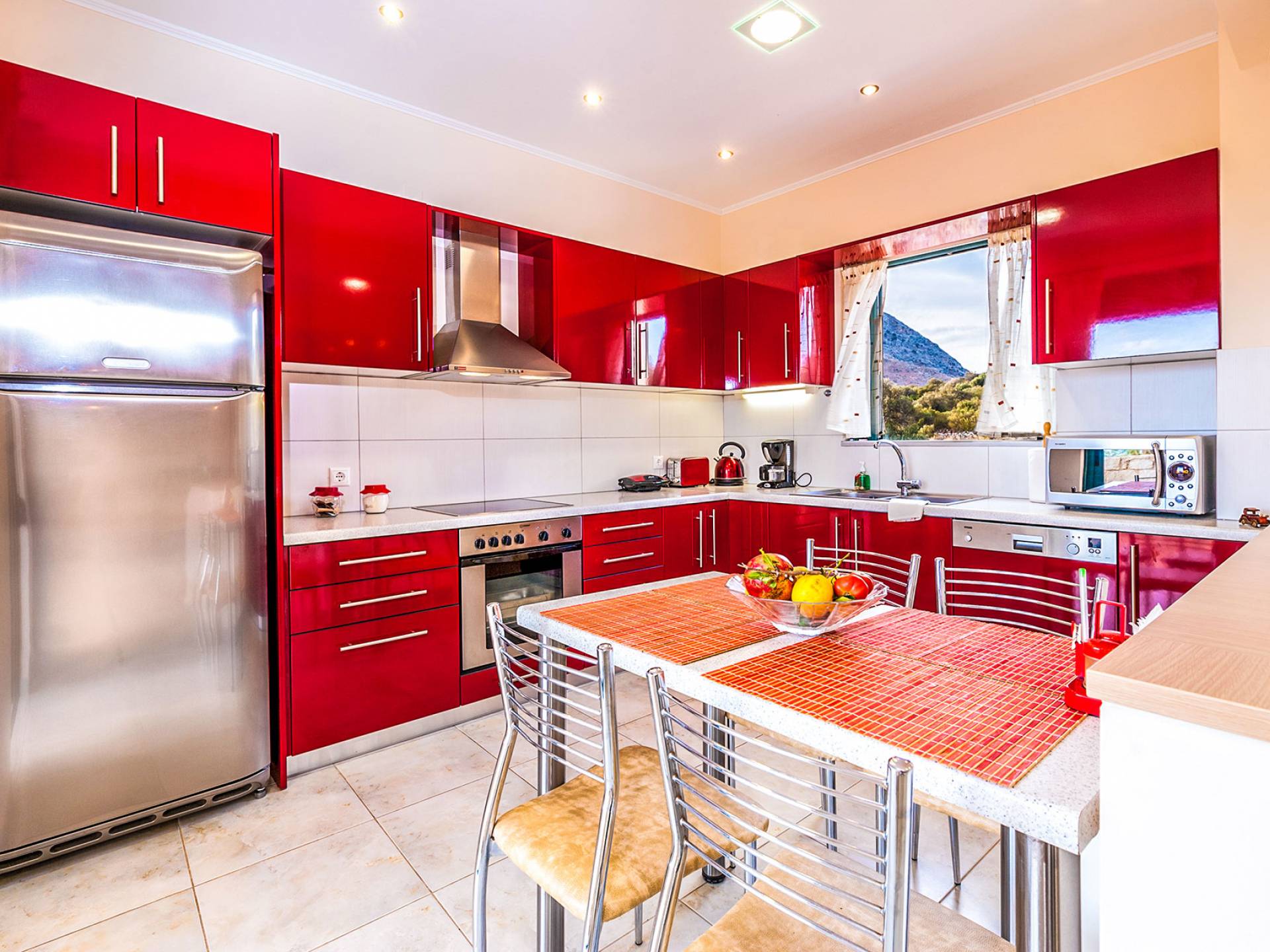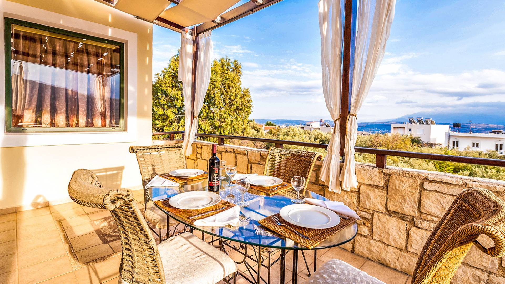 The upper floor: With an open plan space, consists out of a roomy sitting room with fireplace, a dining area, one WC and a modern kitchen fully-equipped with a big refrigerator, an electric kitchen, a dish-washing machine, and a dining table. Furthermore, it has a large veranda with an amazing mountain view. Rena Villa Chania is located just 4 km away from the sandy beach of Kalives. Also a small beach, Kalami beach is just 2km from the villa. Traditional tavernas and mini-markets are less than a five-minute walk away. Additionally, the ancient town of Aptera has located a 15-minute walk away.