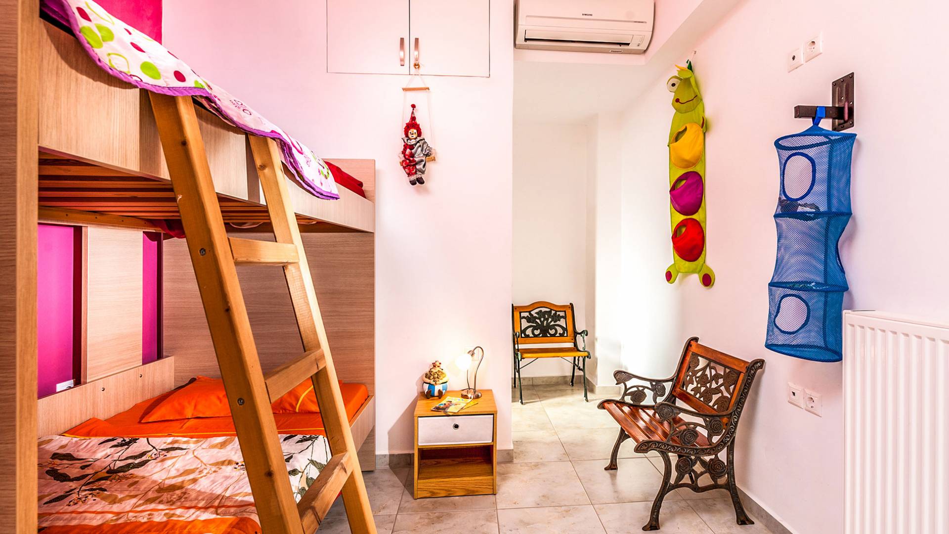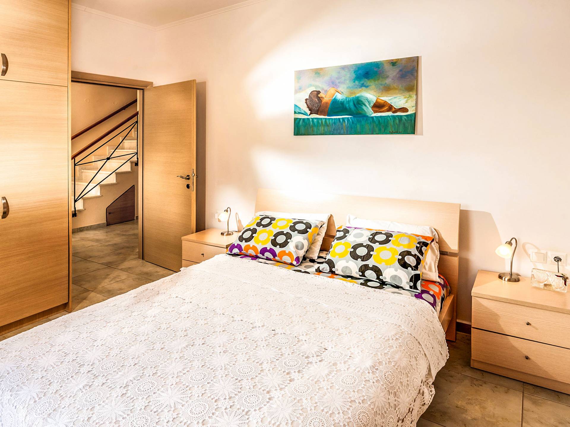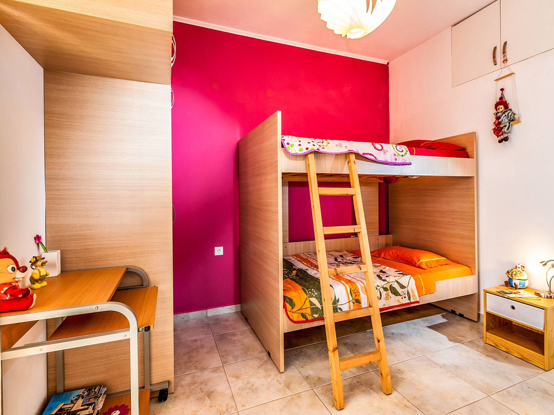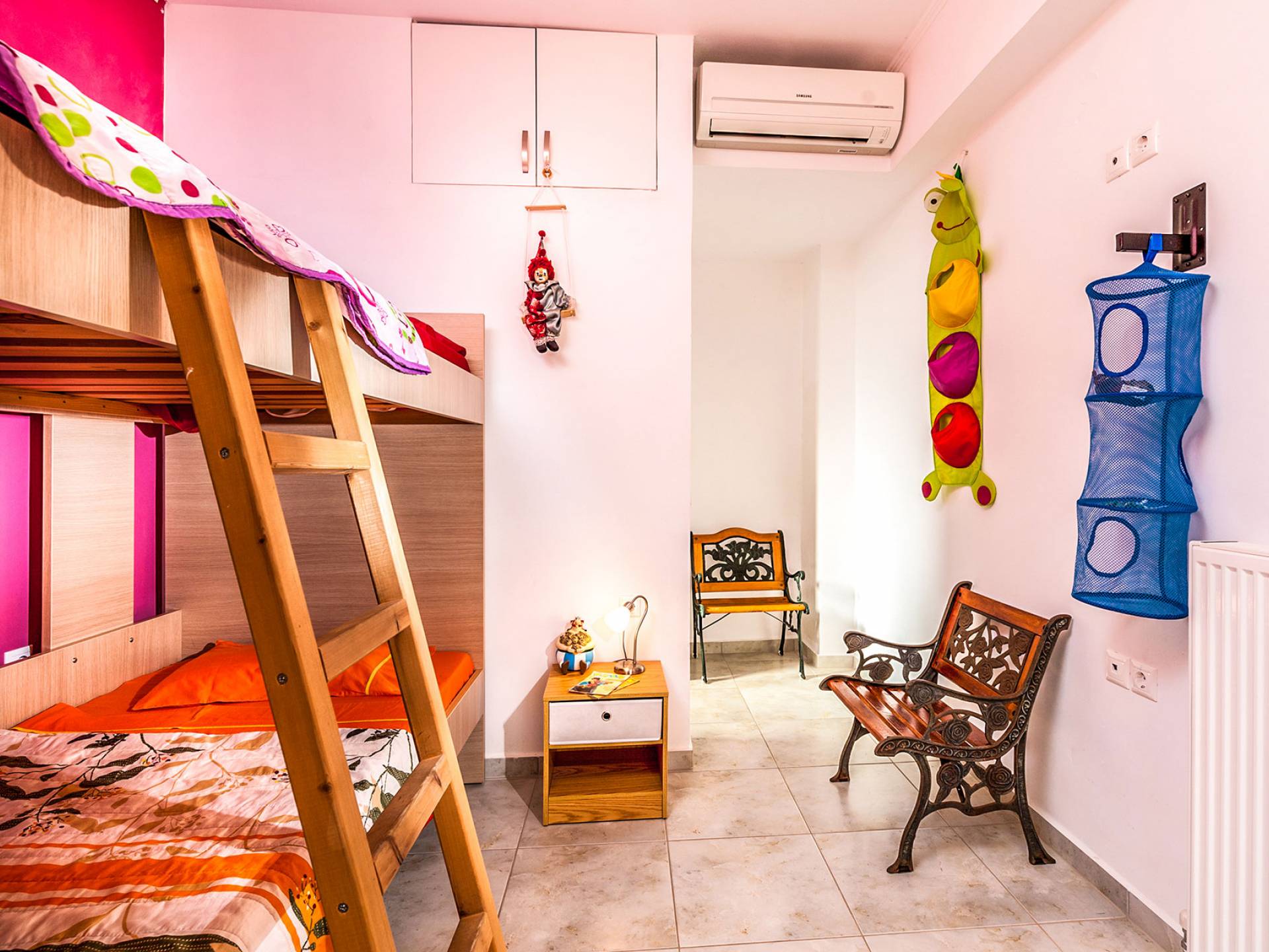 The ground floor: Has two cozy double bedrooms, each with a private balcony, one child bedroom with two beds, and two bathrooms. All bedrooms have air-conditioned.