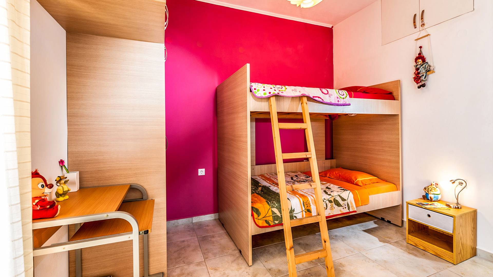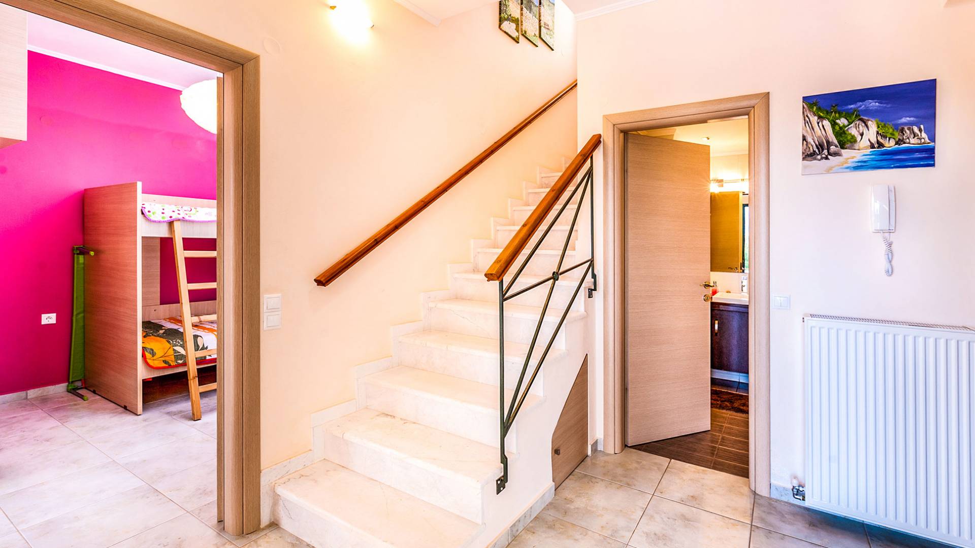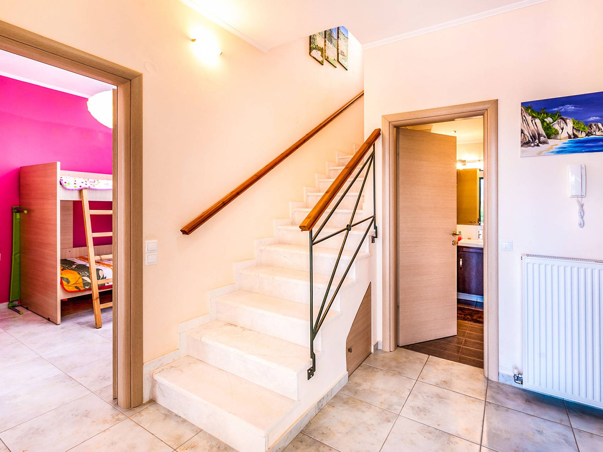 The ground floor: Has two cozy double bedrooms, each with a private balcony, one child bedroom with two beds, and two bathrooms. All bedrooms have air-conditioned.