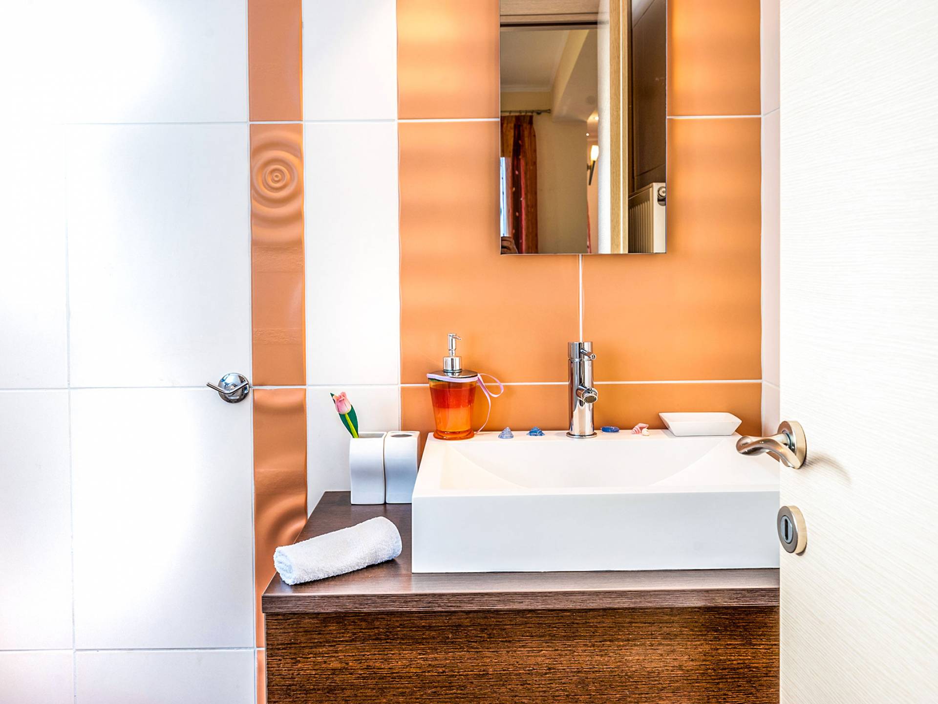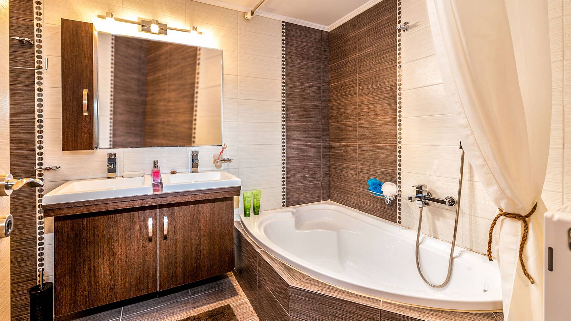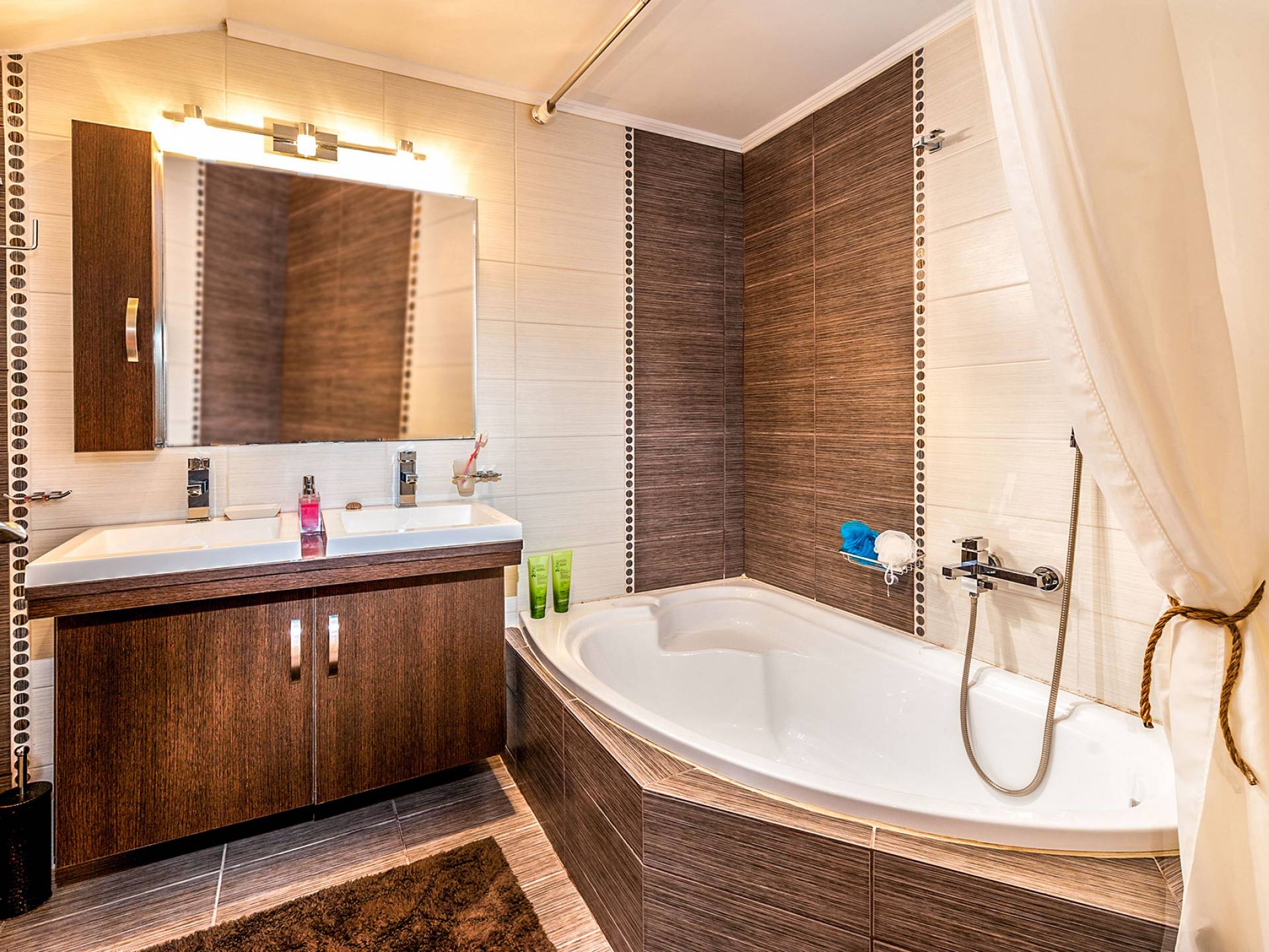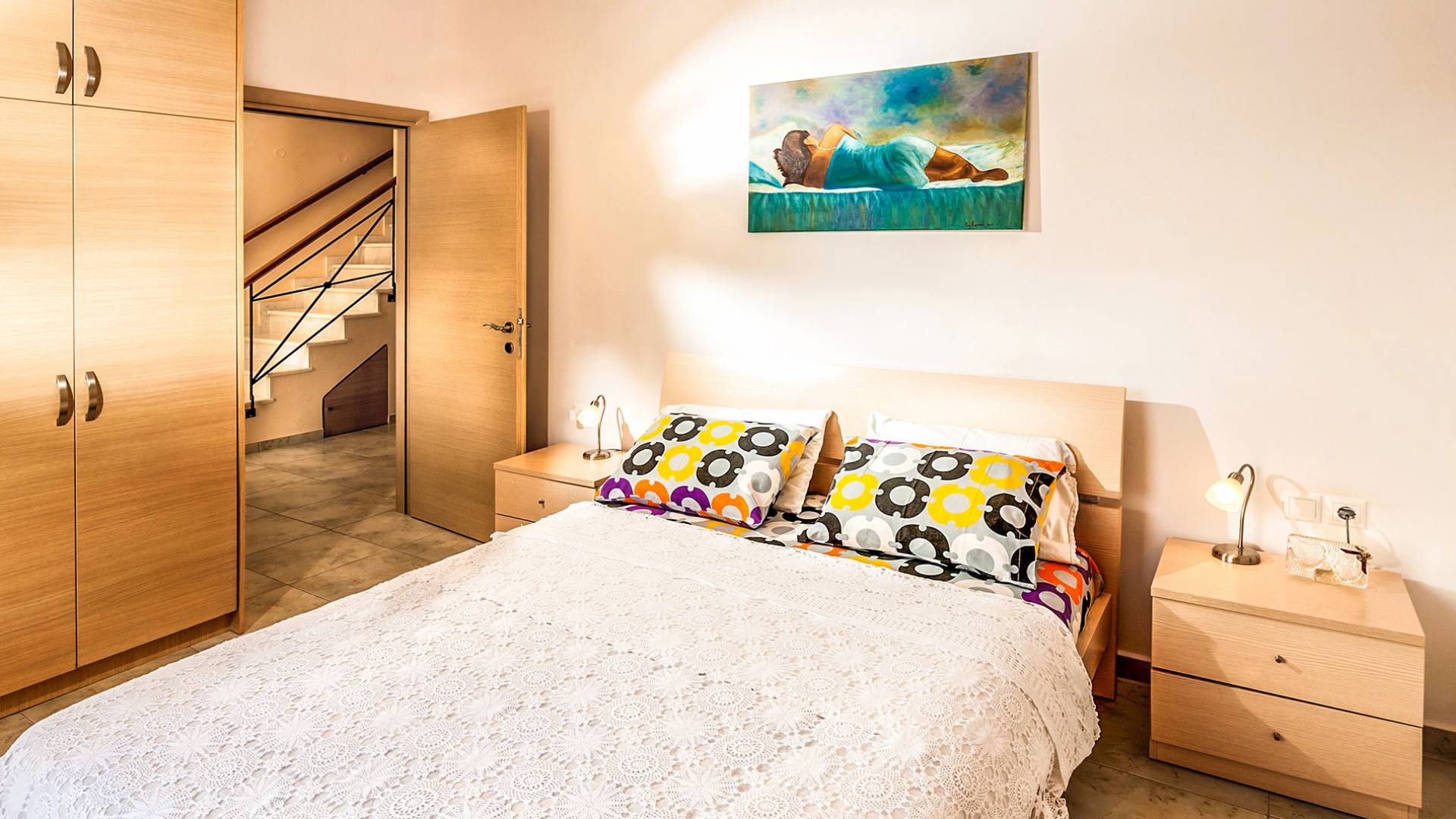 The ground floor: Has two cozy double bedrooms, each with a private balcony, one child bedroom with two beds, and two bathrooms. All bedrooms have air-conditioned.
