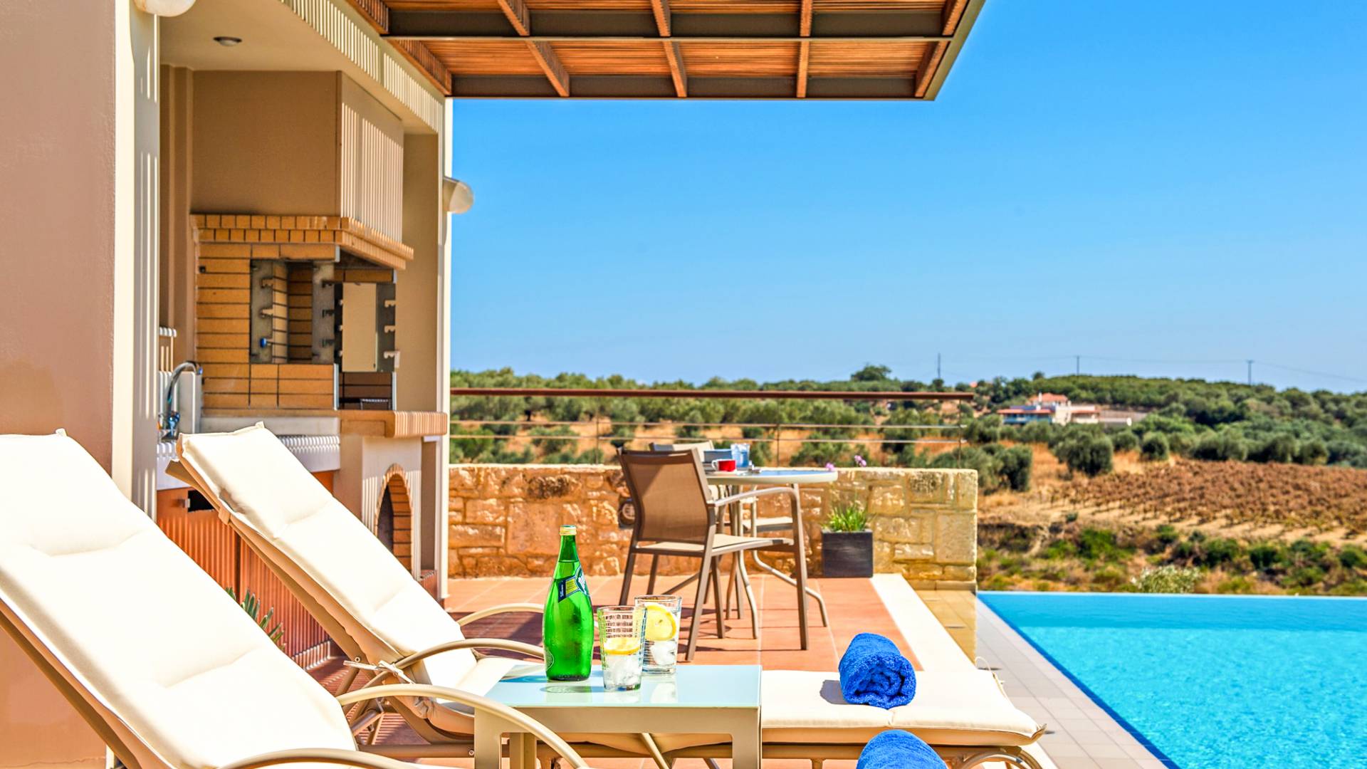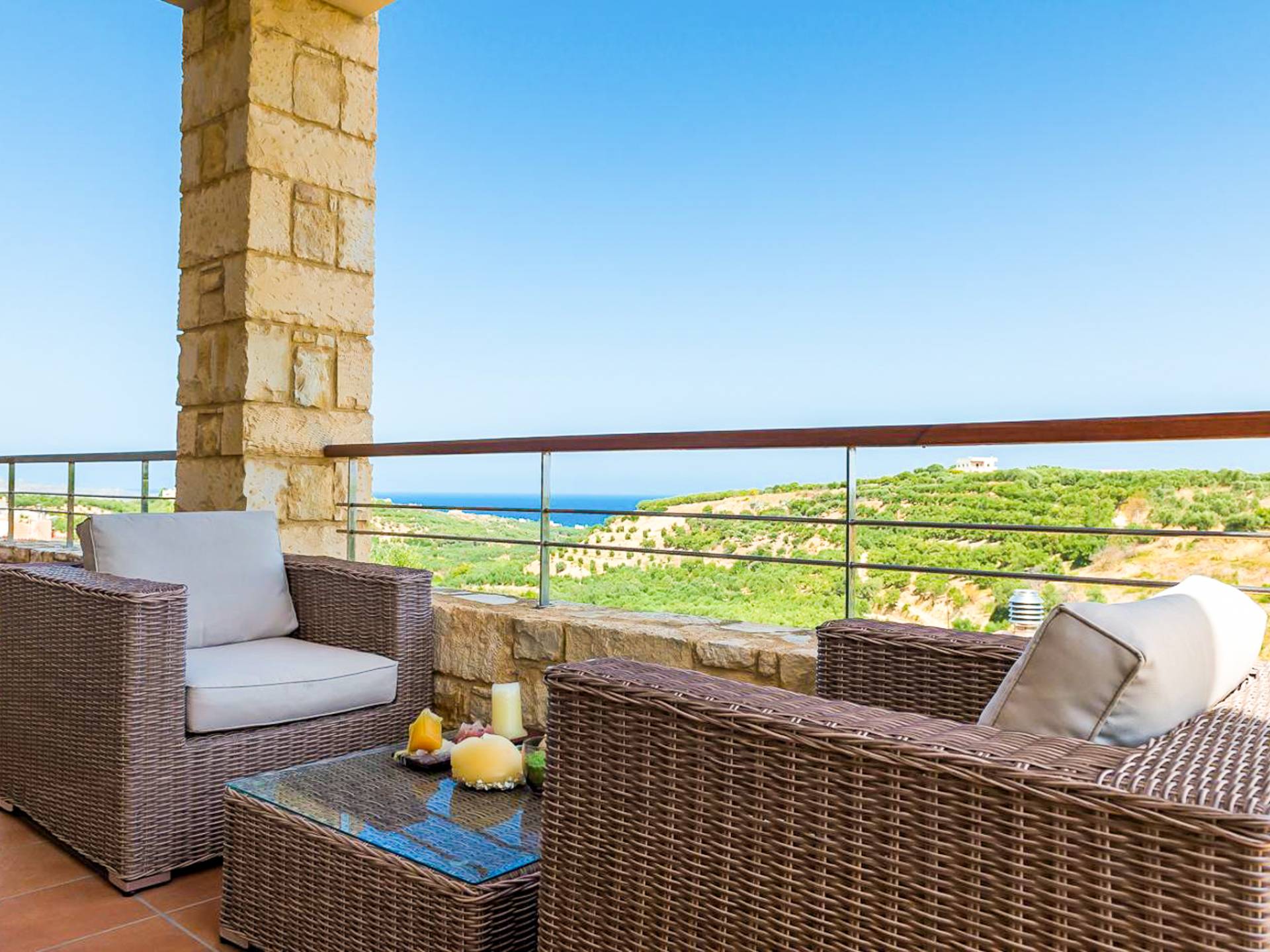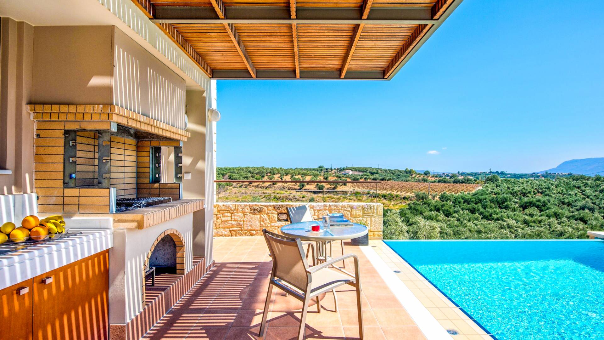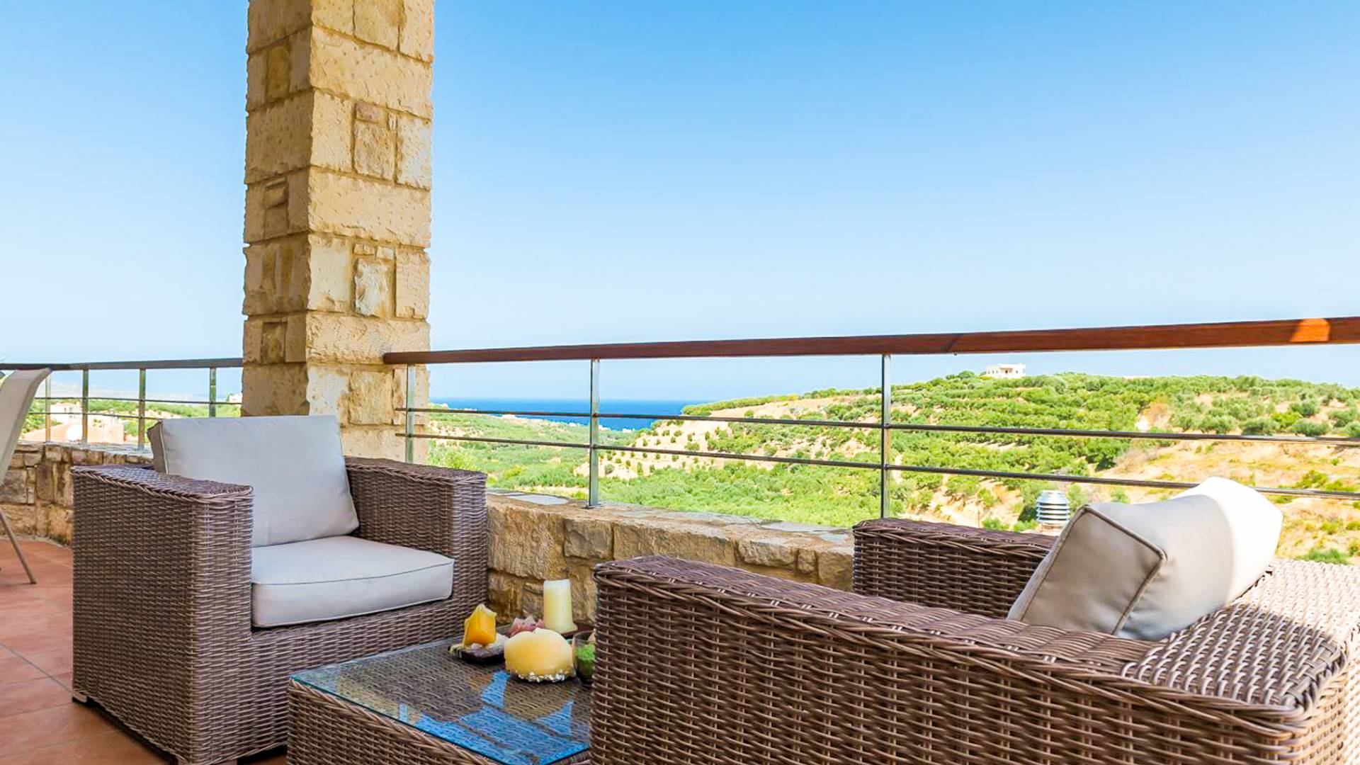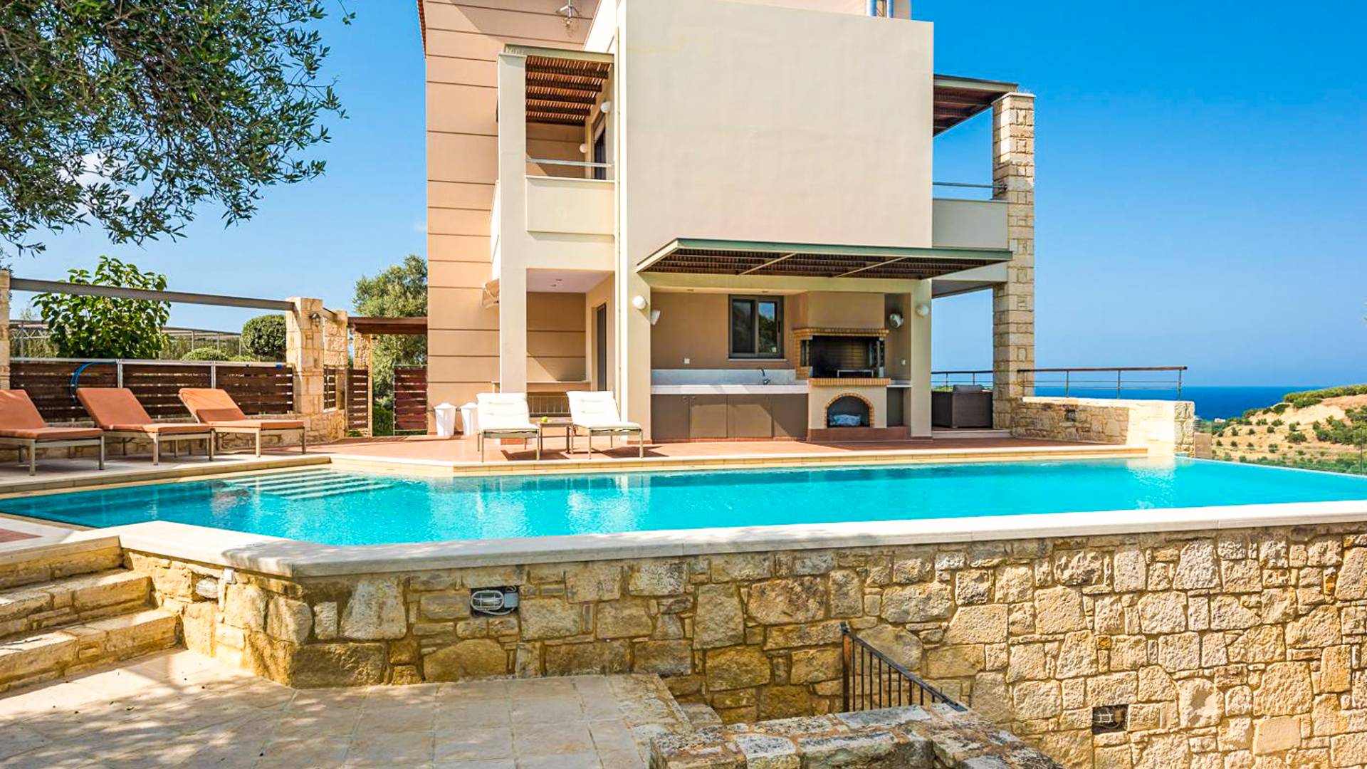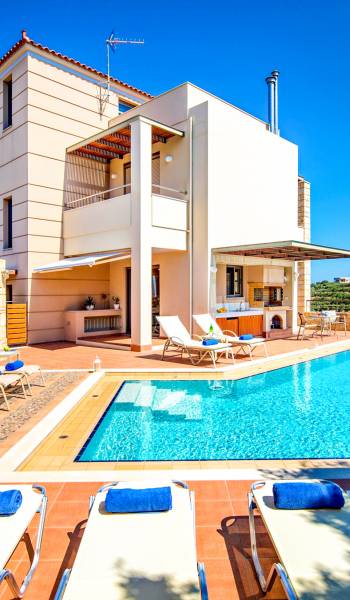 Scenery Villa 1 Chania Crete - 5BR hilltop villa w/ private pool, BBQ, sea views & organic garden. Peaceful setting, 5' to Agia Marina beach & near Chania.