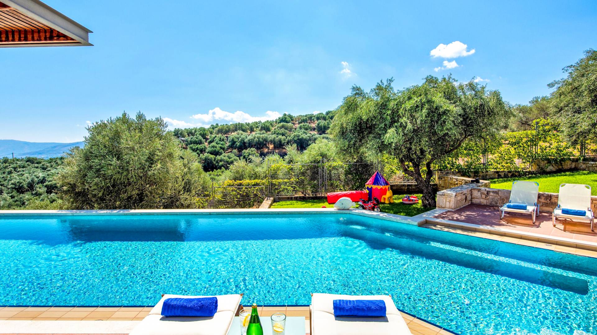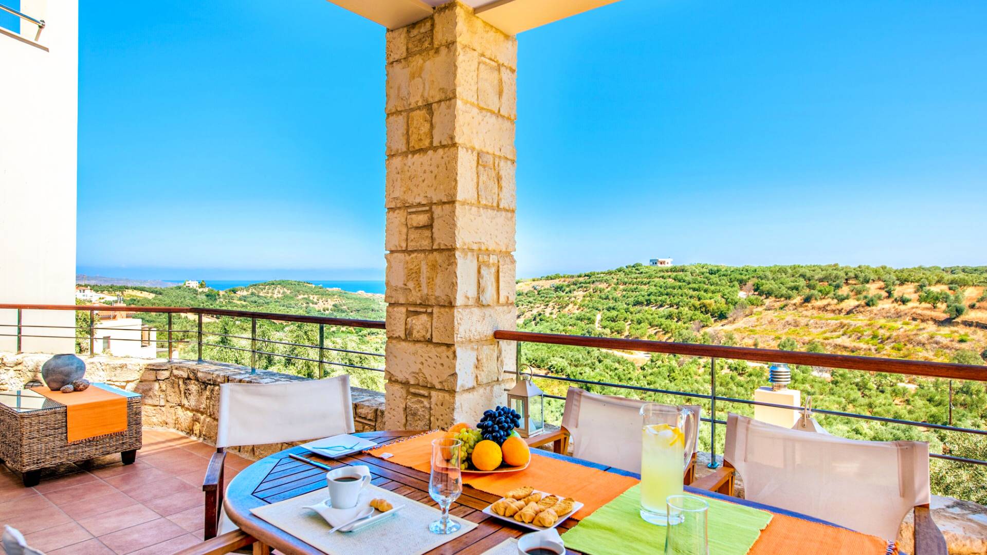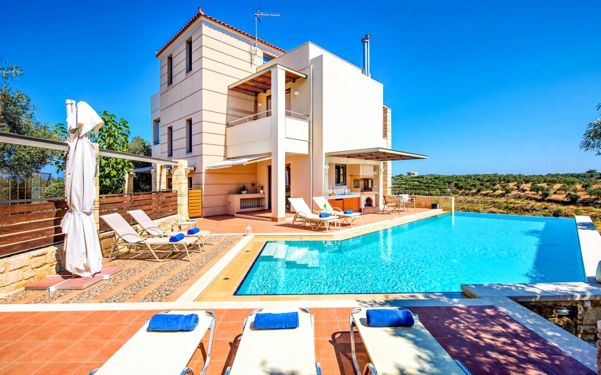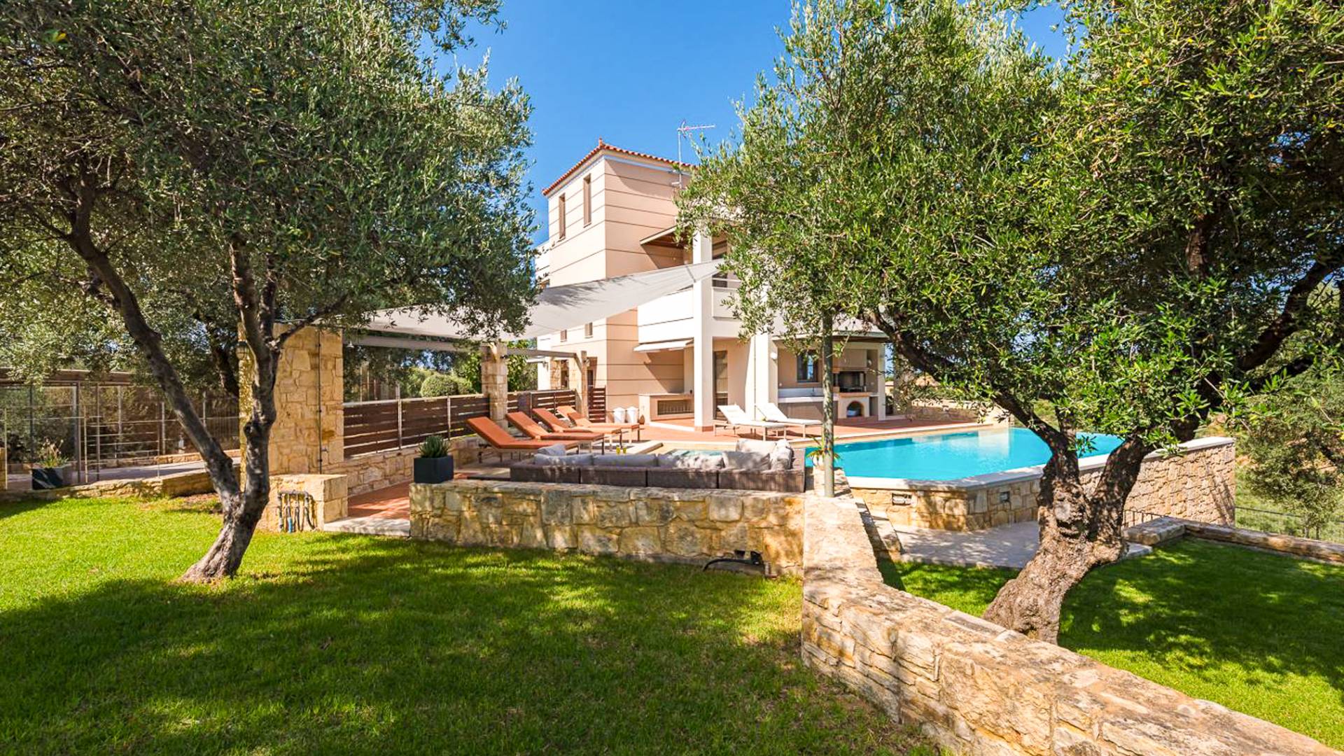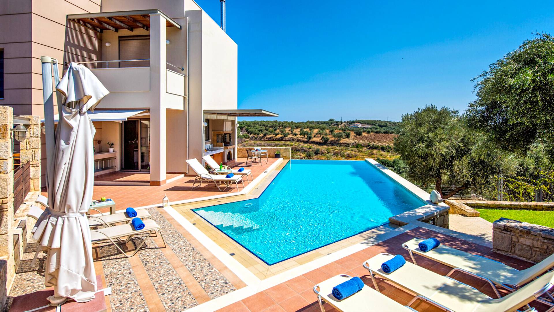 Scenery Villa 1 Chania Crete - 5BR hilltop villa w/ private pool, BBQ, sea views & organic garden. Peaceful setting, 5' to Agia Marina beach & near Chania.