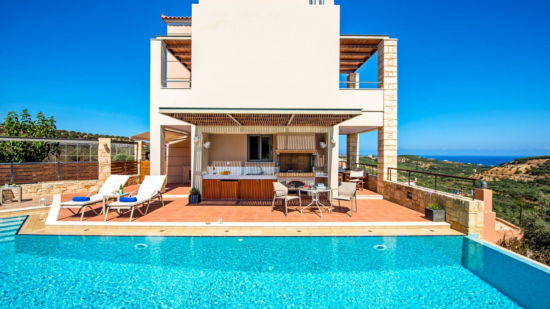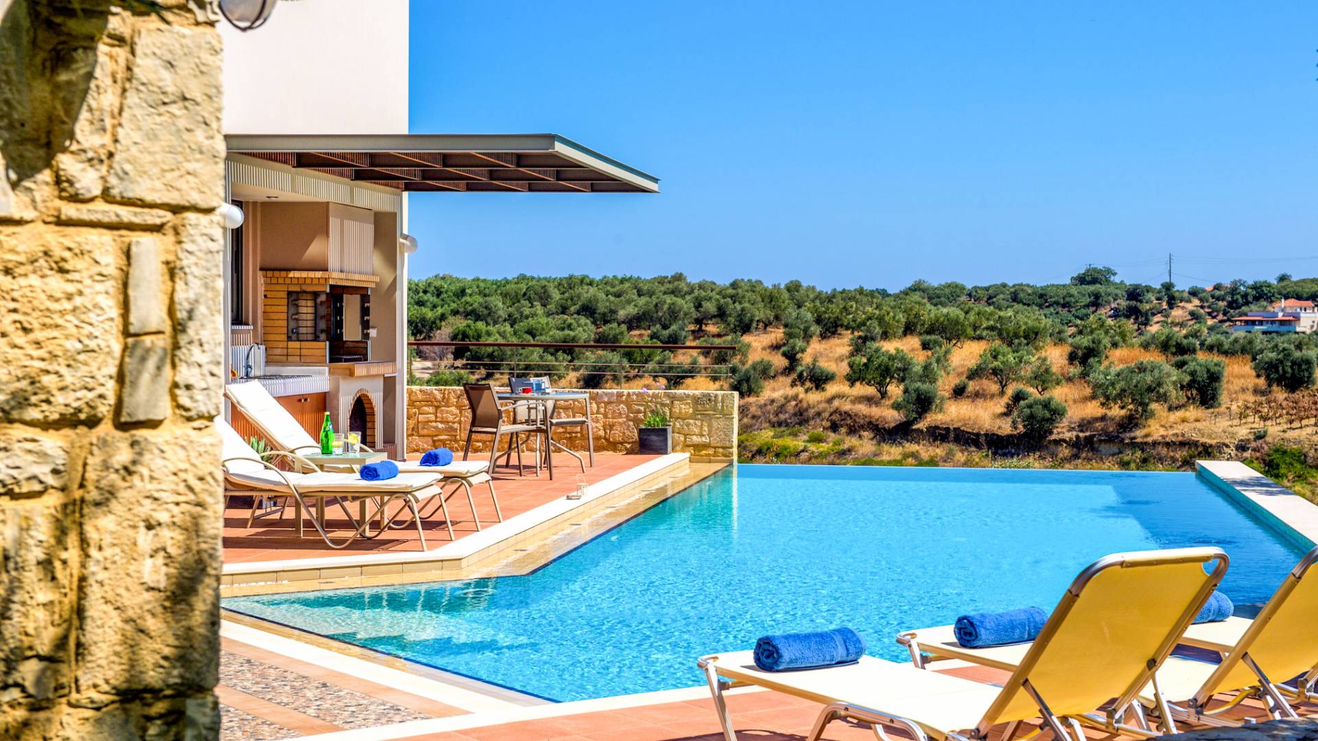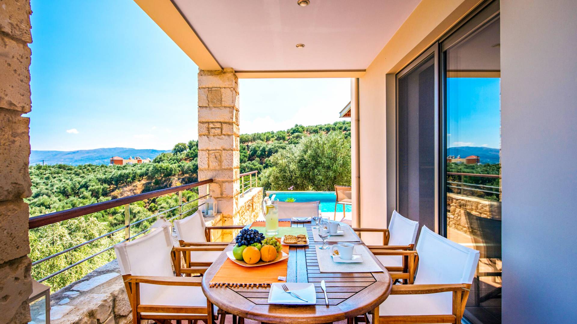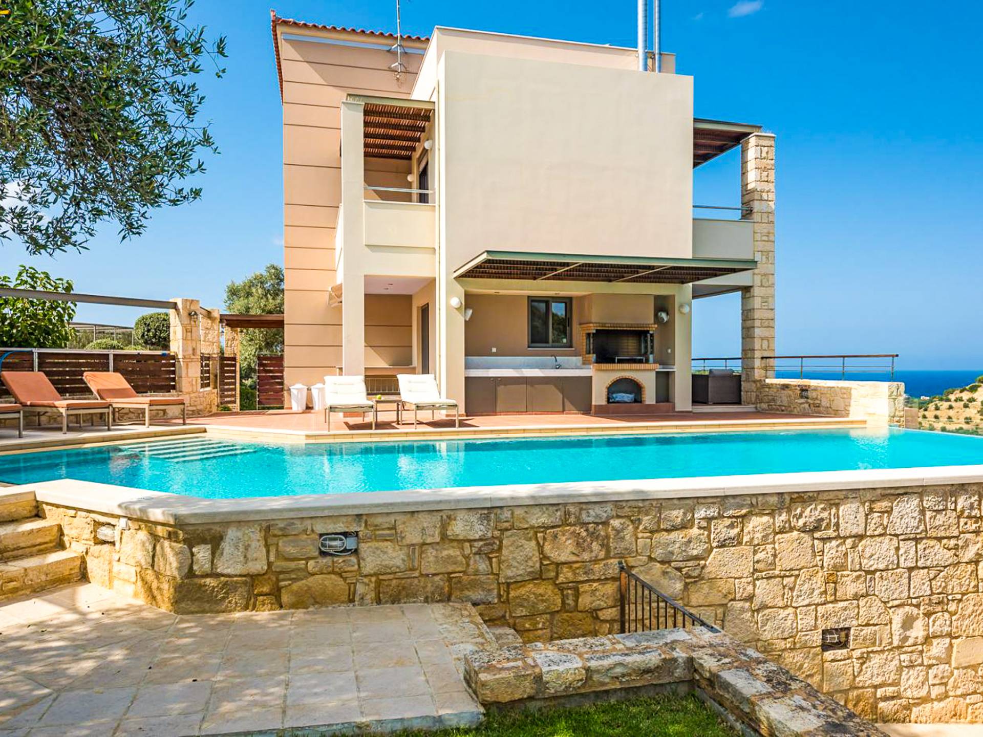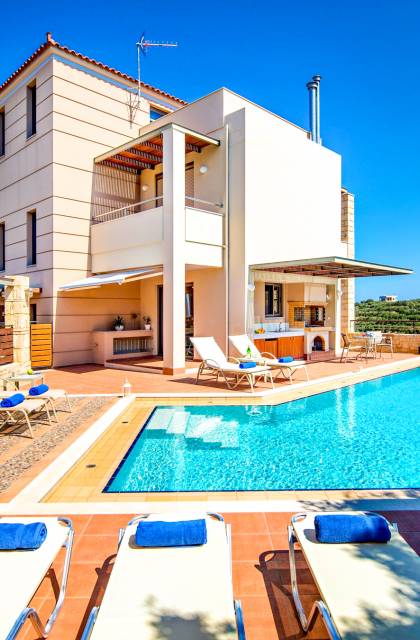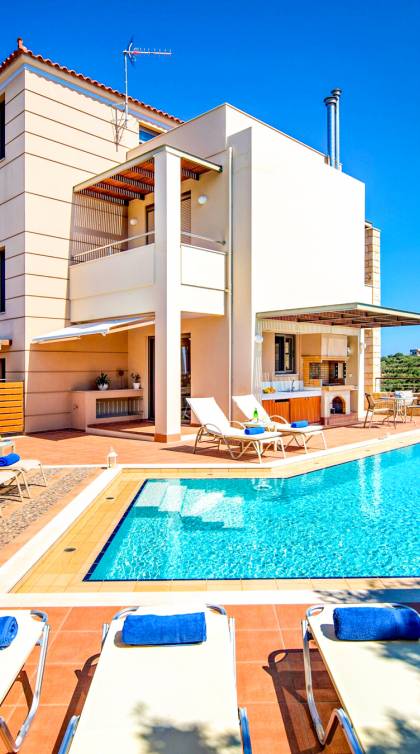 Scenery Villa 1 Chania Crete - 5BR hilltop villa w/ private pool, BBQ, sea views & organic garden. Peaceful setting, 5' to Agia Marina beach & near Chania.
