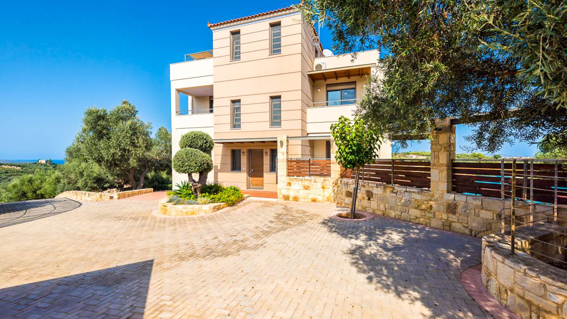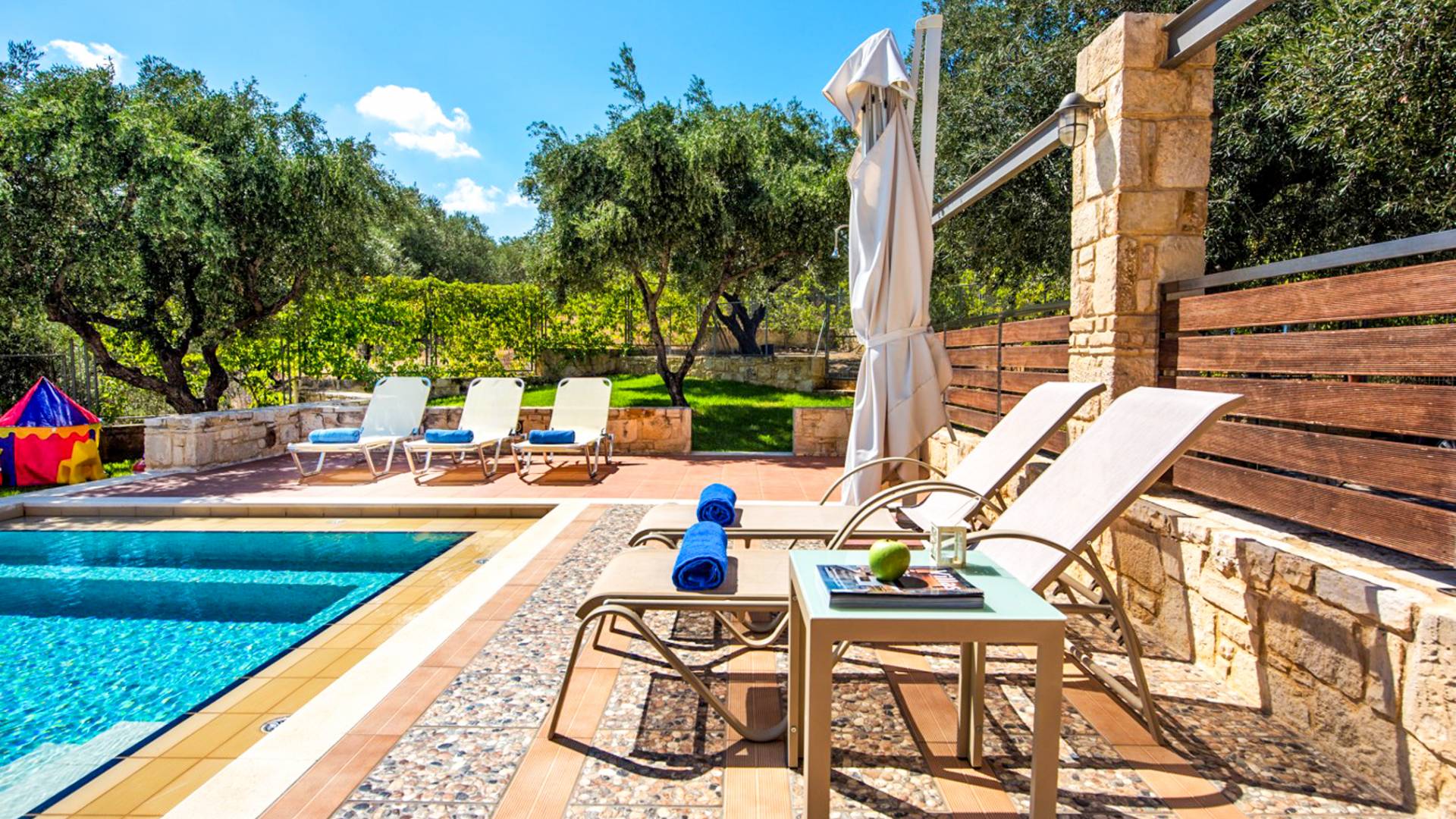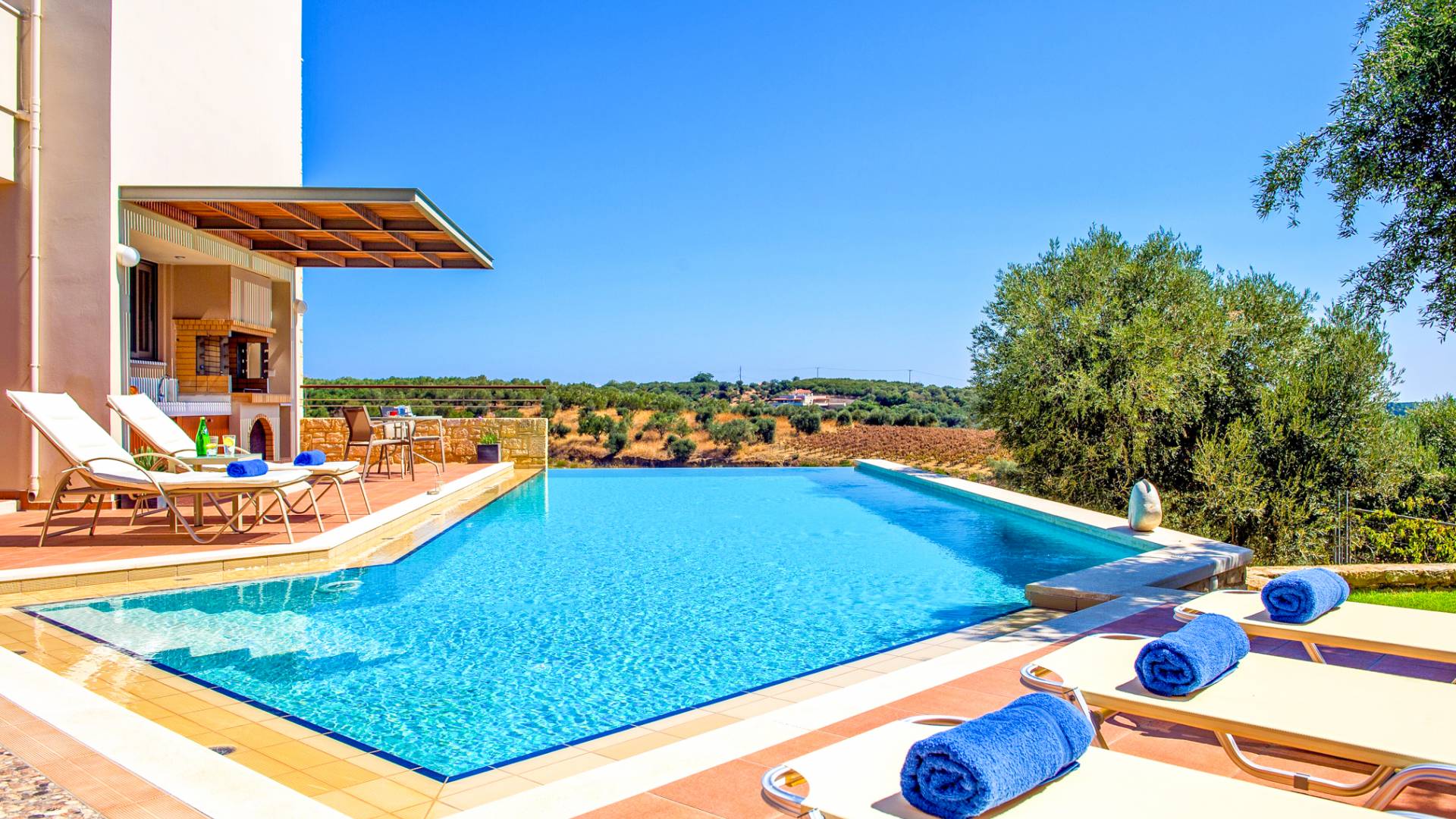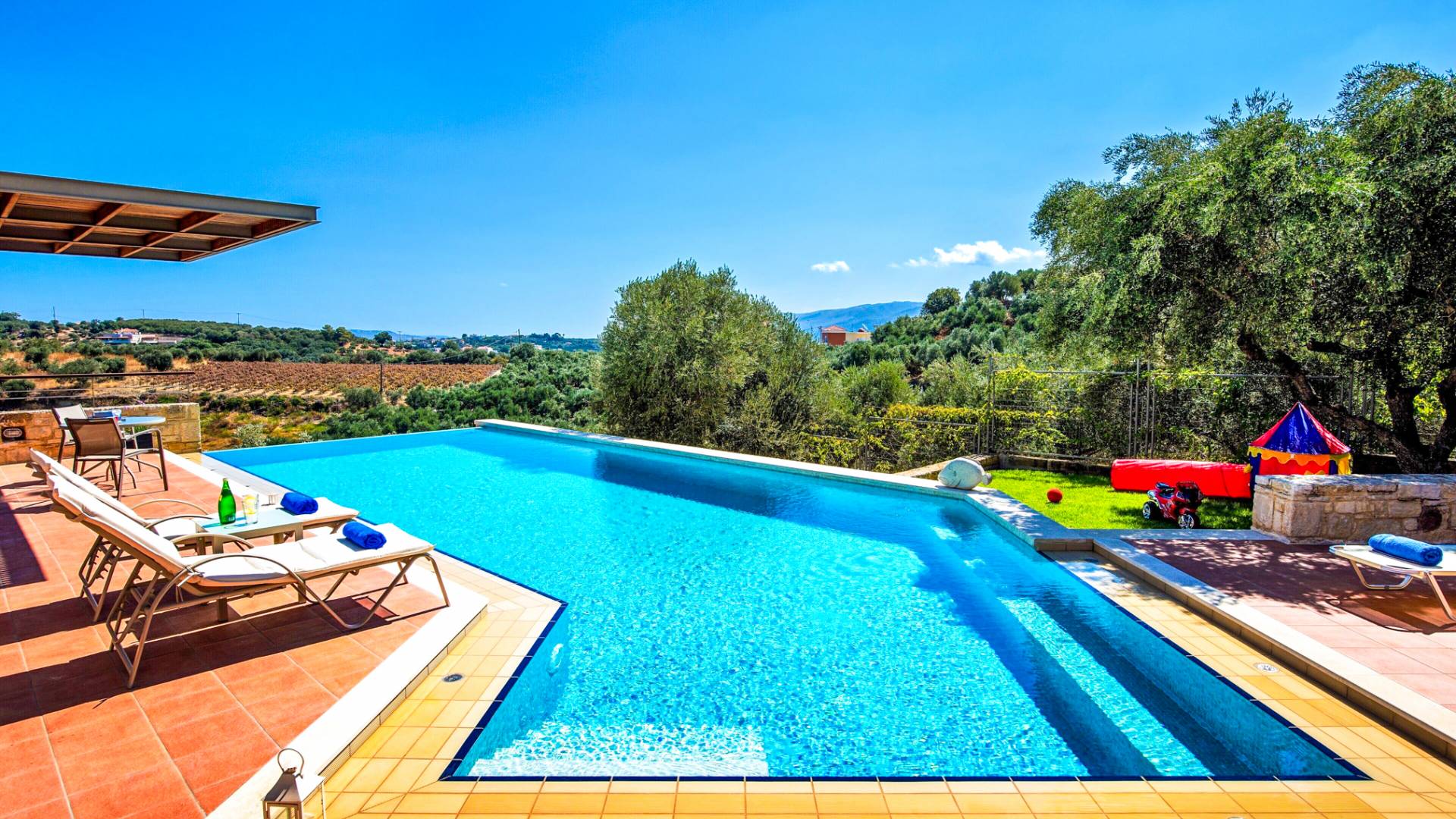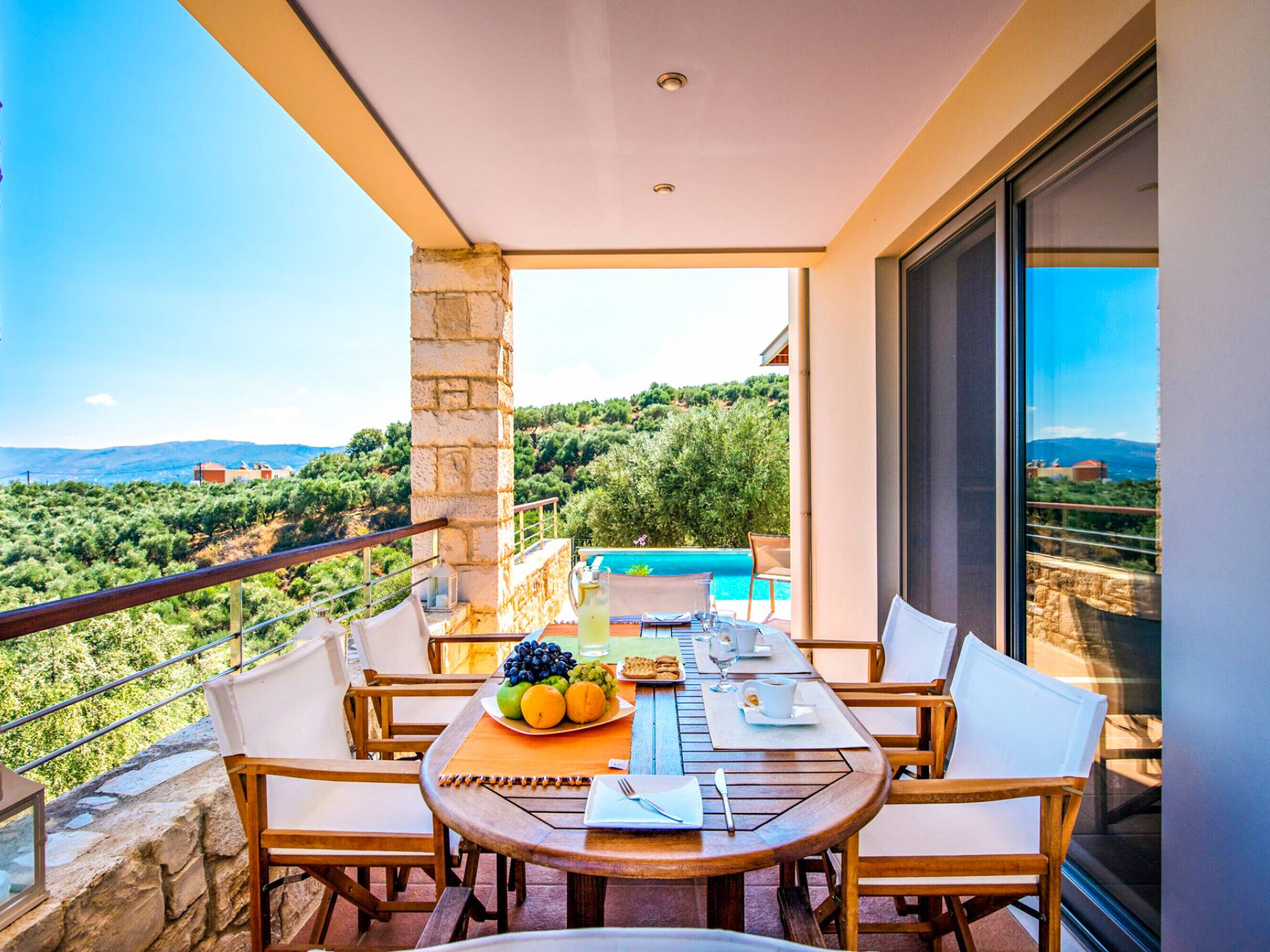 Scenery Villa 1 Chania Crete - 5BR hilltop villa w/ private pool, BBQ, sea views & organic garden. Peaceful setting, 5' to Agia Marina beach & near Chania.
