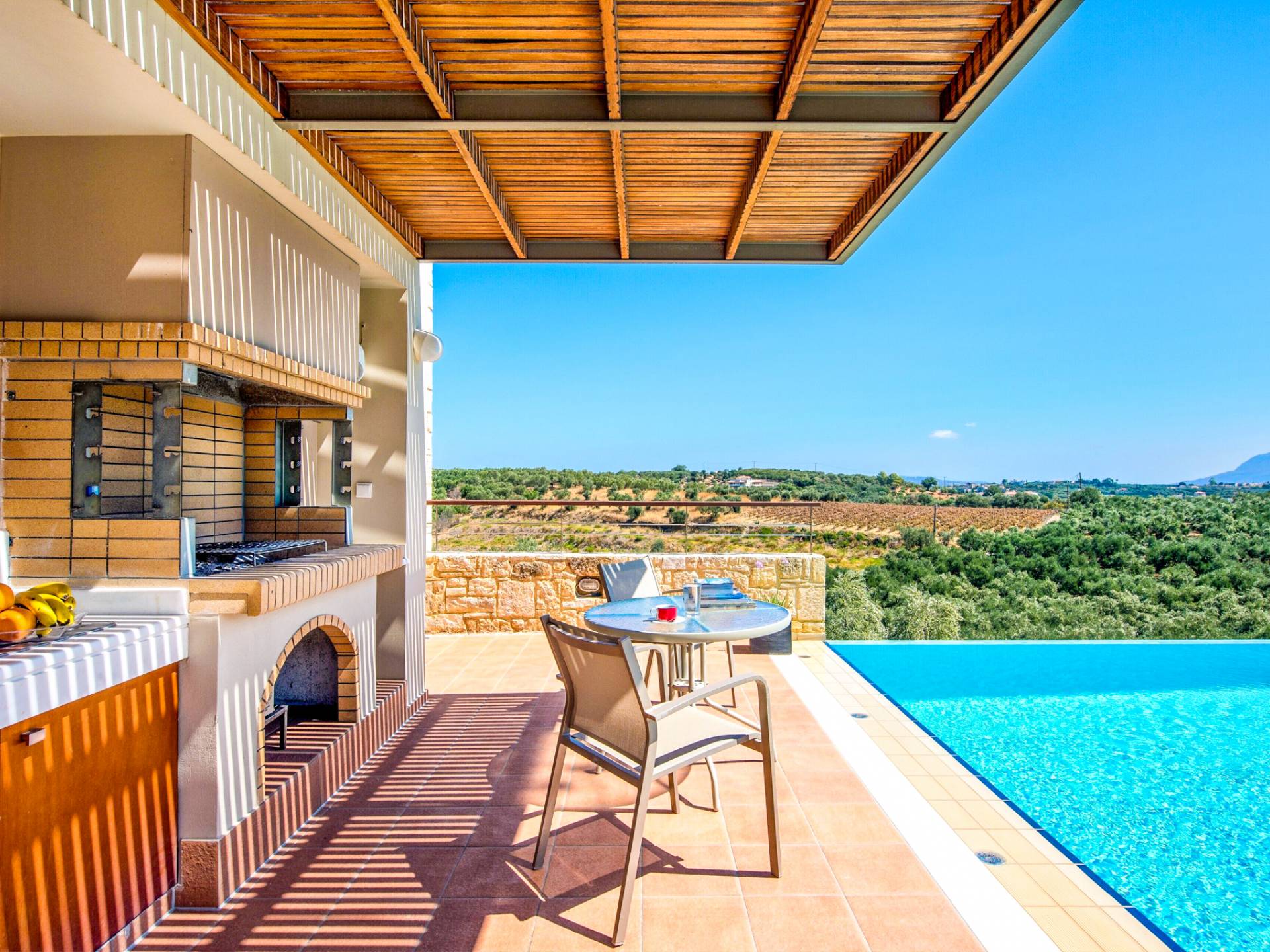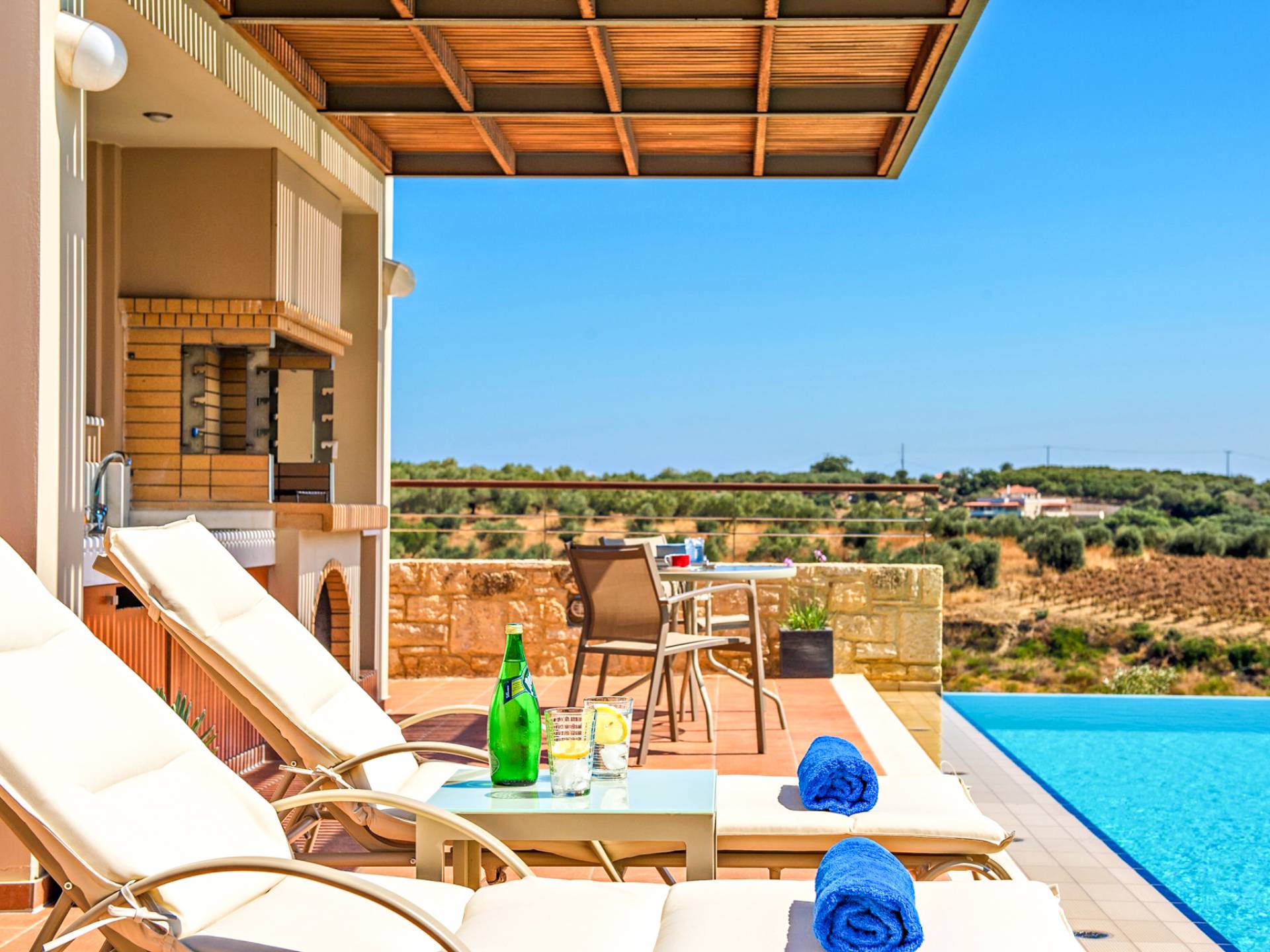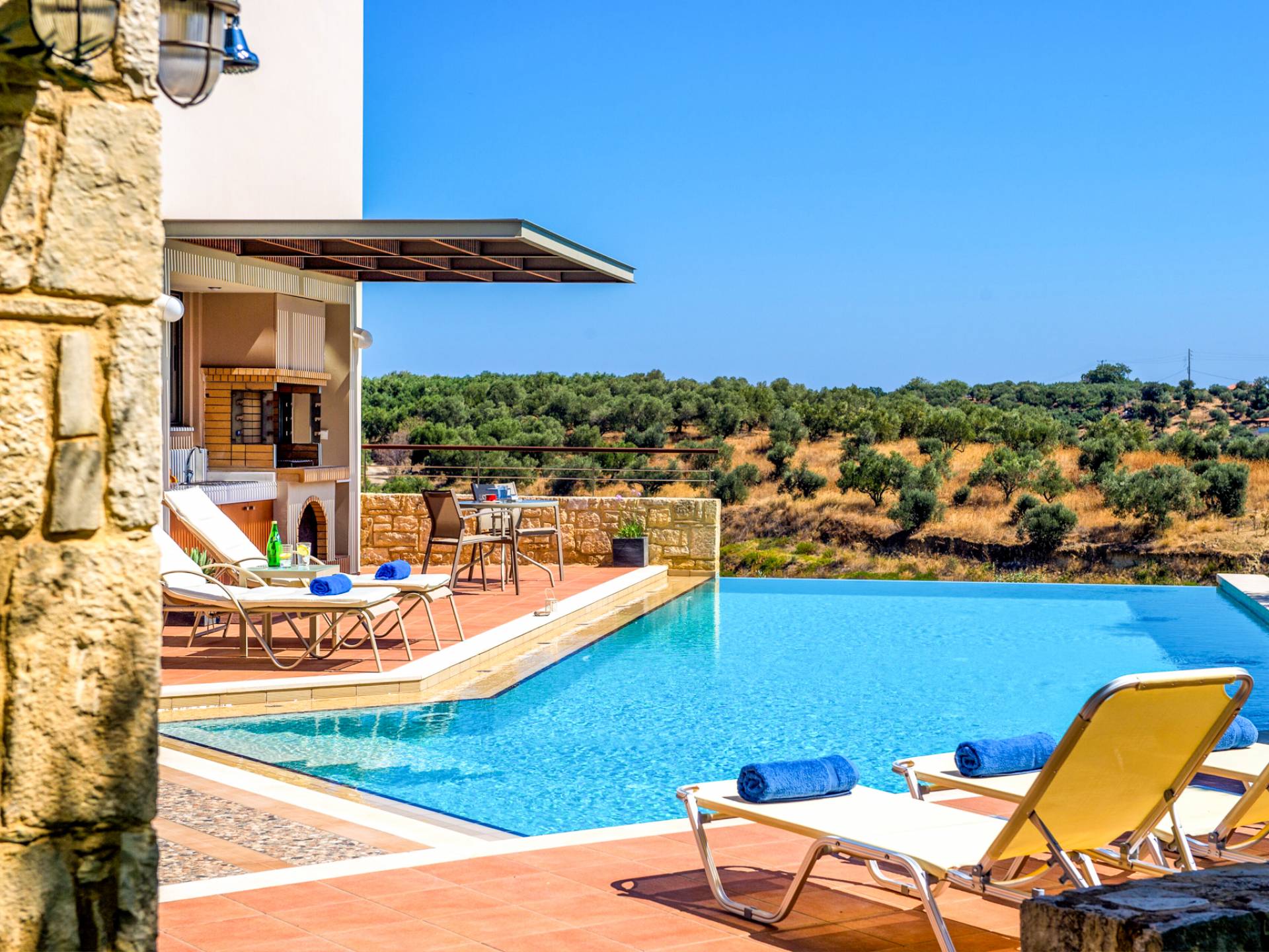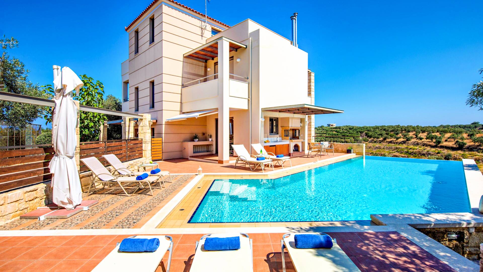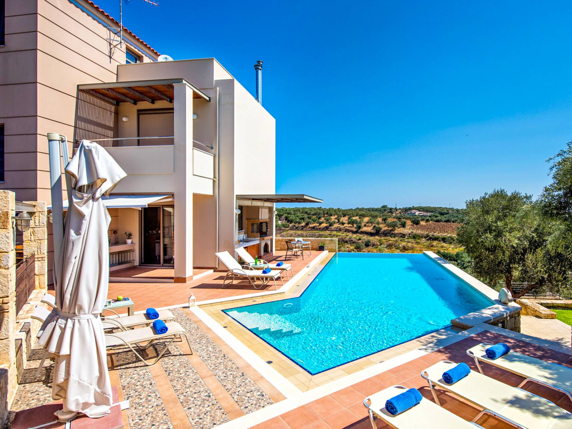 Scenery Villa 1 Chania Crete - 5BR hilltop villa w/ private pool, BBQ, sea views & organic garden. Peaceful setting, 5' to Agia Marina beach & near Chania.
