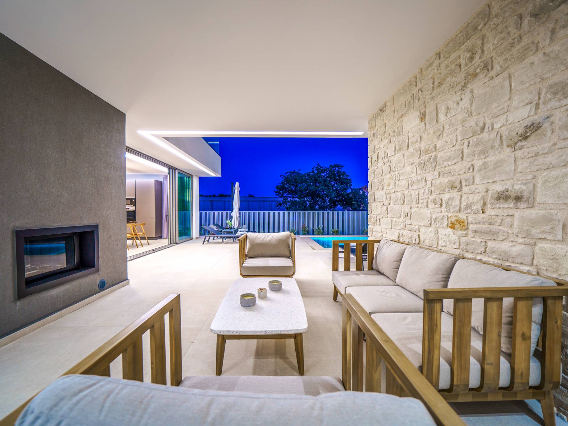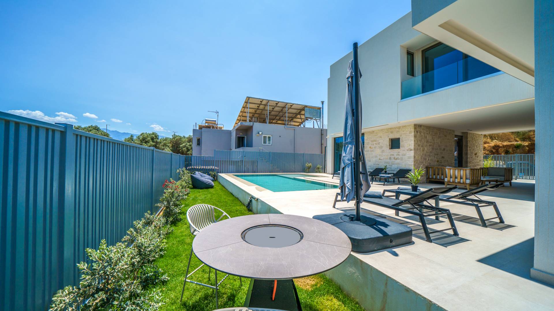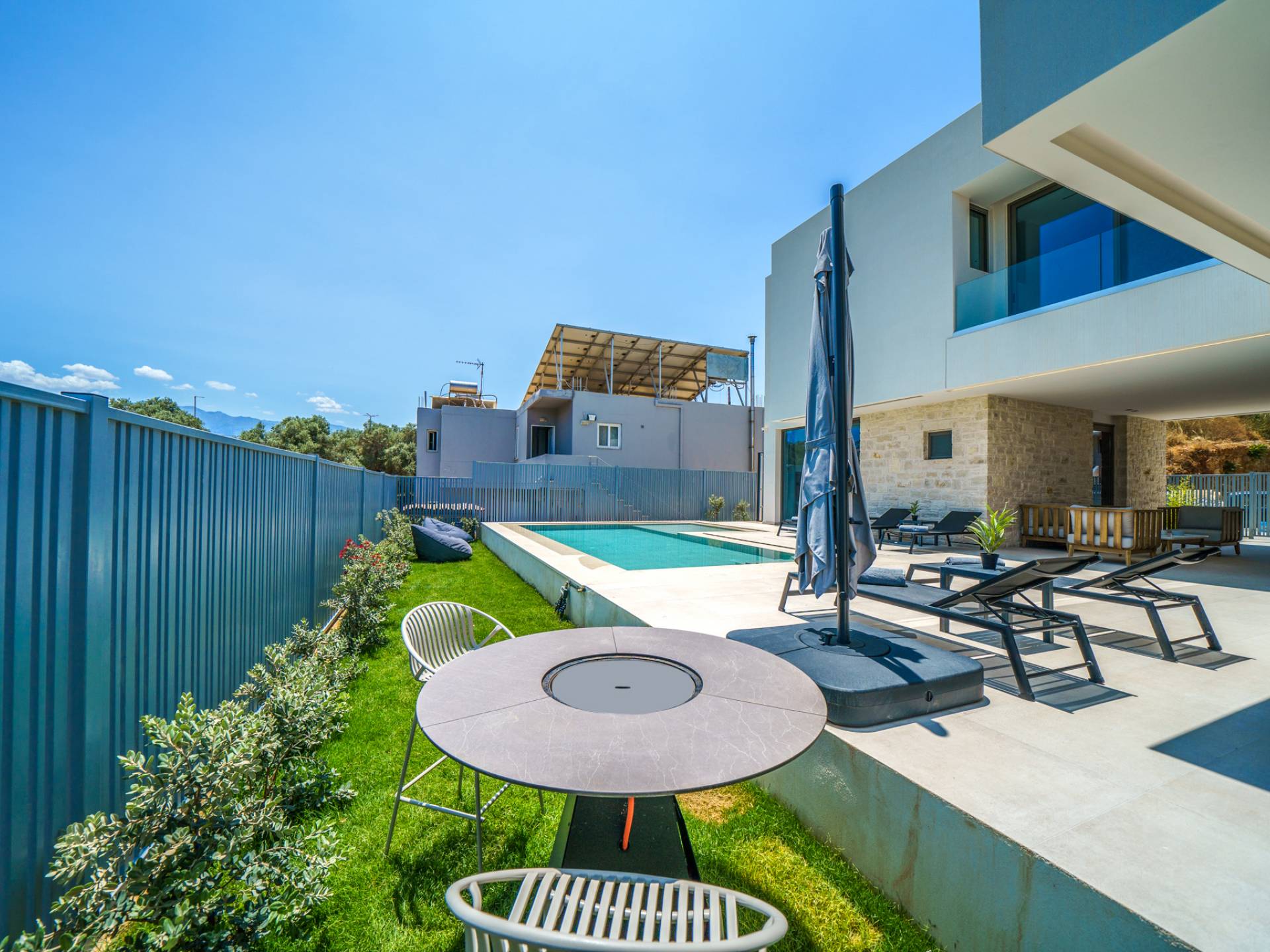 - Lounge in the garden with modern outdoor seating and fireplace
