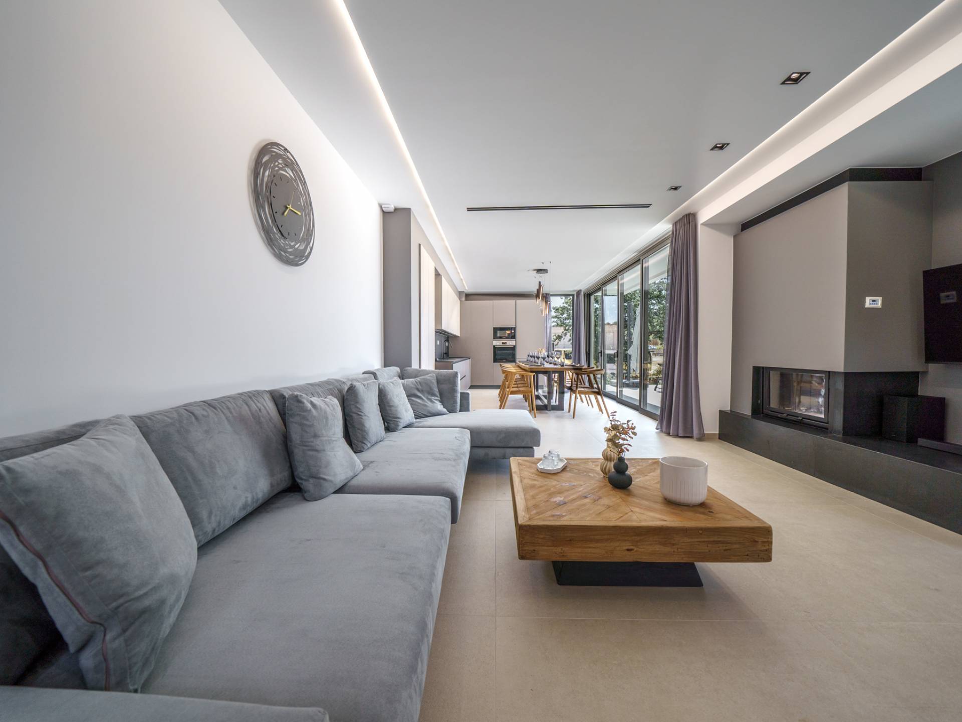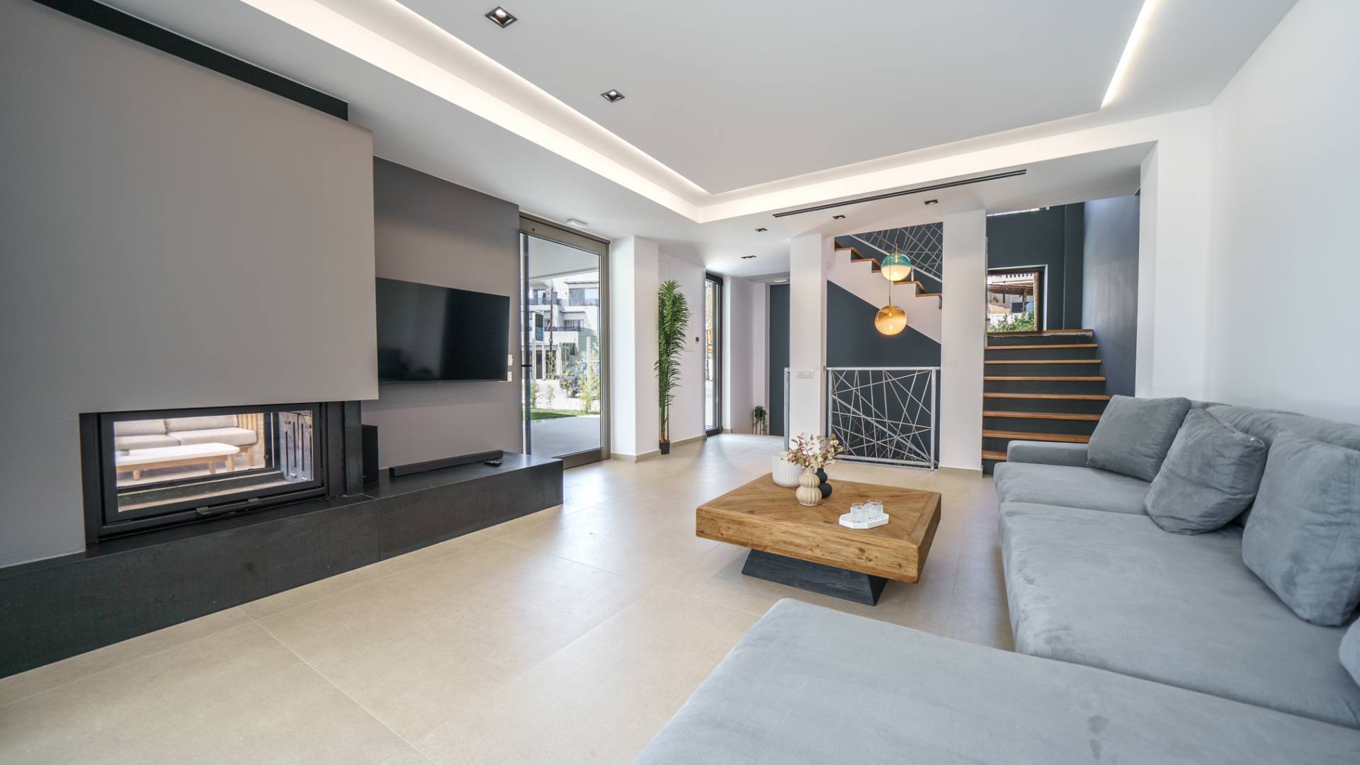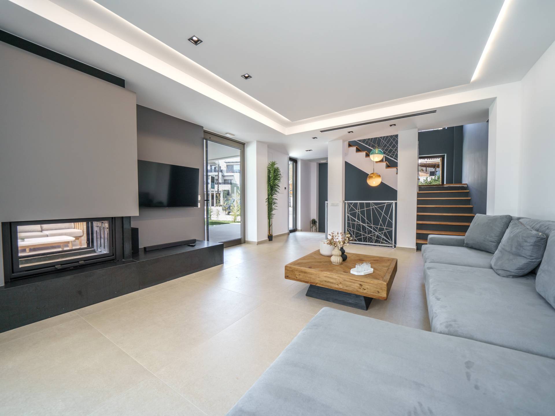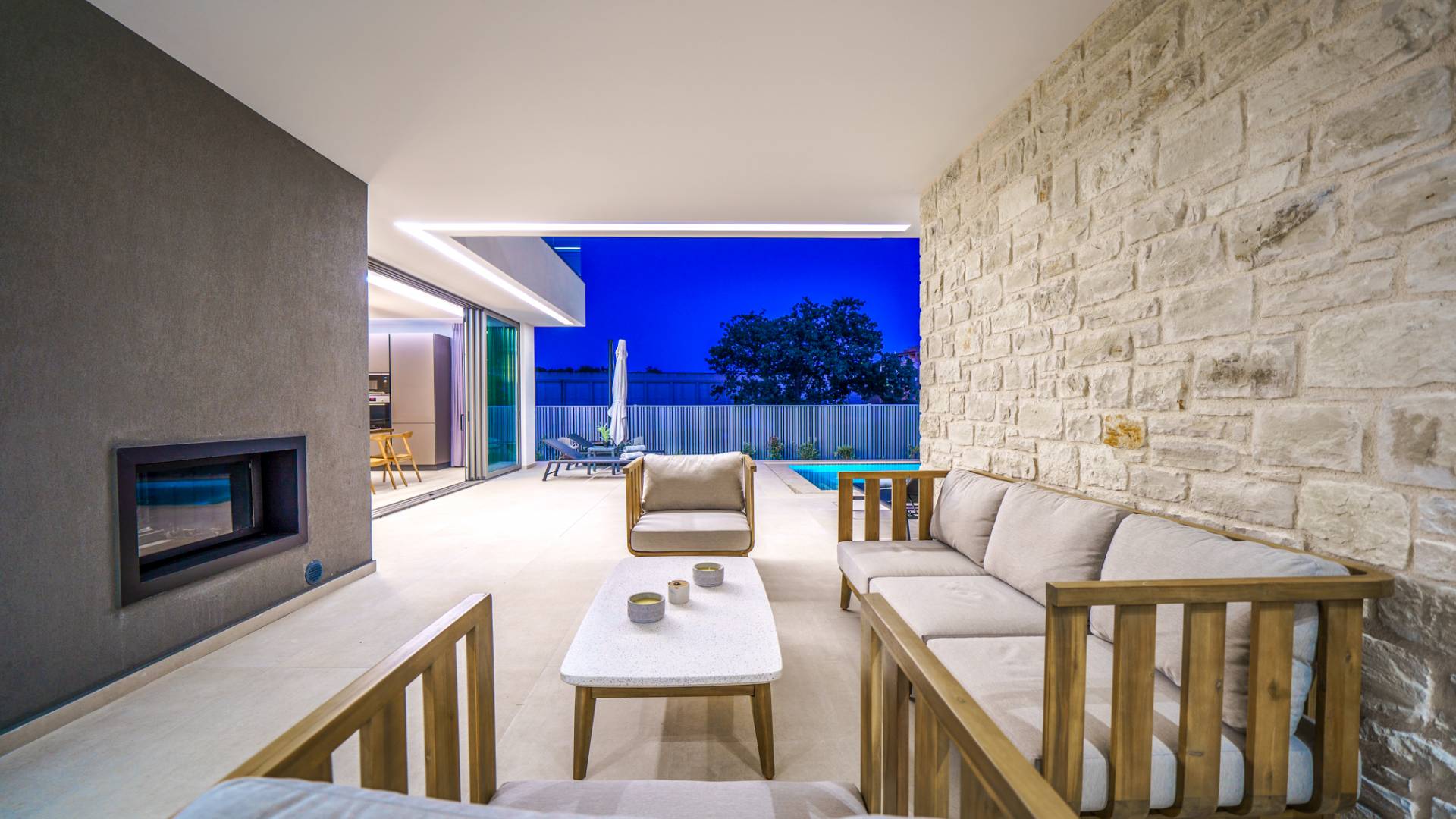 - Lounge in the garden with modern outdoor seating and fireplace