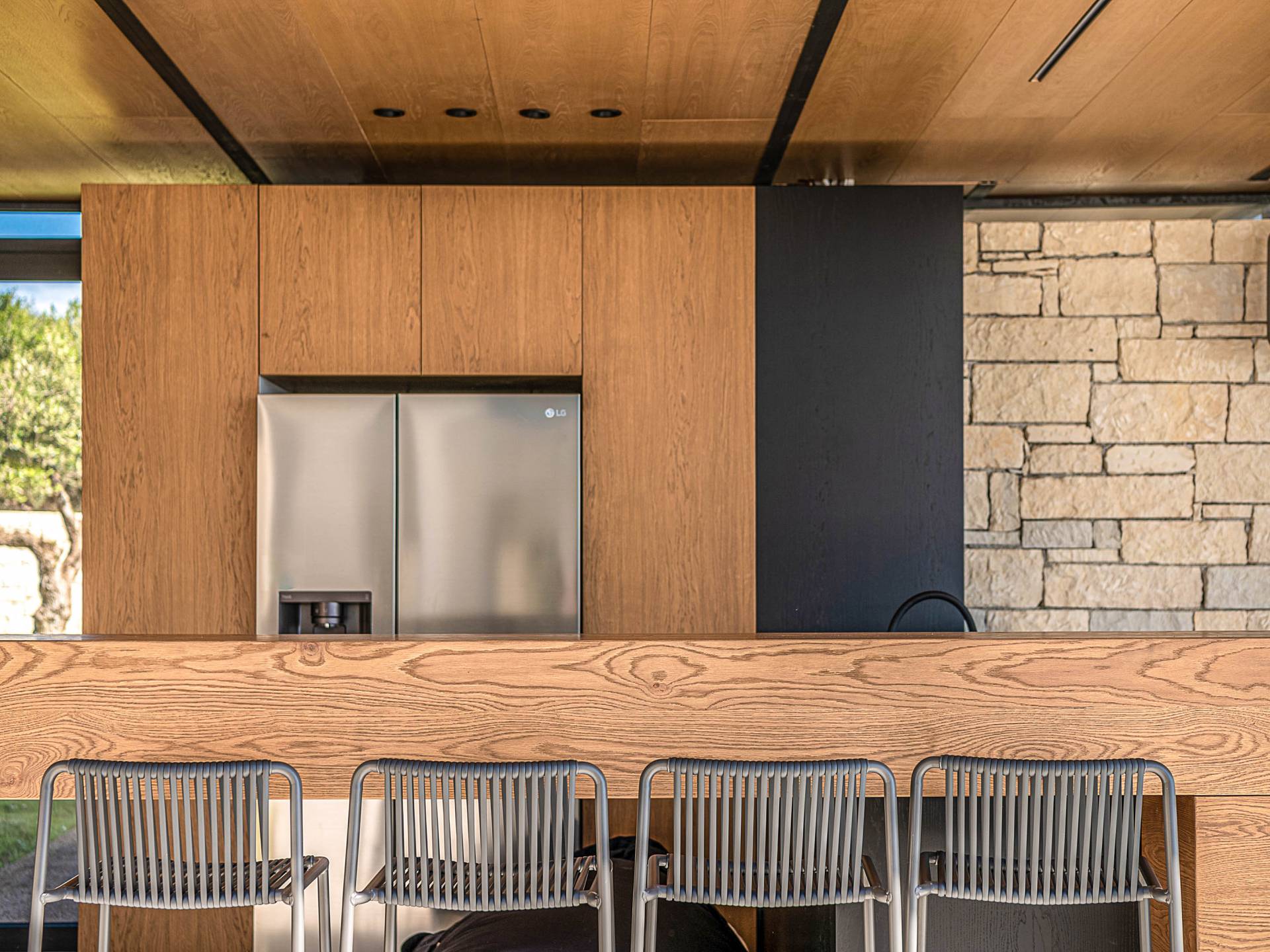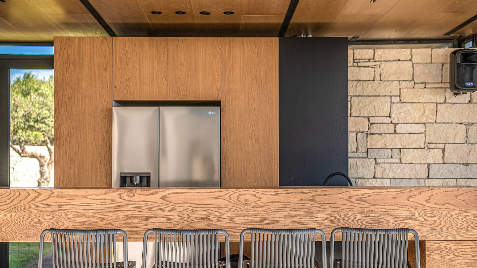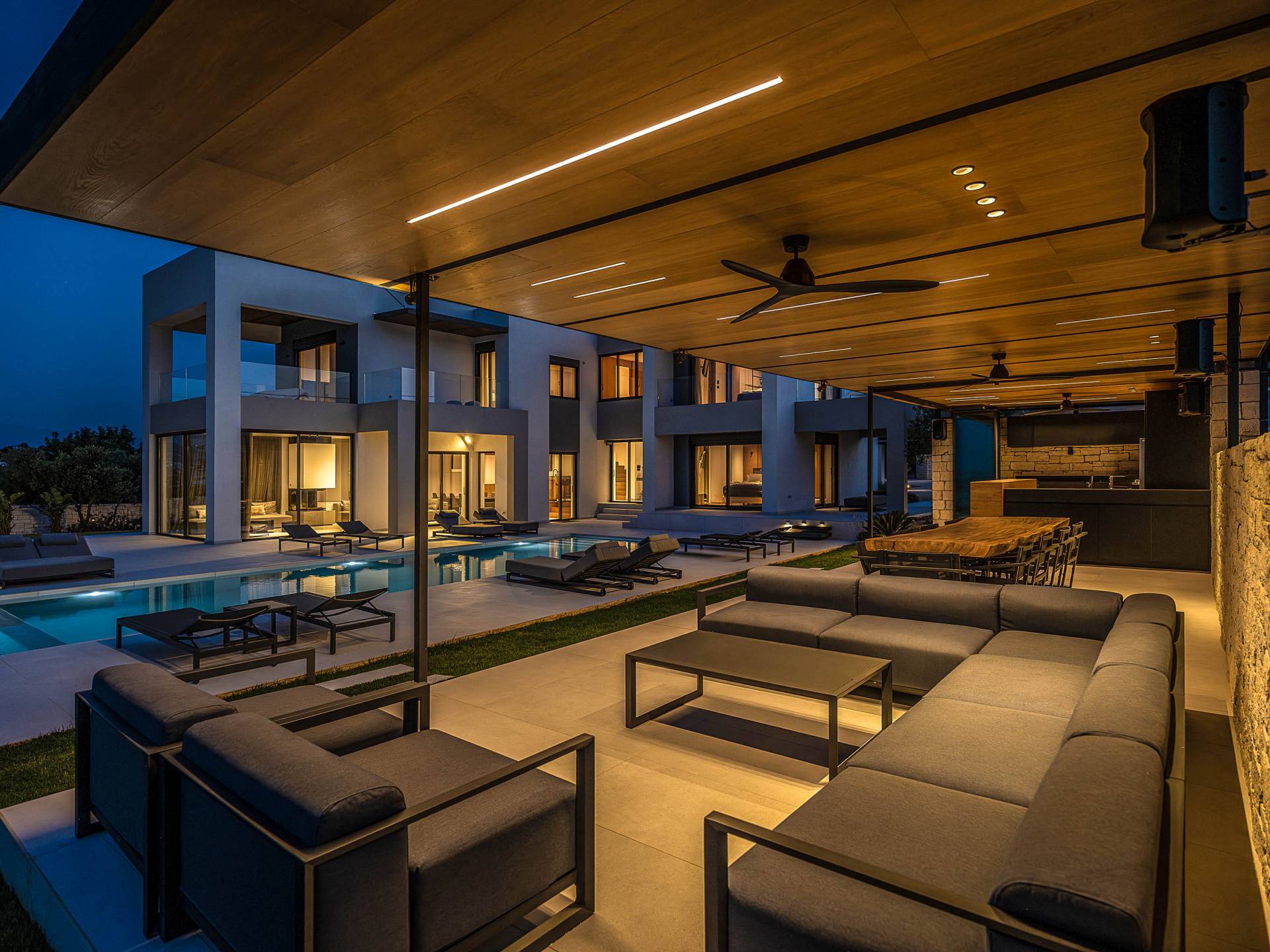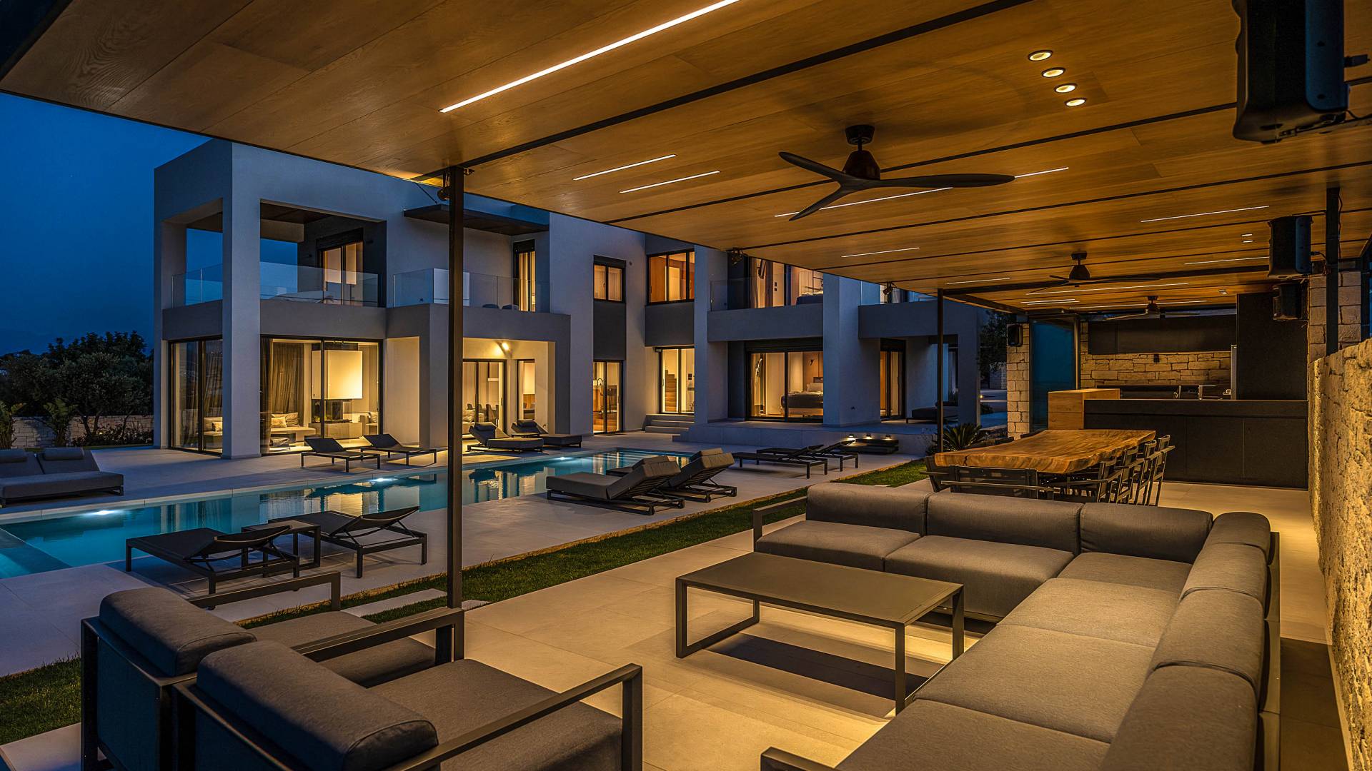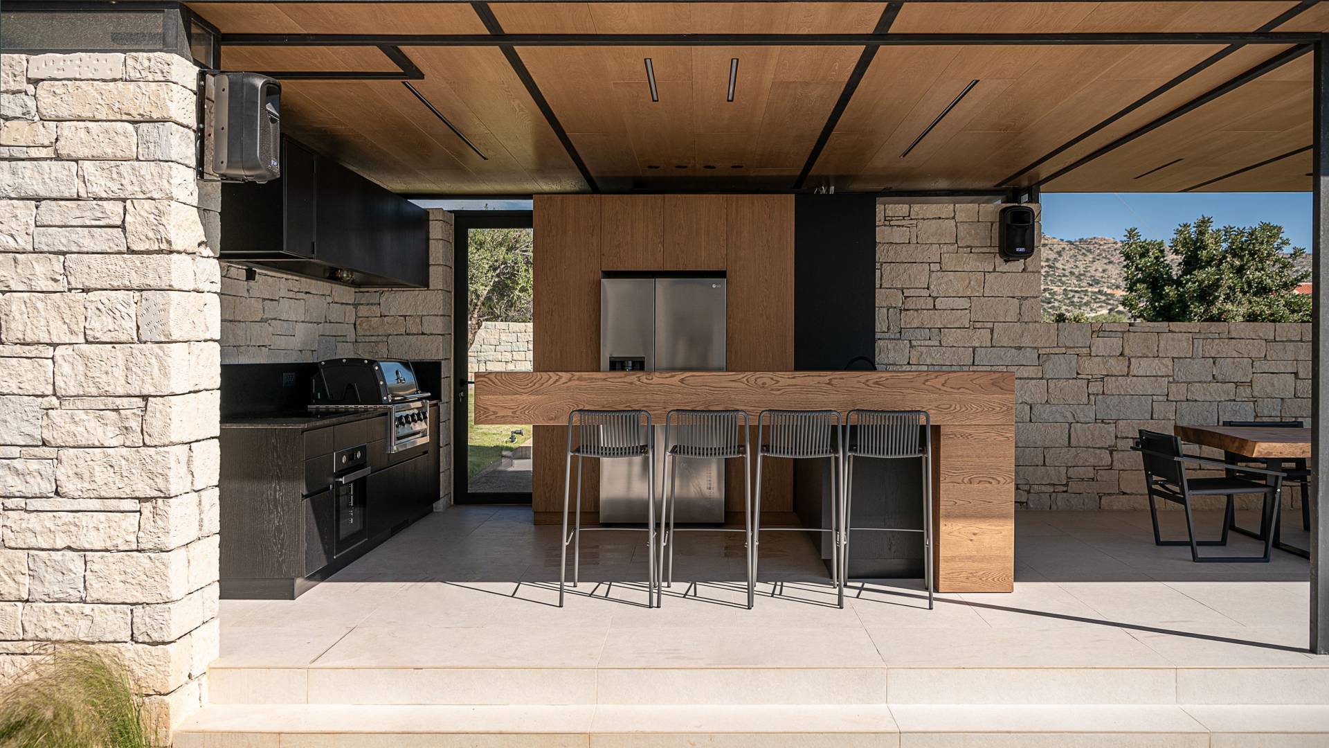 - Outdoor kitchen: Gas grill, oven, double fridge, shaded pergola, and dining/lounge zones