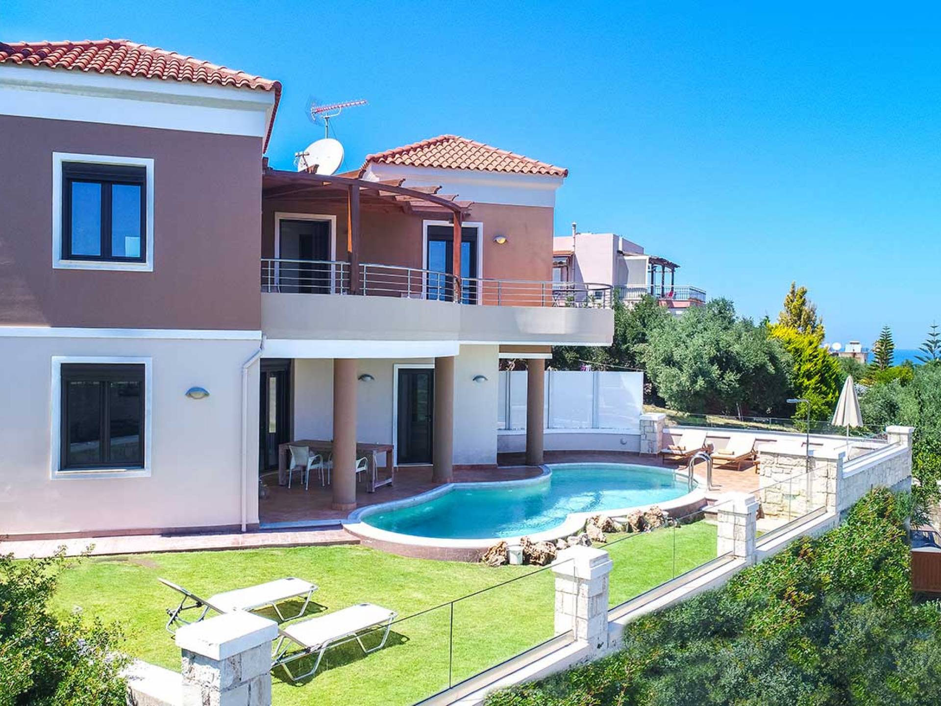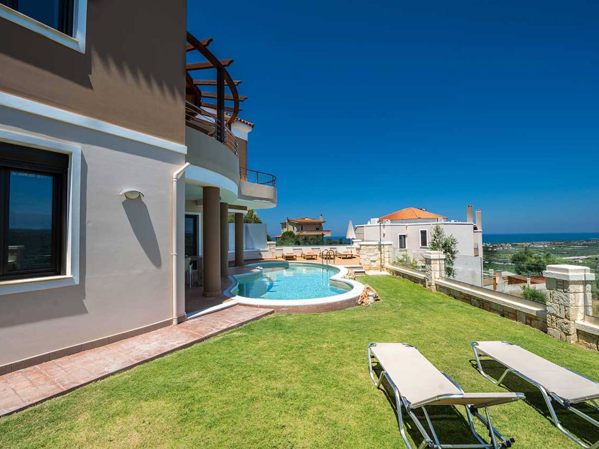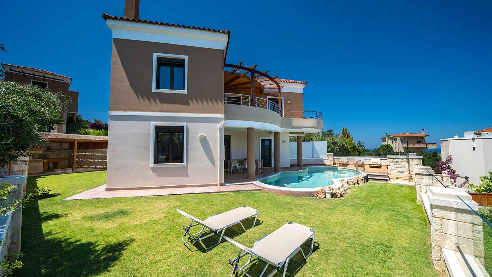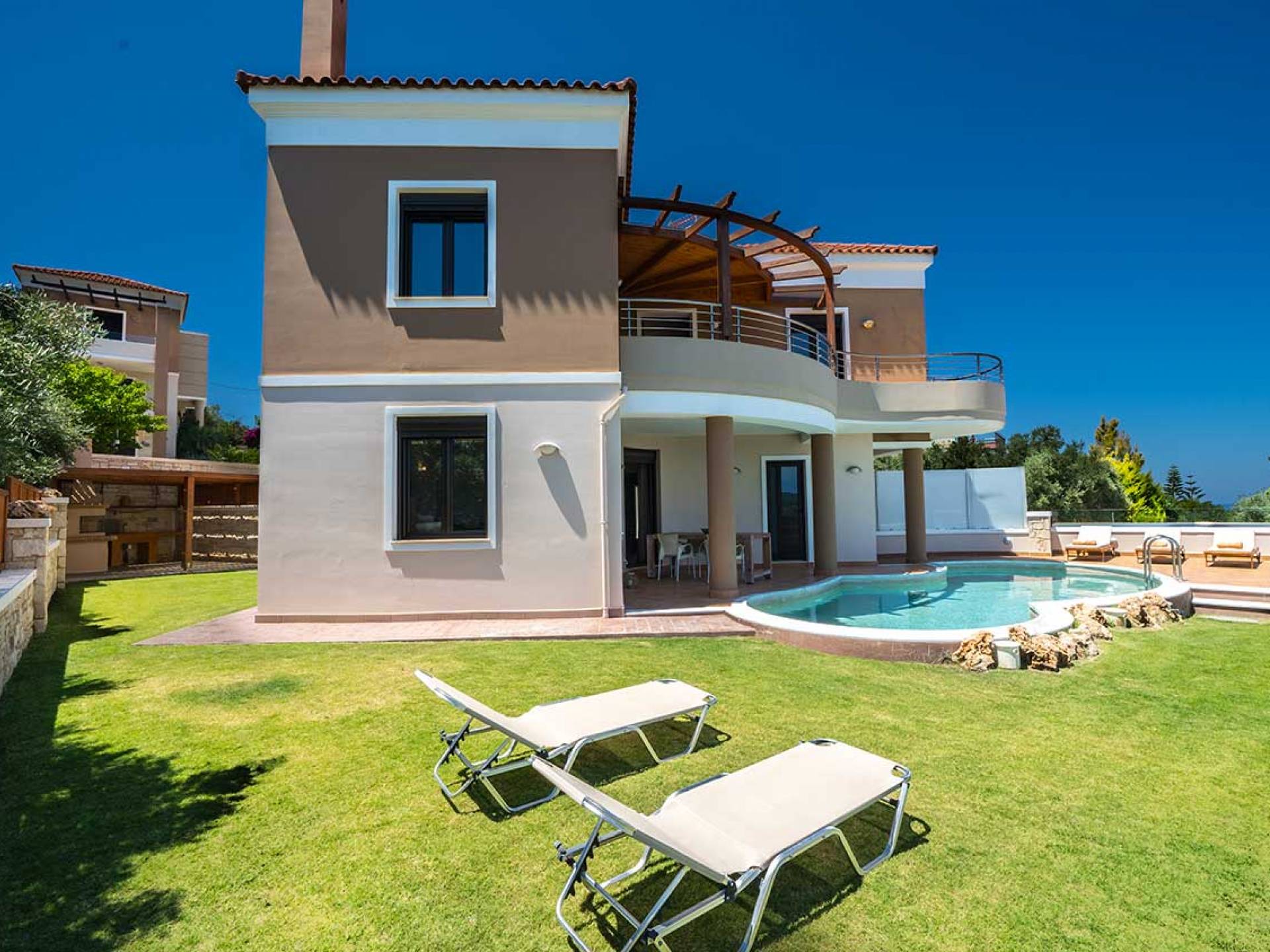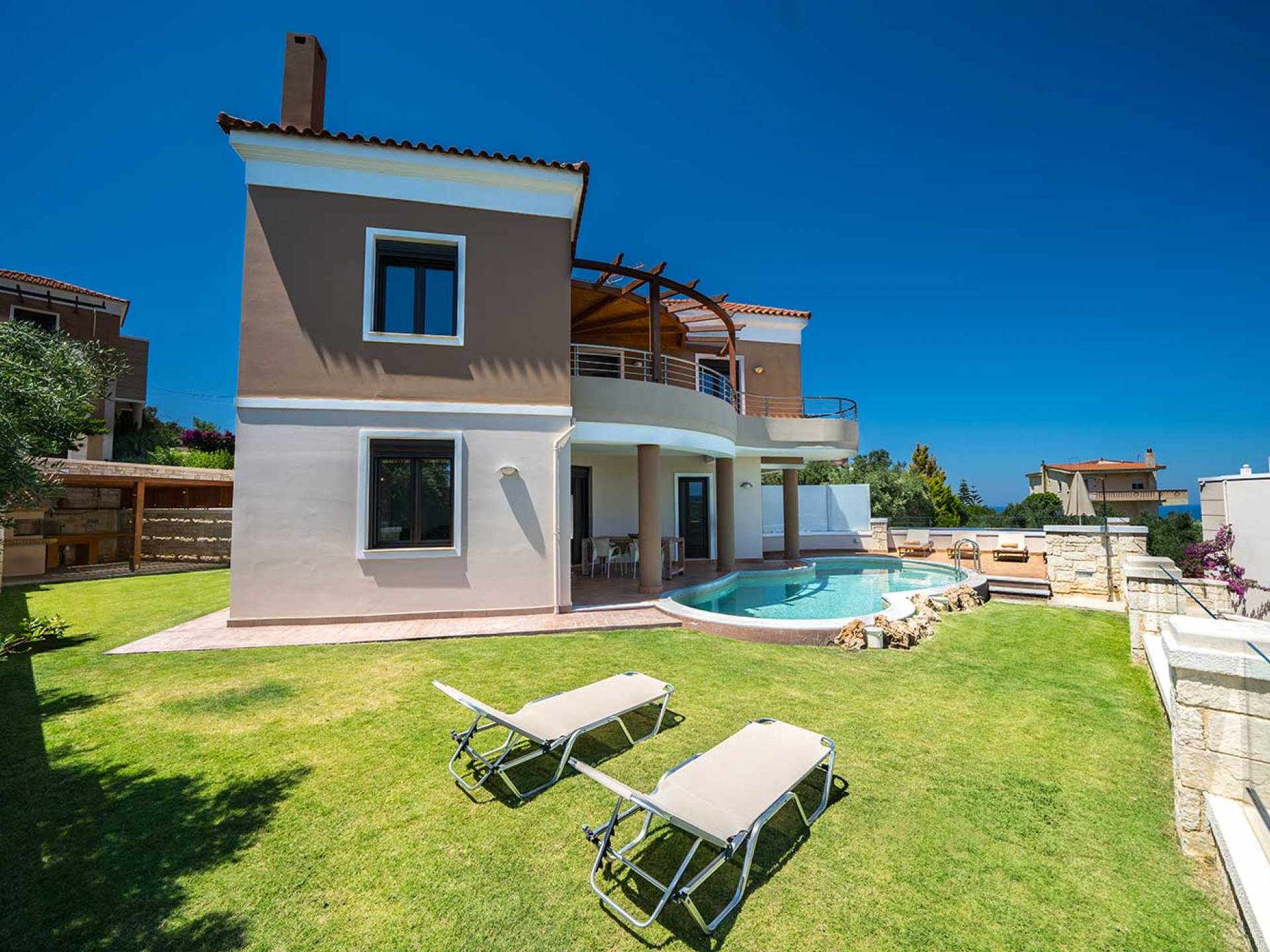 There is a large private swimming pool with optional heating, a large private garden with a barbeque area, and parking space. All the pool area is full furnished with sunbeds, chairs, and tables for dining and parasols. In the evening you can either enjoy the magnificent romantic sunset that paints with the nicest colors the clear blue Mediterranean sky or you can drive in a distance of approx 3-4 minutes to the nearest restaurants and taste the Cretan cuisine. Relax and enjoy the private and exclusive atmosphere of a deluxe home with 5-star facilities.