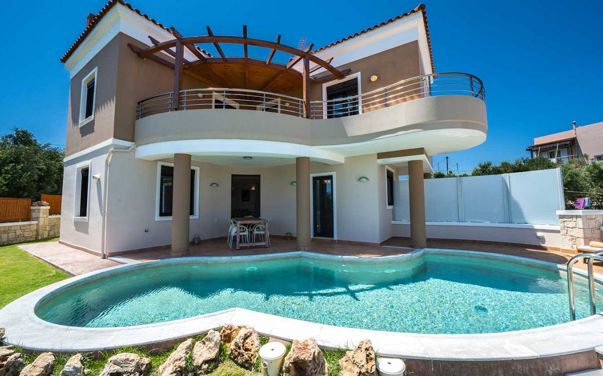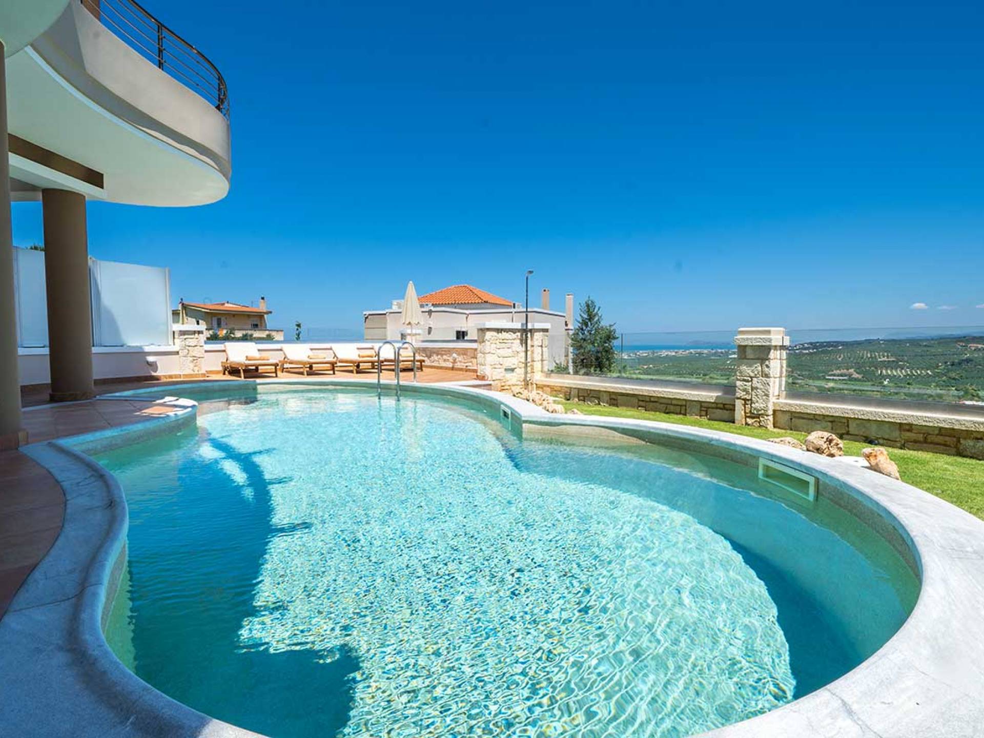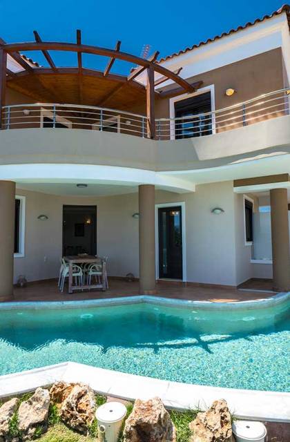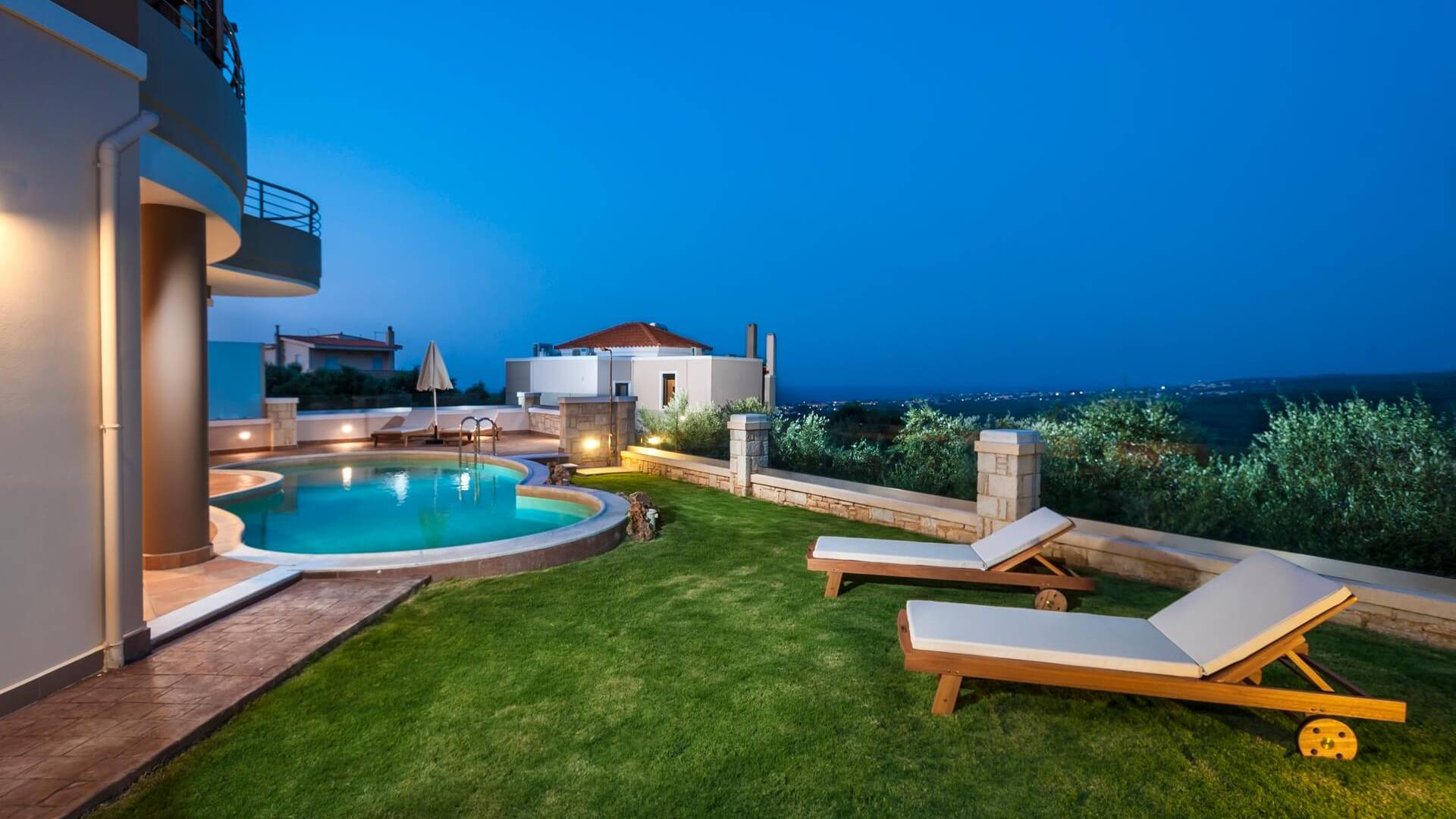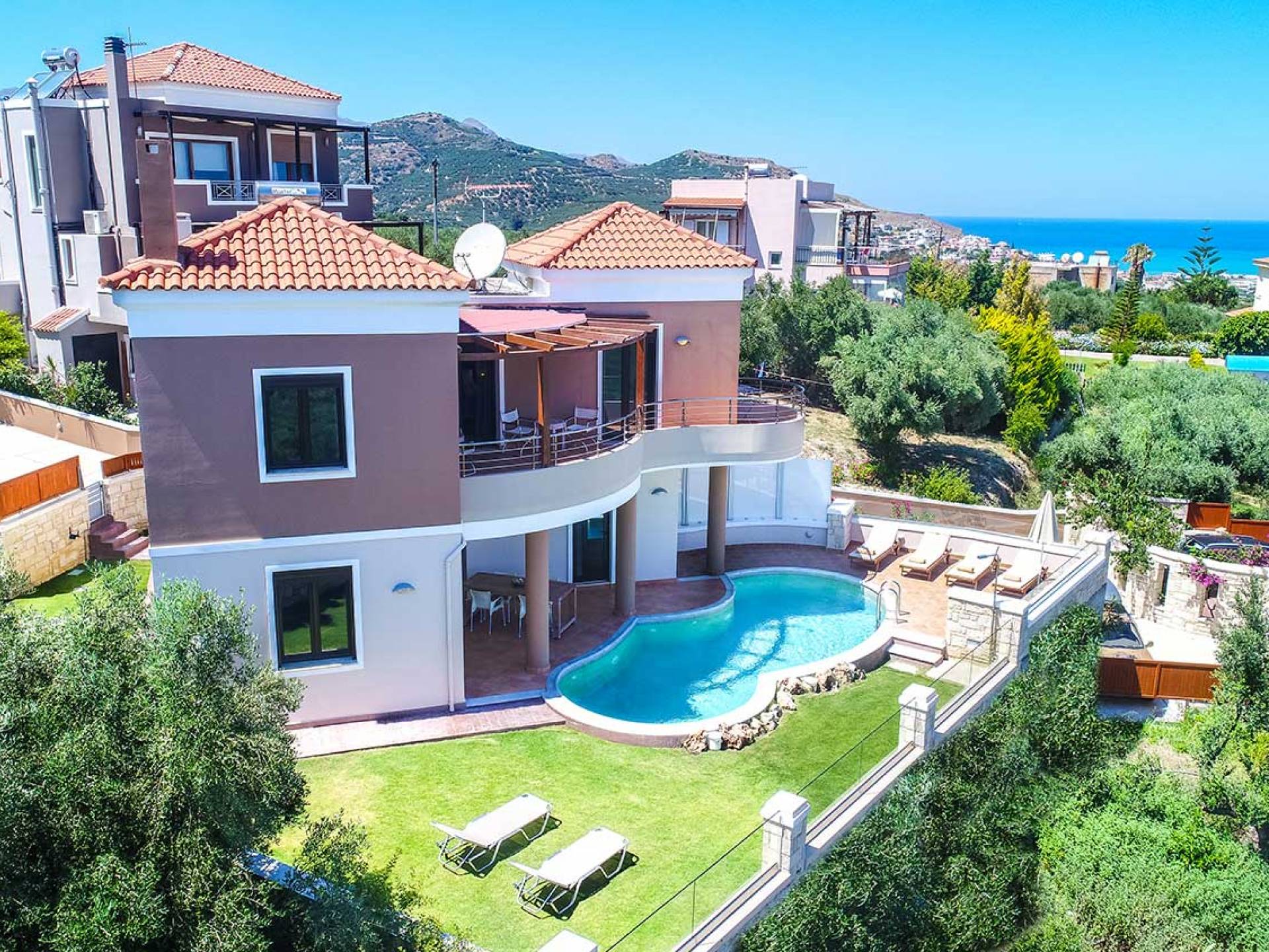 There is a large private swimming pool with optional heating, a large private garden with a barbeque area, and parking space. All the pool area is full furnished with sunbeds, chairs, and tables for dining and parasols. In the evening you can either enjoy the magnificent romantic sunset that paints with the nicest colors the clear blue Mediterranean sky or you can drive in a distance of approx 3-4 minutes to the nearest restaurants and taste the Cretan cuisine. Relax and enjoy the private and exclusive atmosphere of a deluxe home with 5-star facilities.
