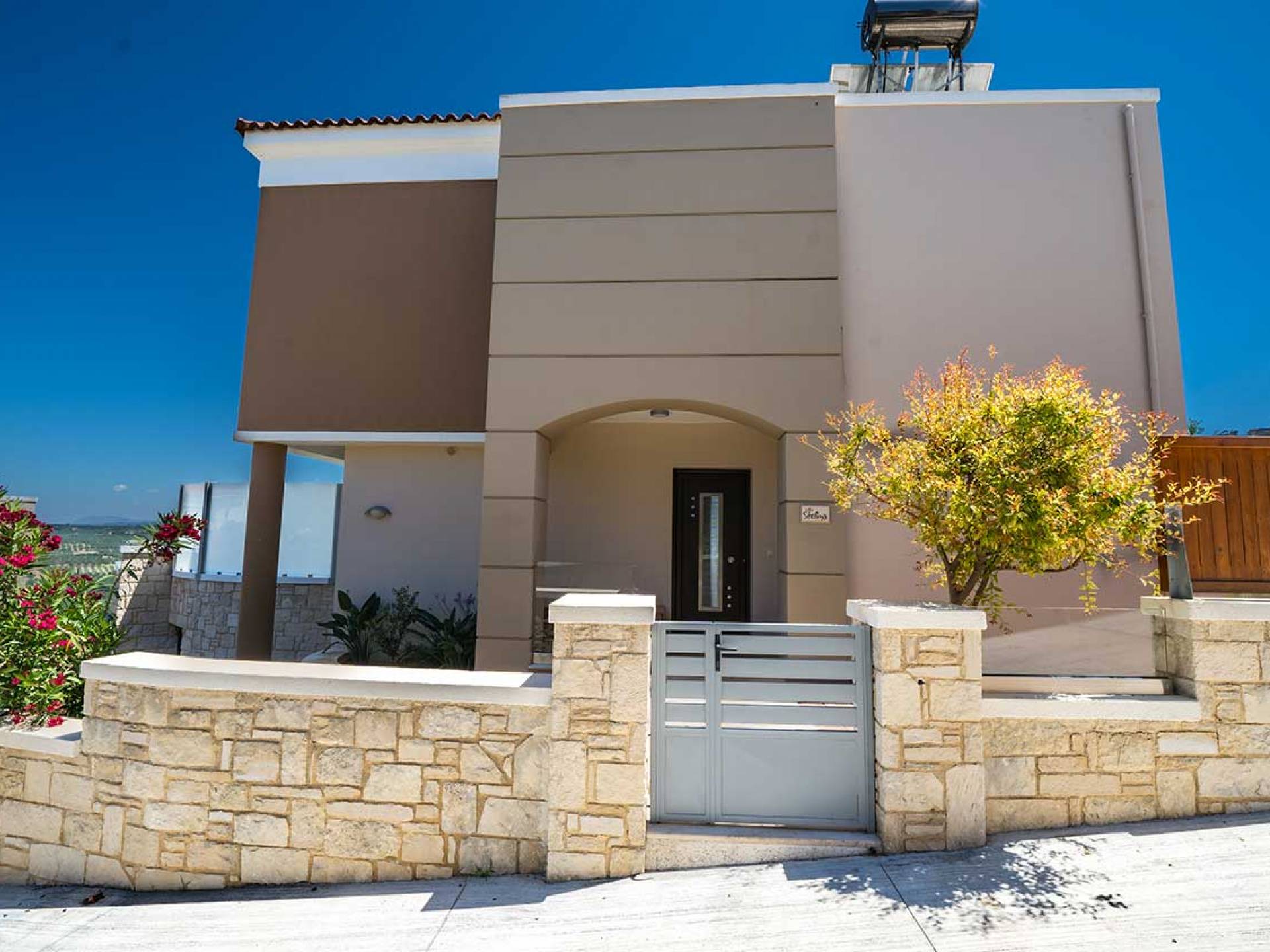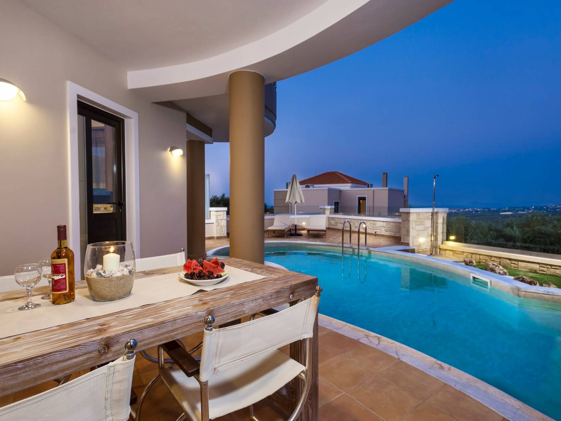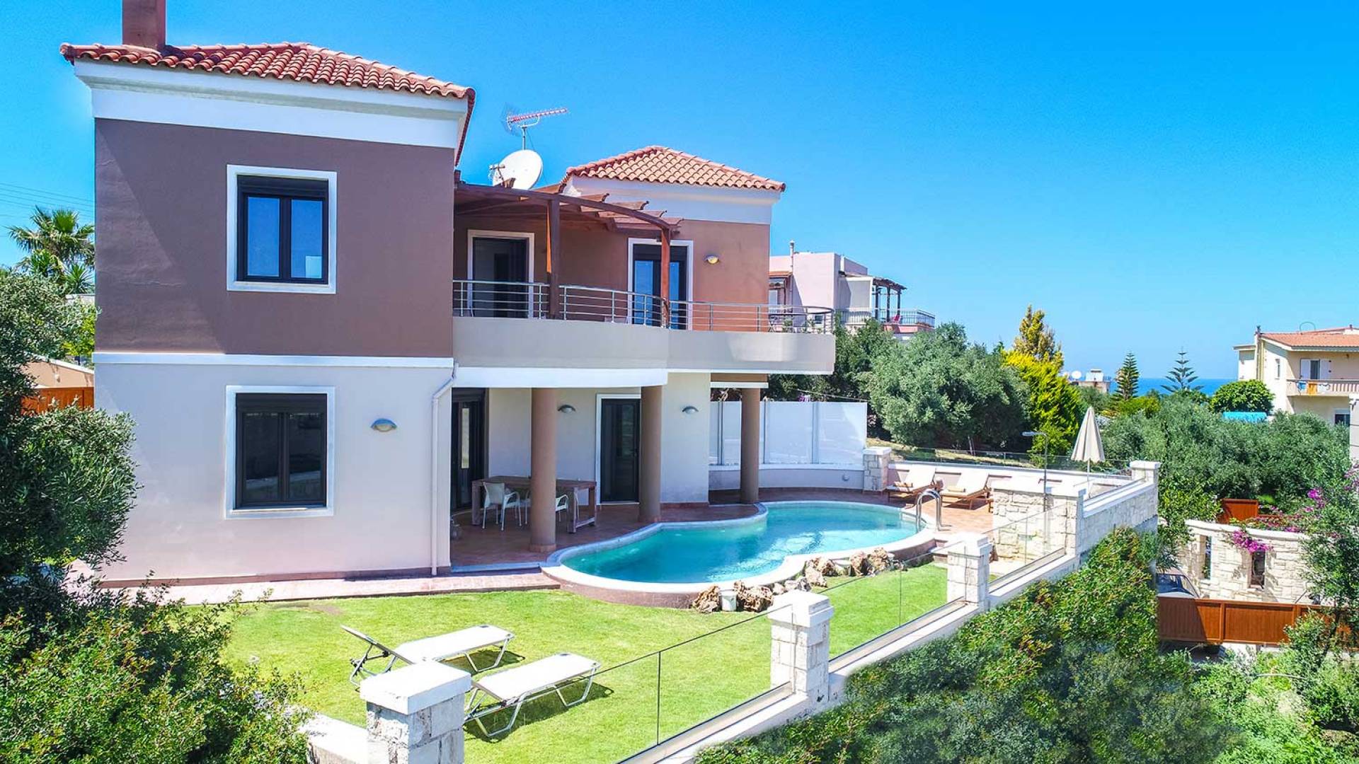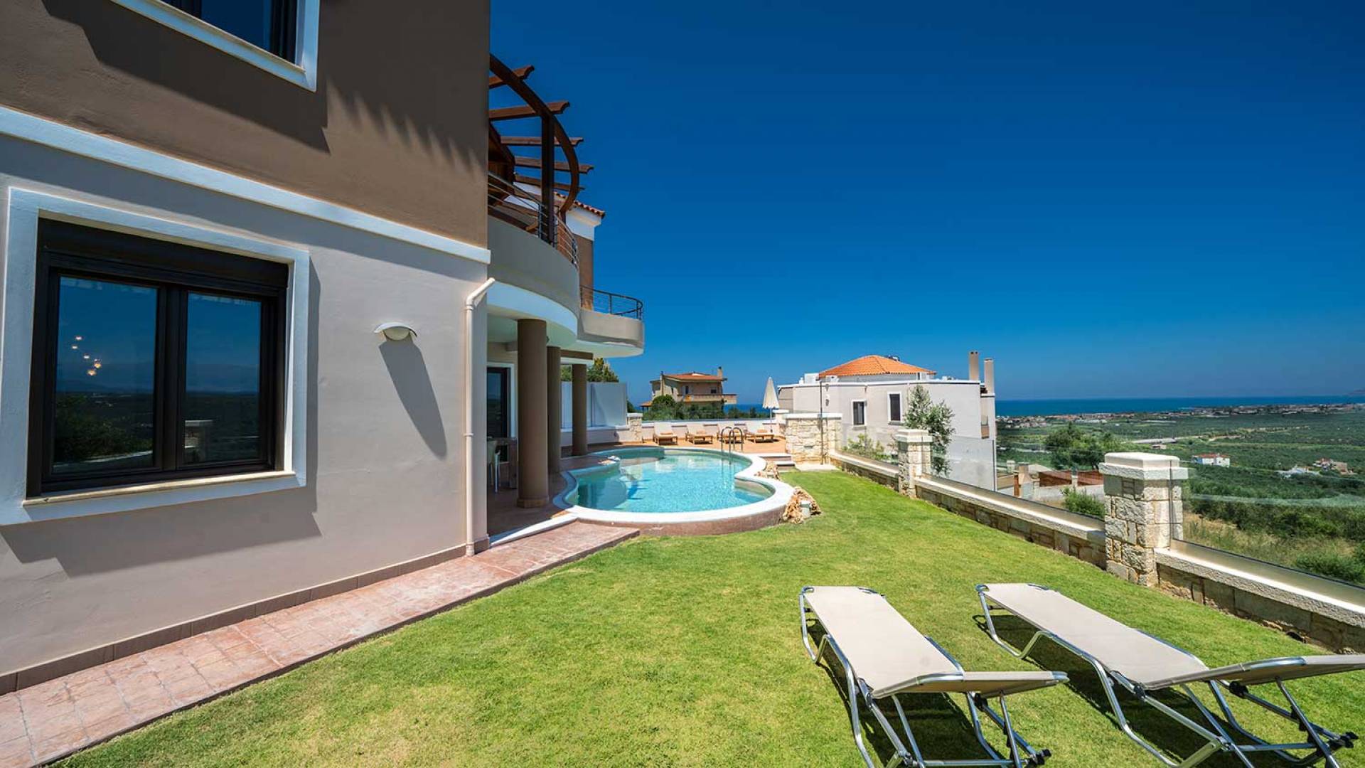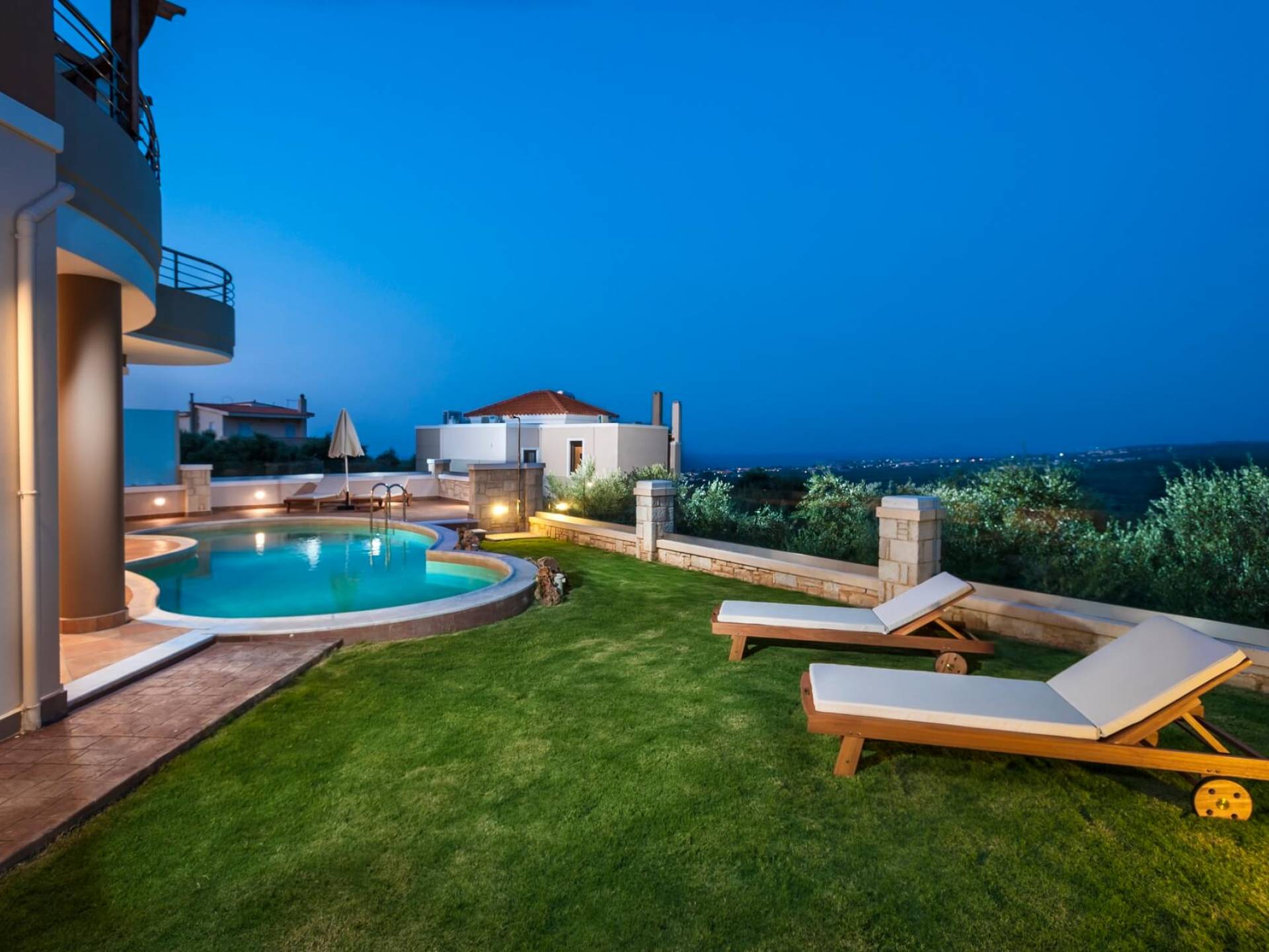There is a large private swimming pool with optional heating, a large private garden with a barbeque area, and parking space. All the pool area is full furnished with sunbeds, chairs, and tables for dining and parasols. In the evening you can either enjoy the magnificent romantic sunset that paints with the nicest colors the clear blue Mediterranean sky or you can drive in a distance of approx 3-4 minutes to the nearest restaurants and taste the Cretan cuisine. Relax and enjoy the private and exclusive atmosphere of a deluxe home with 5-star facilities.