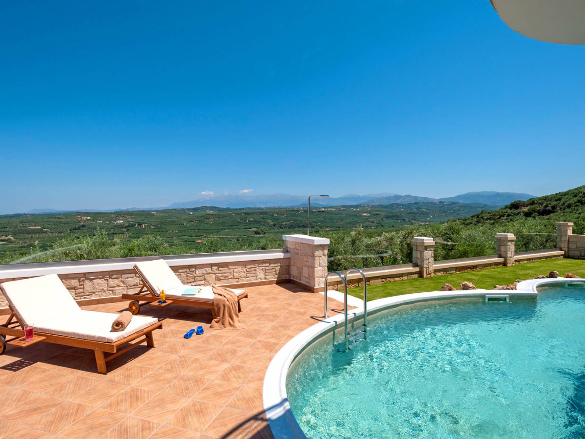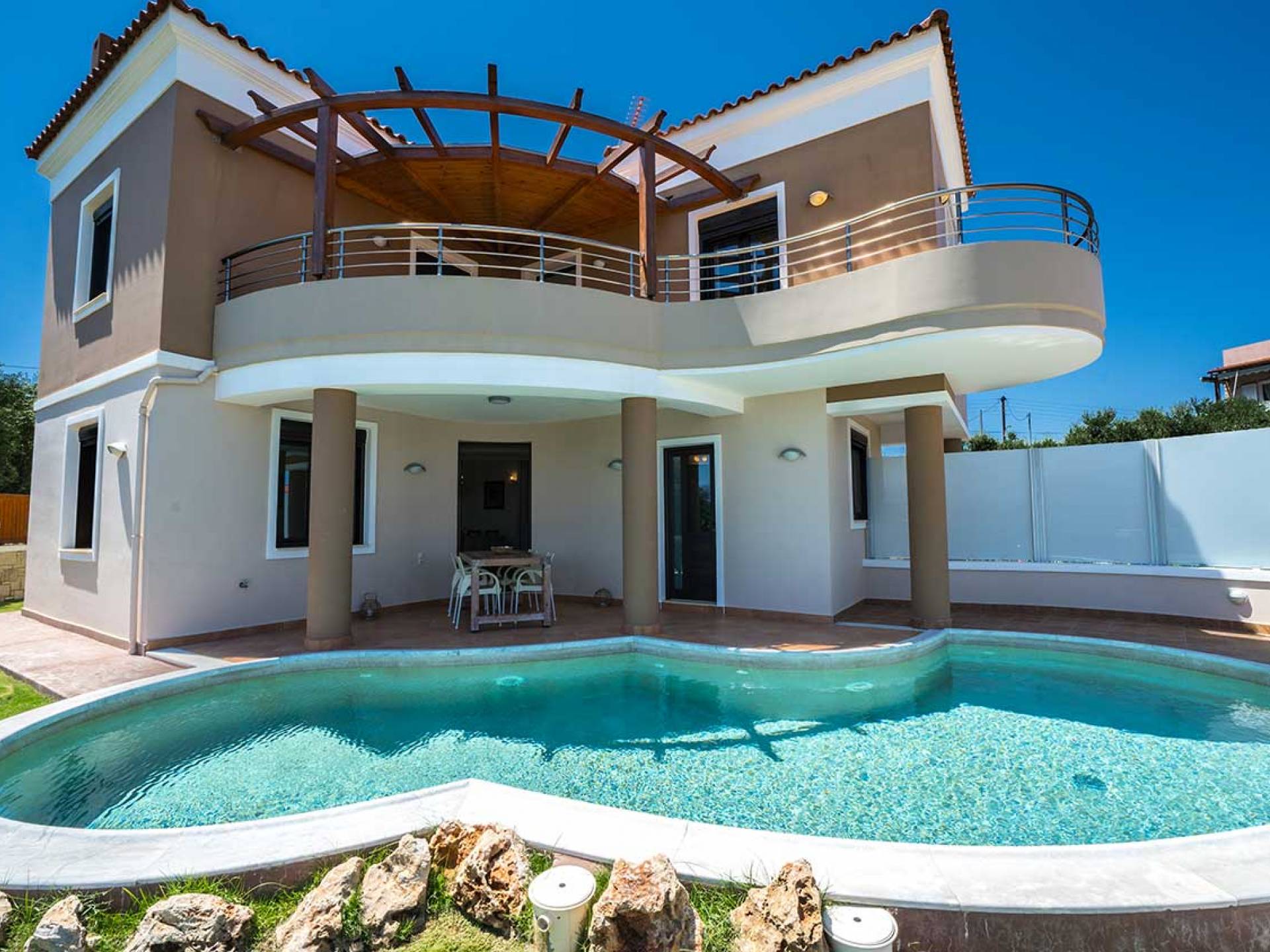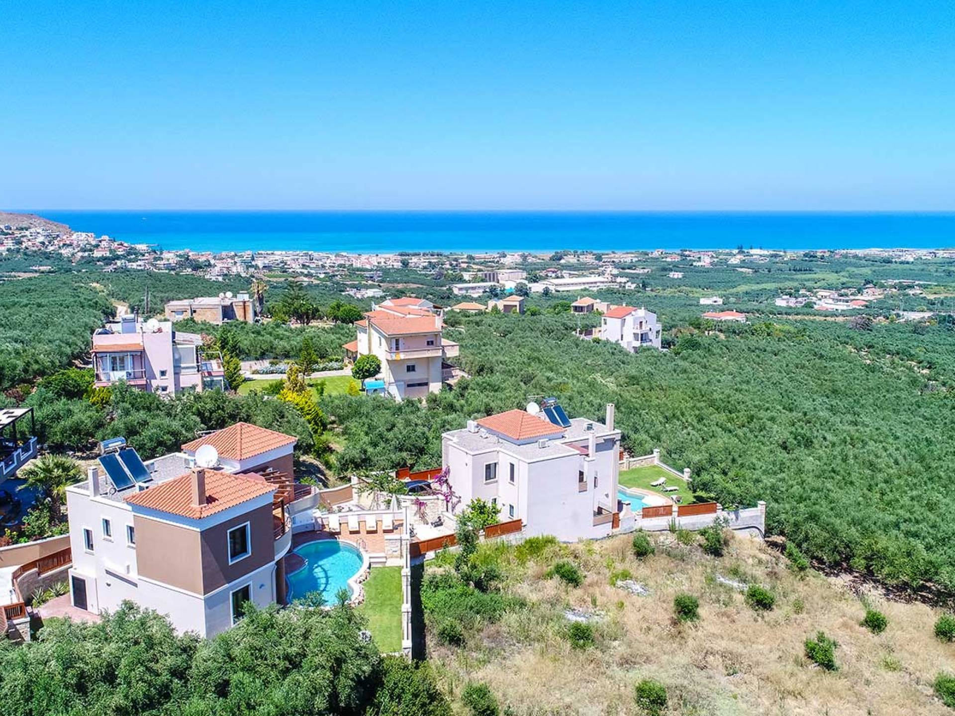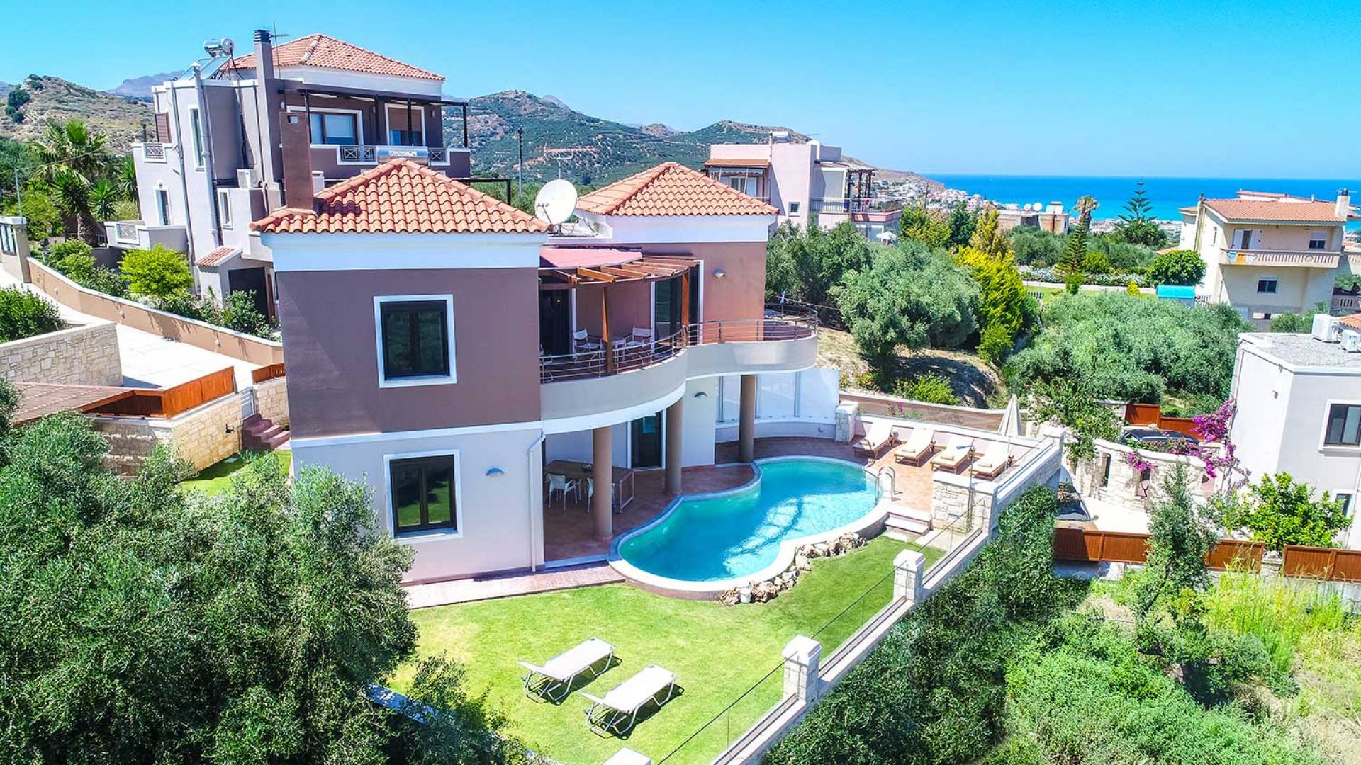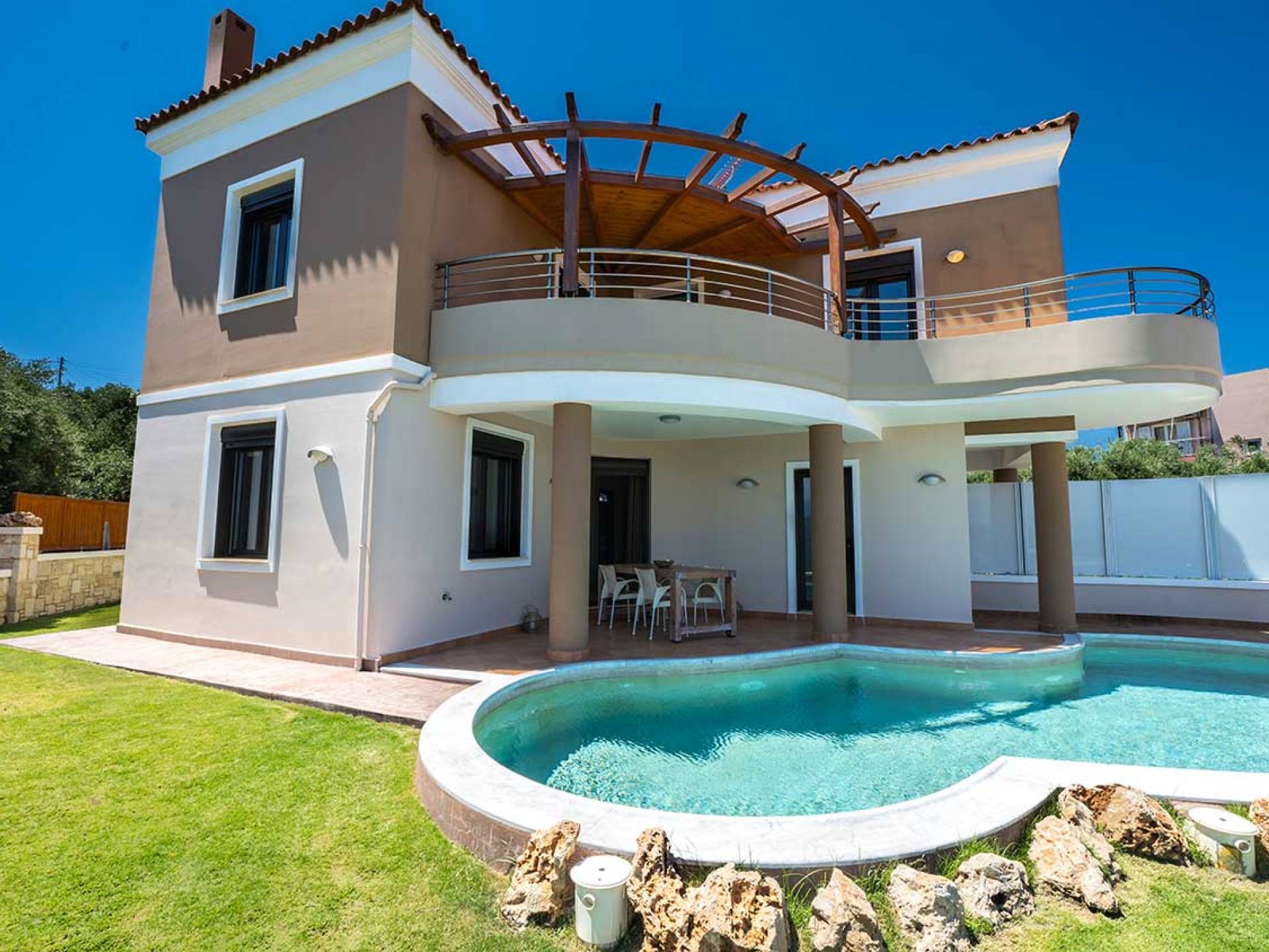 There is a large private swimming pool with optional heating, a large private garden with a barbeque area, and parking space. All the pool area is full furnished with sunbeds, chairs, and tables for dining and parasols. In the evening you can either enjoy the magnificent romantic sunset that paints with the nicest colors the clear blue Mediterranean sky or you can drive in a distance of approx 3-4 minutes to the nearest restaurants and taste the Cretan cuisine. Relax and enjoy the private and exclusive atmosphere of a deluxe home with 5-star facilities.