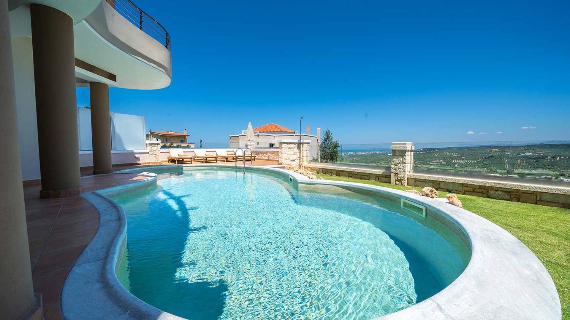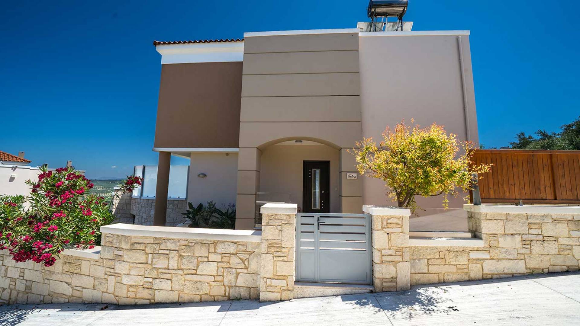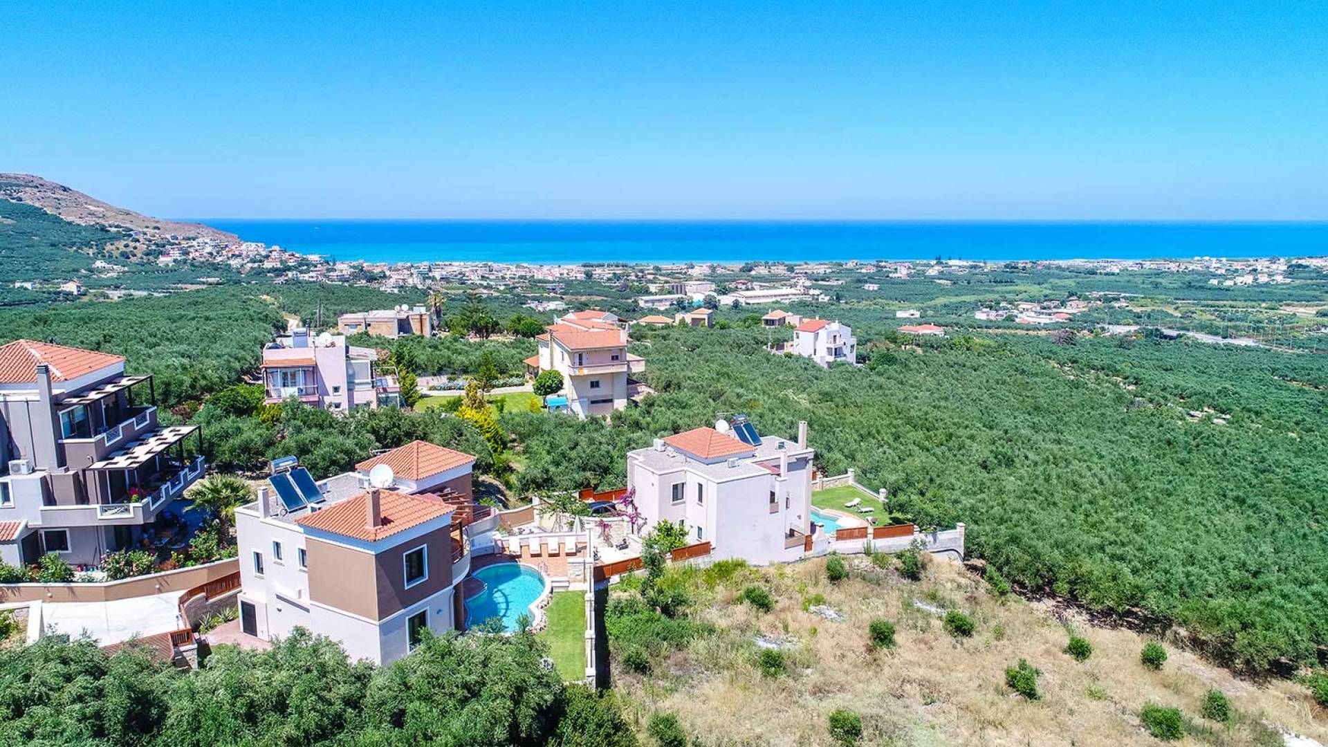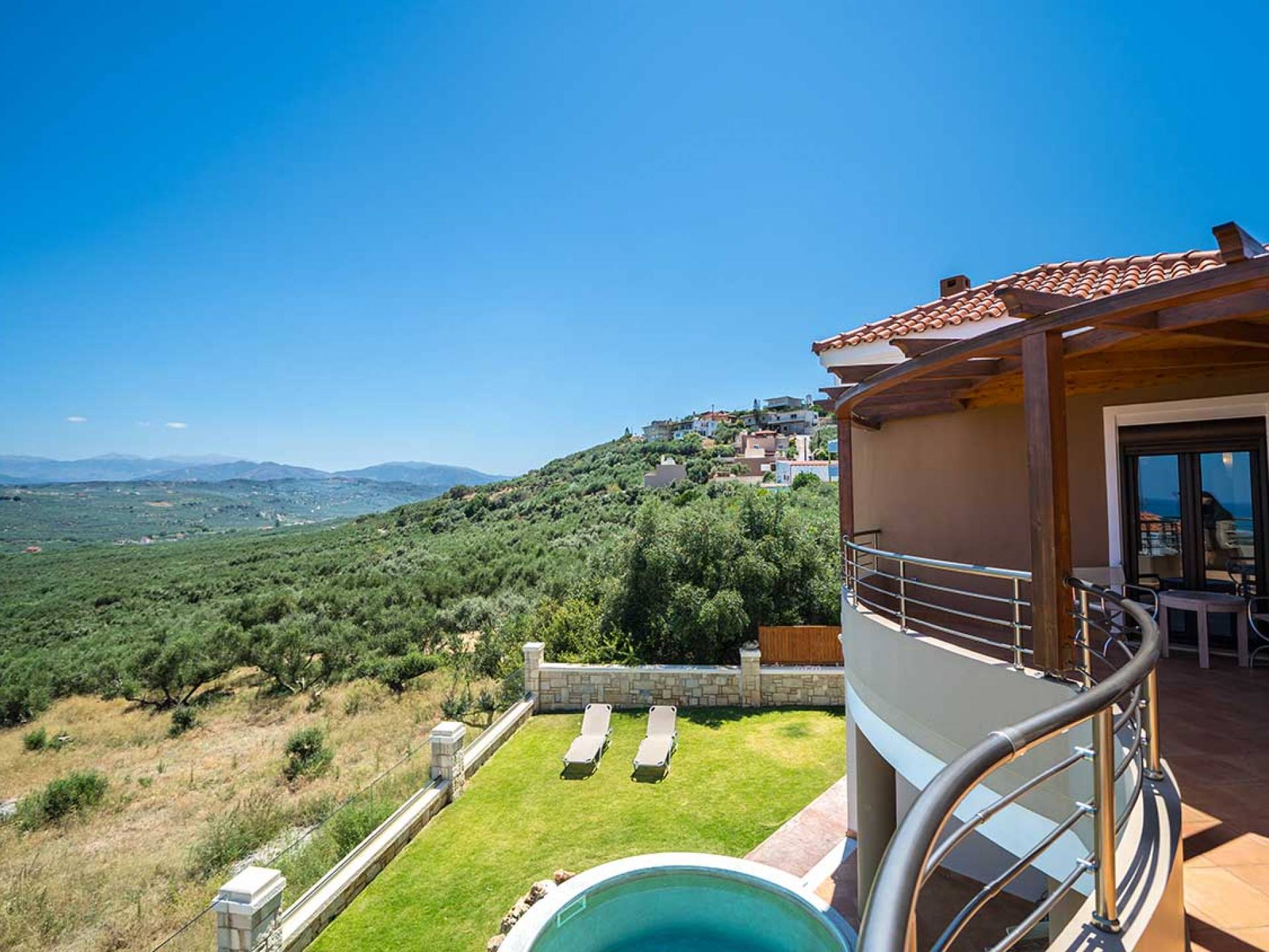 There is a large private swimming pool with optional heating, a large private garden with a barbeque area, and parking space. All the pool area is full furnished with sunbeds, chairs, and tables for dining and parasols. In the evening you can either enjoy the magnificent romantic sunset that paints with the nicest colors the clear blue Mediterranean sky or you can drive in a distance of approx 3-4 minutes to the nearest restaurants and taste the Cretan cuisine. Relax and enjoy the private and exclusive atmosphere of a deluxe home with 5-star facilities.