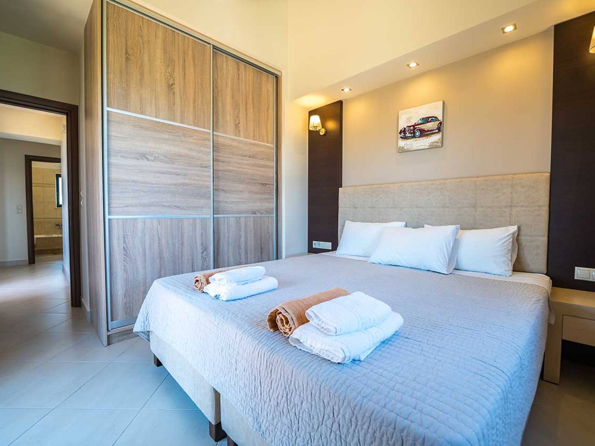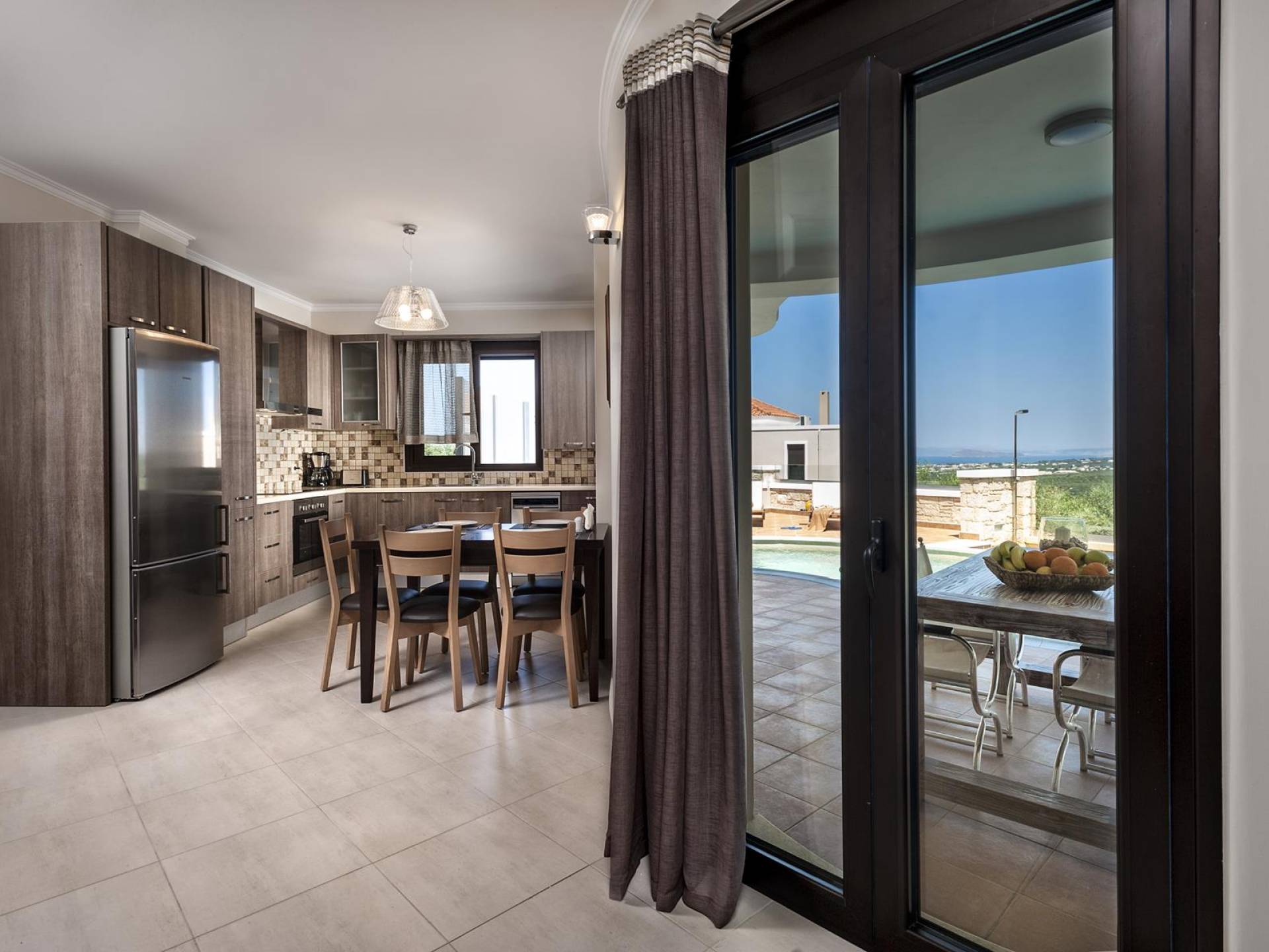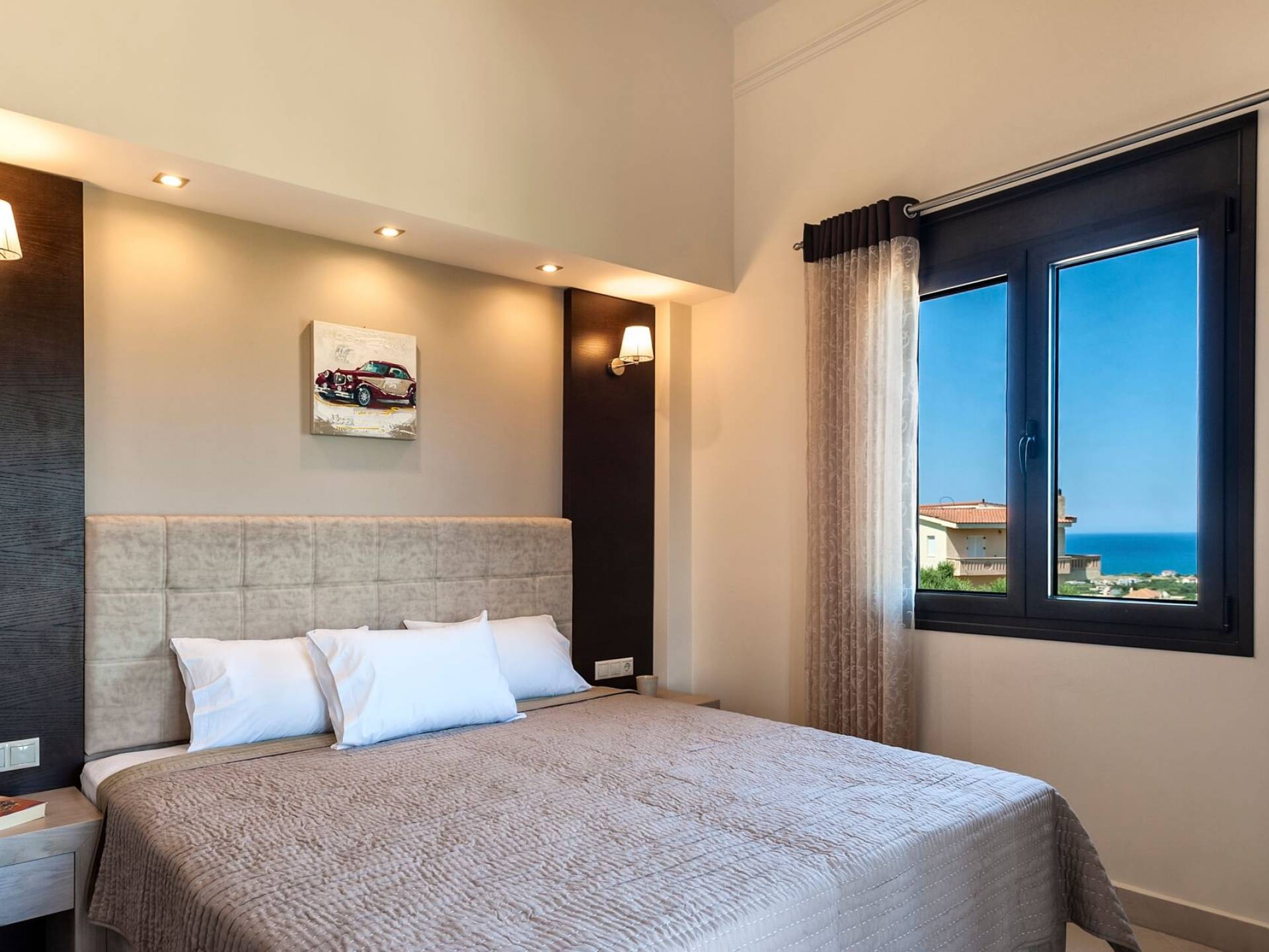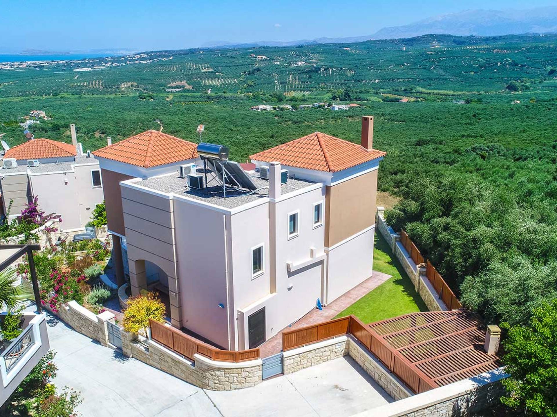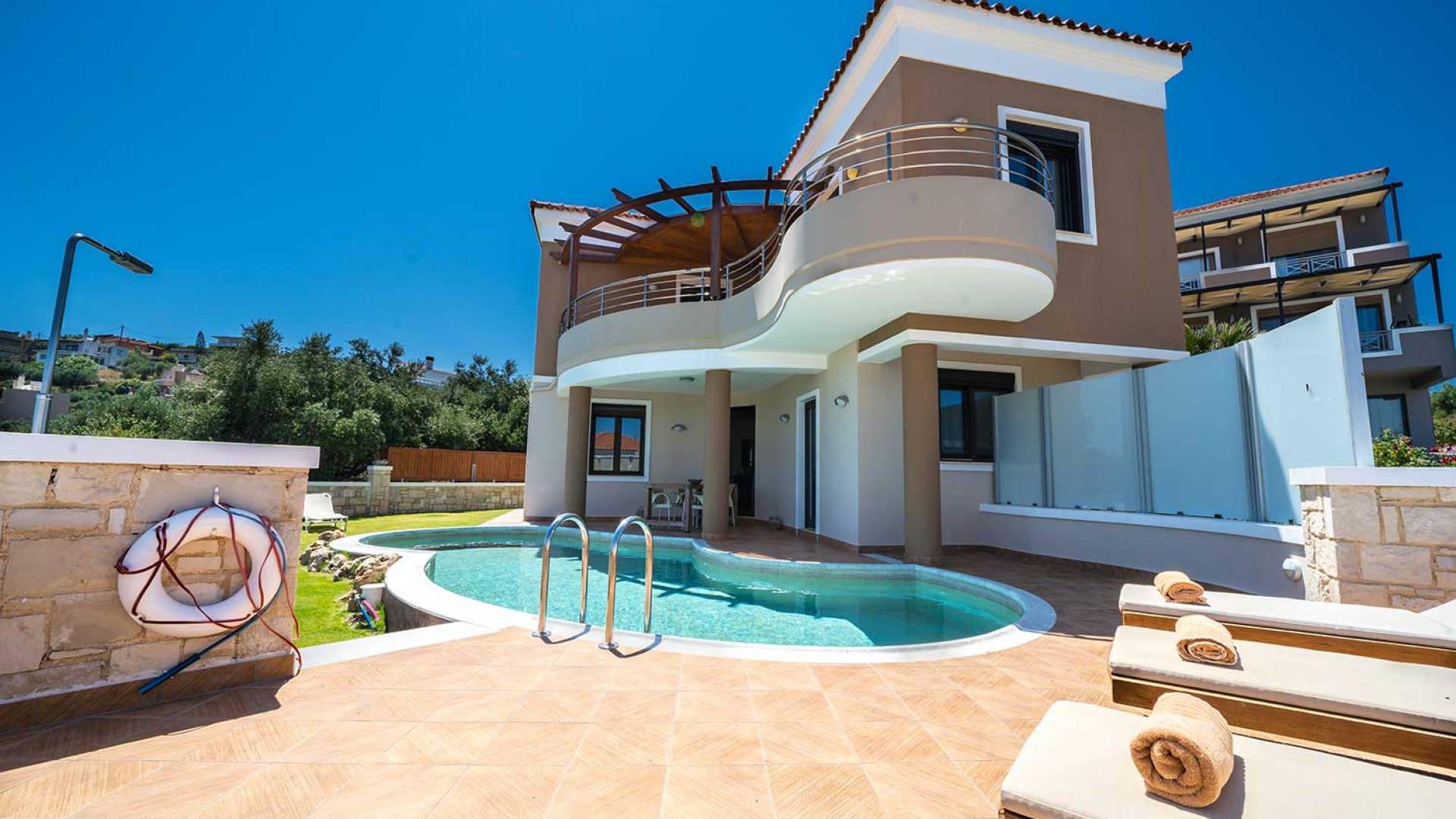 There is a large private swimming pool with optional heating, a large private garden with a barbeque area, and parking space. All the pool area is full furnished with sunbeds, chairs, and tables for dining and parasols. In the evening you can either enjoy the magnificent romantic sunset that paints with the nicest colors the clear blue Mediterranean sky or you can drive in a distance of approx 3-4 minutes to the nearest restaurants and taste the Cretan cuisine. Relax and enjoy the private and exclusive atmosphere of a deluxe home with 5-star facilities.
