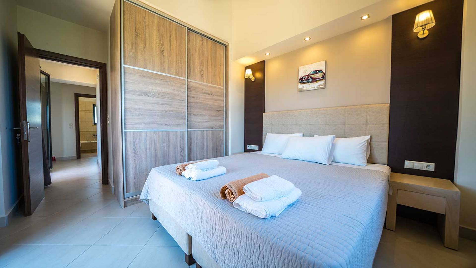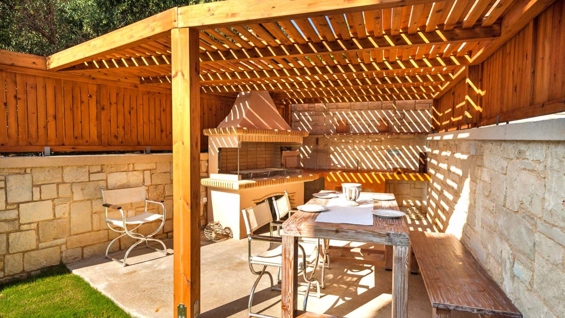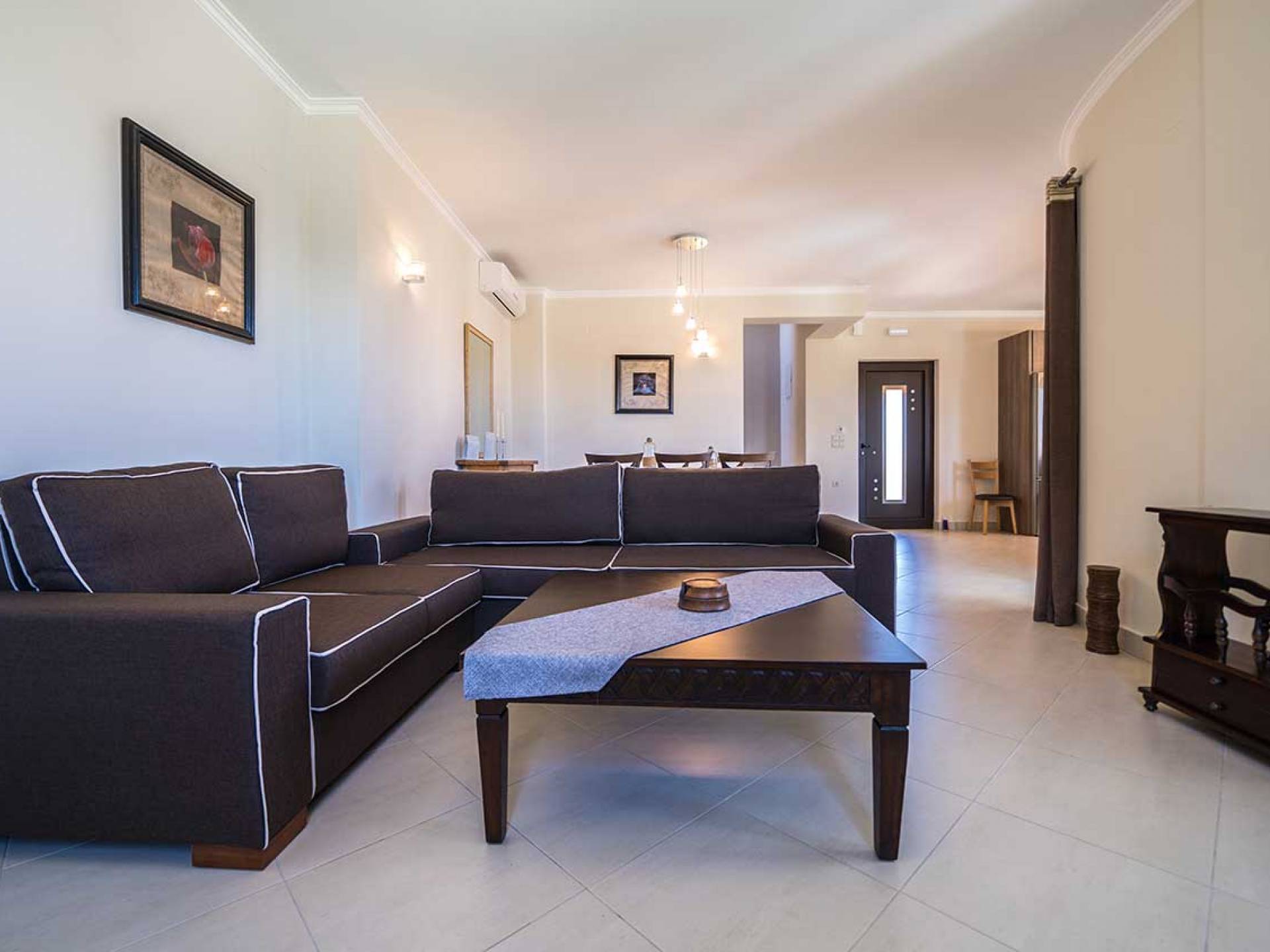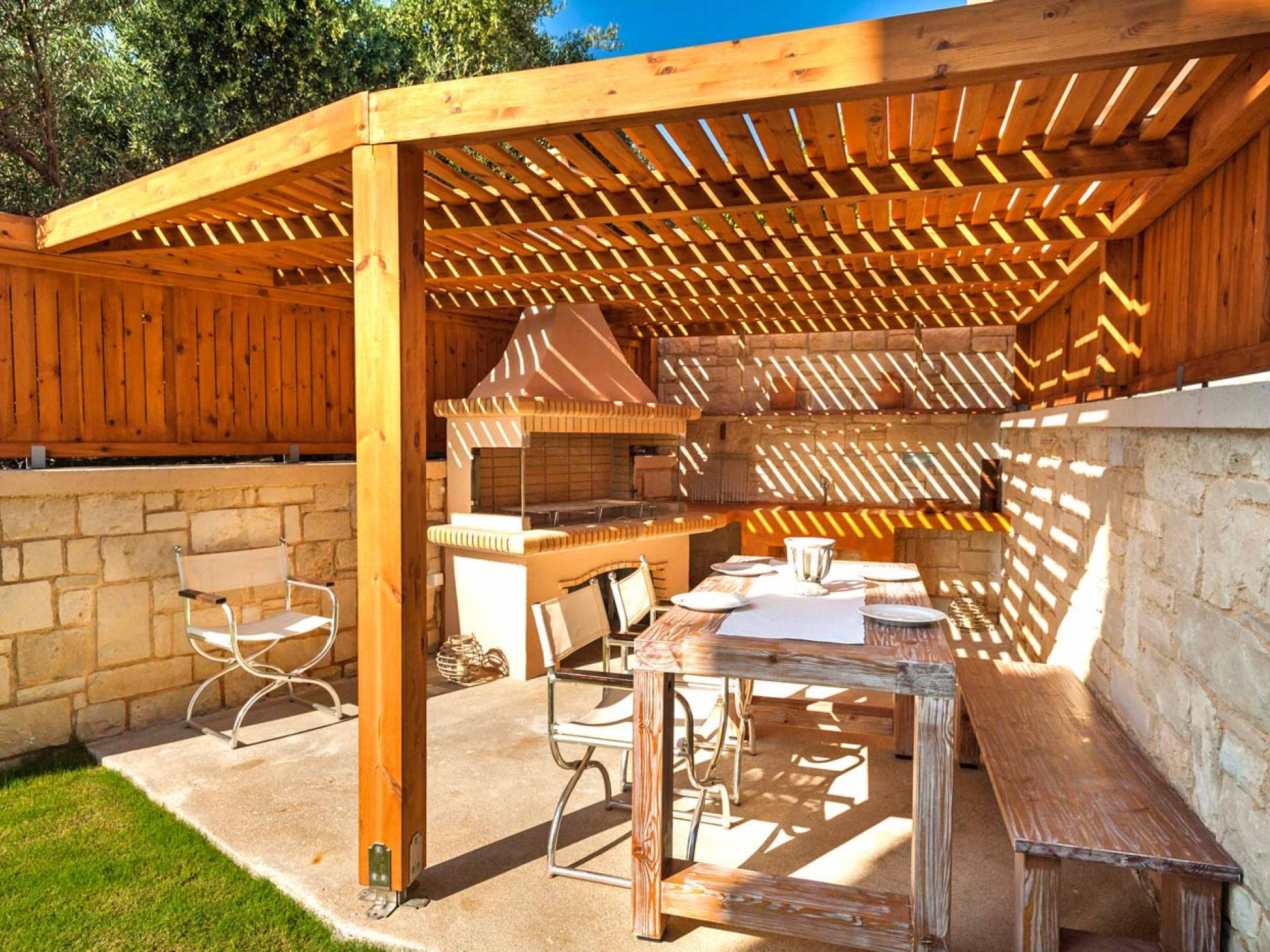 There is a large private swimming pool with optional heating, a large private garden with a barbeque area, and parking space. All the pool area is full furnished with sunbeds, chairs, and tables for dining and parasols. In the evening you can either enjoy the magnificent romantic sunset that paints with the nicest colors the clear blue Mediterranean sky or you can drive in a distance of approx 3-4 minutes to the nearest restaurants and taste the Cretan cuisine. Relax and enjoy the private and exclusive atmosphere of a deluxe home with 5-star facilities.