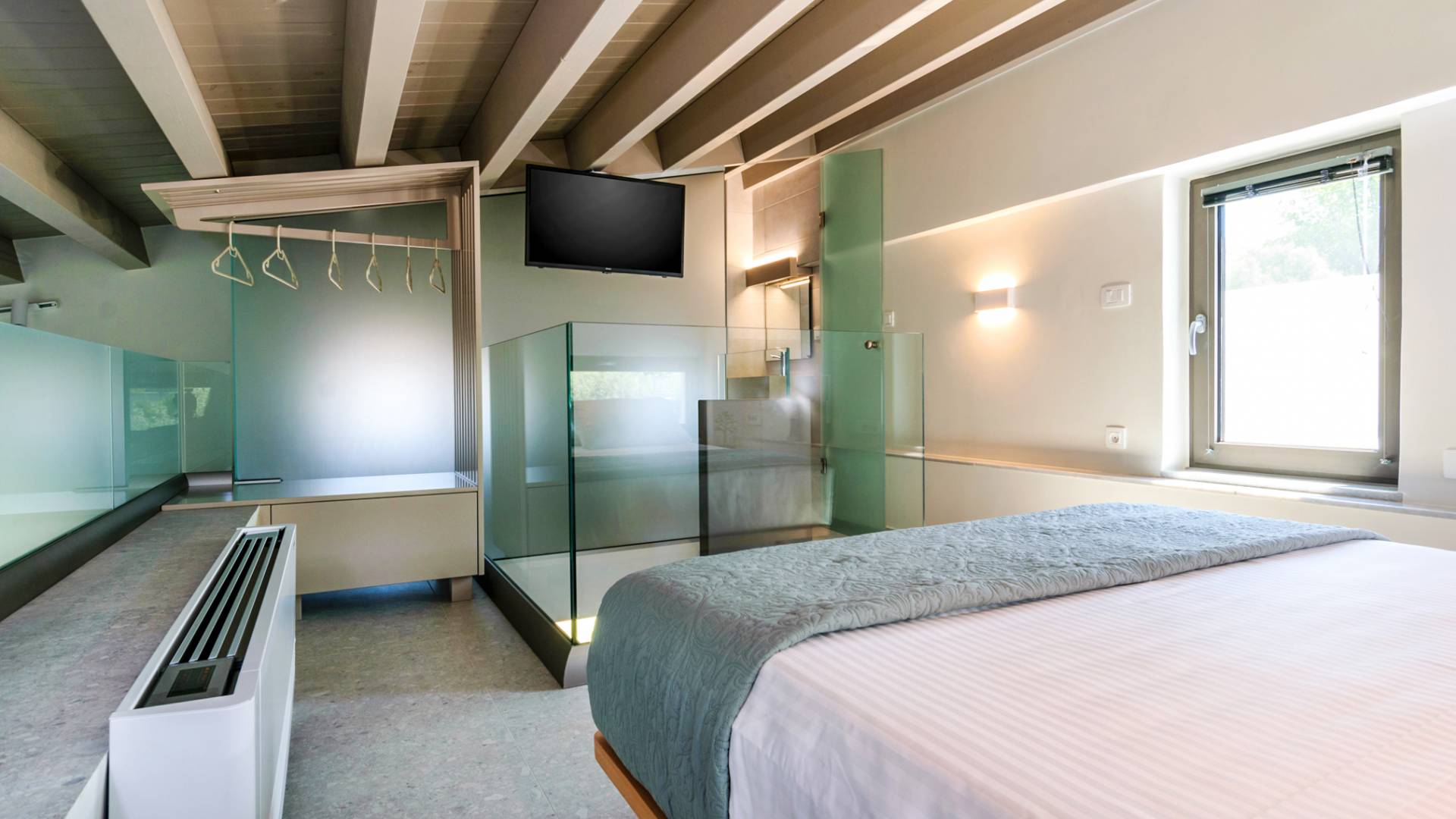 - Bedroom with queen bed, ensuite bathroom and balcony access