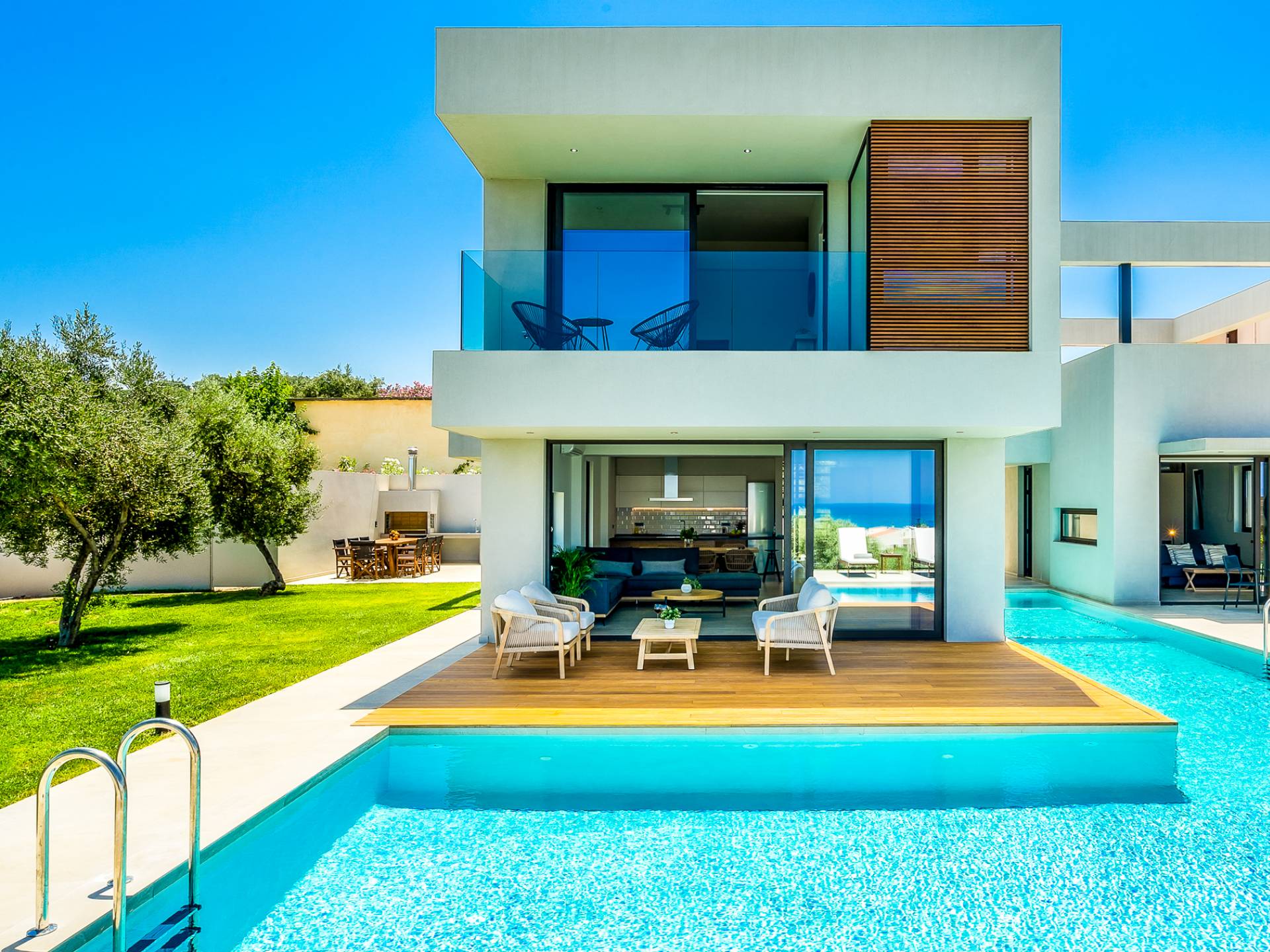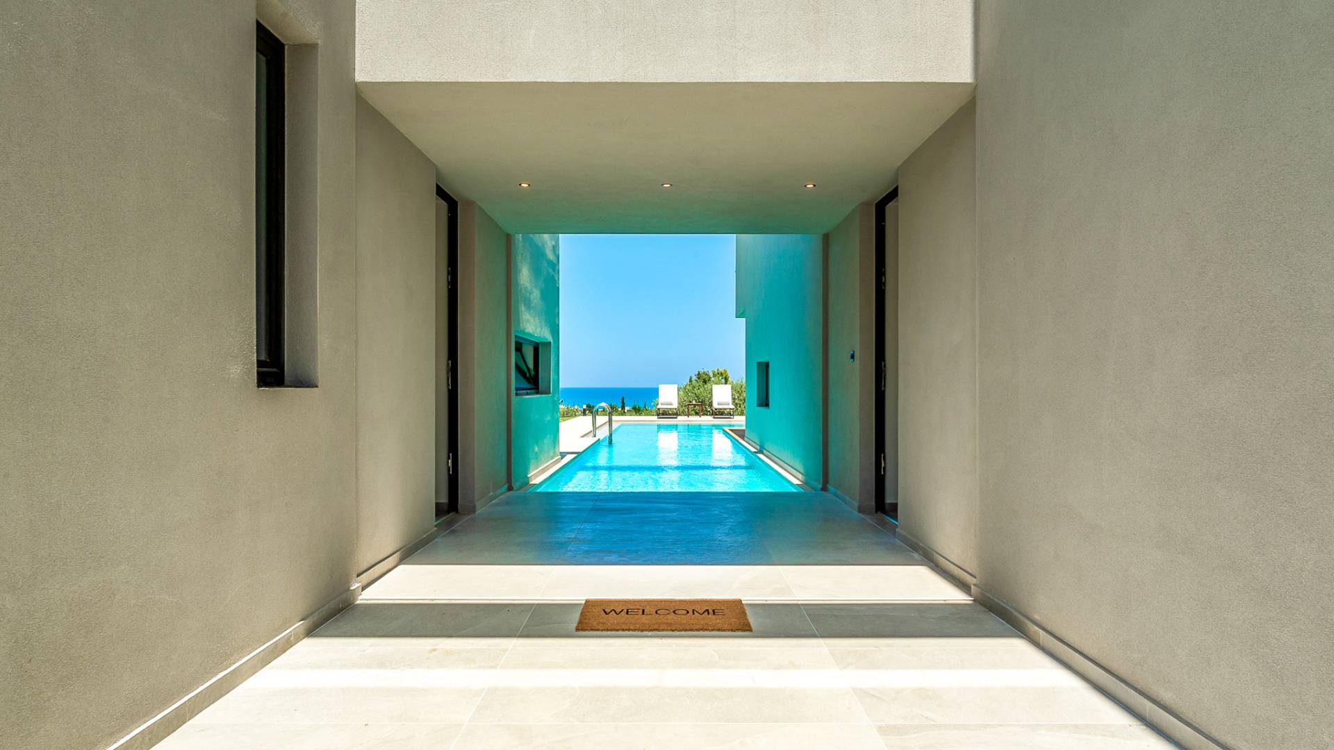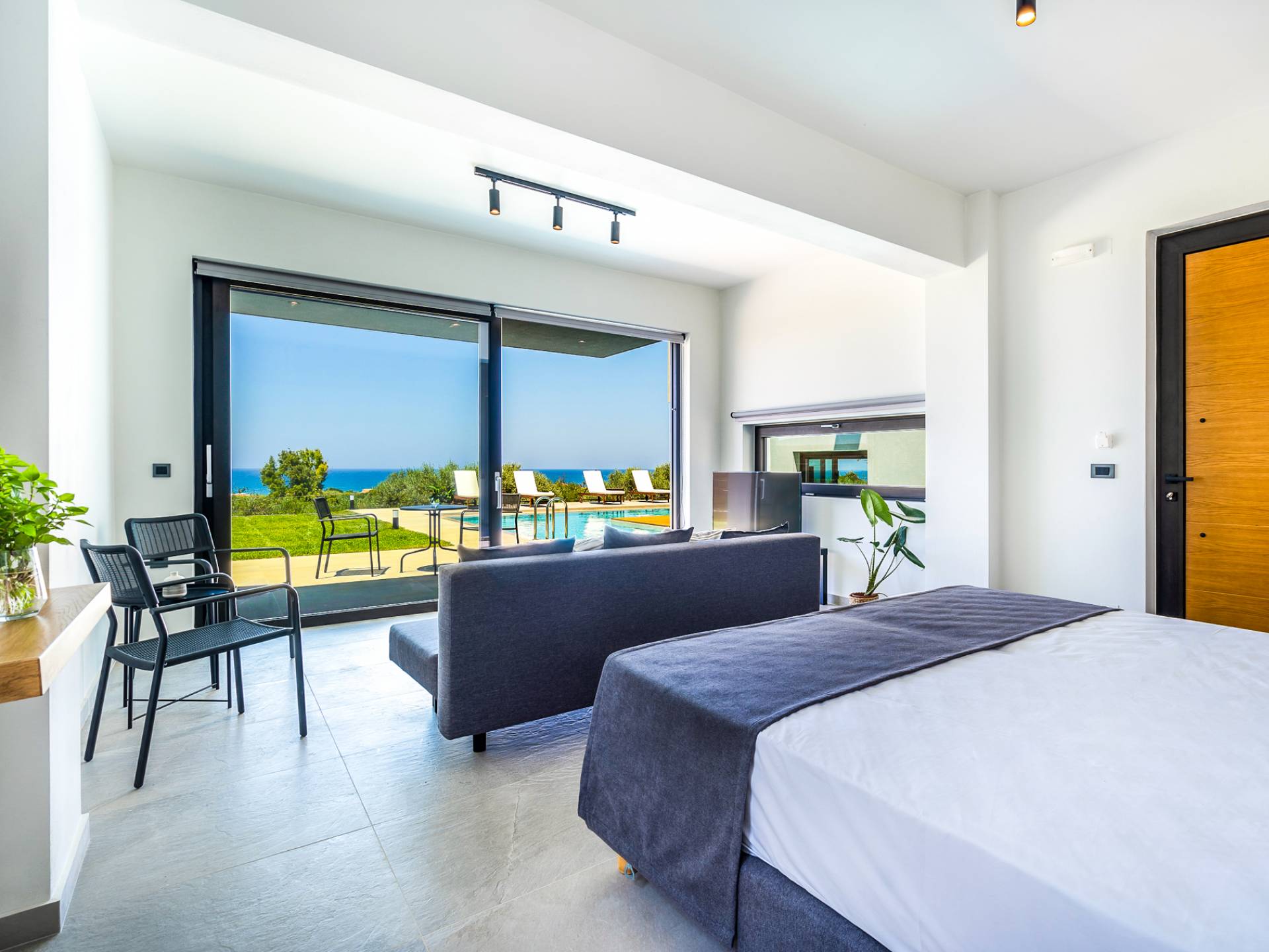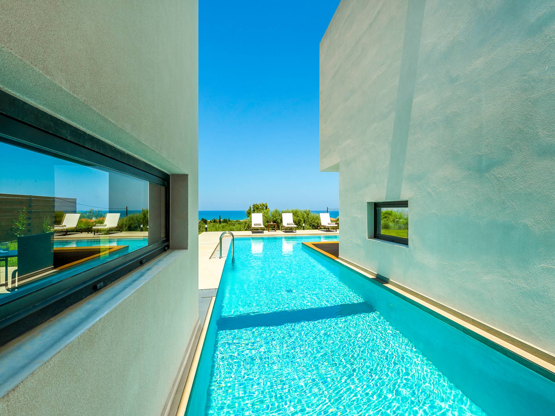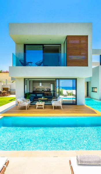 The 230 sq.m. villa Avra boasts the comfort of 4 en-suite bedrooms, sleeping 8 guests in beds and up to 9 if it's necessary. Entering the driveway, Villa Avra is the first of the two villas reached. Striking cubic design and a full glass-paneled wall are an incredible welcome to a divine villa. Approaching the property provides your first introduction to the gorgeous swimming pool and view beyond the villa. The approach to the main house uses illusion with its two parts appearing to be bridged across the pool. Two separate entrances lead you to either the main house or annex.