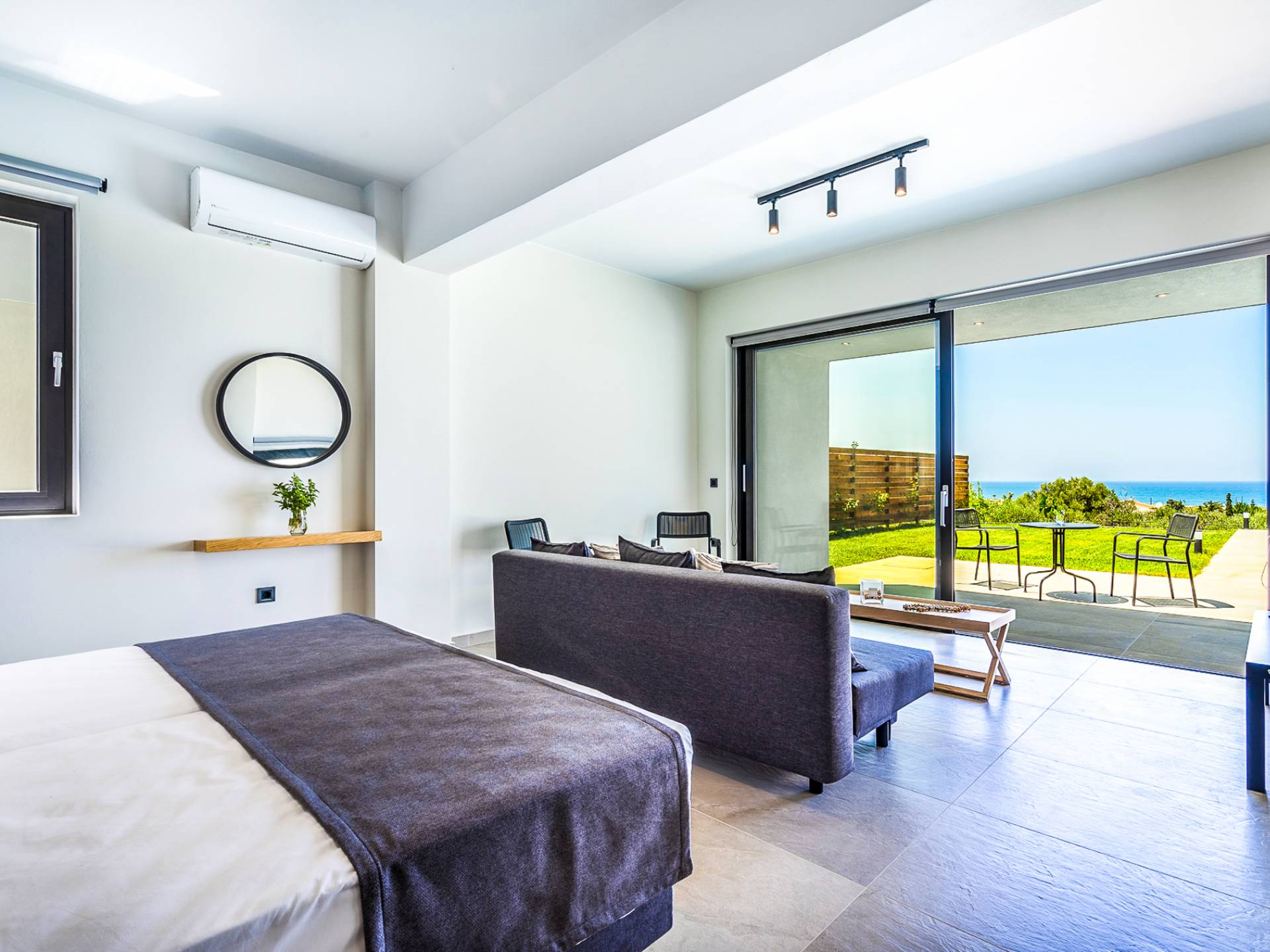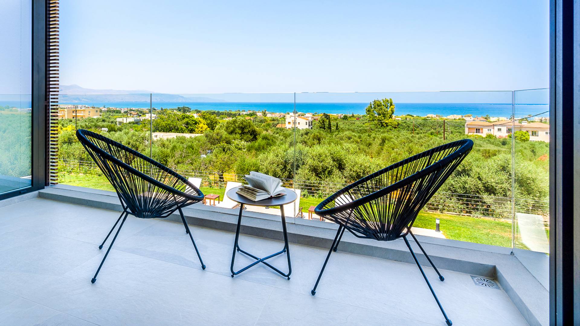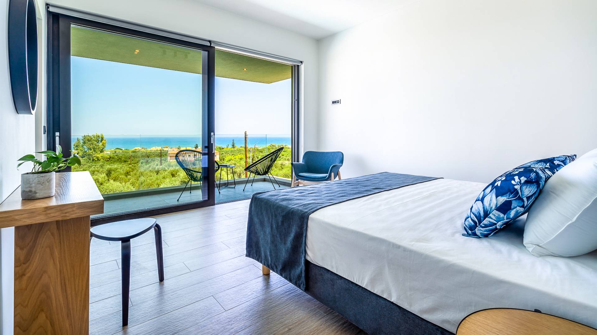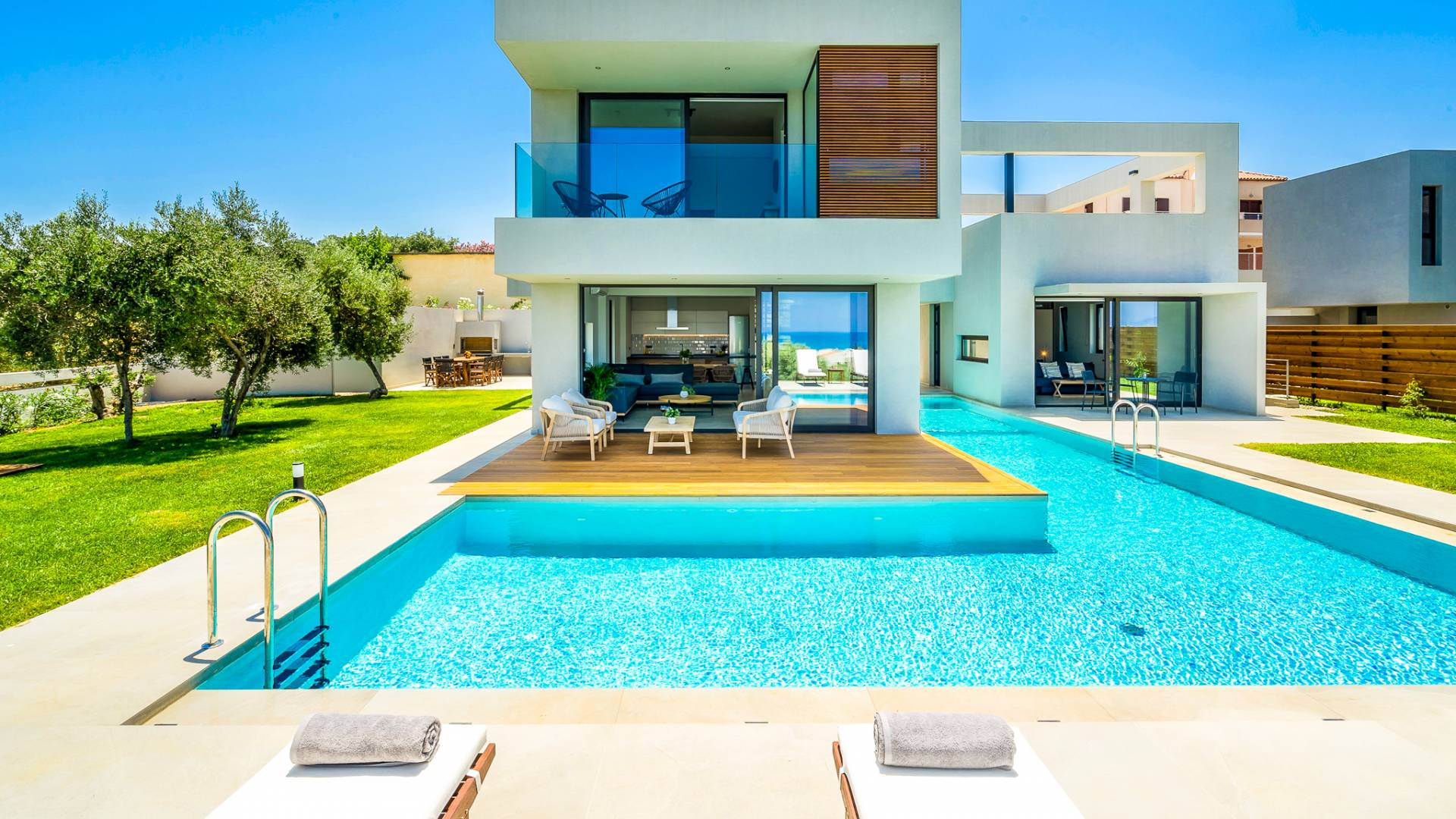 The 230 sq.m. villa Avra boasts the comfort of 4 en-suite bedrooms, sleeping 8 guests in beds and up to 9 if it's necessary. Entering the driveway, Villa Avra is the first of the two villas reached. Striking cubic design and a full glass-paneled wall are an incredible welcome to a divine villa. Approaching the property provides your first introduction to the gorgeous swimming pool and view beyond the villa. The approach to the main house uses illusion with its two parts appearing to be bridged across the pool. Two separate entrances lead you to either the main house or annex.