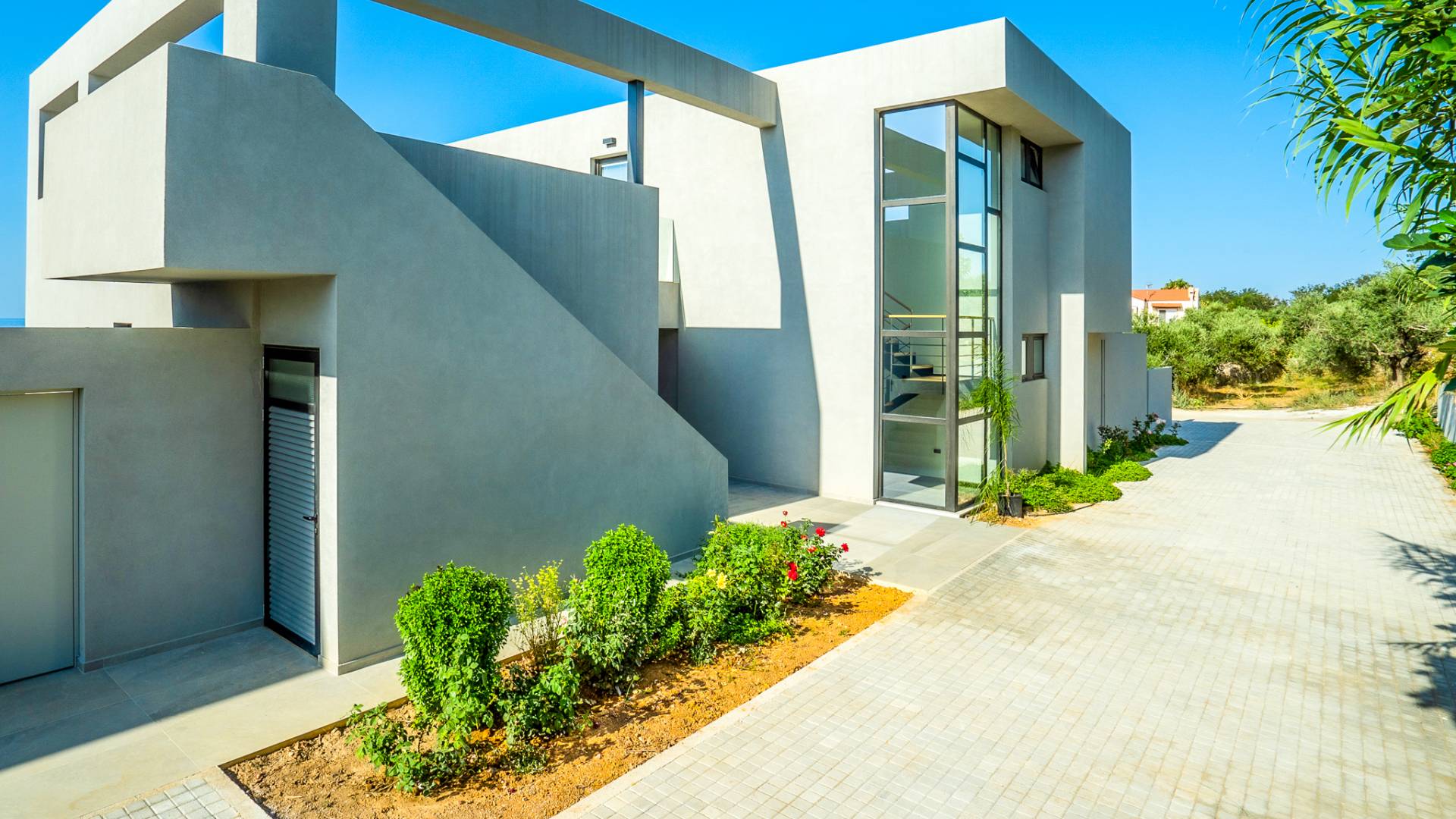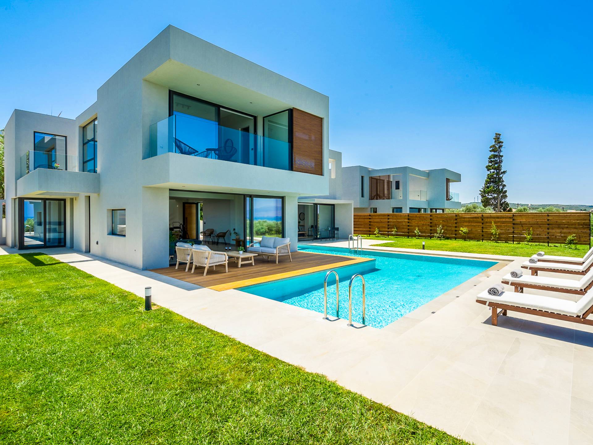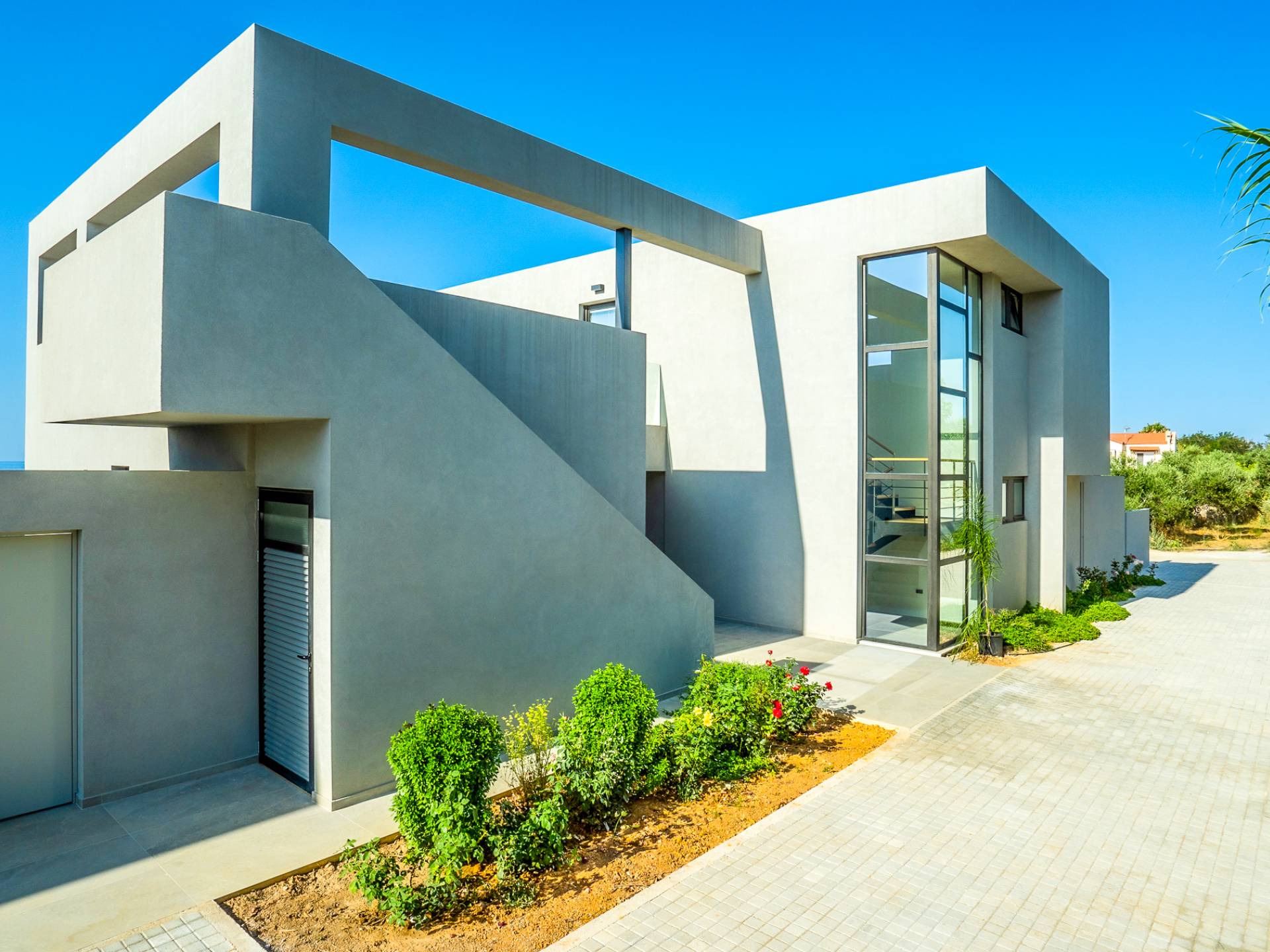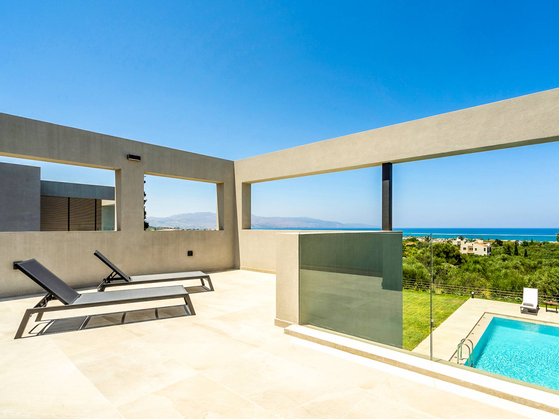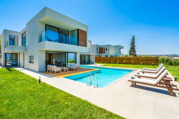 Villa Avra Chania is a strong architectural, modern design located between the resorts of Gerani and Maleme in the Chania area. Reached via a shared driveway, these two properties sit side by side and enjoy panoramic views over the area. Clean lines and stunning glass features combined with minimalistic, sleek composition transport the outdoor environment into the internal space and create a calm, clutter-free environment for both body and mind. Ideally located on a slight elevation providing panoramic views, just 1 Km away from the beach and close to every desired amenity, Pirgos Villas offer a great base for your holidays.