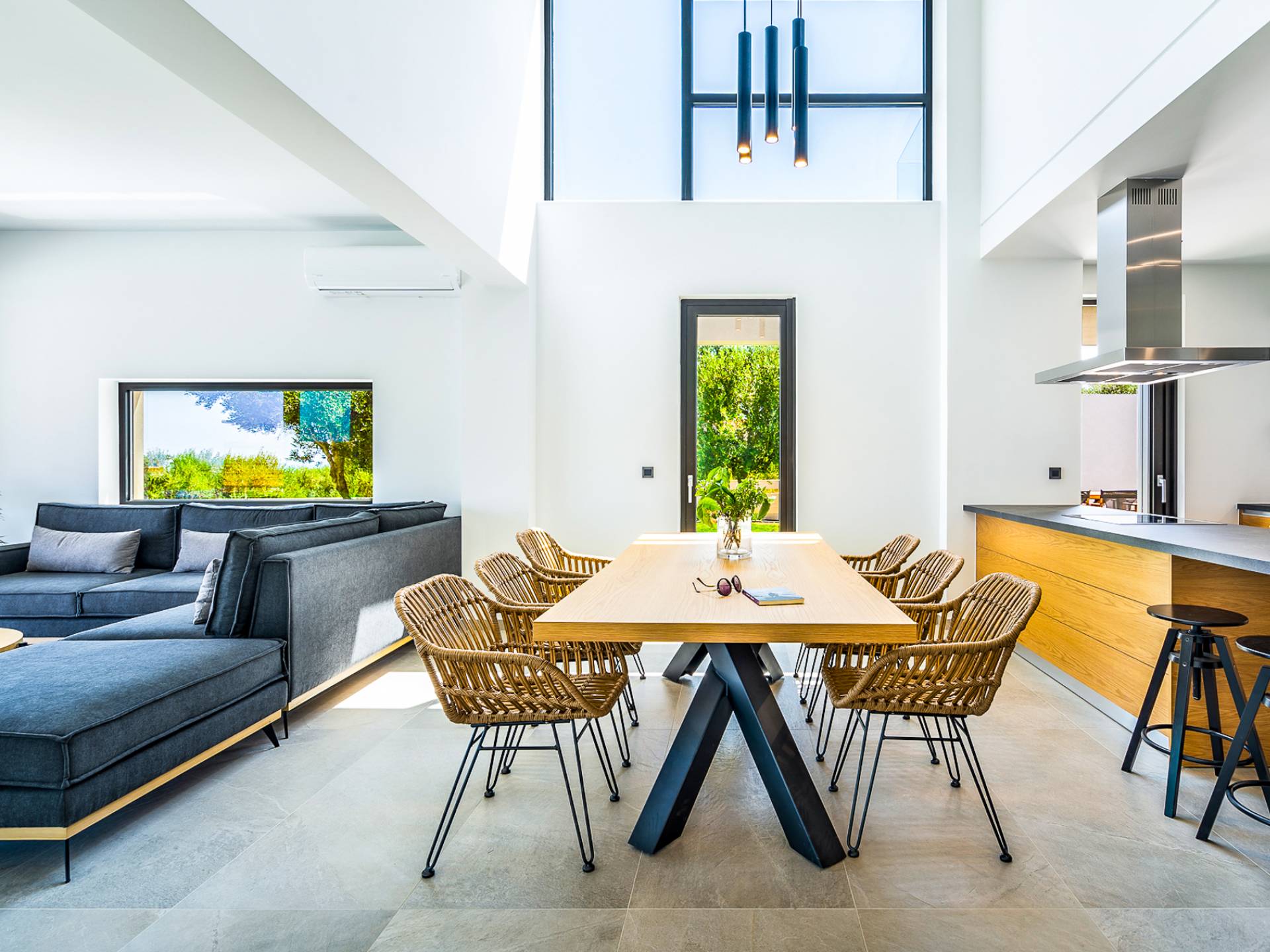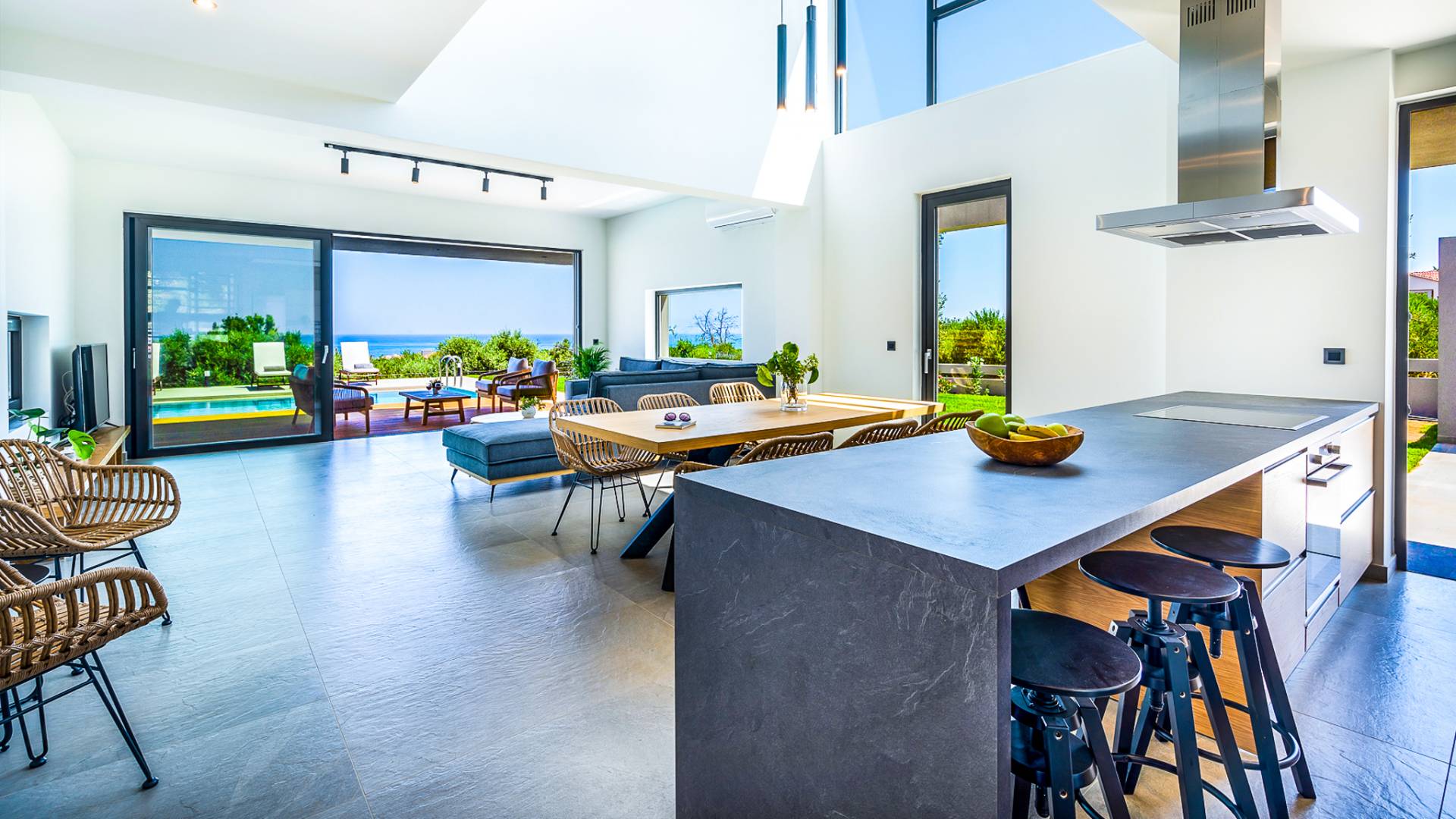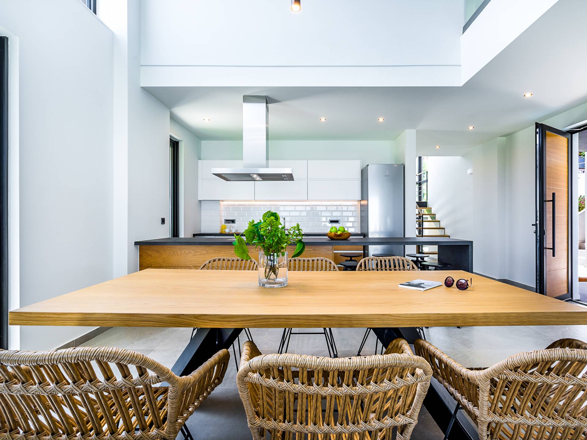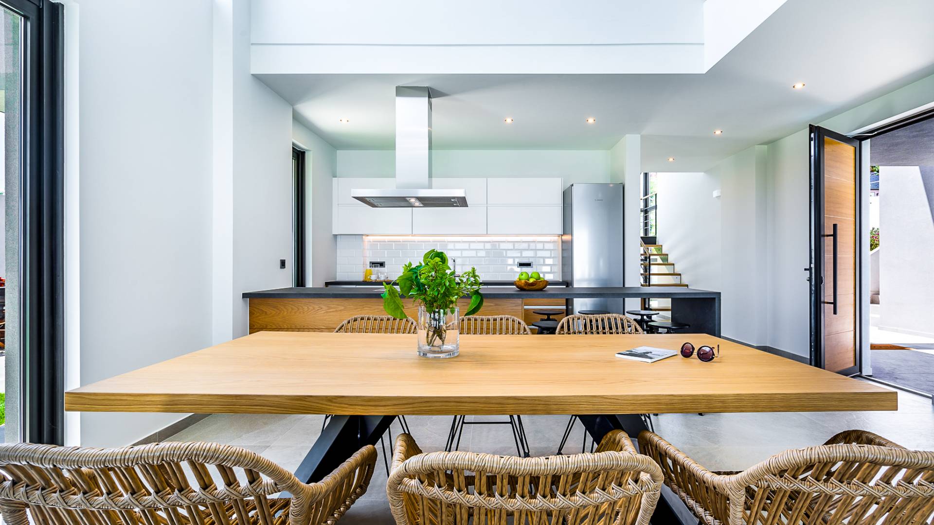 Entering the house you are struck by the ingenuity of design. Every detail is used to create a sense of space and simplicity, from the 8 meter wide sliding doors, to the open tread staircase. Clean lines, calming tones and wood invite you into the large open plan living space. The large sofas provide a comfortable area to gather and enjoy the view or a movie. A sleek kitchen offers all the facilities required to rustle up some tasty meals in an indoor dining area.