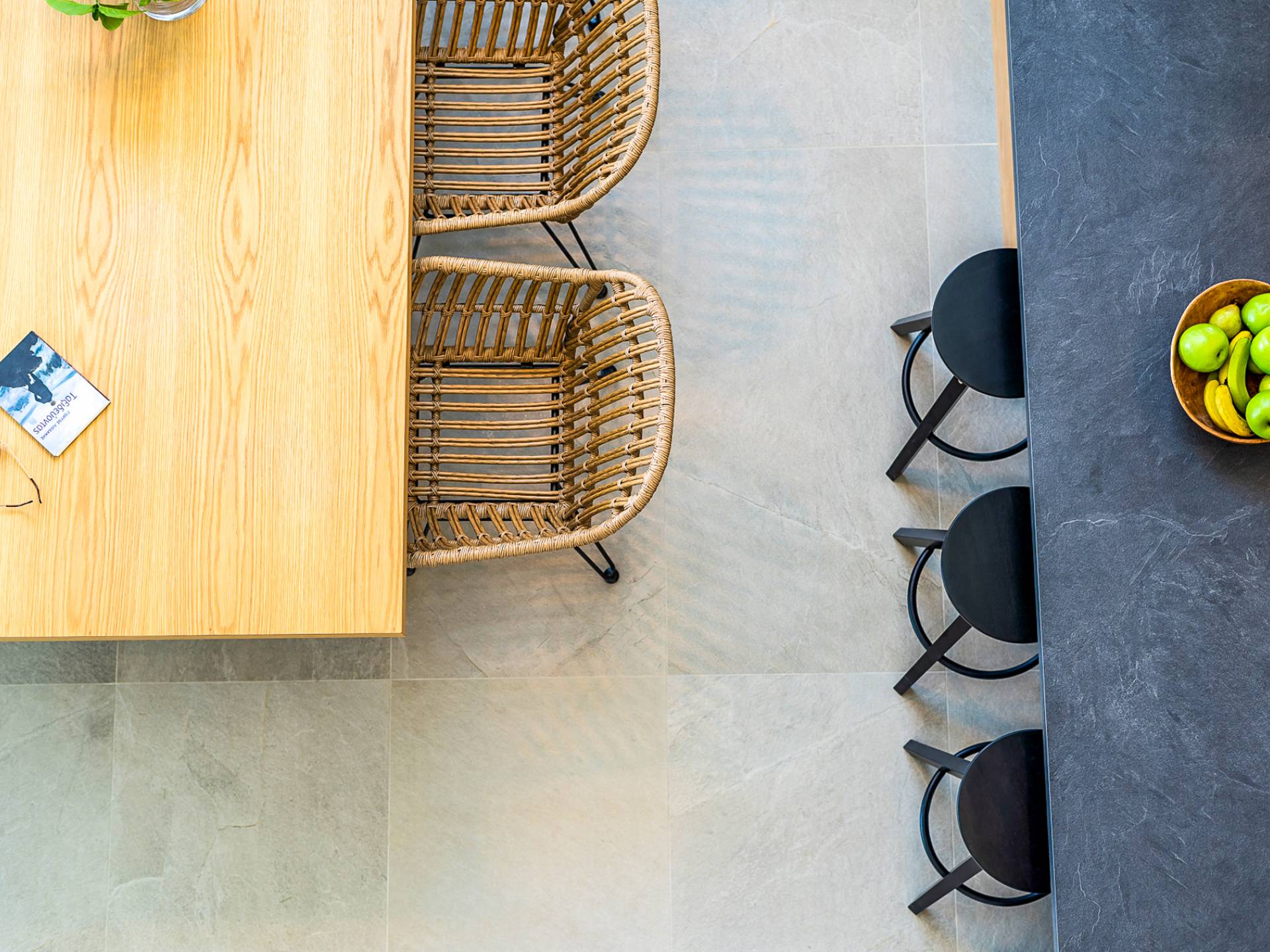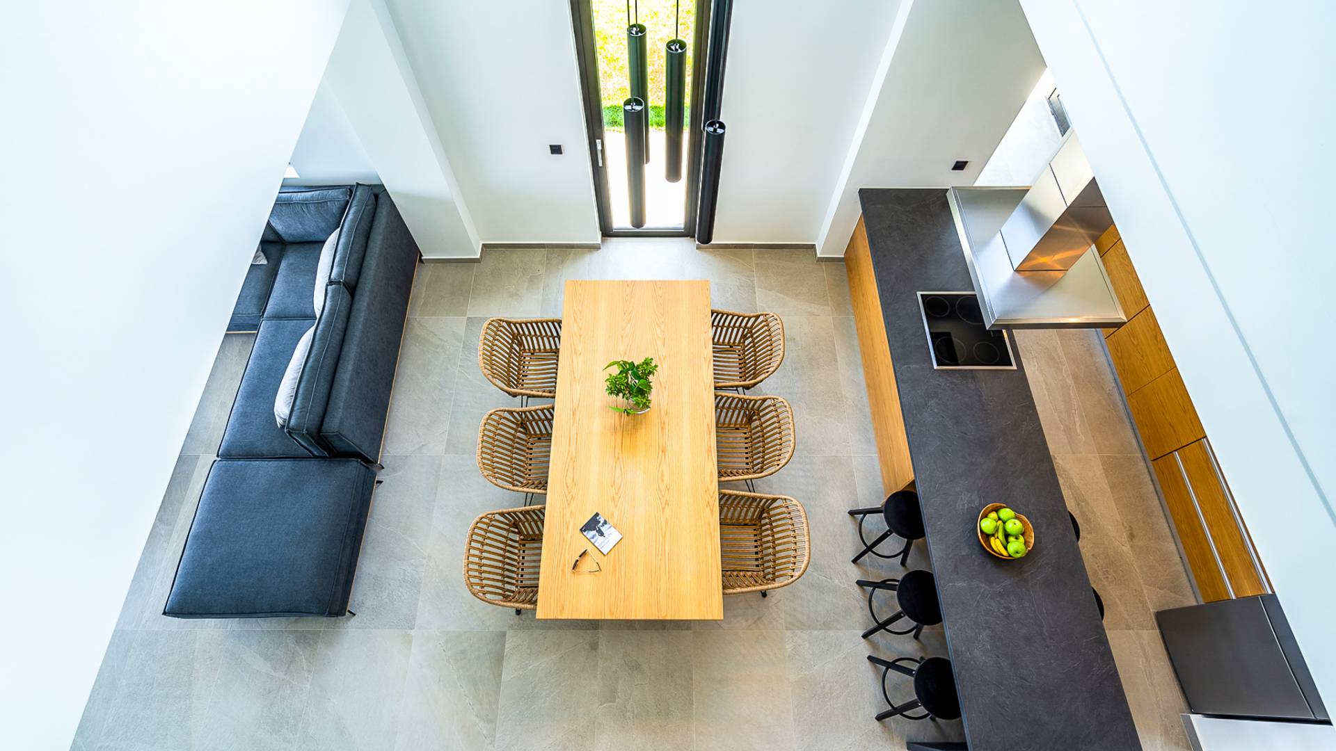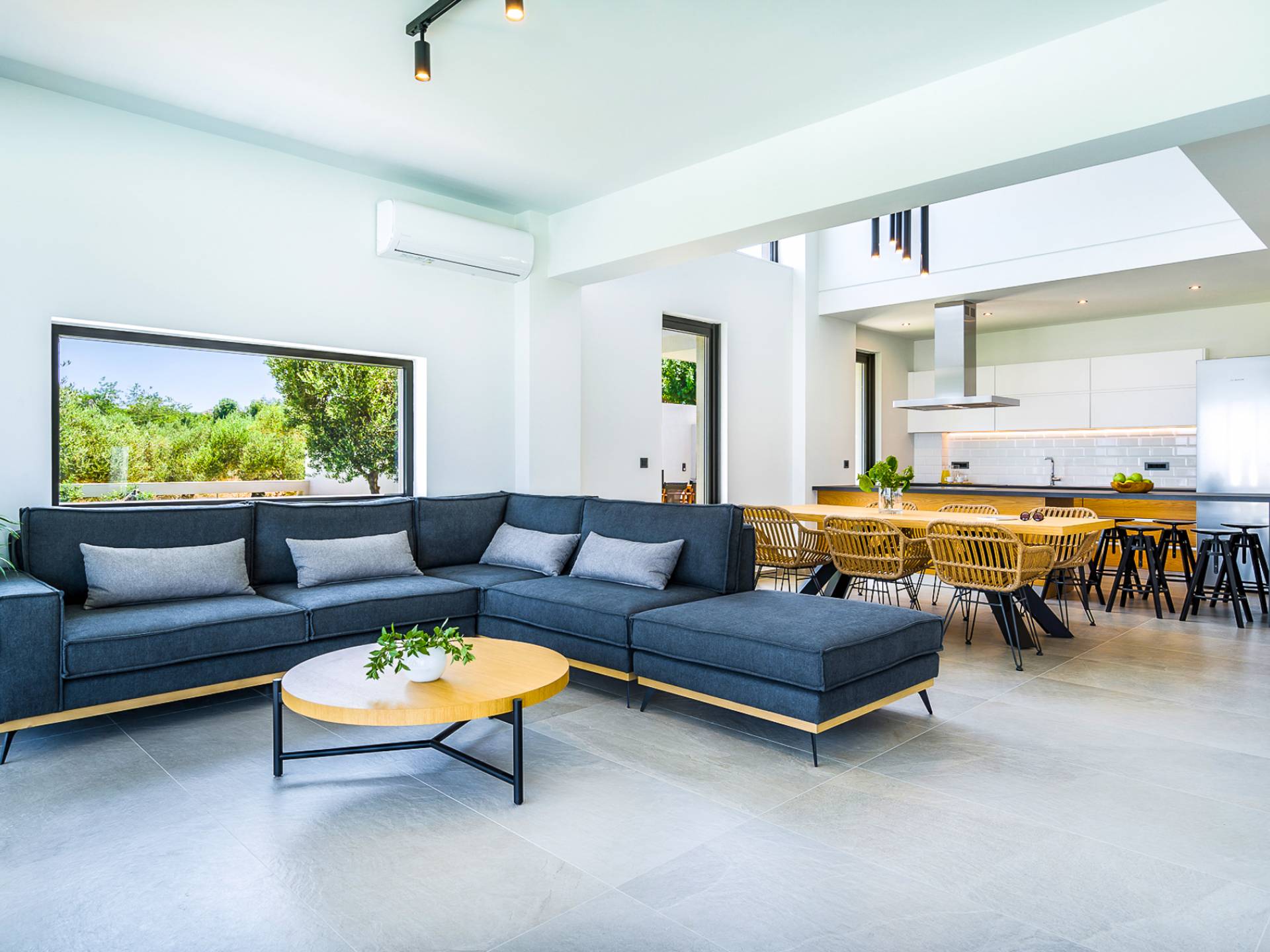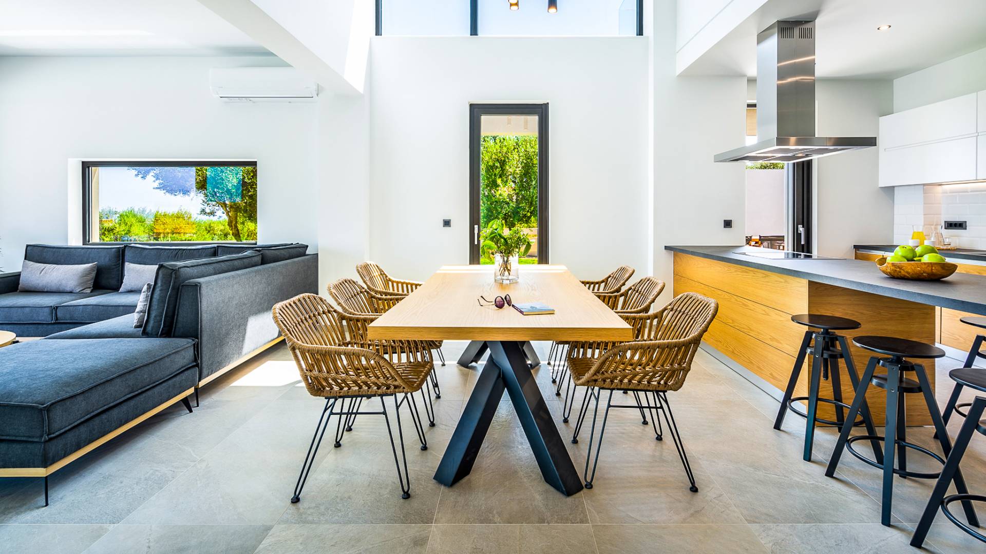 Entering the house you are struck by the ingenuity of design. Every detail is used to create a sense of space and simplicity, from the 8 meter wide sliding doors, to the open tread staircase. Clean lines, calming tones and wood invite you into the large open plan living space. The large sofas provide a comfortable area to gather and enjoy the view or a movie. A sleek kitchen offers all the facilities required to rustle up some tasty meals in an indoor dining area.