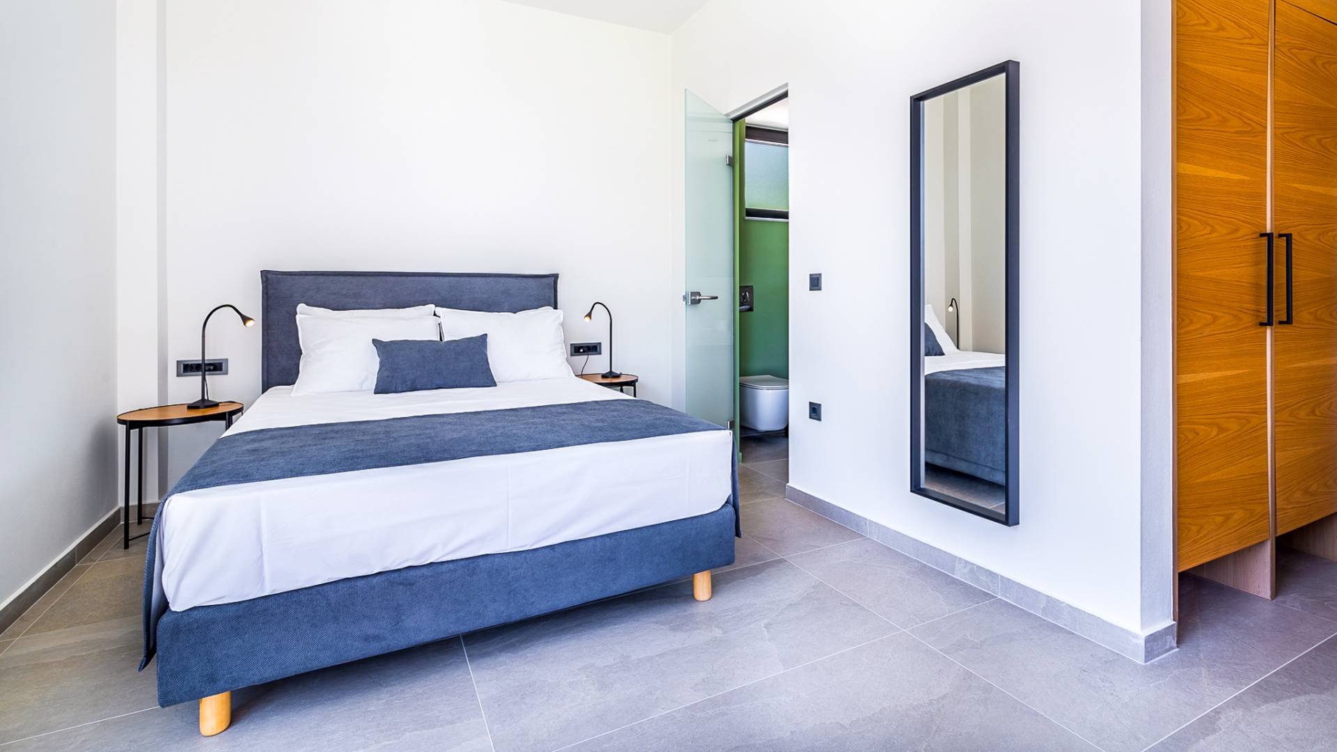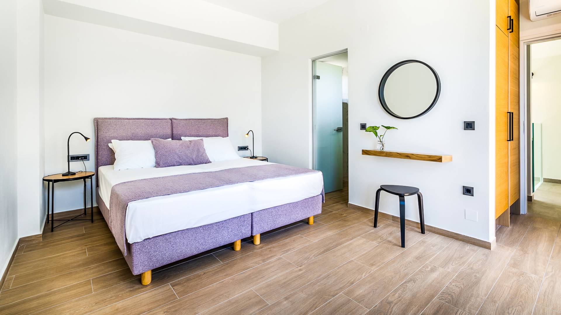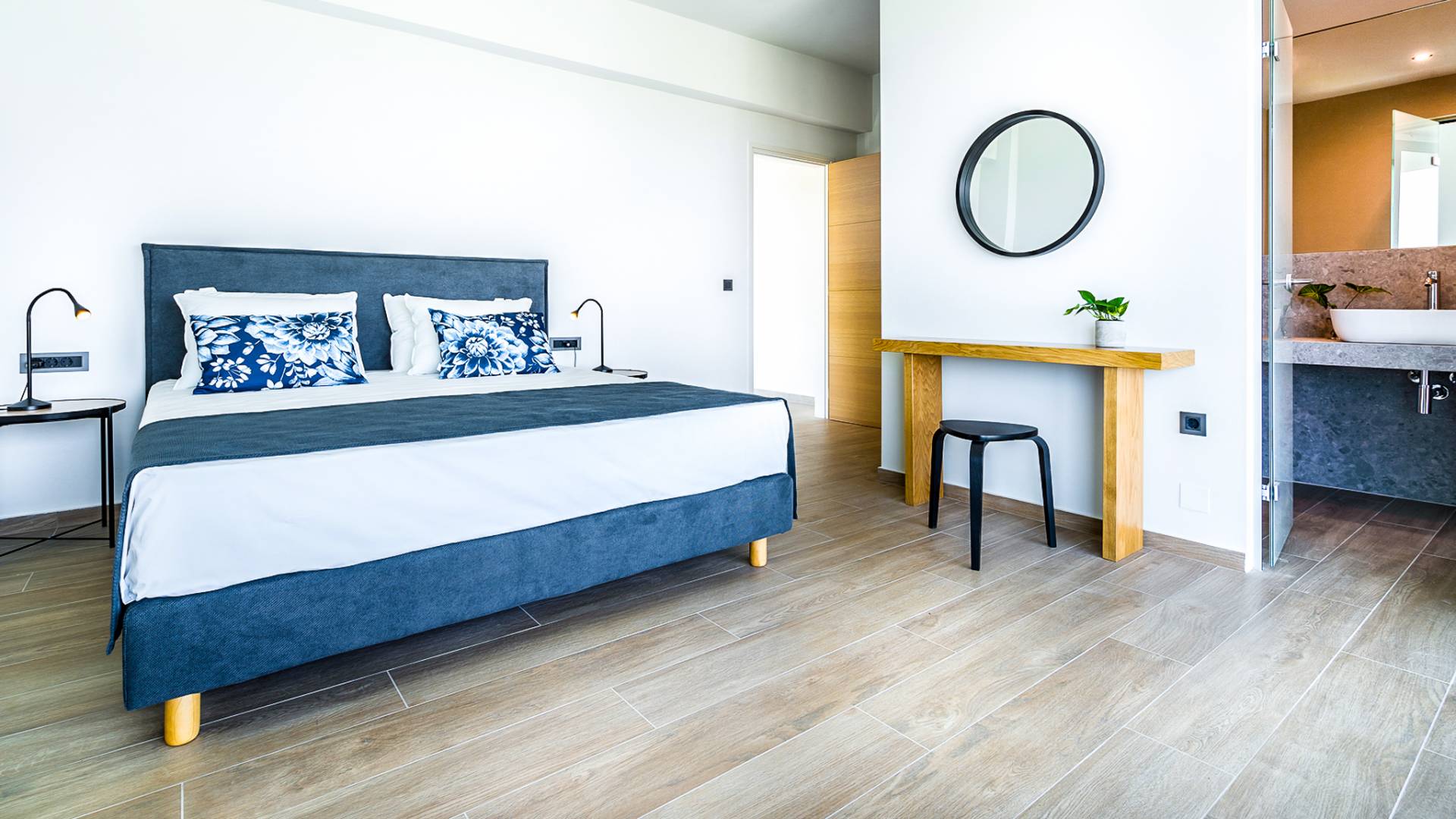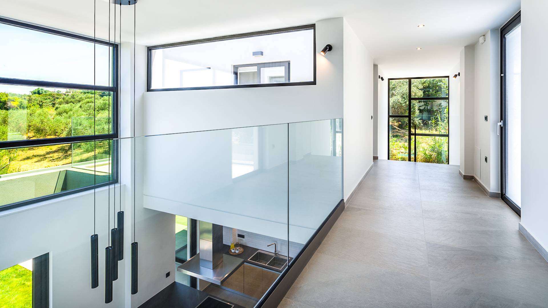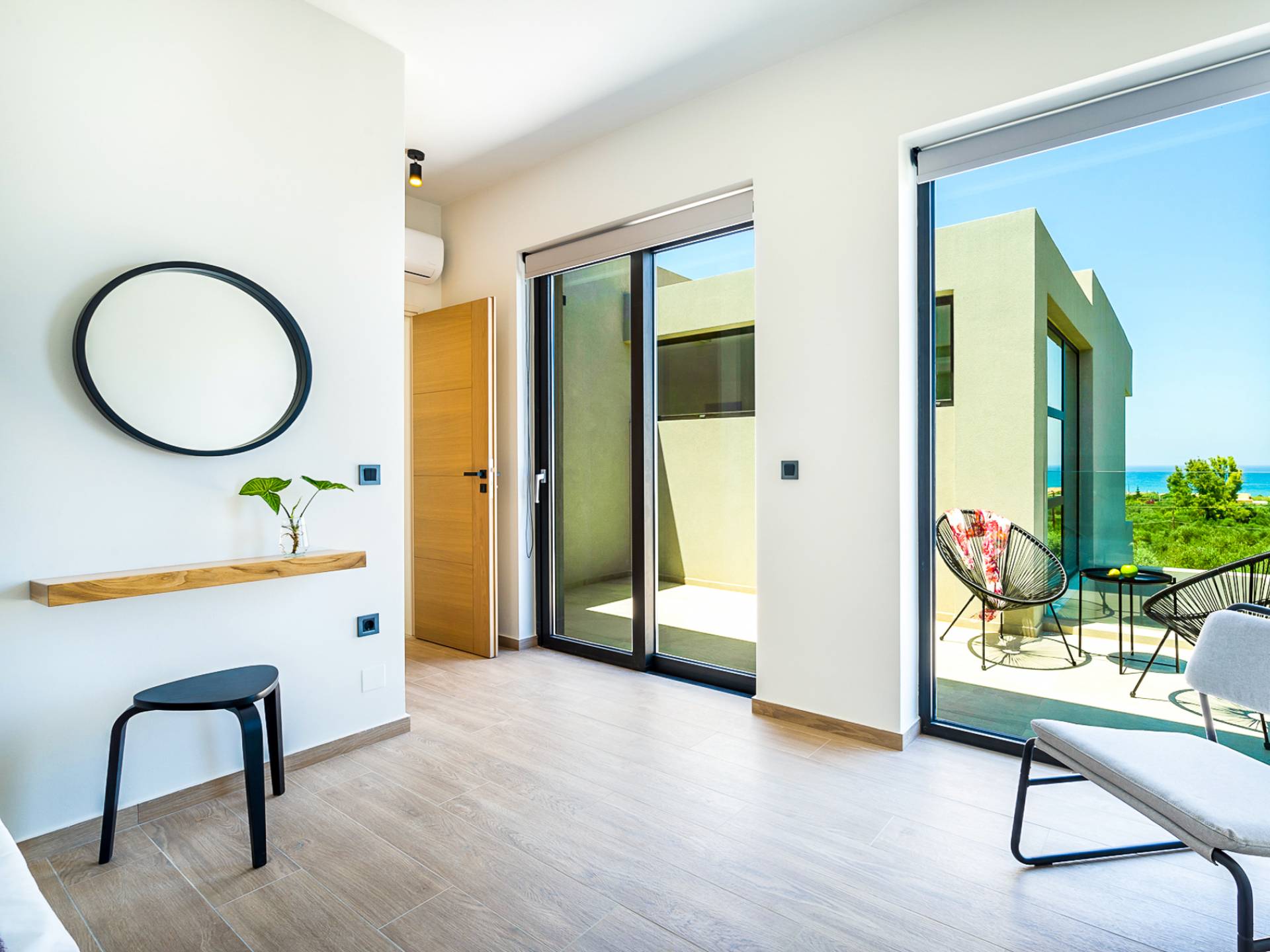 Open slatted wooden stairs lead to the first floor, illuminated with light entering from the glass-paneled wall and open corridor with glass balustrade allowing views to the living space below. The annex studio apartment is reached via an external door on the ground floor, directly opposite the main villa entrance. Entering the apartment, the open-plan space offers a lot of light through its large patio doors that open directly onto the garden and poolside area.