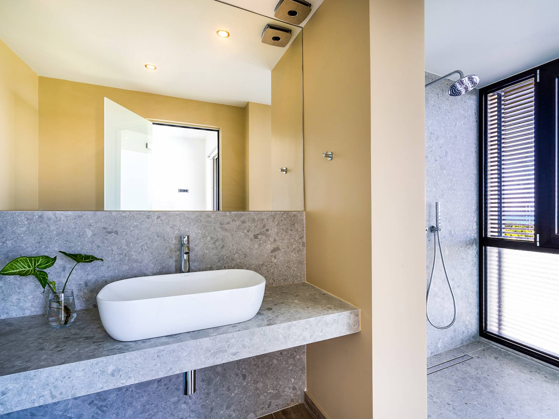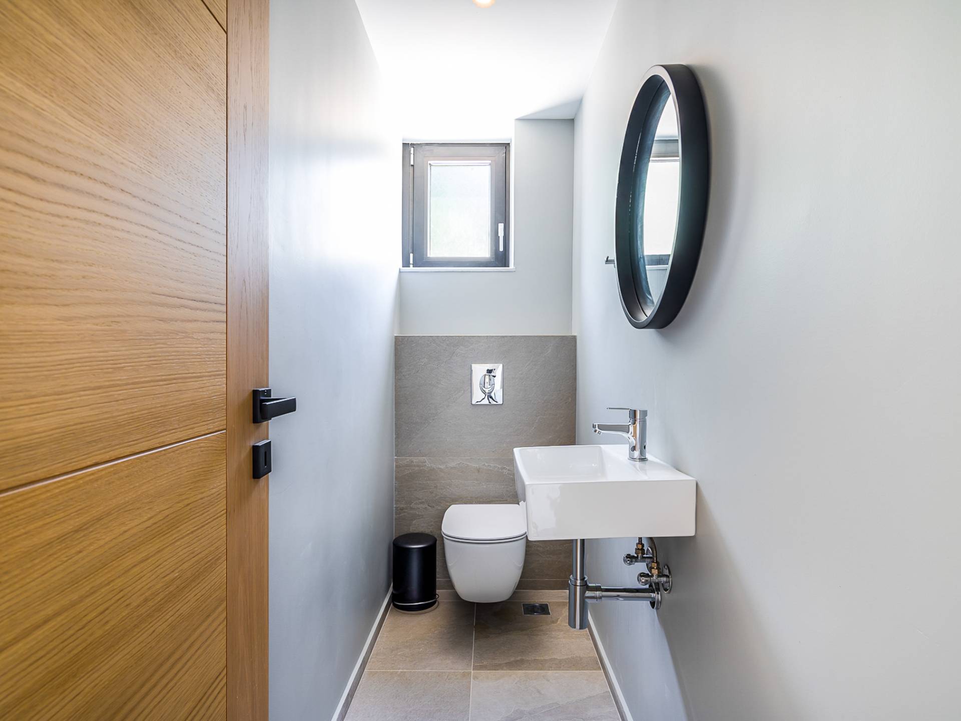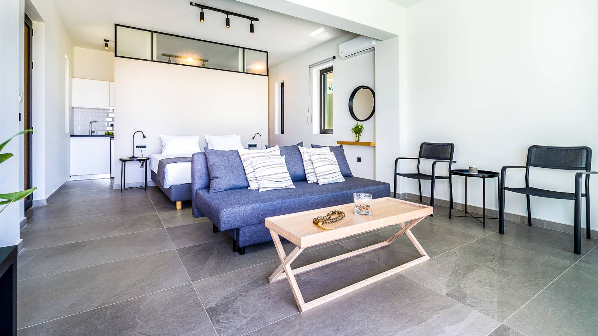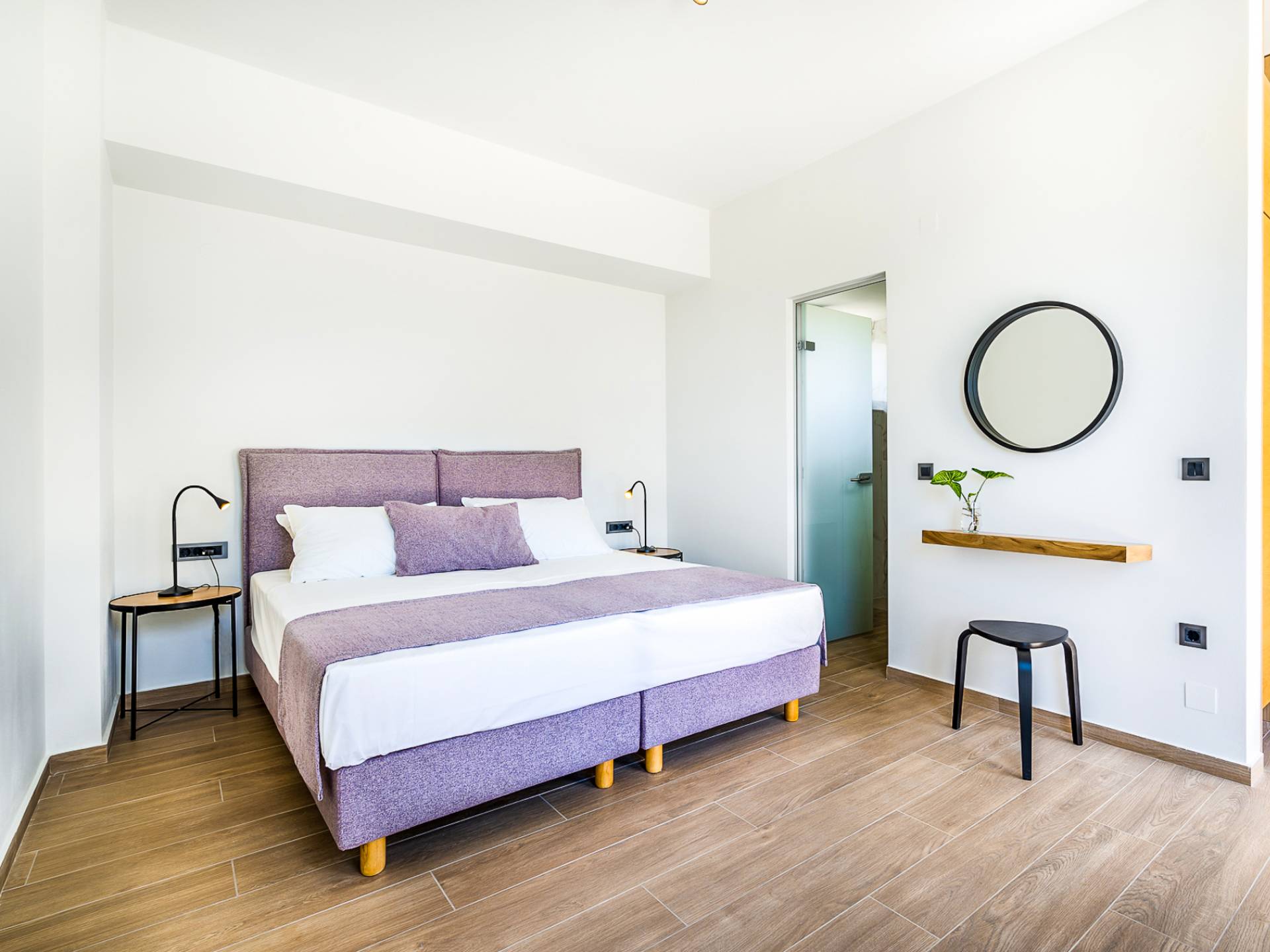 Open slatted wooden stairs lead to the first floor, illuminated with light entering from the glass-paneled wall and open corridor with glass balustrade allowing views to the living space below. The annex studio apartment is reached via an external door on the ground floor, directly opposite the main villa entrance. Entering the apartment, the open-plan space offers a lot of light through its large patio doors that open directly onto the garden and poolside area.