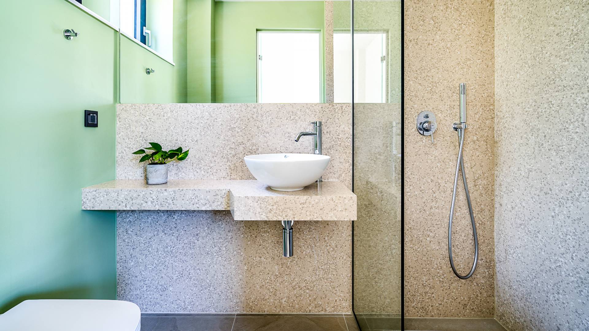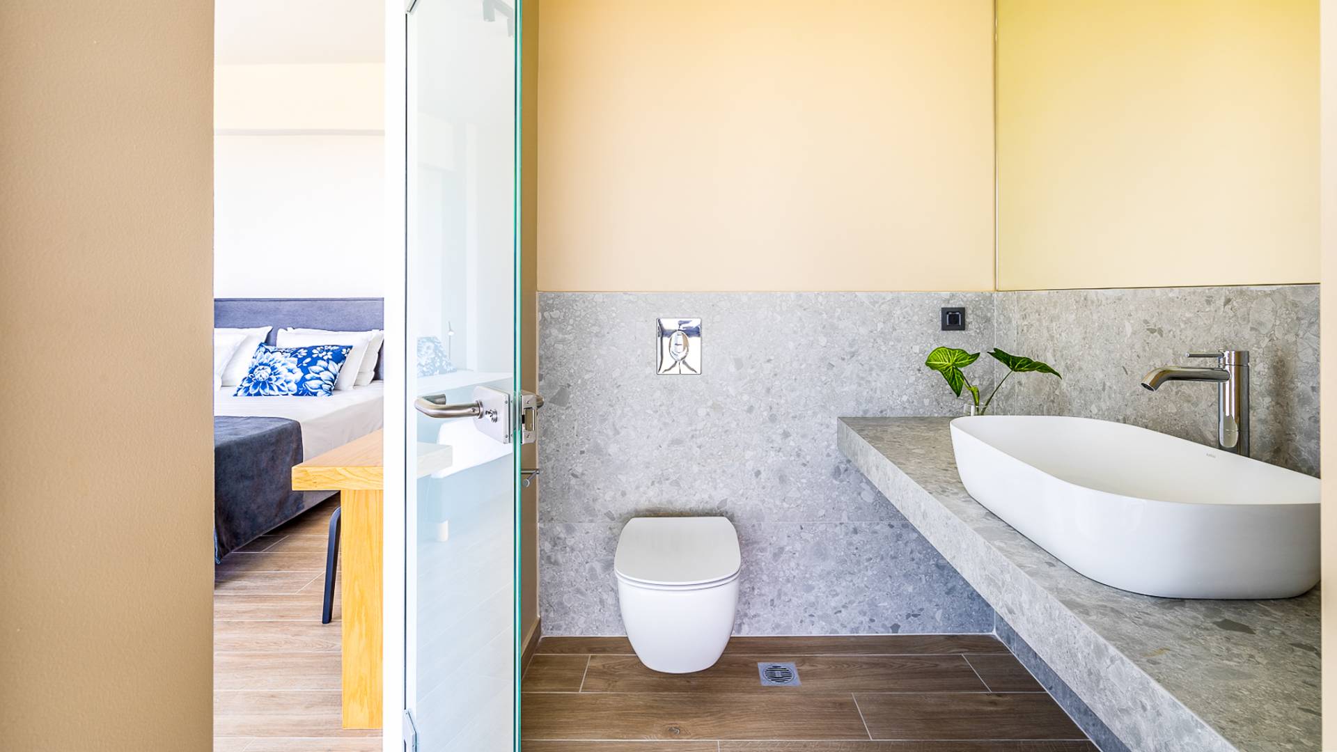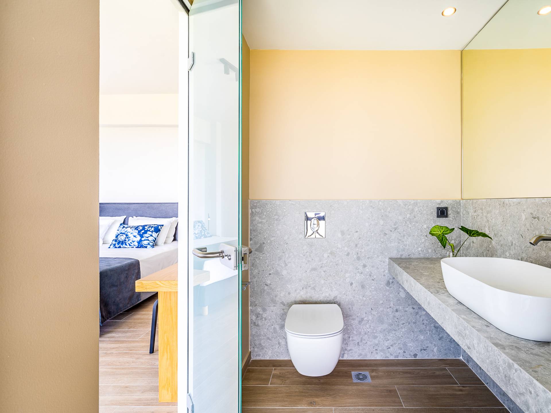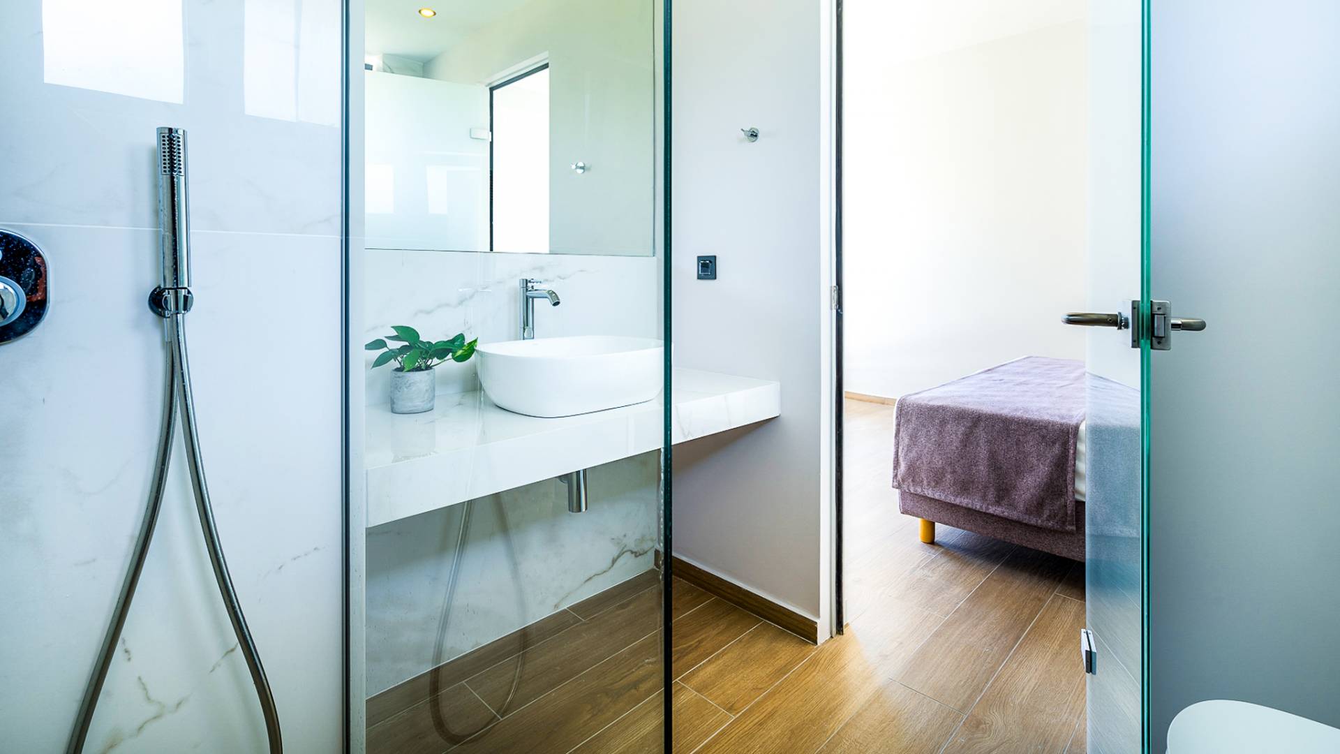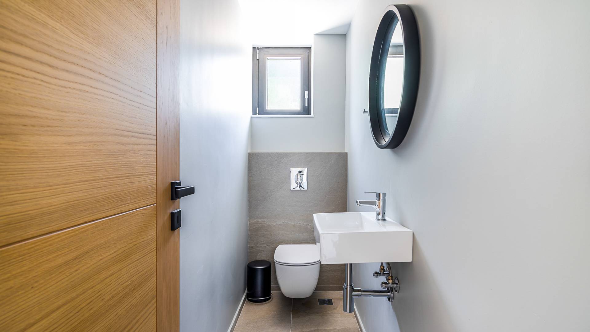 Open slatted wooden stairs lead to the first floor, illuminated with light entering from the glass-paneled wall and open corridor with glass balustrade allowing views to the living space below. The annex studio apartment is reached via an external door on the ground floor, directly opposite the main villa entrance. Entering the apartment, the open-plan space offers a lot of light through its large patio doors that open directly onto the garden and poolside area.