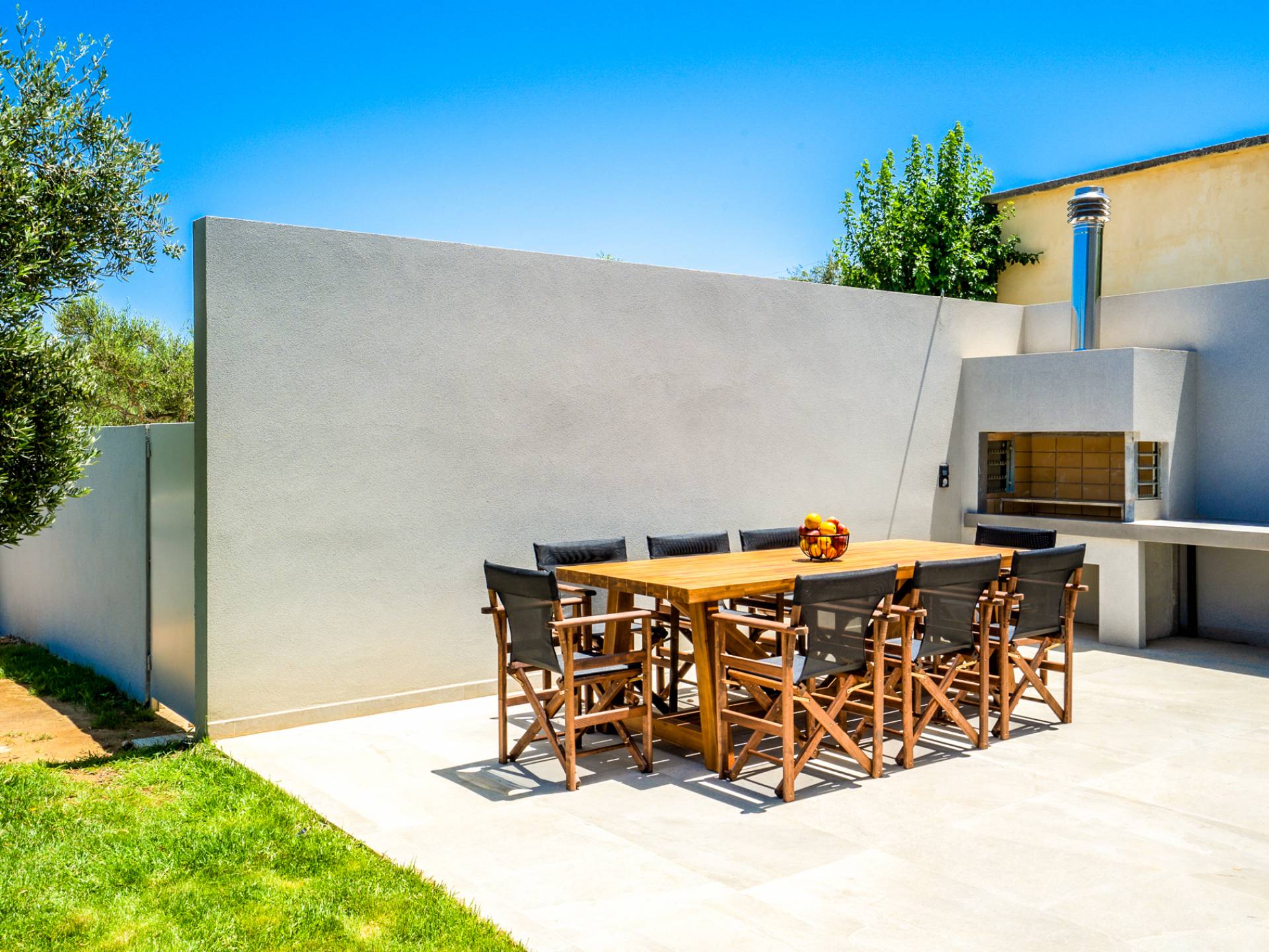 The outdoor area of Villa Avra is spacious and offers panoramic sea views and a beautiful sunset to be enjoyed. A pool deck is located directly beyond the main living room with an outdoor sofa and armchairs that can seat 5 people for poolside relaxation and the perfect position to watch the sun sink into the blue Cretan sea. This unique pool design wraps around the villa, with a sense of waterfront living. The pool can also be heated with an additional daily charge. Sunbeds and umbrellas line the pool, while the poolside shower will cool you off! The charcoal barbecue area with sink and dining table is the perfect base for sociable mealtimes.