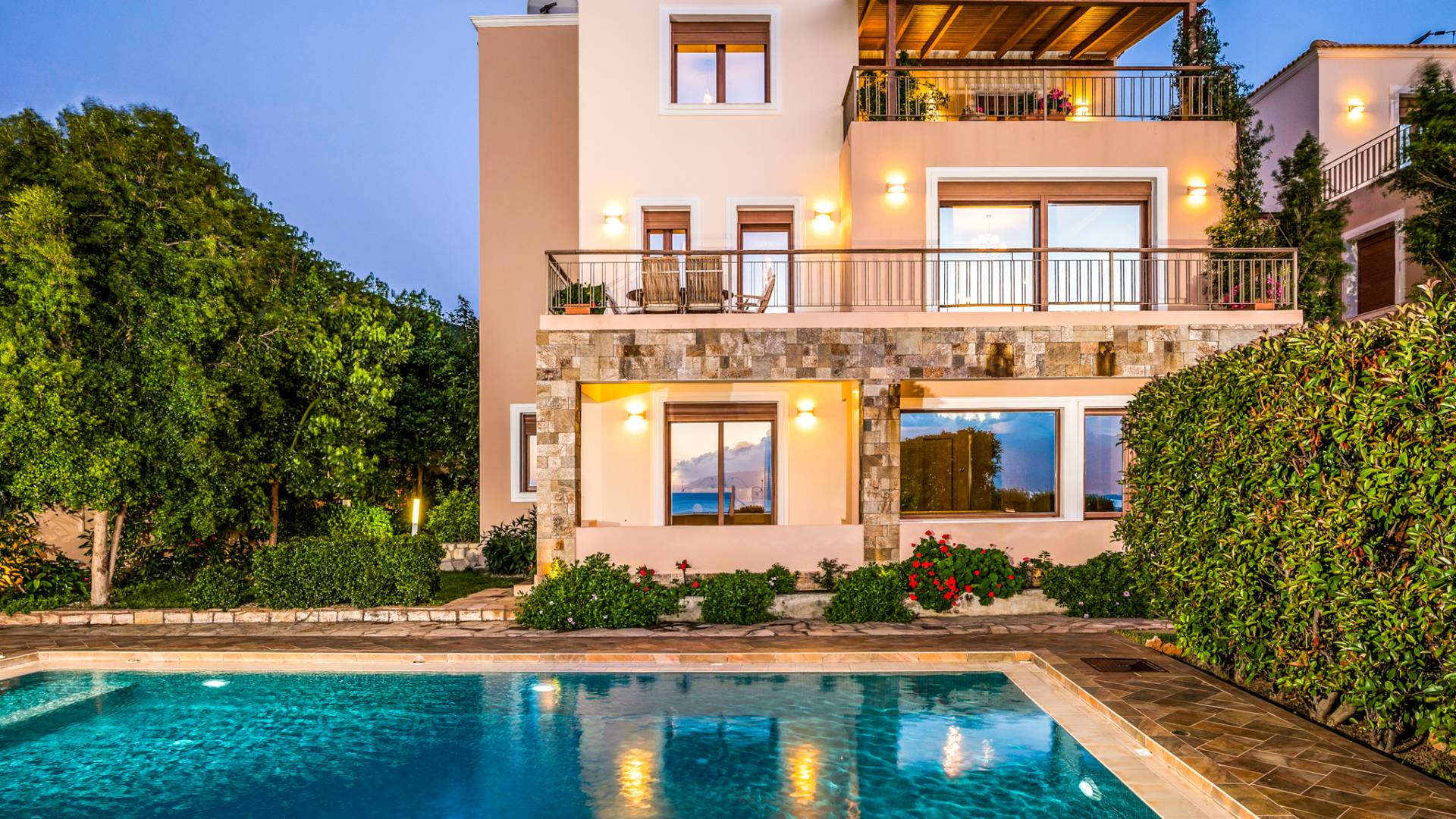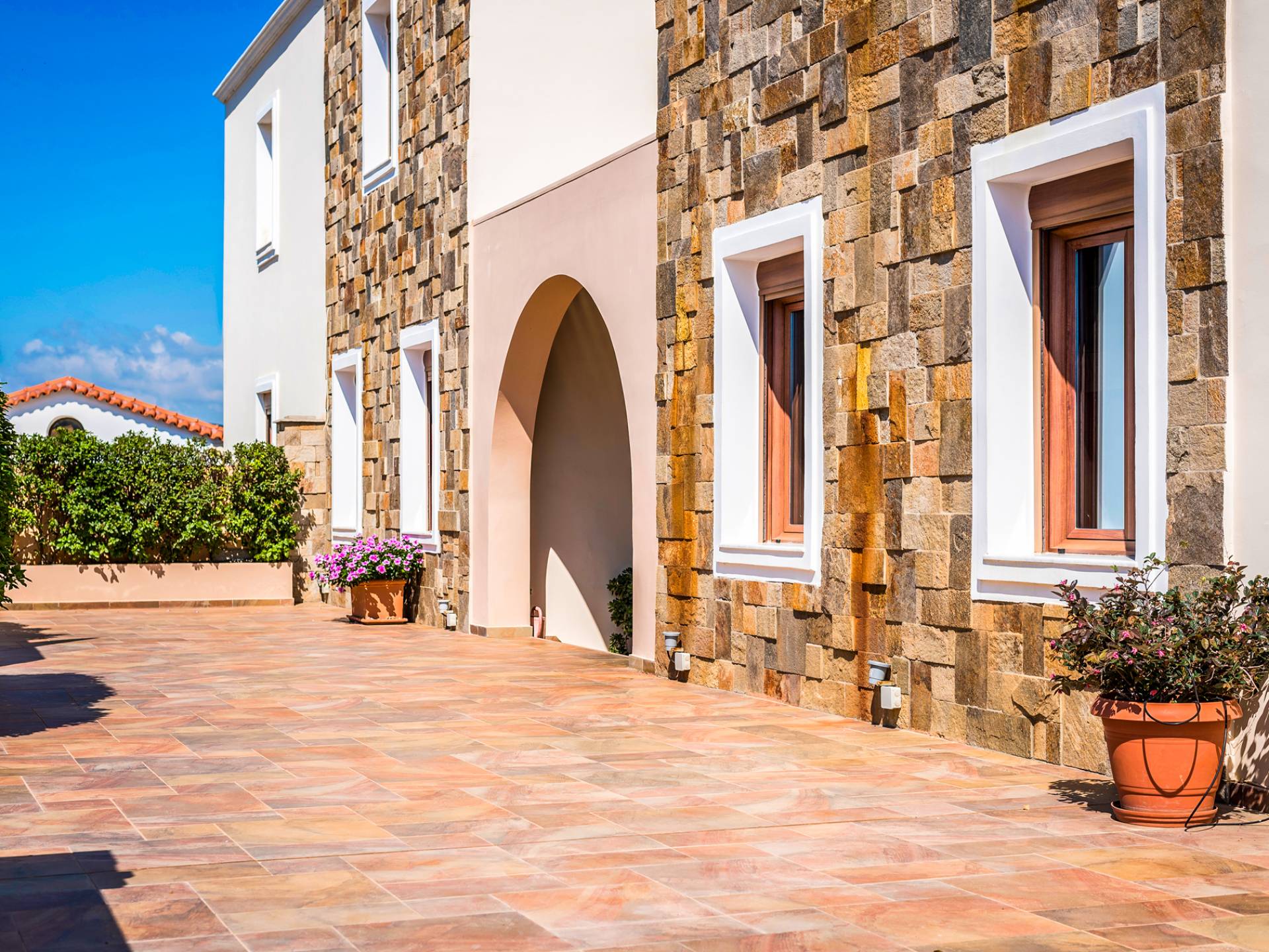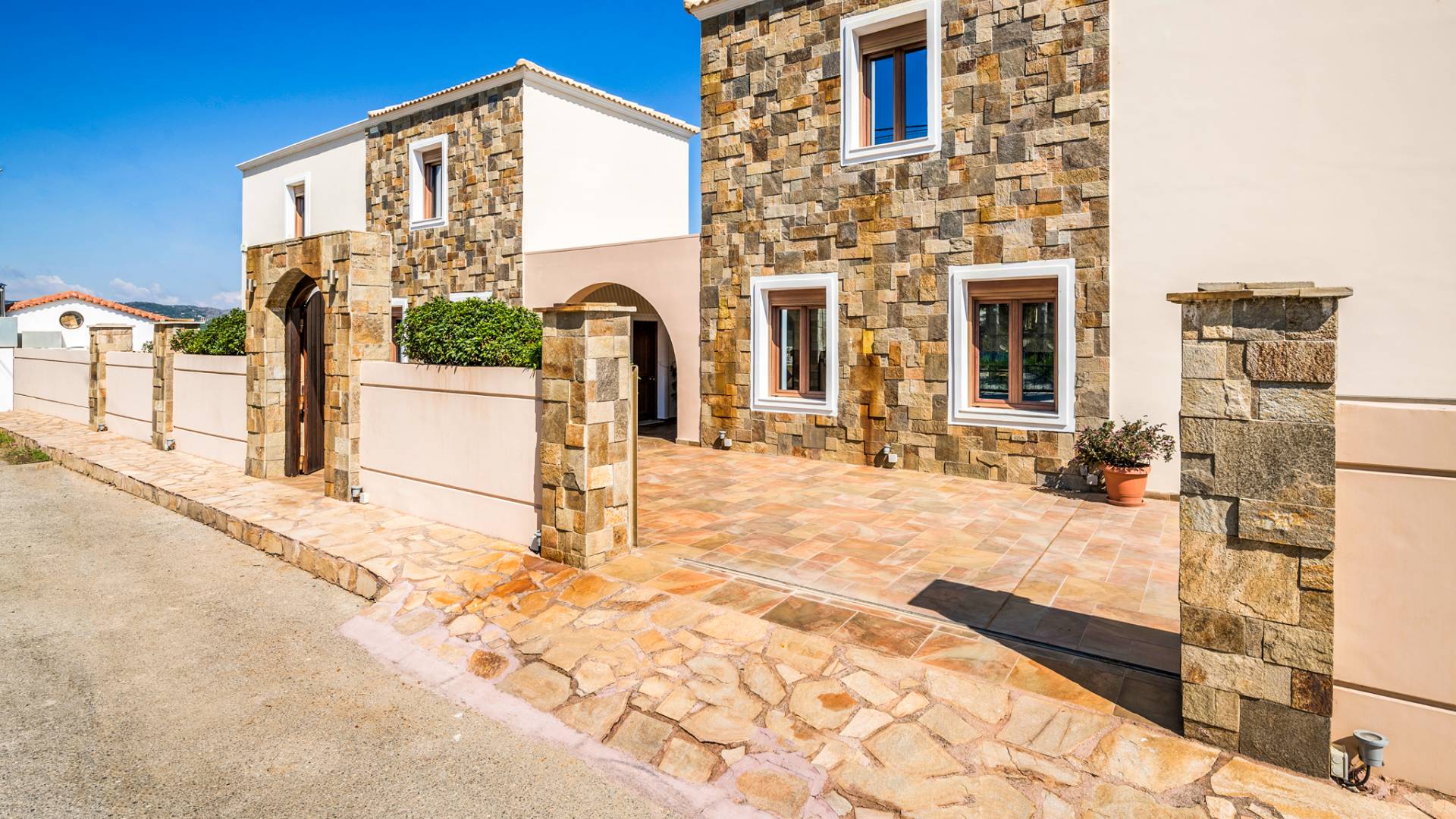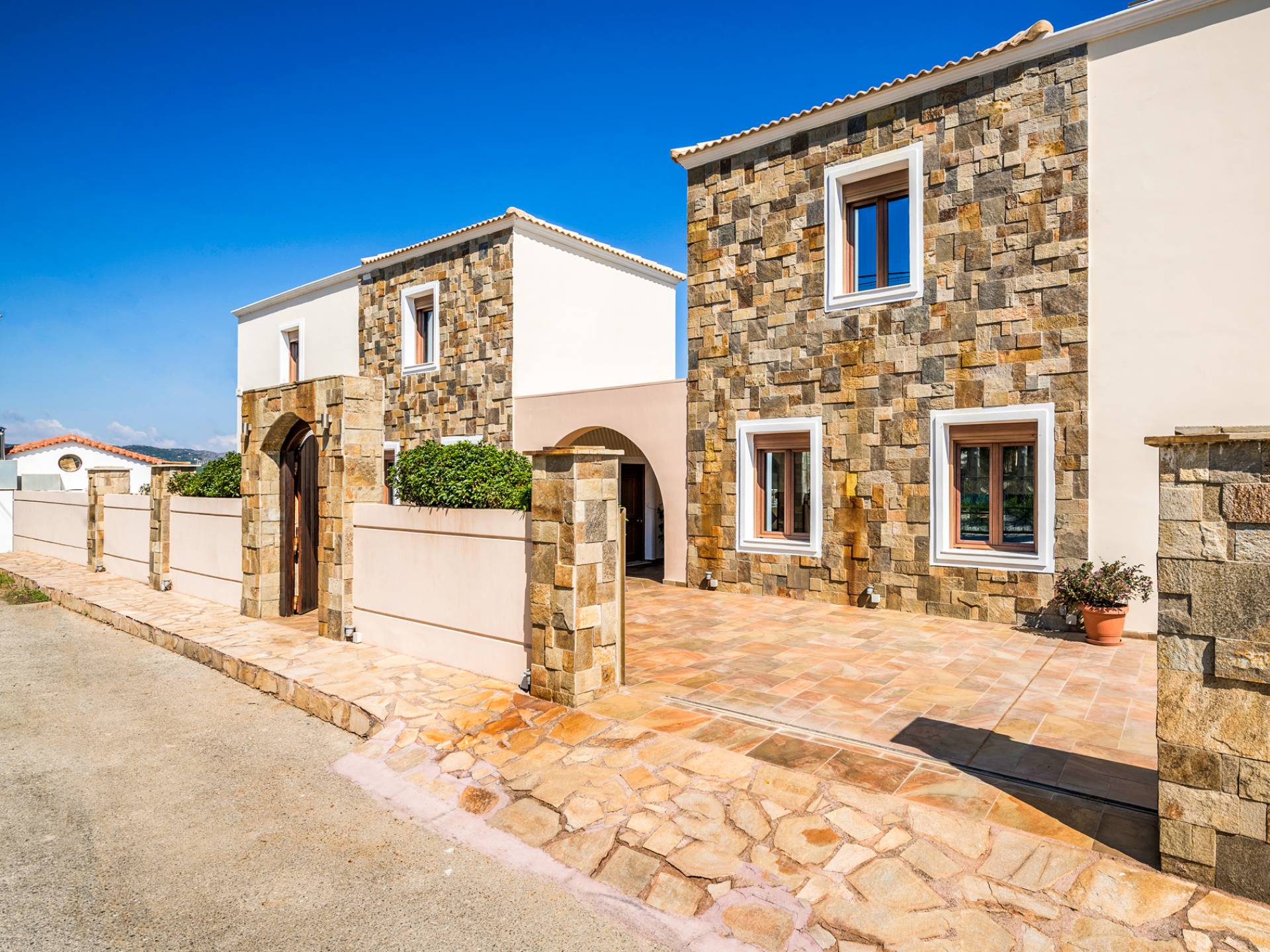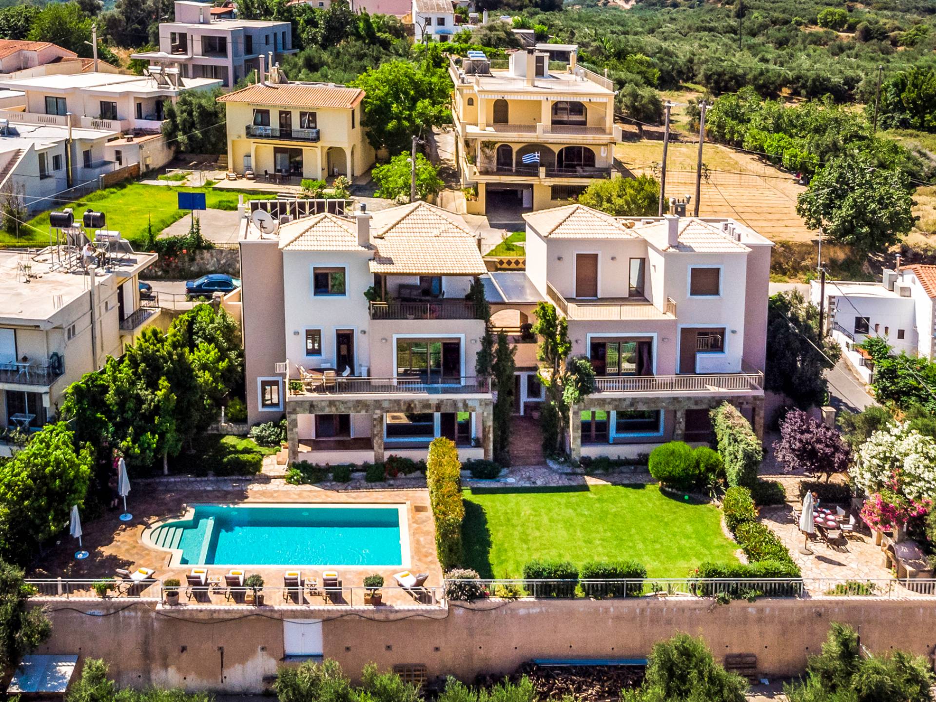 The ground floor contains a large bedroom, a living room, 2 bathrooms and a heated indoor swimming pool. The first floor consists of a living room, a dining room with a fully equipped kitchen and a toilet. The second floor includes two bedrooms and two bathrooms. There is also an outdoor 50 sqm swimming pool, where you can take a refreshing dip, enjoy your drink while working on your tan and relax embraced by a green yard full of lowers. At the other end of the yard, there is a wood-burning oven & BBQ, where you can create delicious dishes. At Caneva Villas Chania you will find everything you want for an ultimate stylish getaway in Crete!