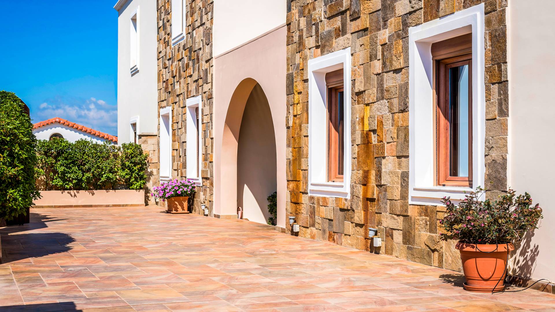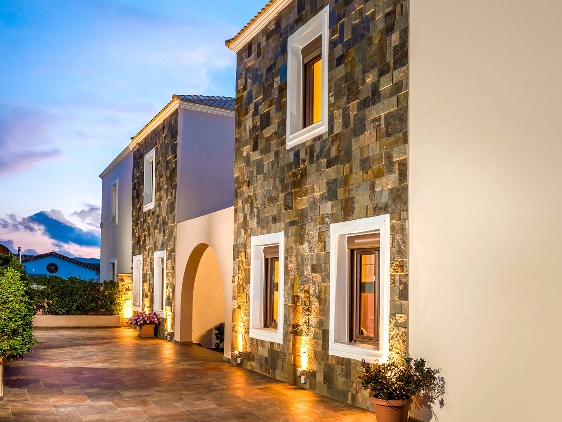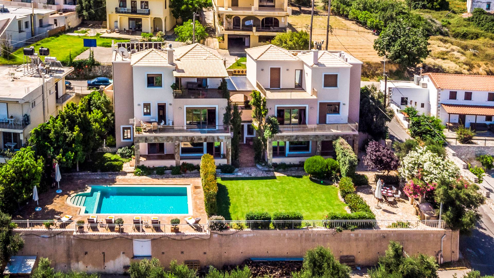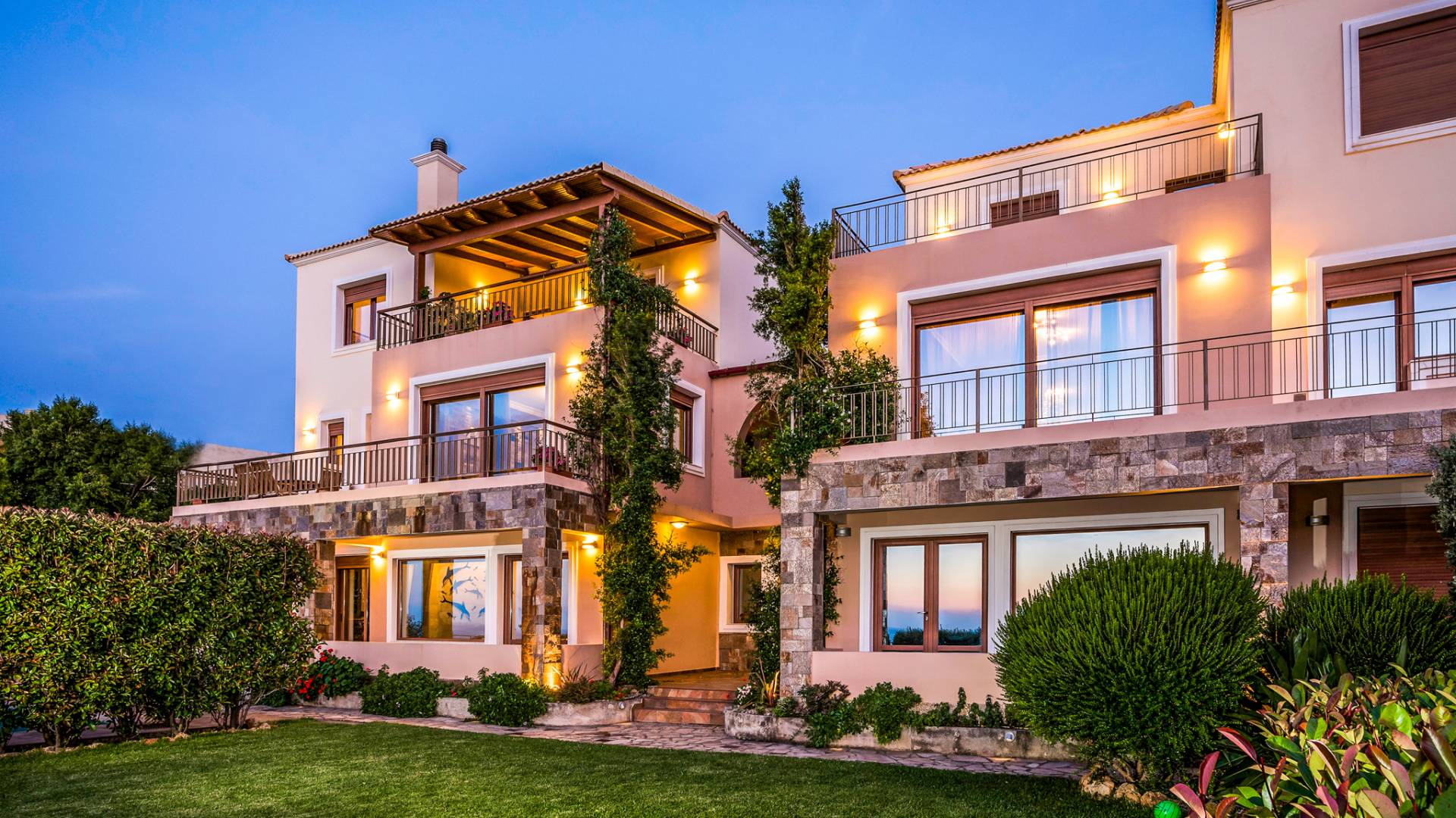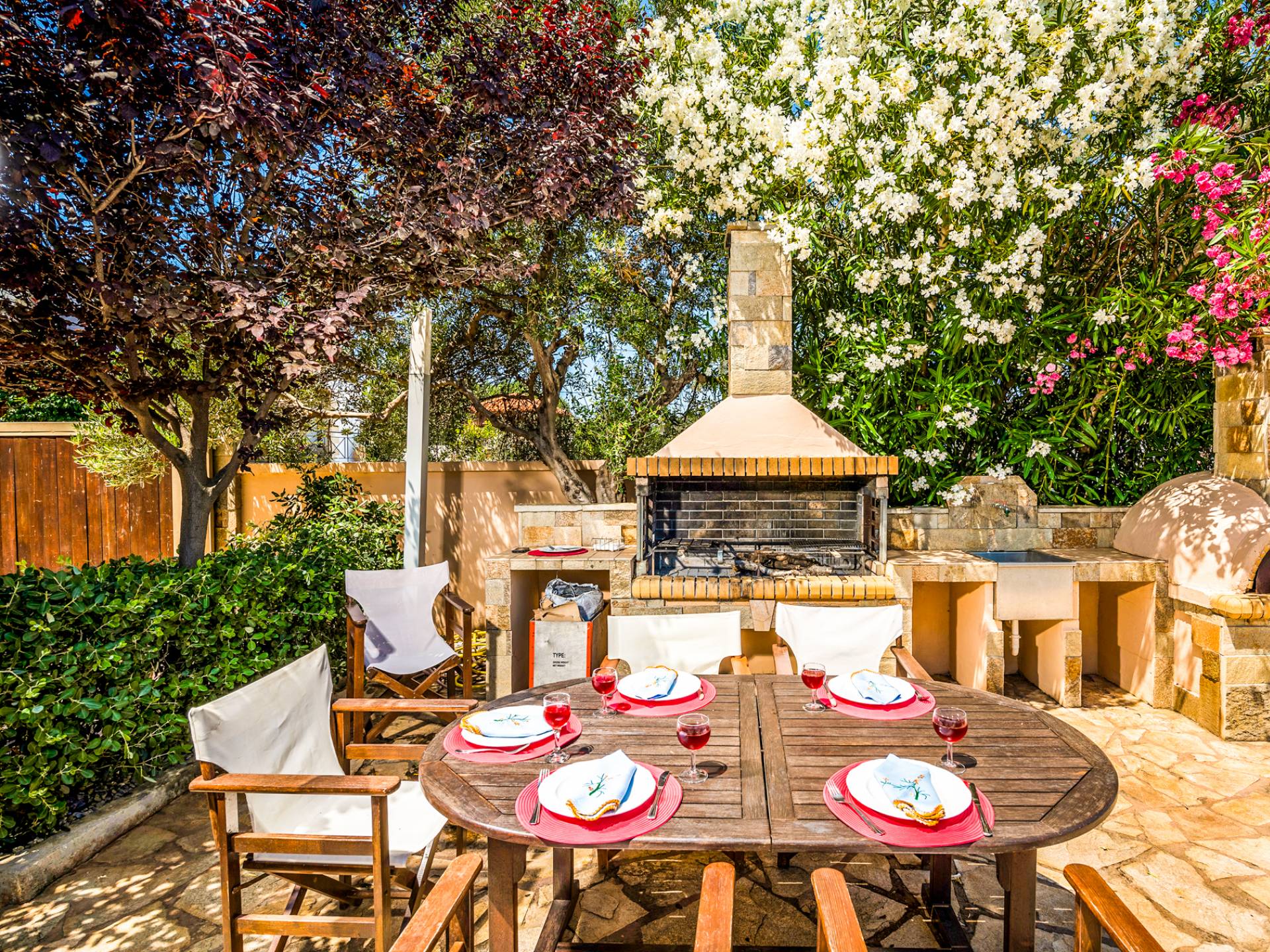 The ground floor contains a large bedroom, a living room, 2 bathrooms and a heated indoor swimming pool. The first floor consists of a living room, a dining room with a fully equipped kitchen and a toilet. The second floor includes two bedrooms and two bathrooms. There is also an outdoor 50 sqm swimming pool, where you can take a refreshing dip, enjoy your drink while working on your tan and relax embraced by a green yard full of lowers. At the other end of the yard, there is a wood-burning oven & BBQ, where you can create delicious dishes. At Caneva Villas Chania you will find everything you want for an ultimate stylish getaway in Crete!