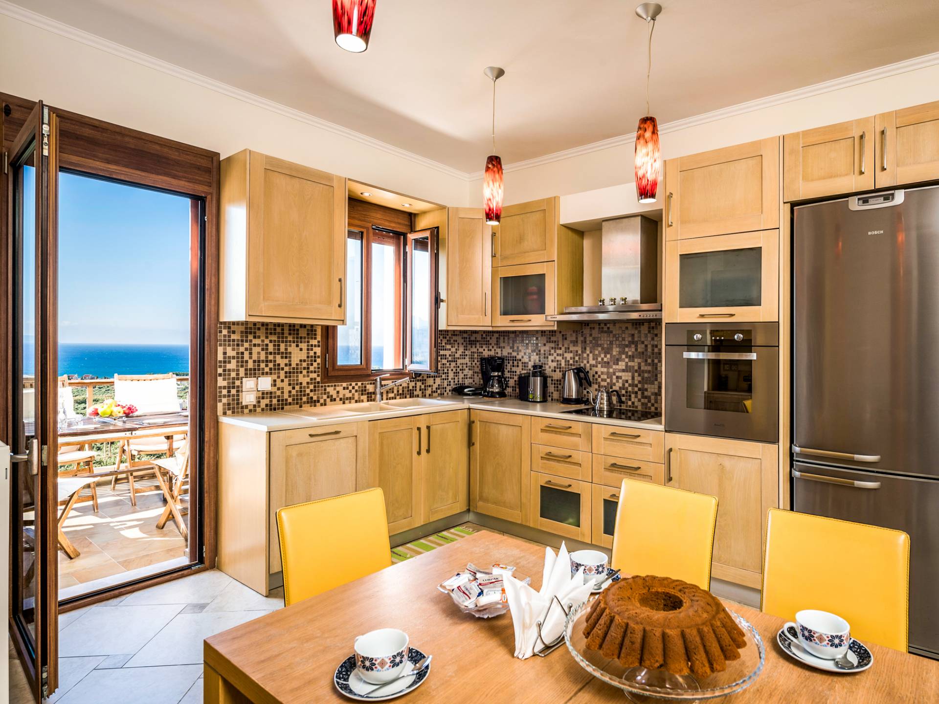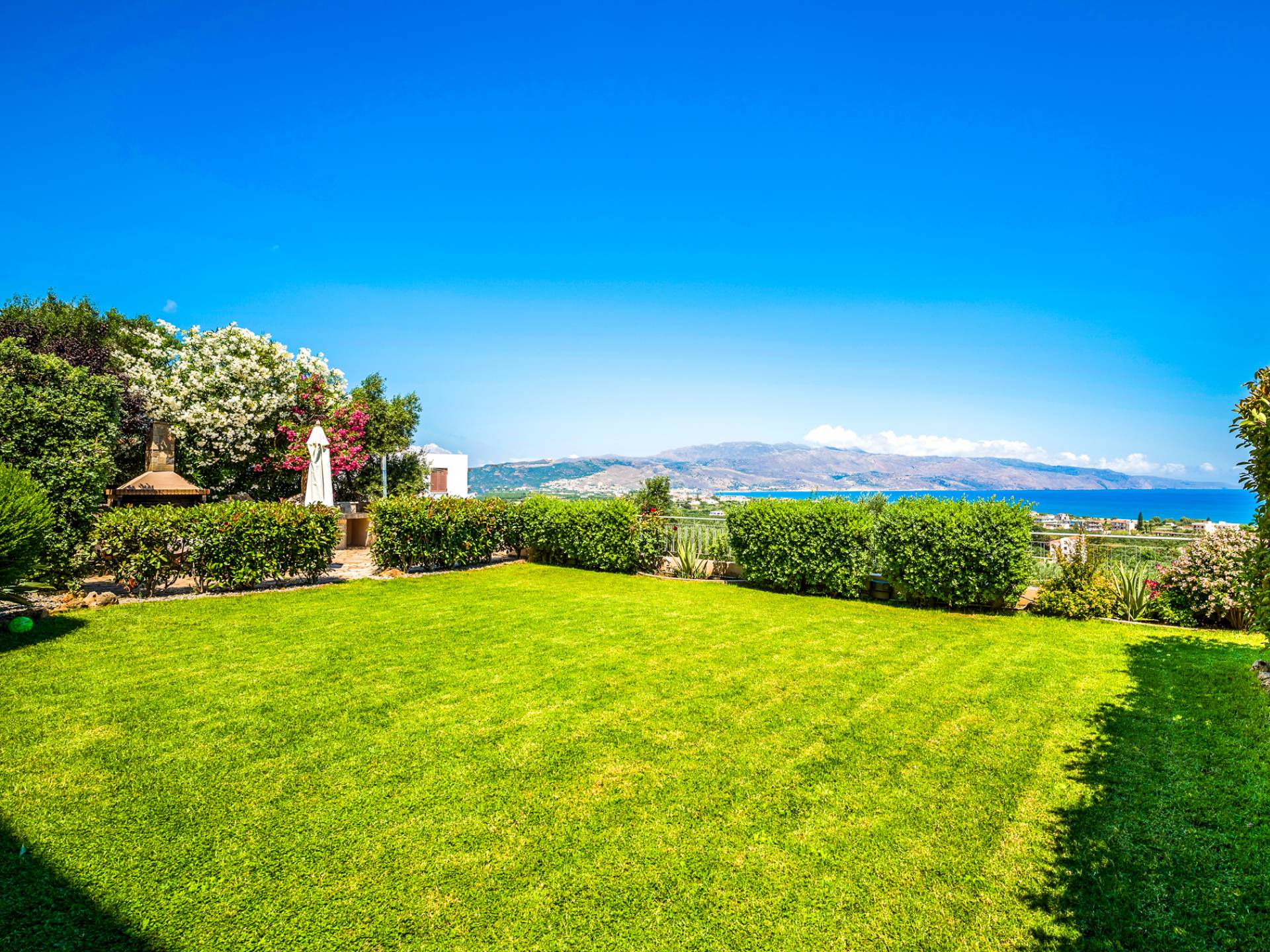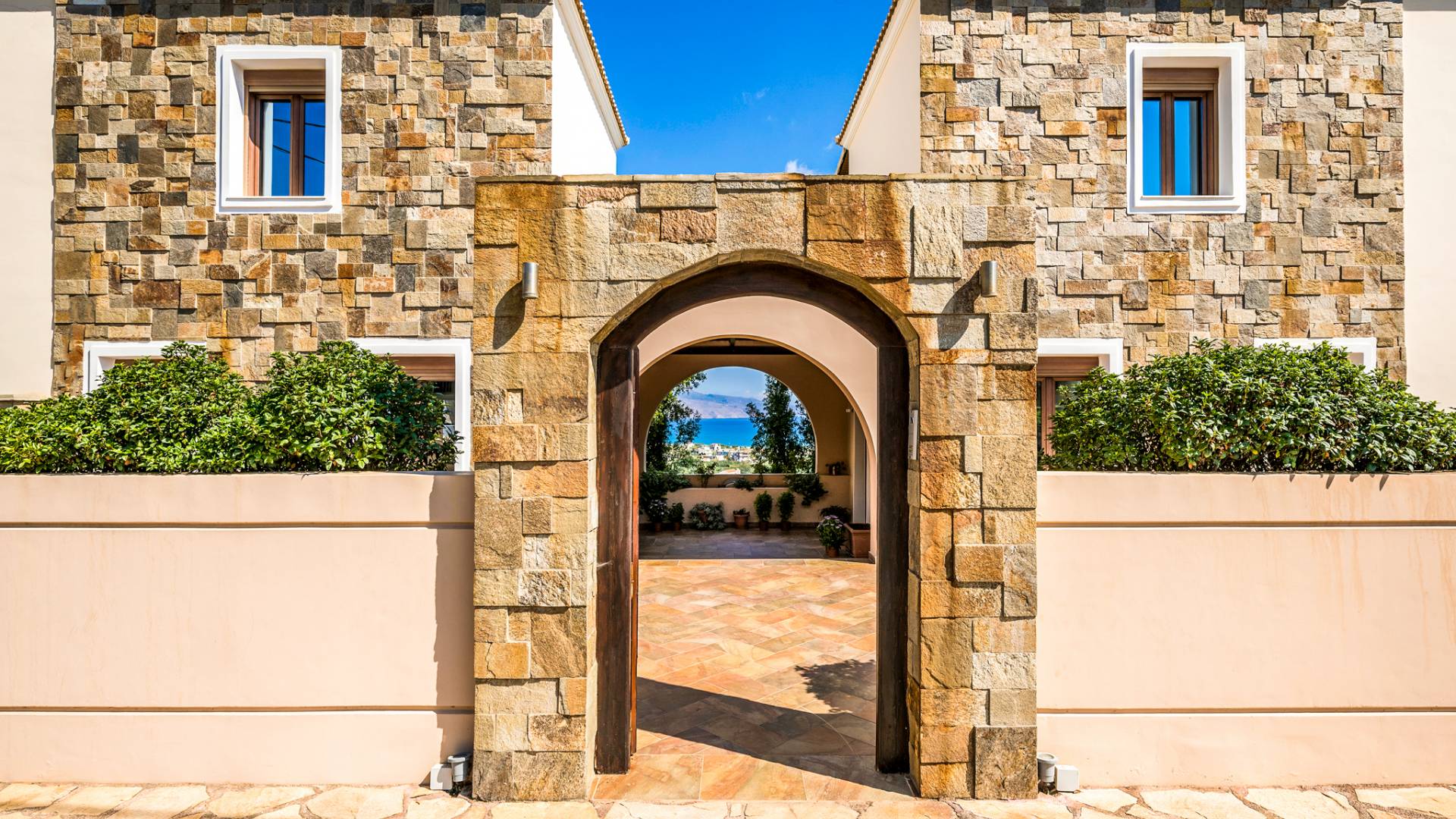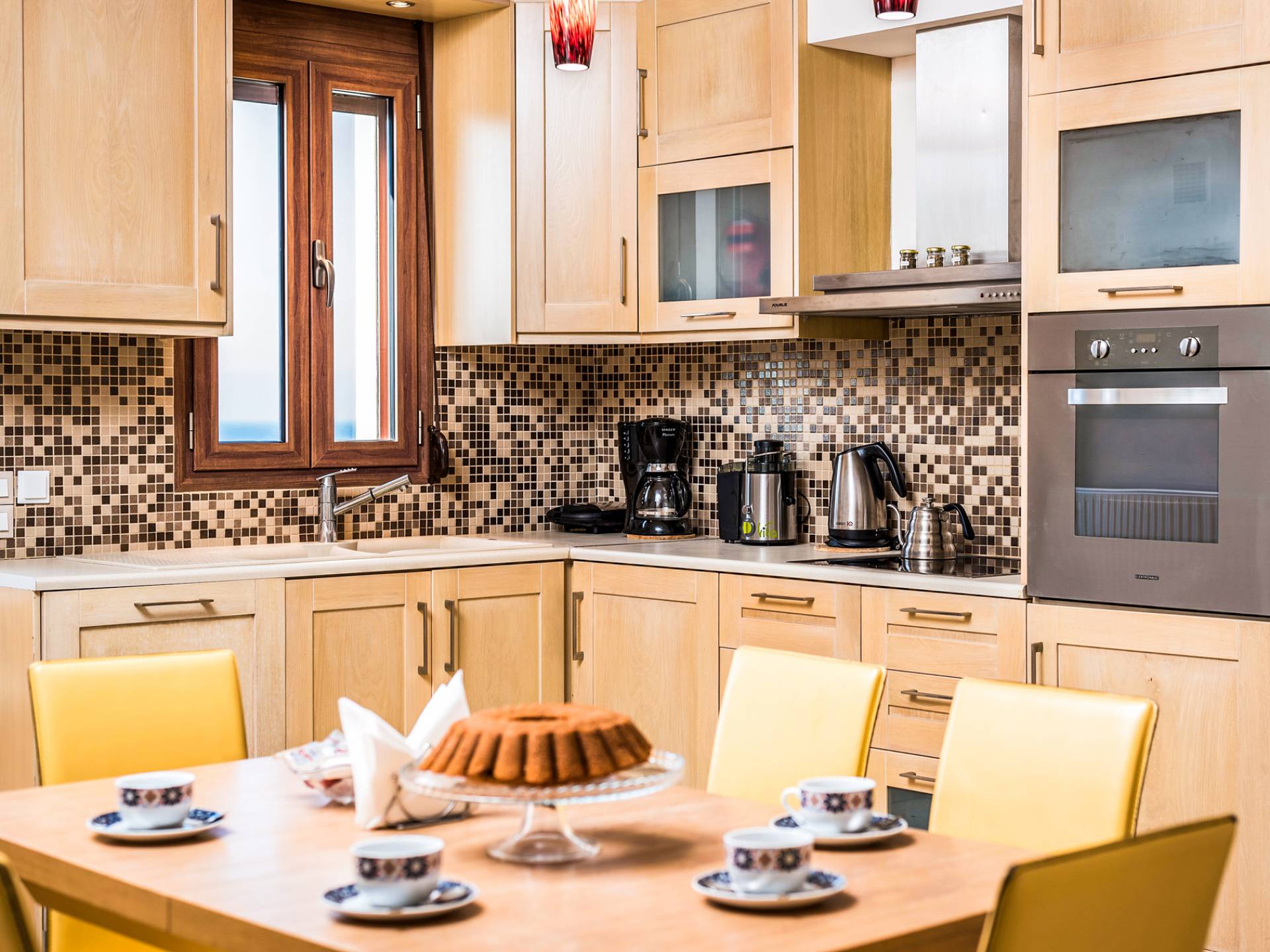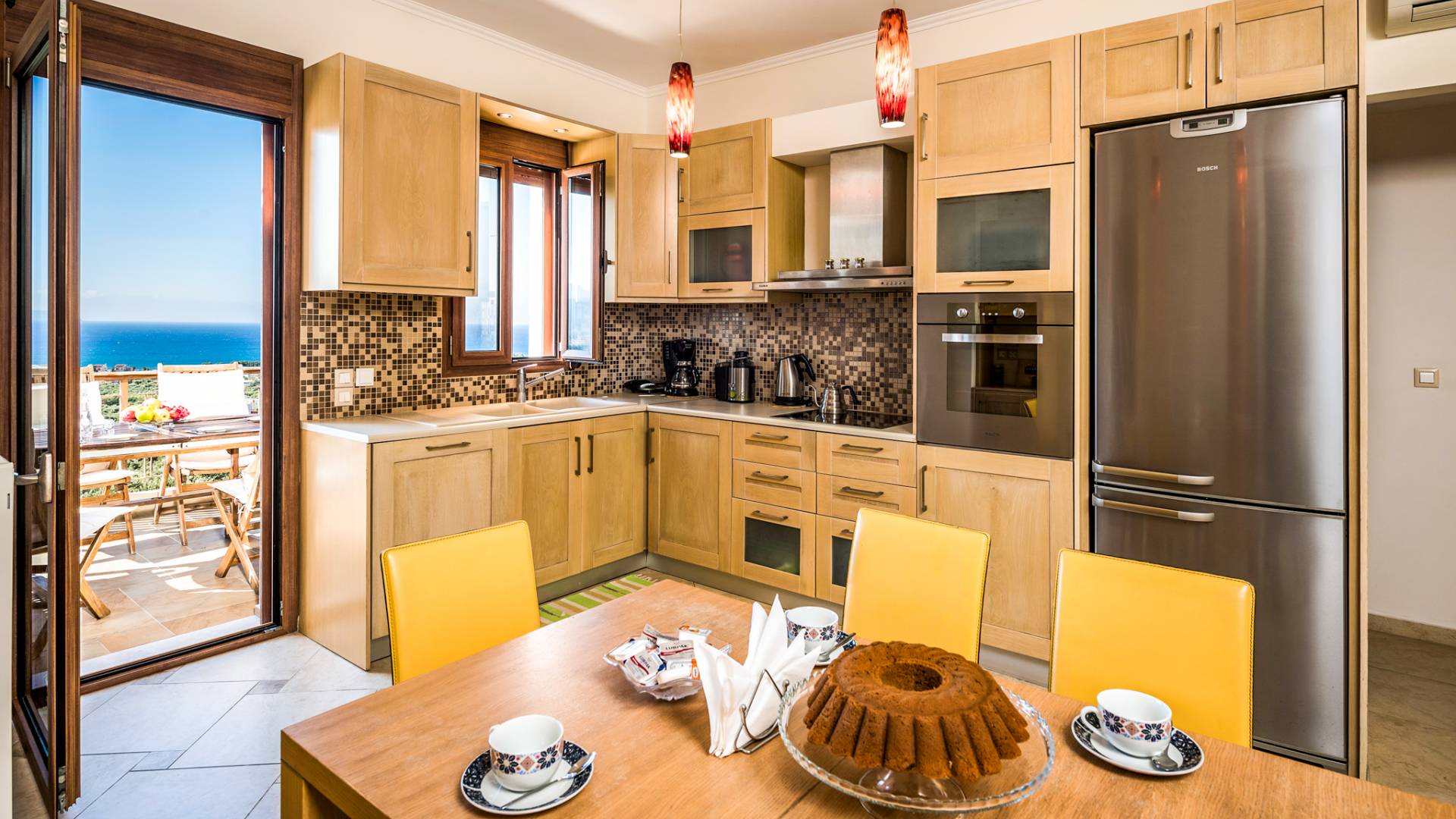 The ground floor contains a large bedroom, a living room, 2 bathrooms and a heated indoor swimming pool. The first floor consists of a living room, a dining room with a fully equipped kitchen and a toilet. The second floor includes two bedrooms and two bathrooms. There is also an outdoor 50 sqm swimming pool, where you can take a refreshing dip, enjoy your drink while working on your tan and relax embraced by a green yard full of lowers. At the other end of the yard, there is a wood-burning oven & BBQ, where you can create delicious dishes. At Caneva Villas Chania you will find everything you want for an ultimate stylish getaway in Crete!