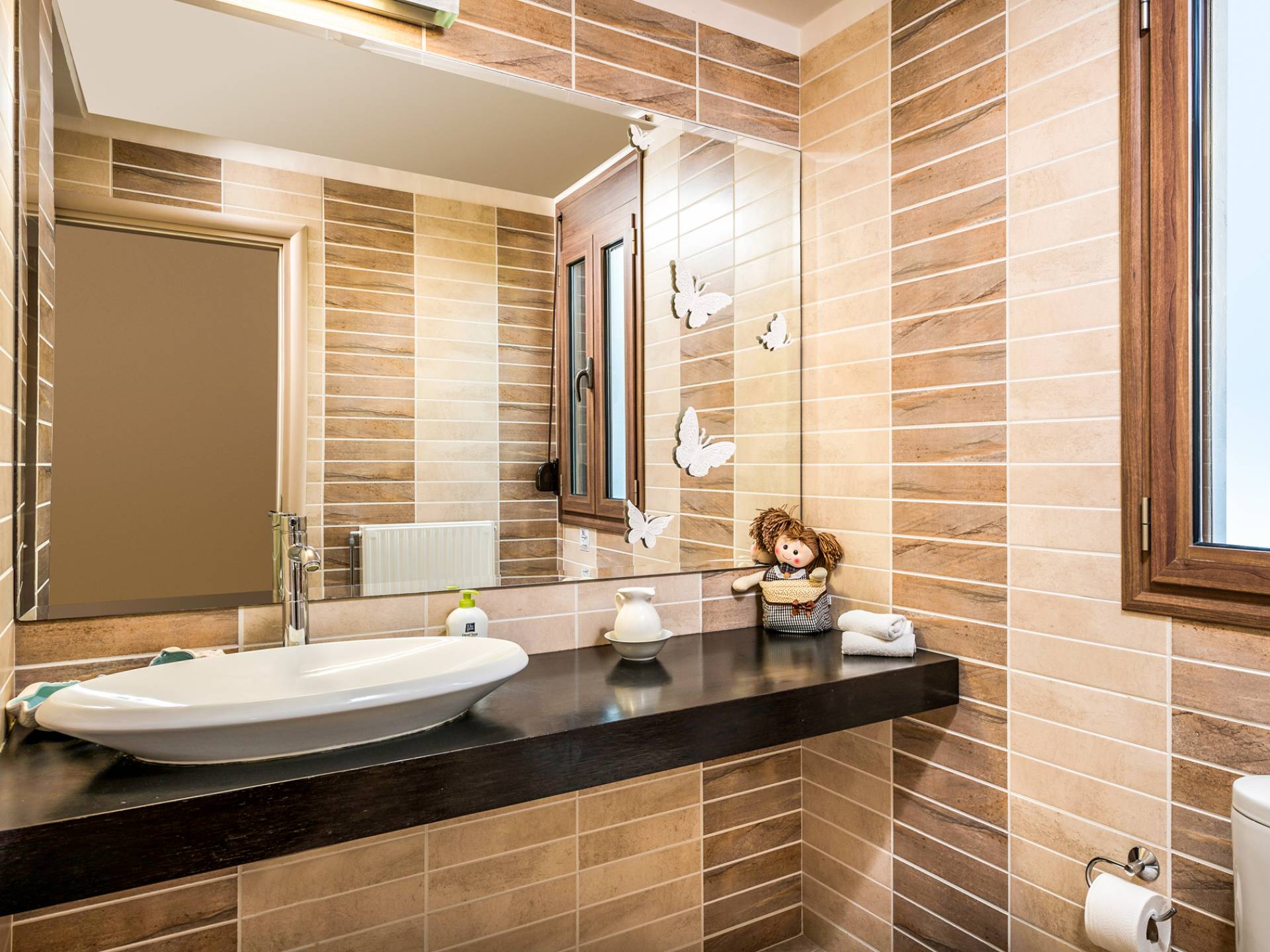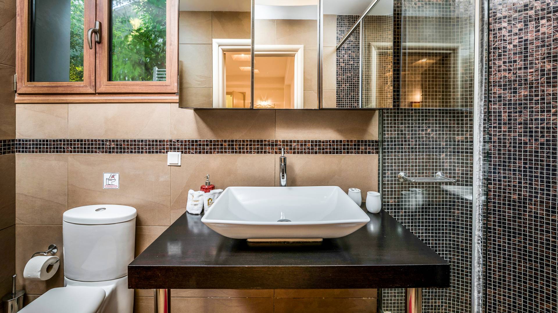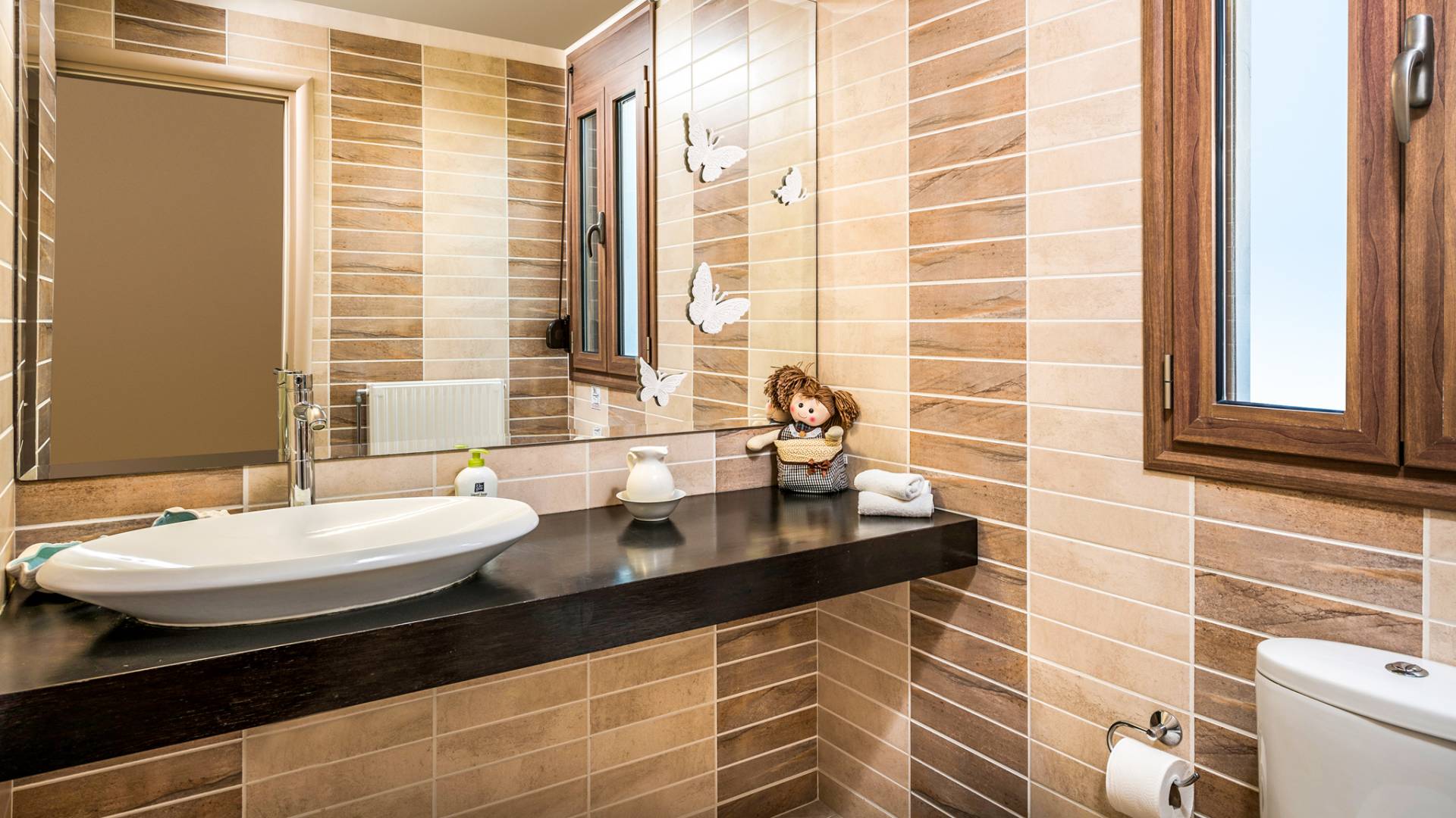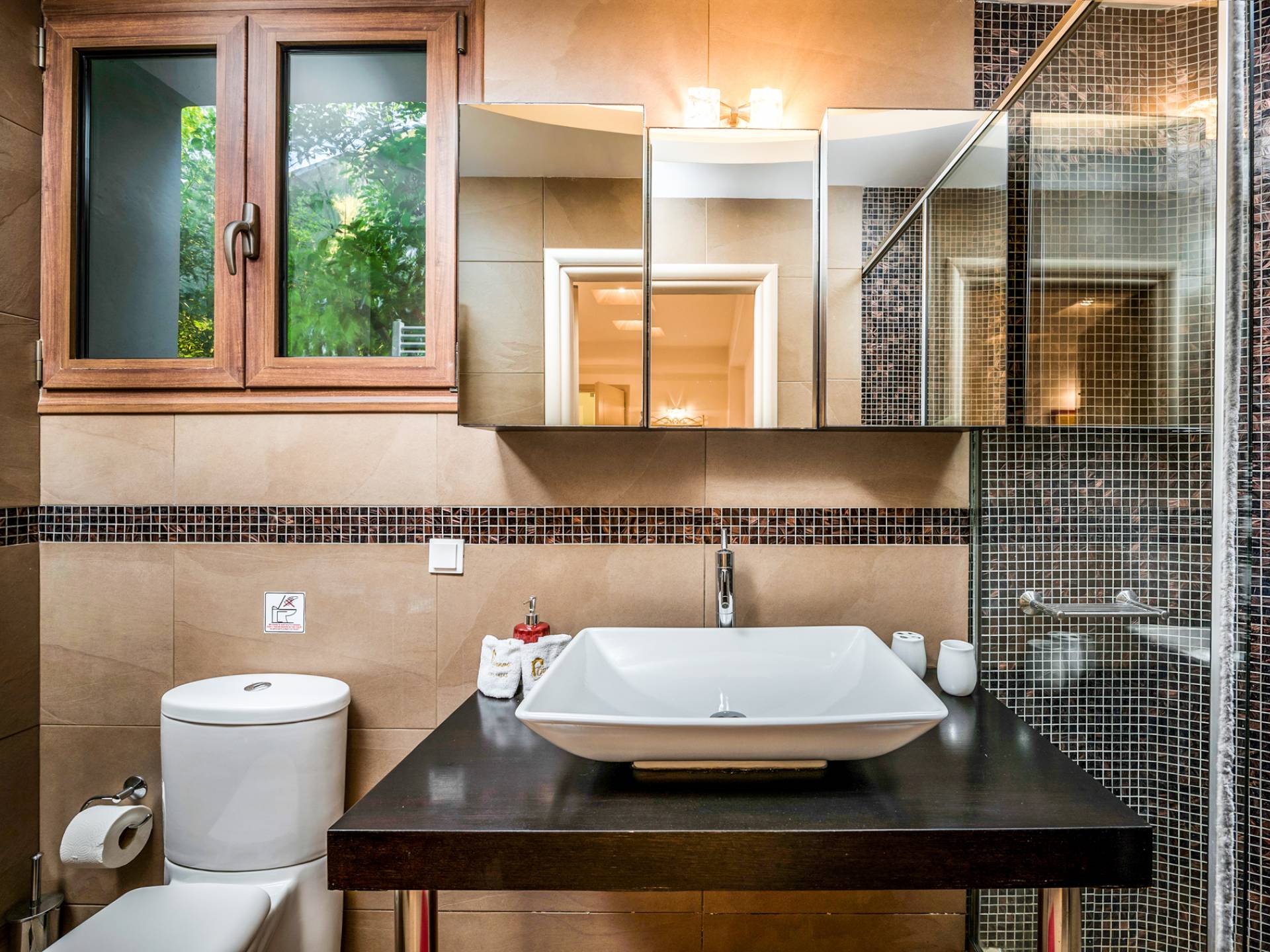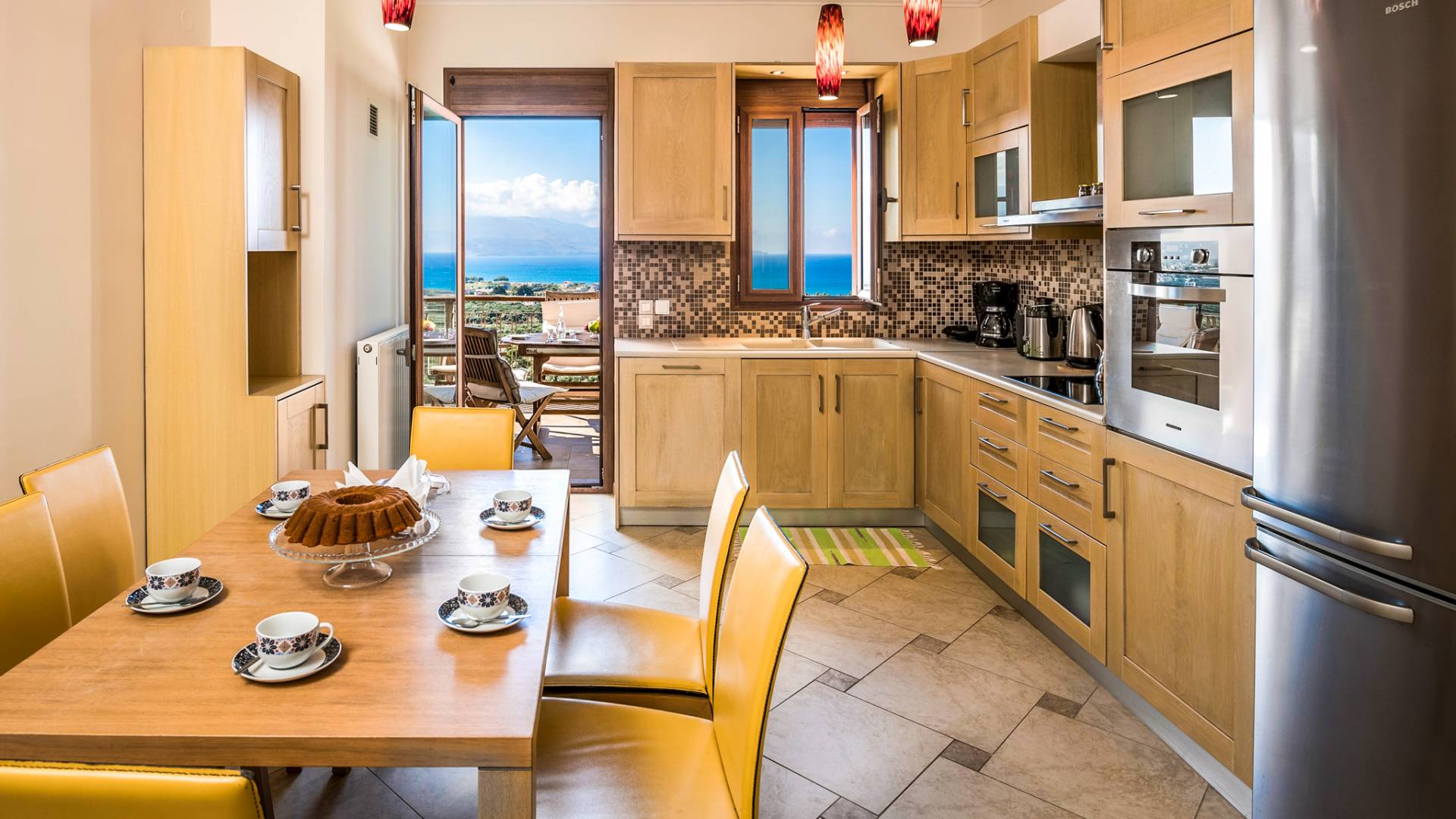 The ground floor contains a large bedroom, a living room, 2 bathrooms and a heated indoor swimming pool. The first floor consists of a living room, a dining room with a fully equipped kitchen and a toilet. The second floor includes two bedrooms and two bathrooms. There is also an outdoor 50 sqm swimming pool, where you can take a refreshing dip, enjoy your drink while working on your tan and relax embraced by a green yard full of lowers. At the other end of the yard, there is a wood-burning oven & BBQ, where you can create delicious dishes. At Caneva Villas Chania you will find everything you want for an ultimate stylish getaway in Crete!