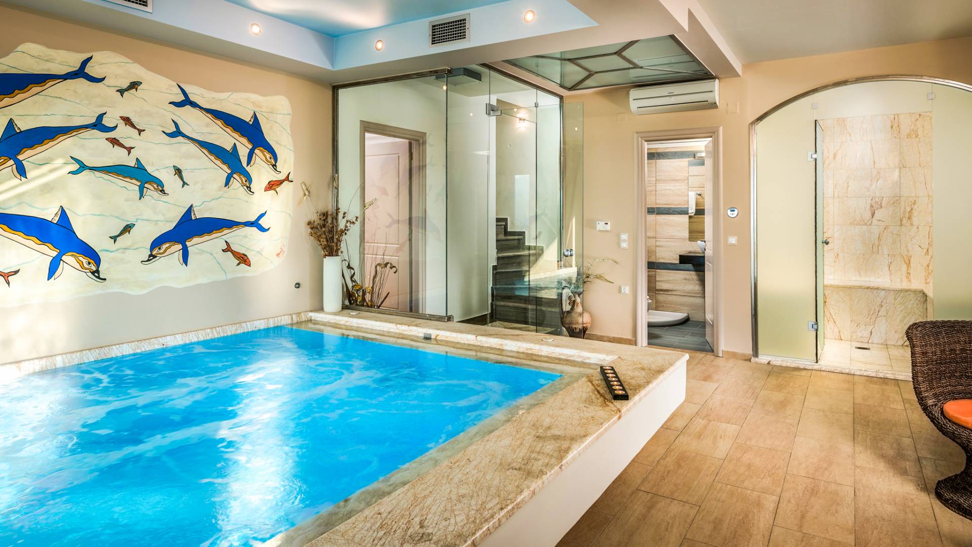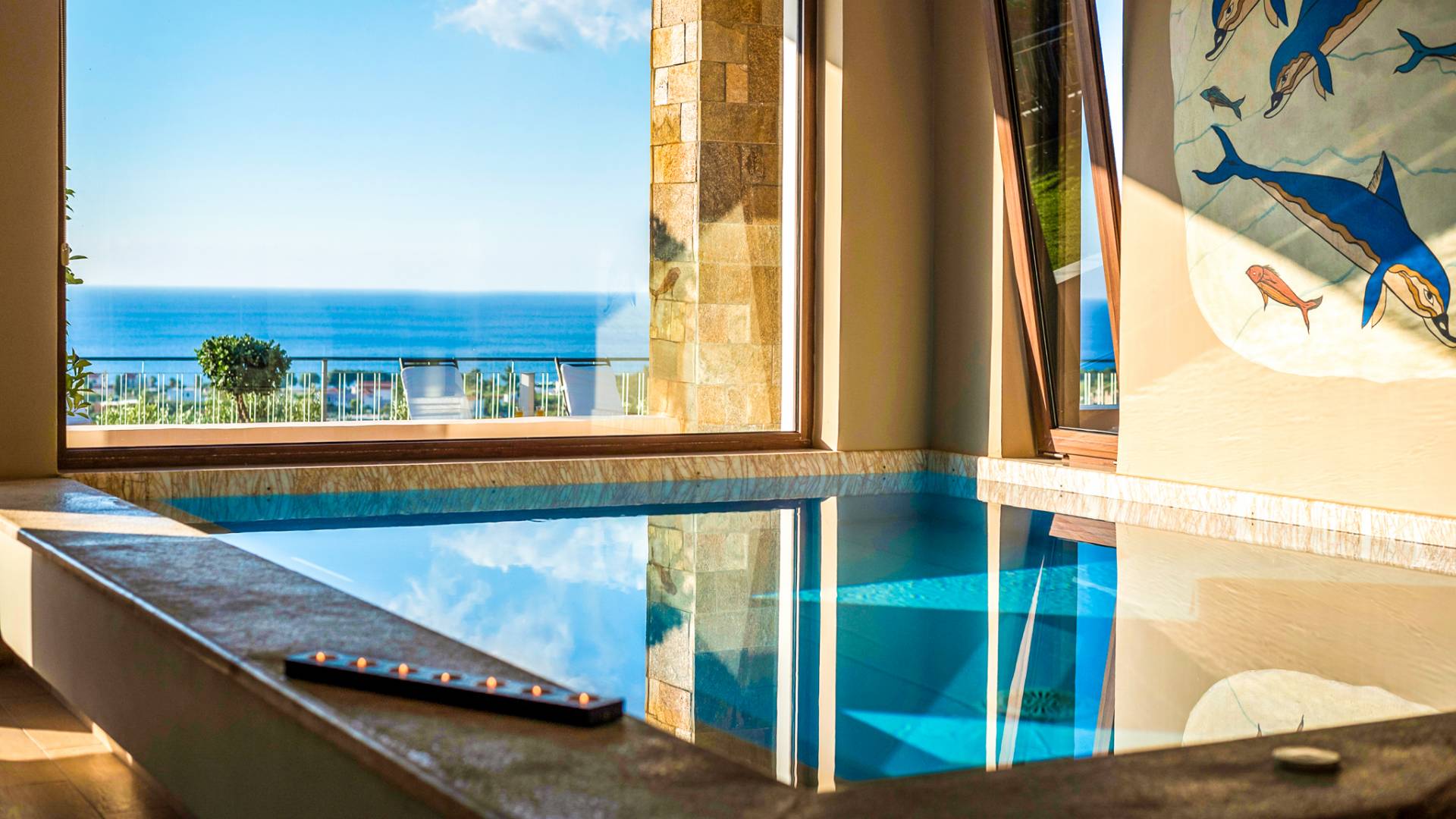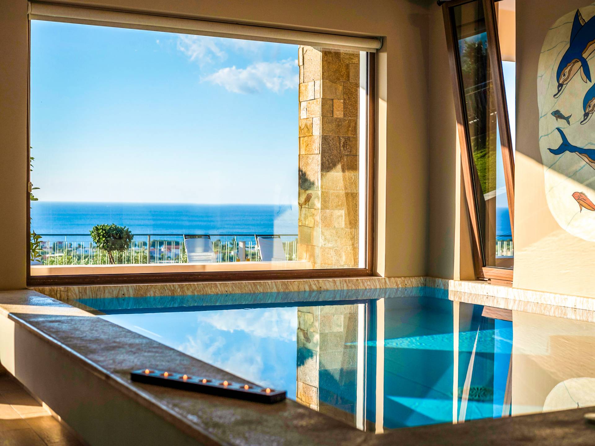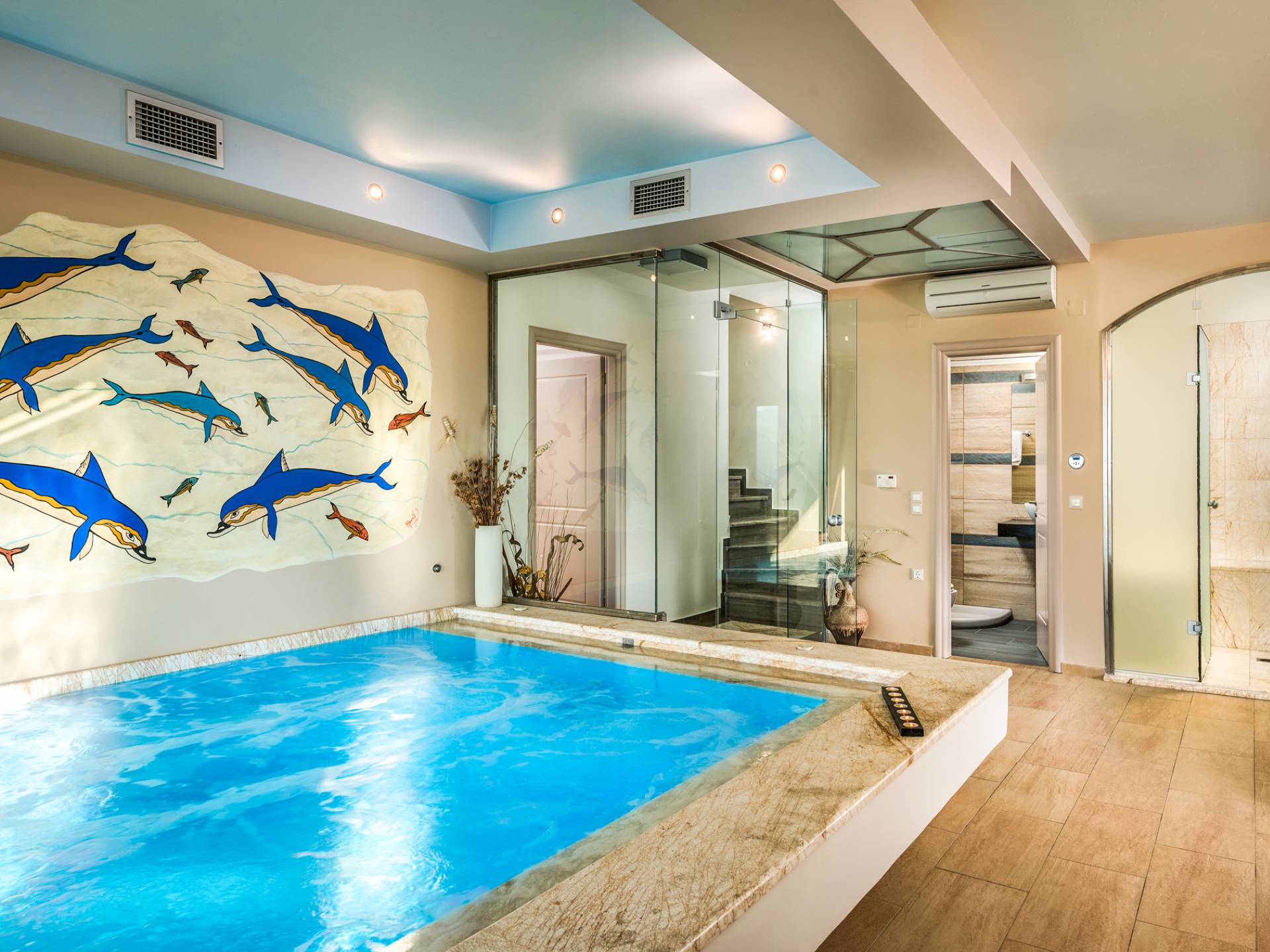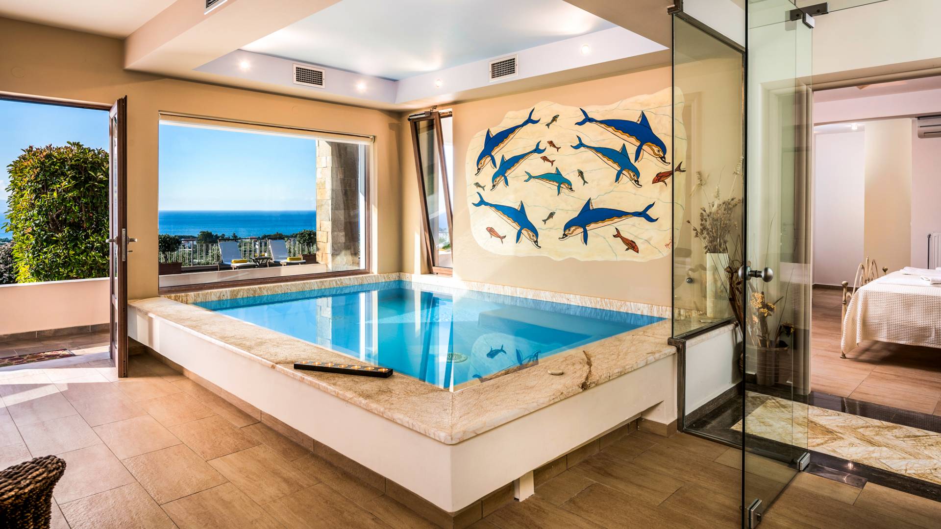 The walls are decorated with paintings inspired by the Minoan Palace. The perfect balance between modern and classical, the selection of high quality materials, the surrounding colours and hues, the spectacular view and the absolute calmness create an upscale atmosphere that guarantees a peaceful and pleasant stay.