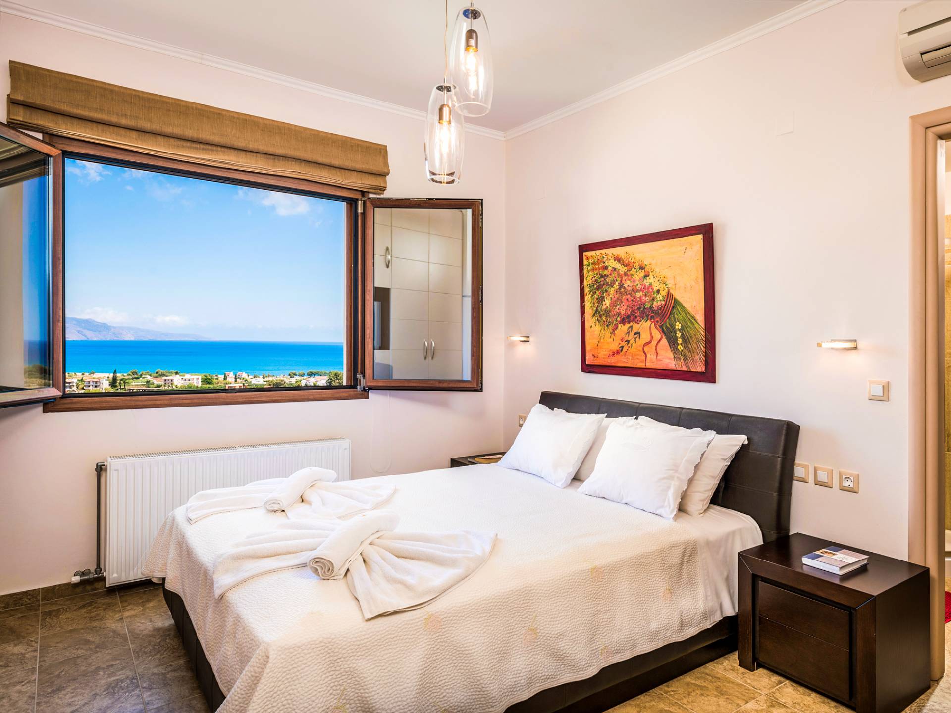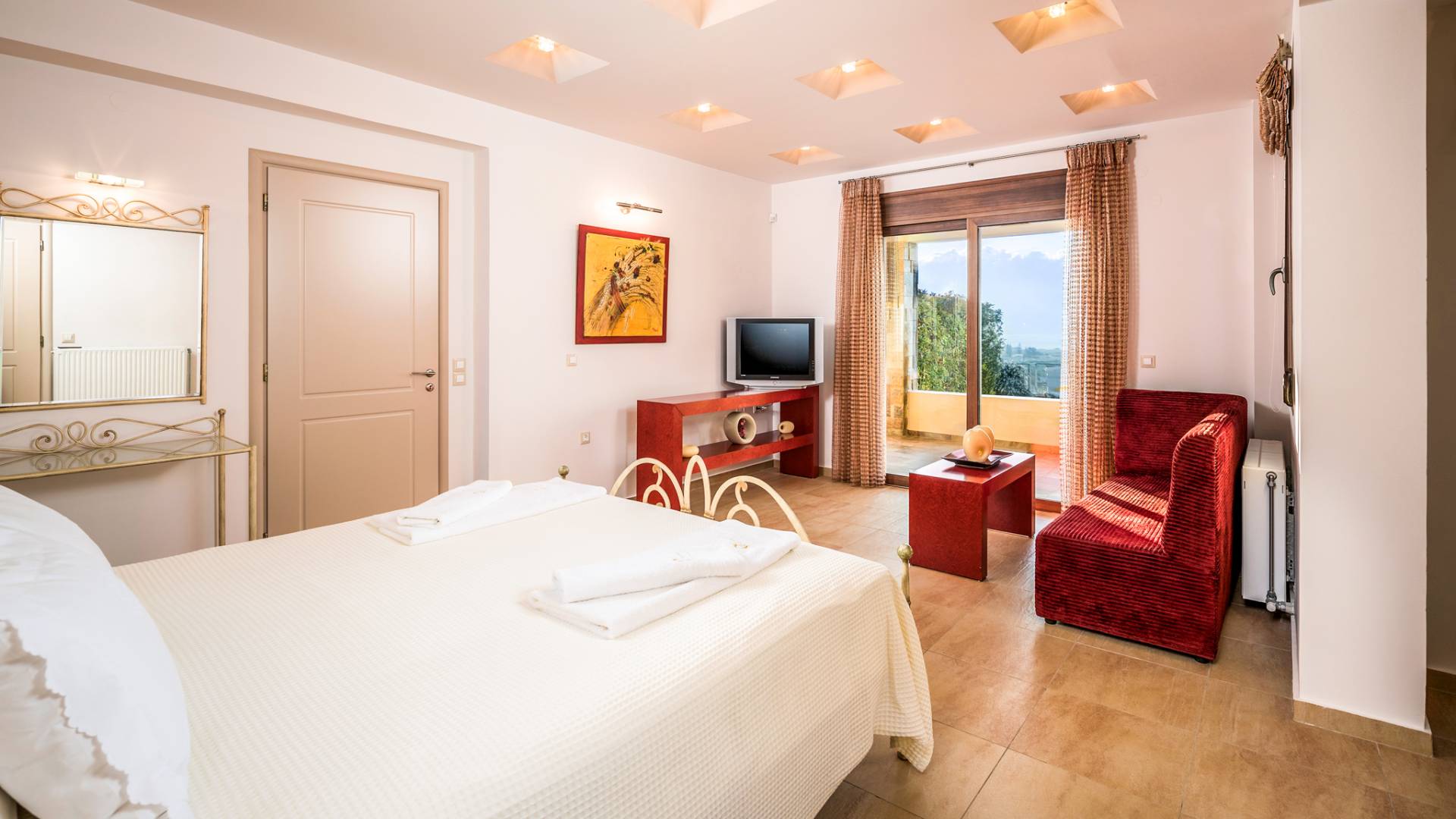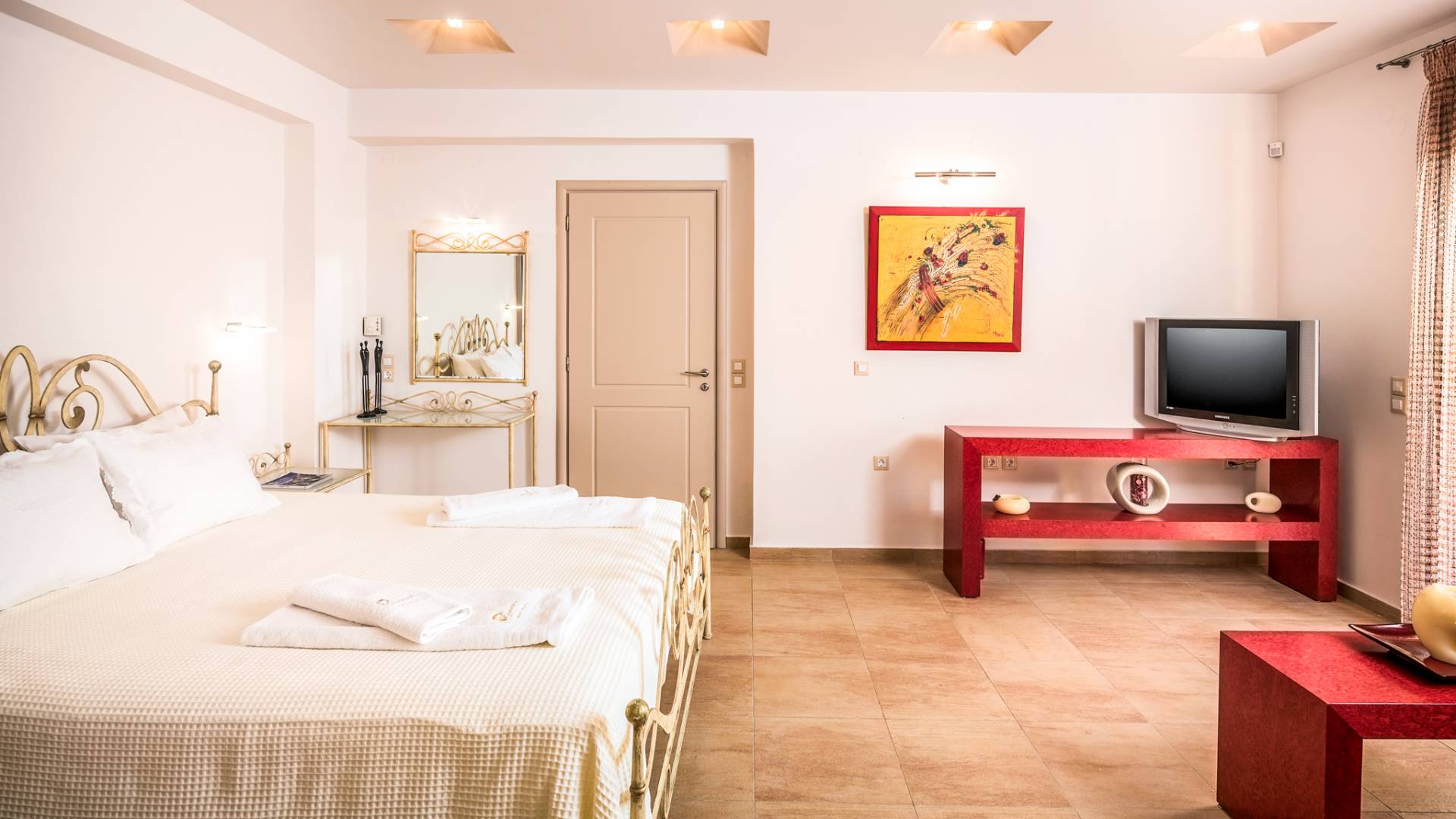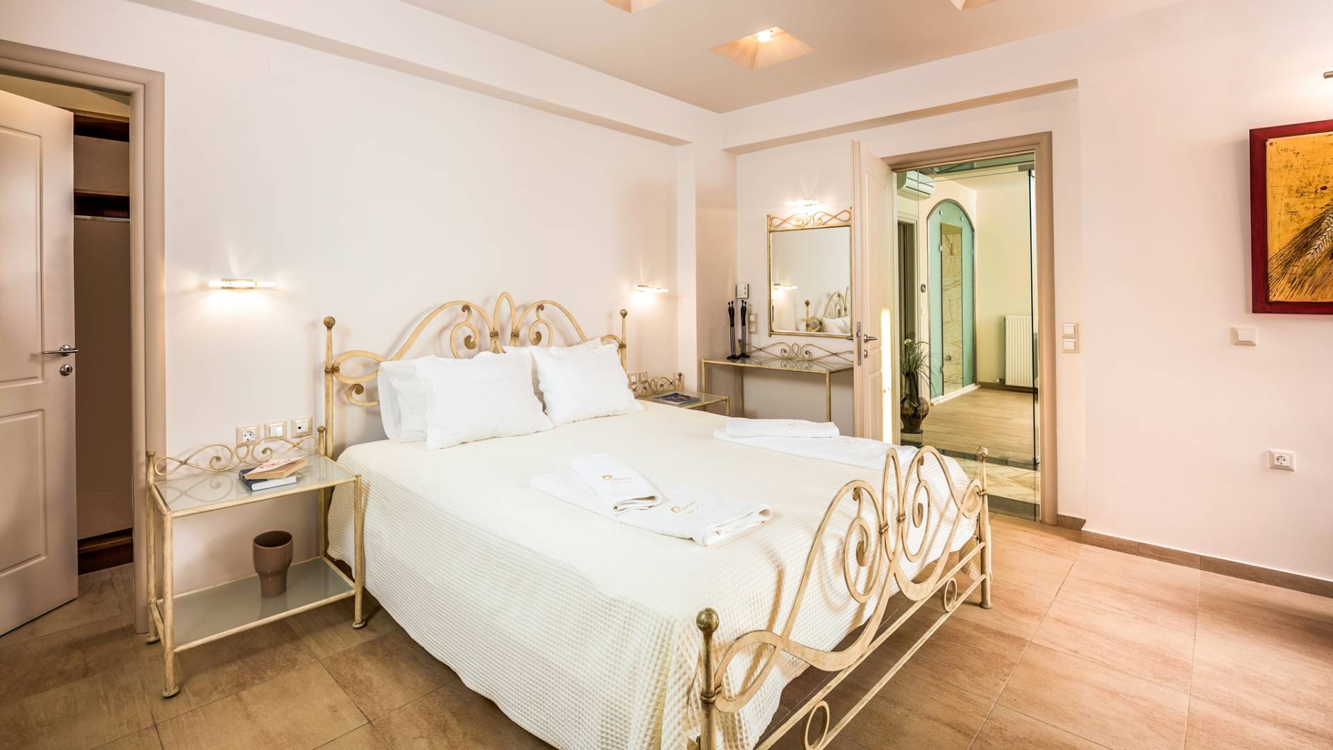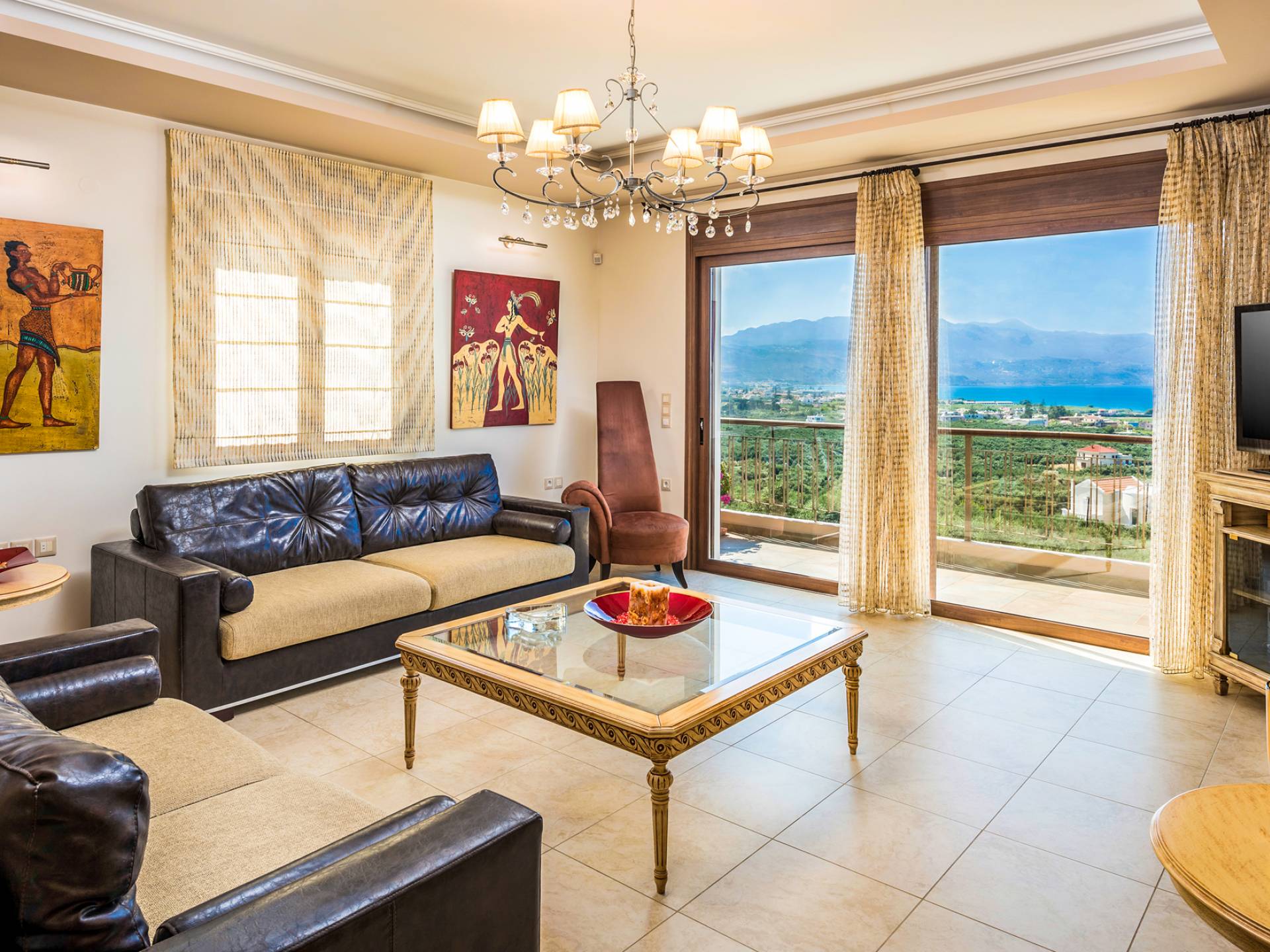 The walls are decorated with paintings inspired by the Minoan Palace. The perfect balance between modern and classical, the selection of high quality materials, the surrounding colours and hues, the spectacular view and the absolute calmness create an upscale atmosphere that guarantees a peaceful and pleasant stay.
