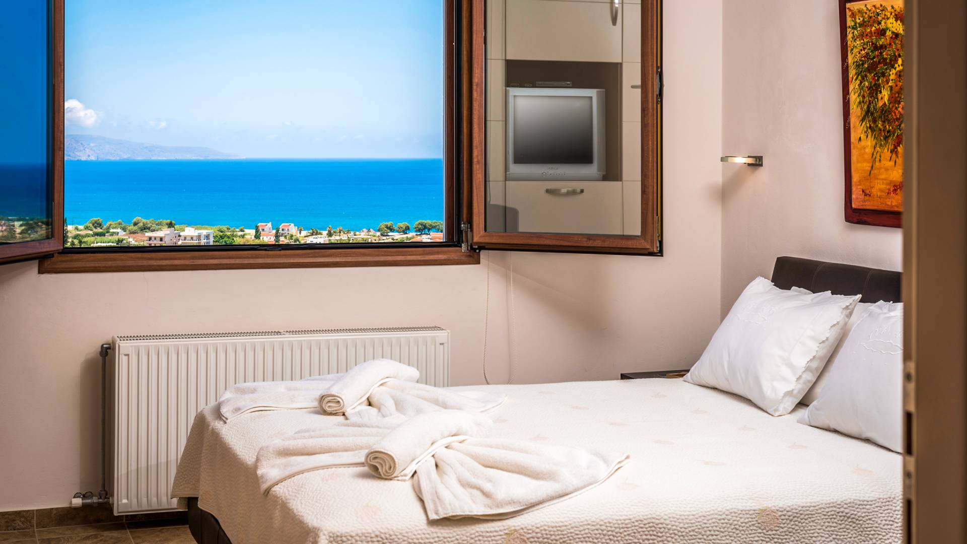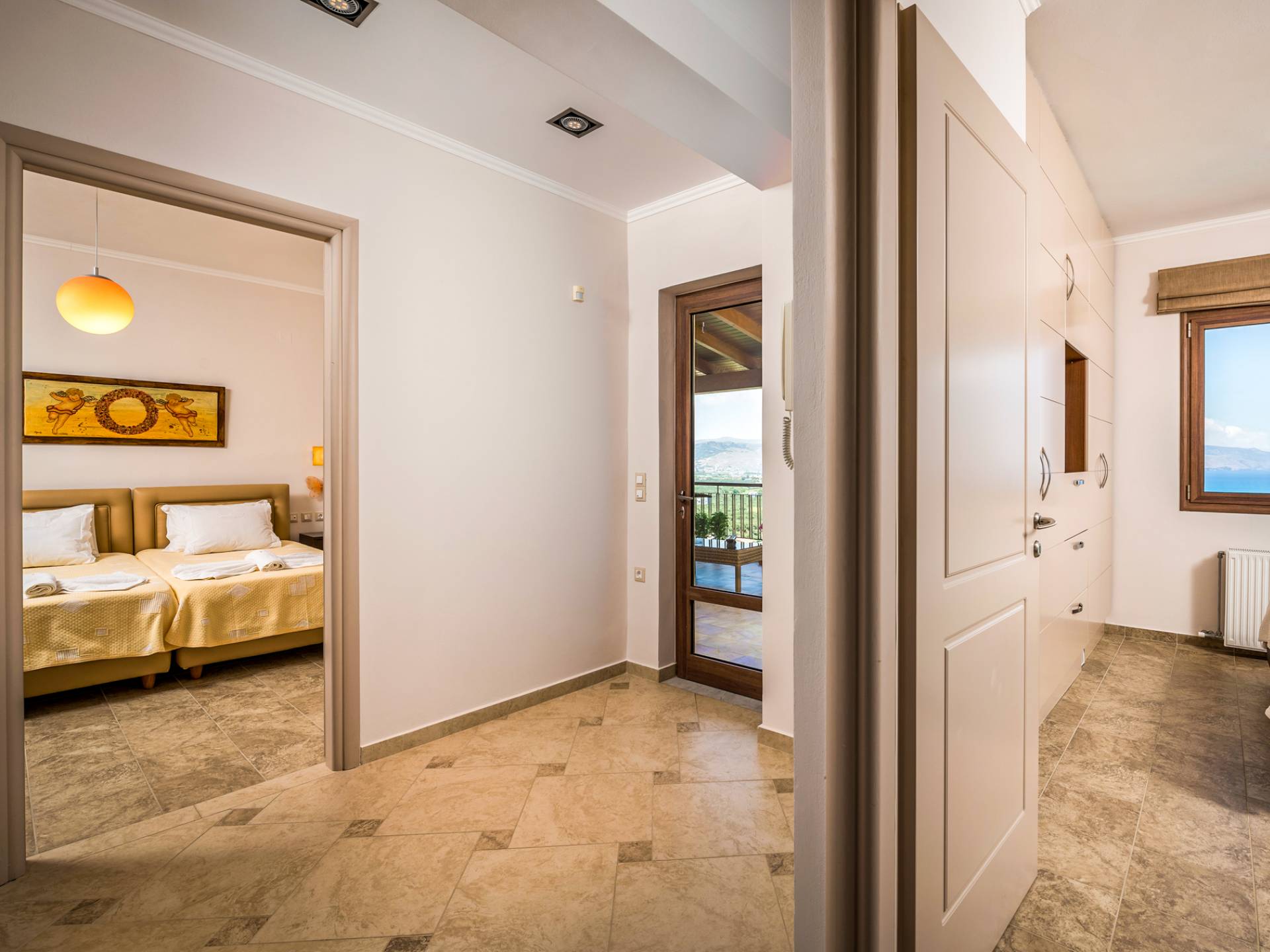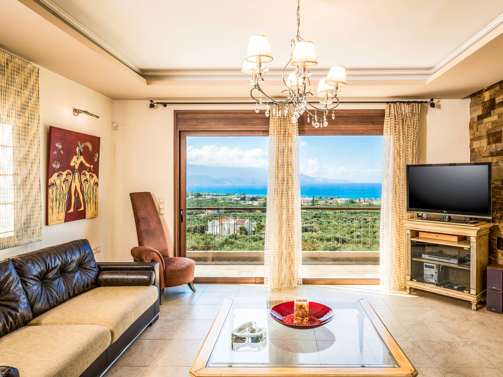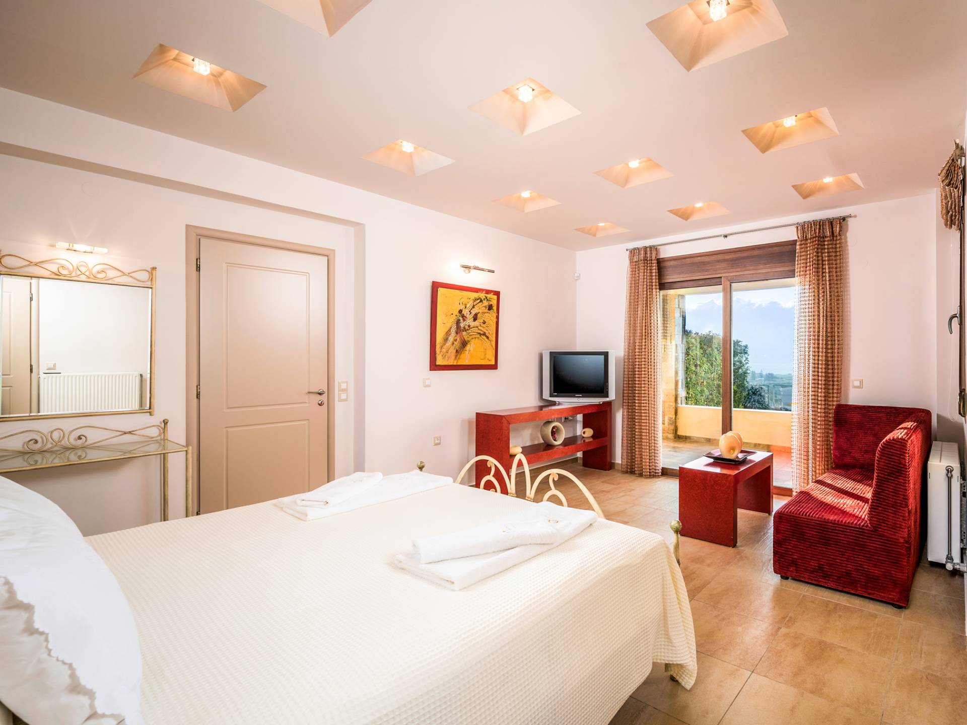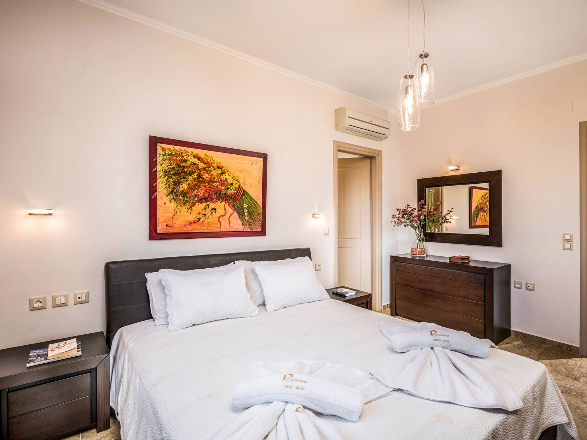 The walls are decorated with paintings inspired by the Minoan Palace. The perfect balance between modern and classical, the selection of high quality materials, the surrounding colours and hues, the spectacular view and the absolute calmness create an upscale atmosphere that guarantees a peaceful and pleasant stay.
