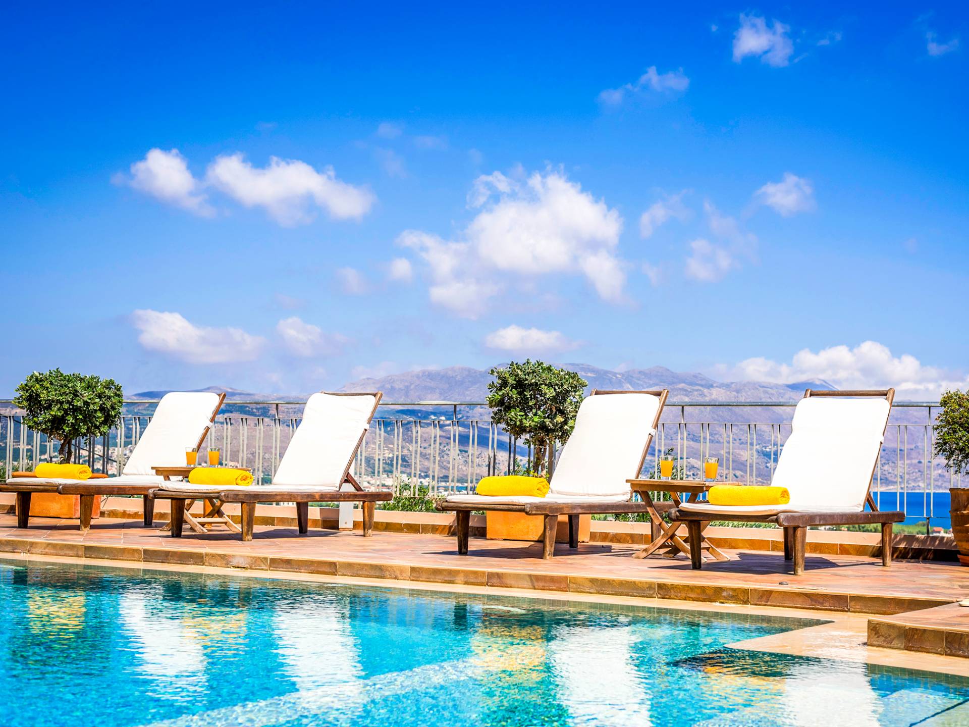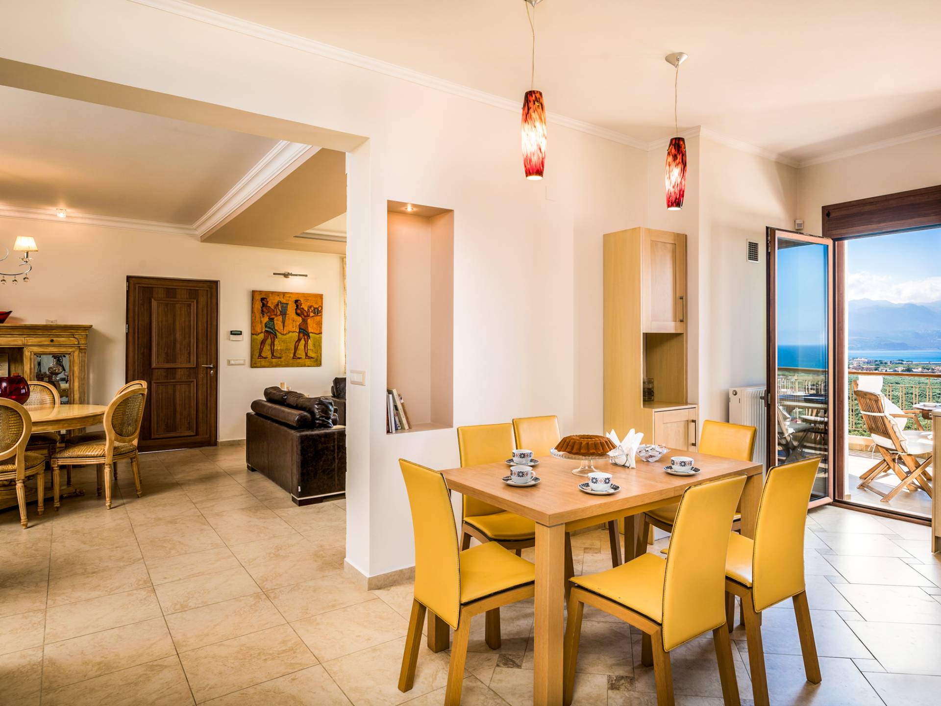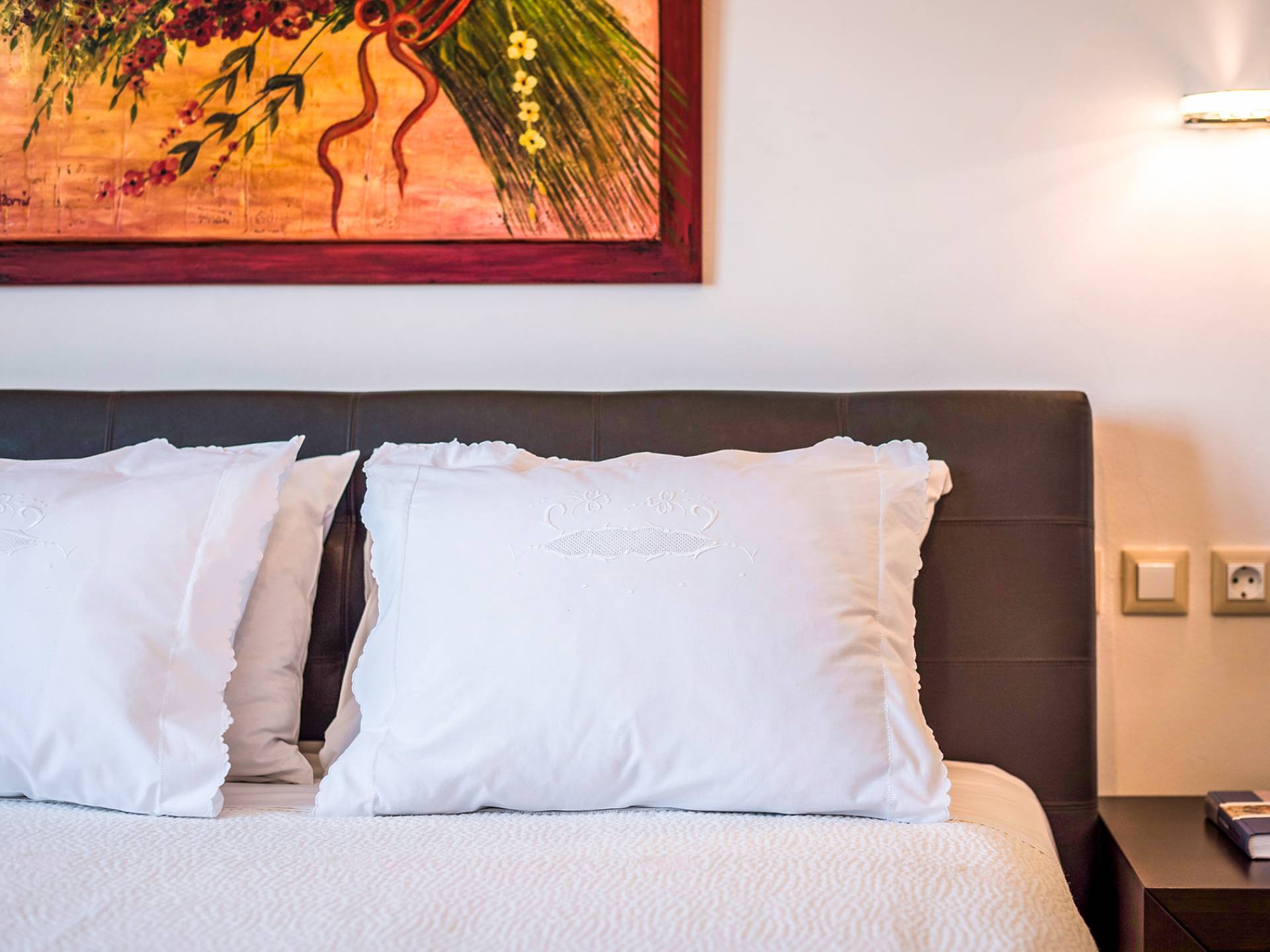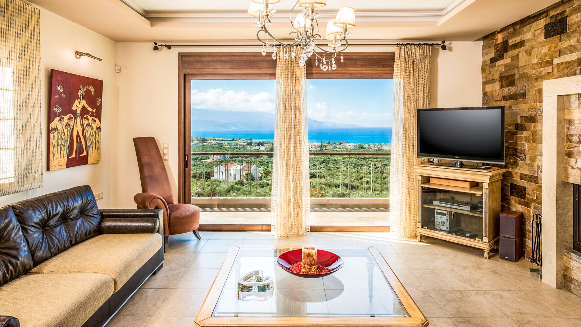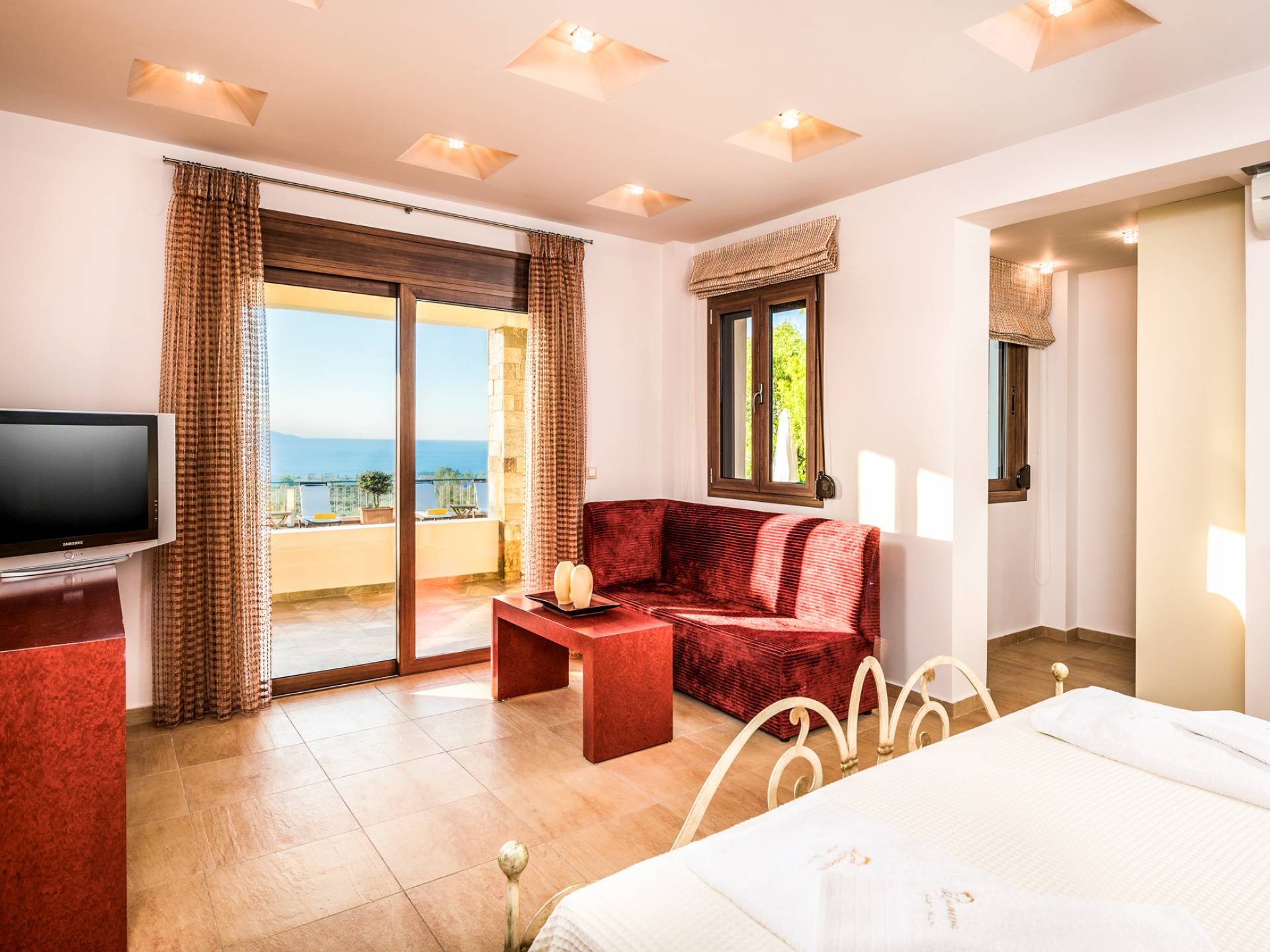 The walls are decorated with paintings inspired by the Minoan Palace. The perfect balance between modern and classical, the selection of high quality materials, the surrounding colours and hues, the spectacular view and the absolute calmness create an upscale atmosphere that guarantees a peaceful and pleasant stay.