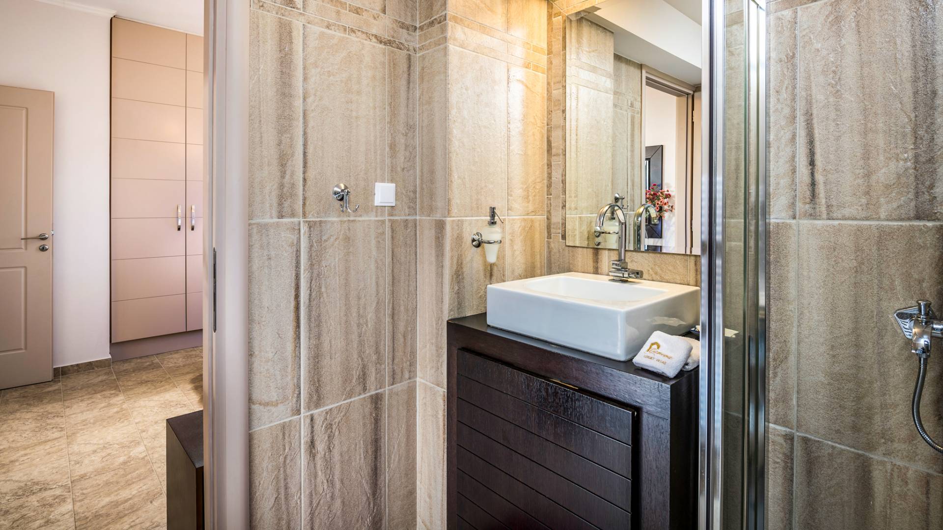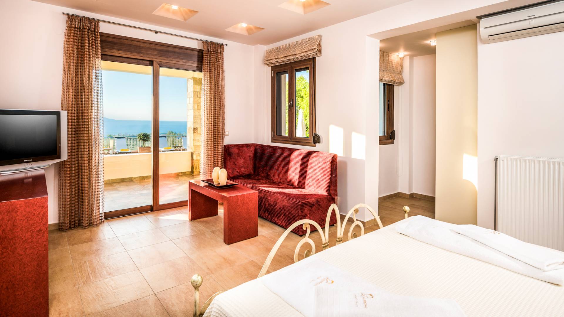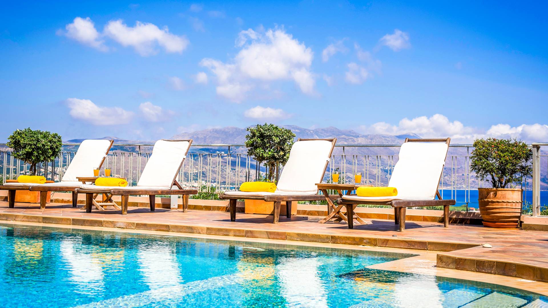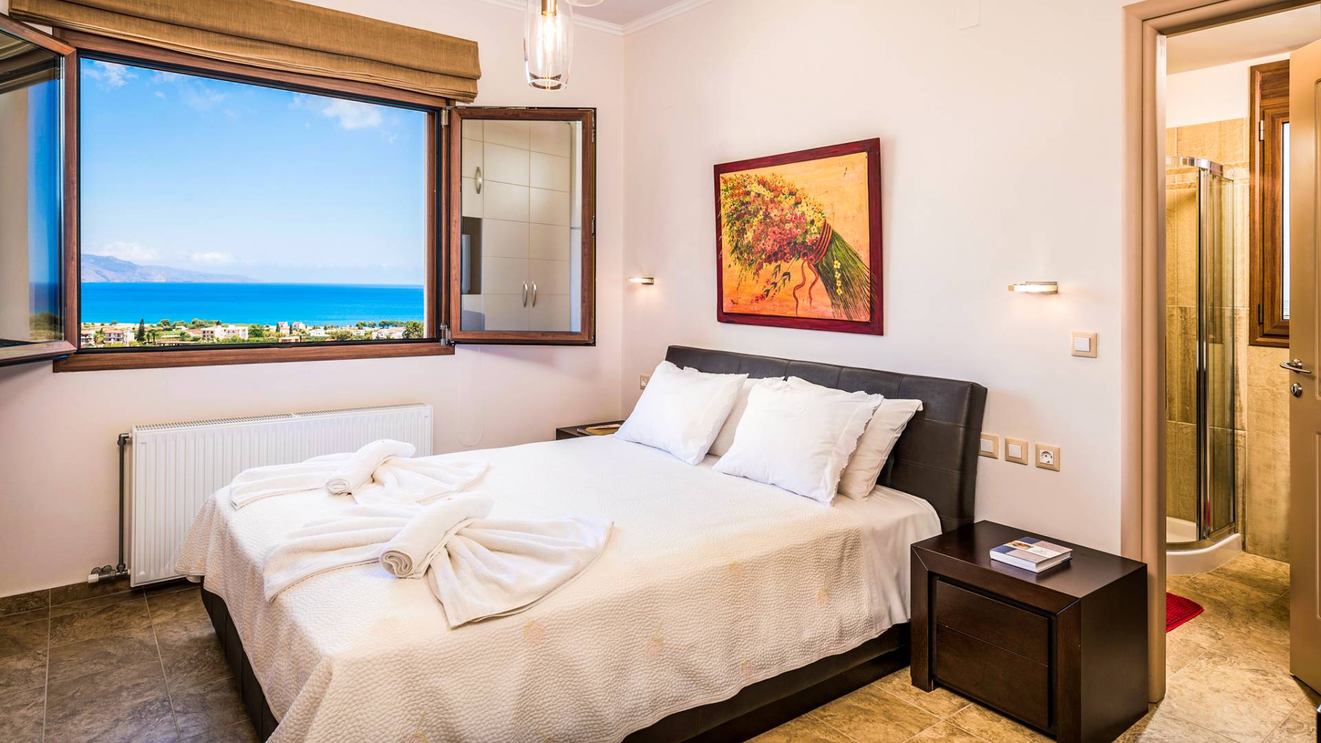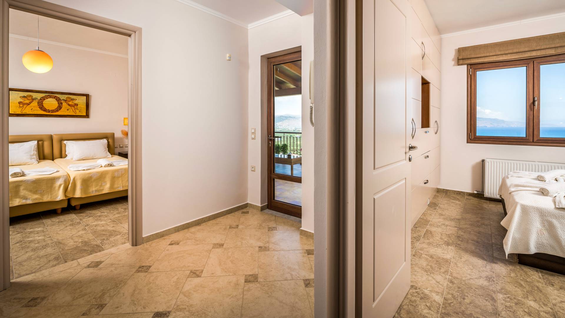The walls are decorated with paintings inspired by the Minoan Palace. The perfect balance between modern and classical, the selection of high quality materials, the surrounding colours and hues, the spectacular view and the absolute calmness create an upscale atmosphere that guarantees a peaceful and pleasant stay.