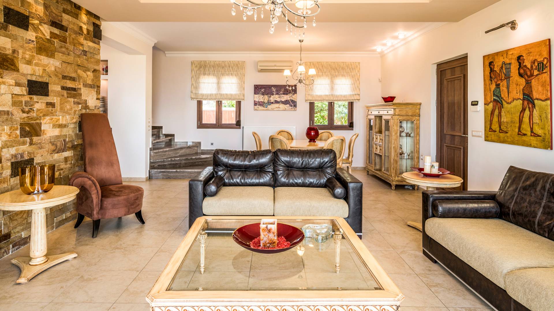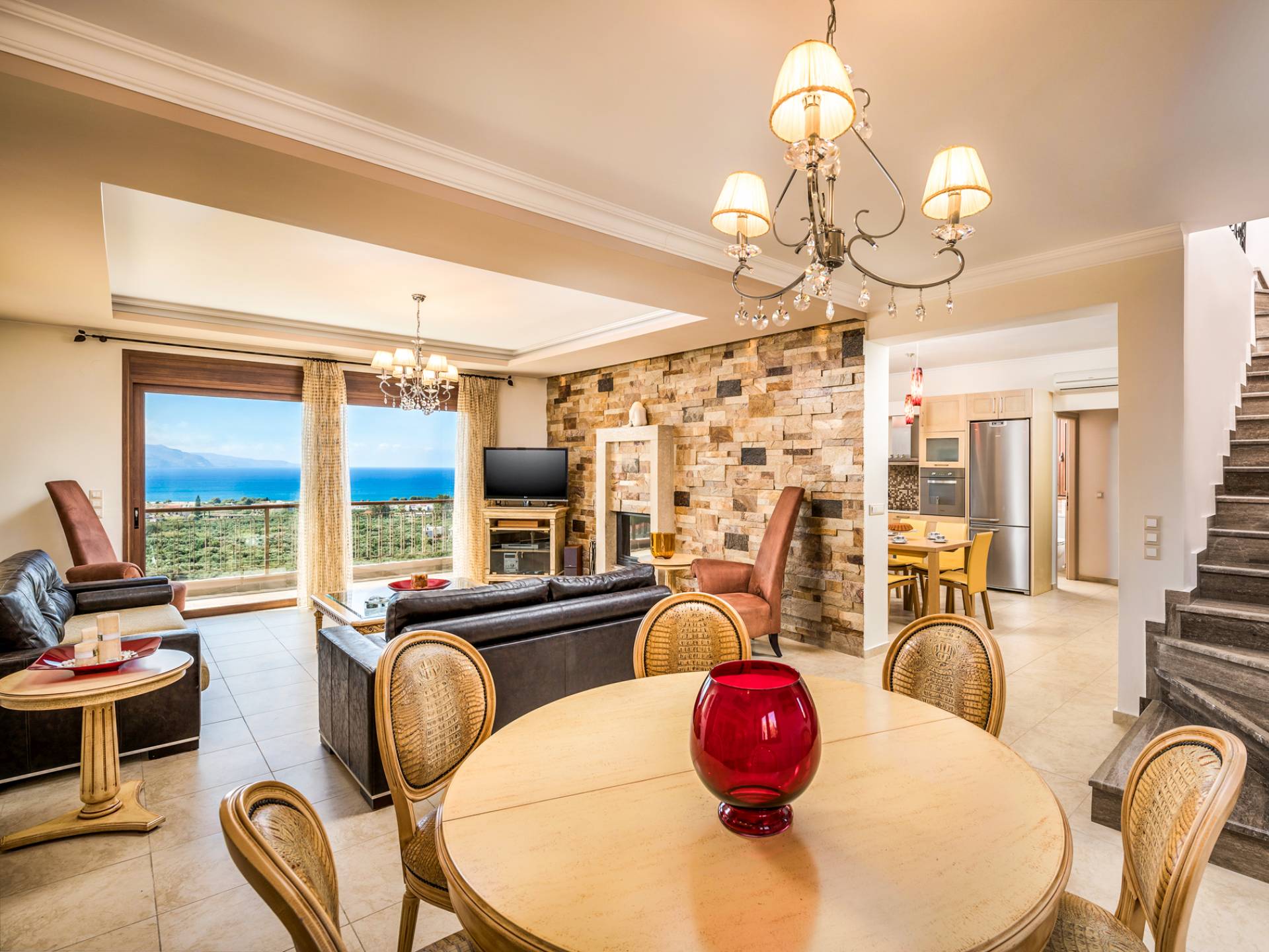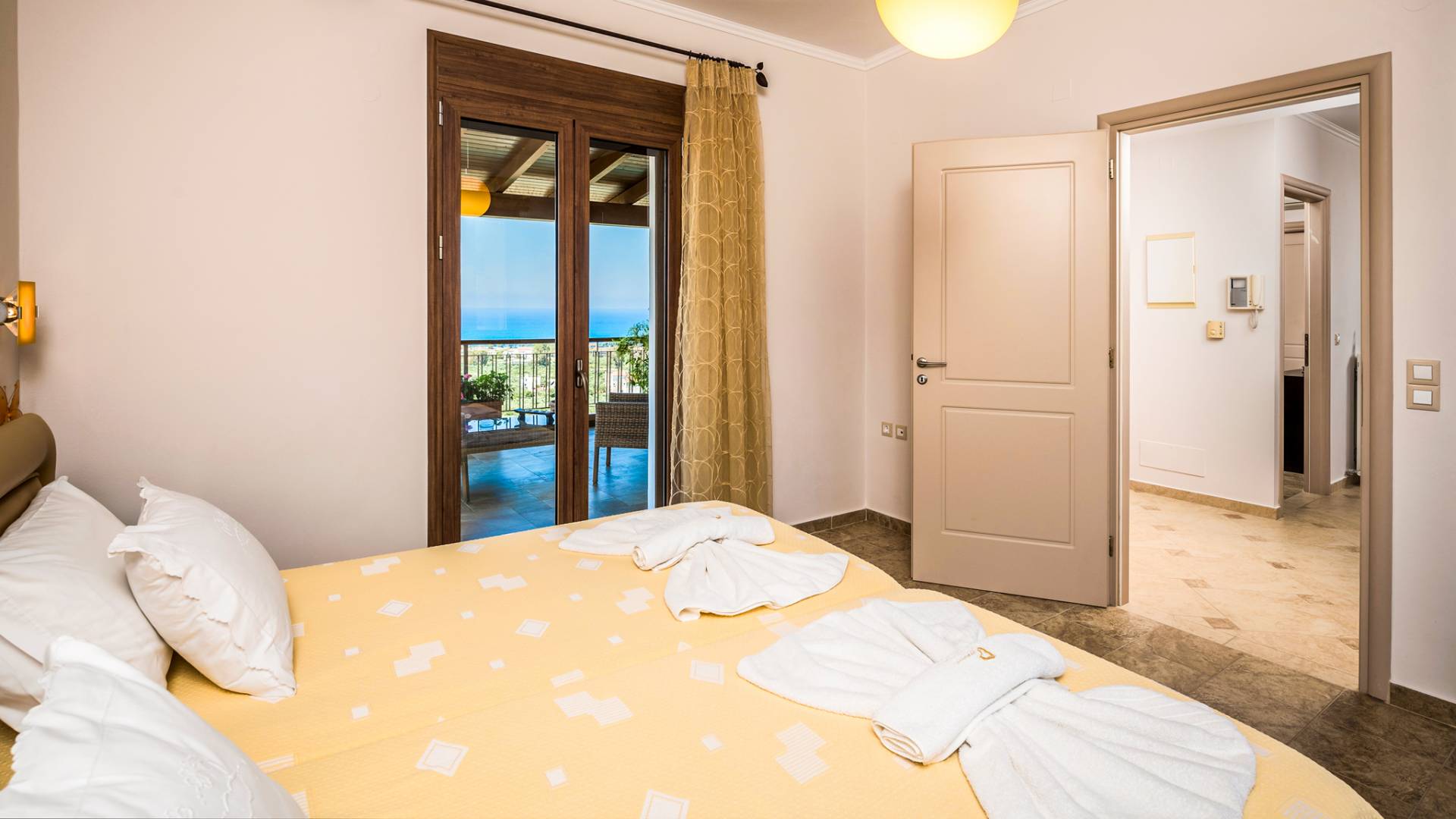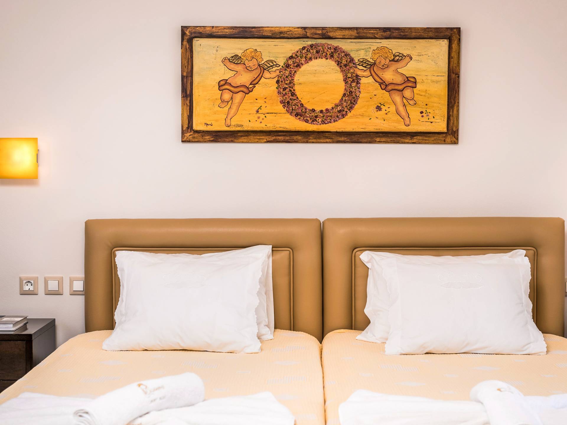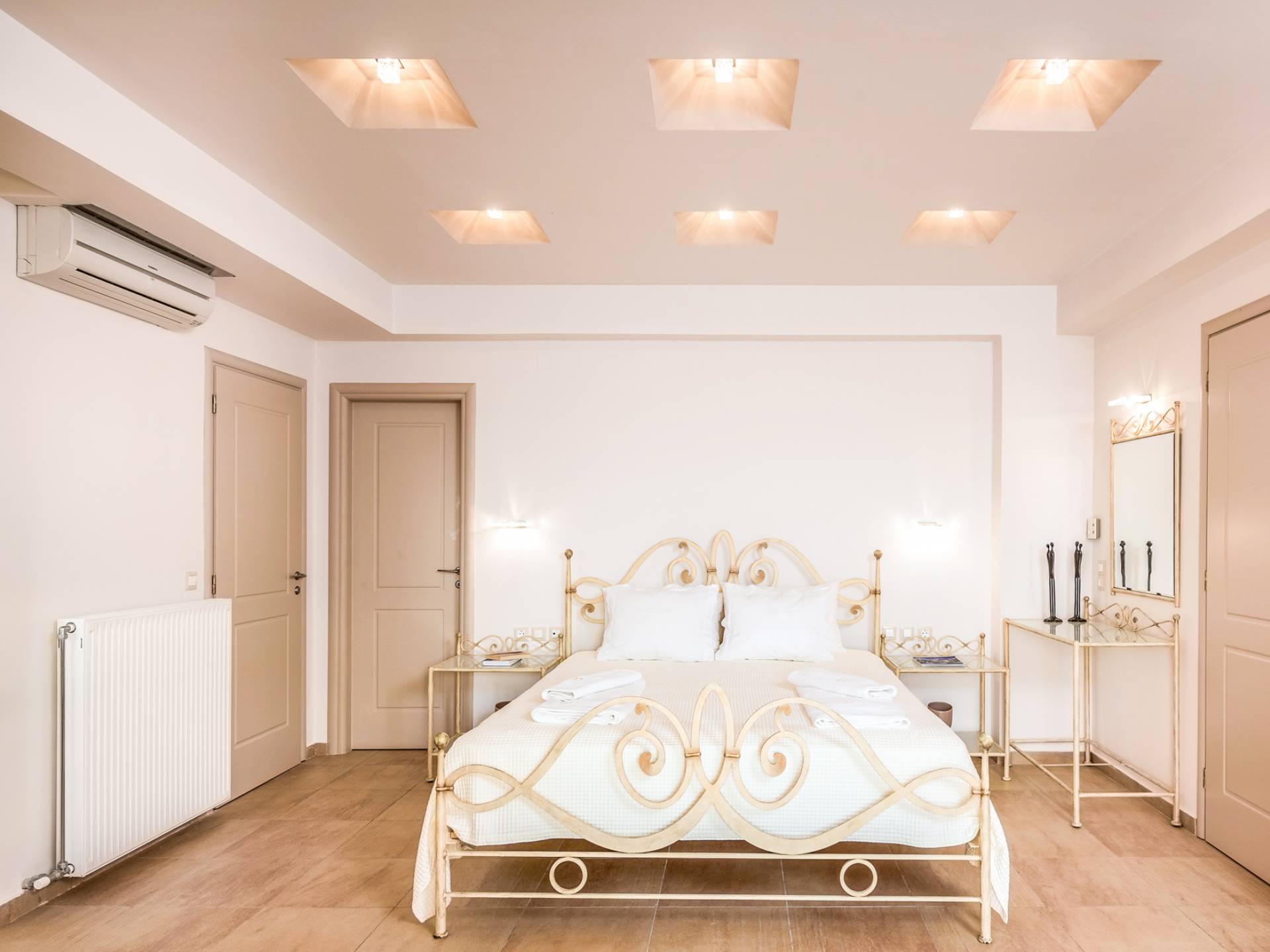 The walls are decorated with paintings inspired by the Minoan Palace. The perfect balance between modern and classical, the selection of high quality materials, the surrounding colours and hues, the spectacular view and the absolute calmness create an upscale atmosphere that guarantees a peaceful and pleasant stay.