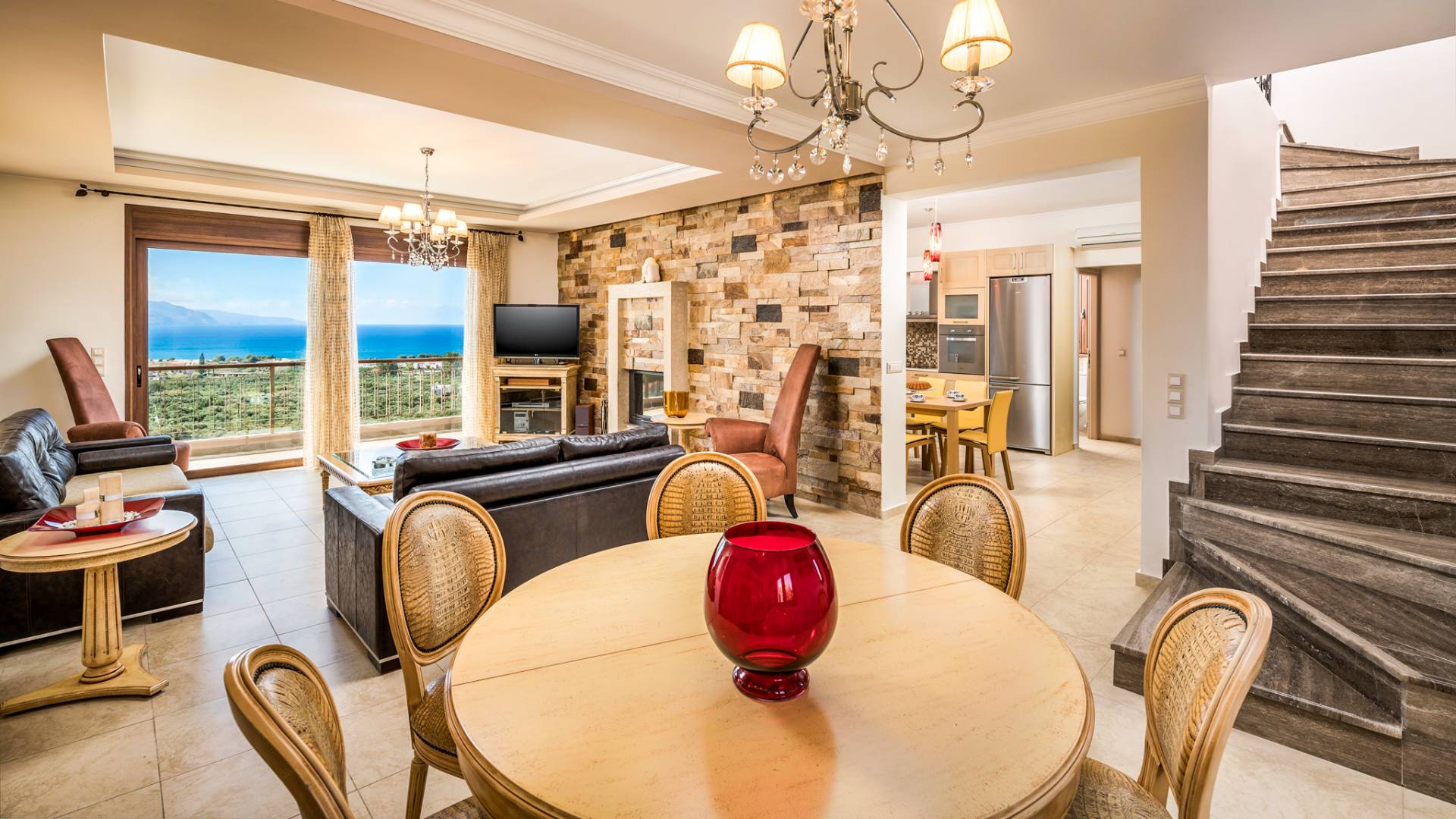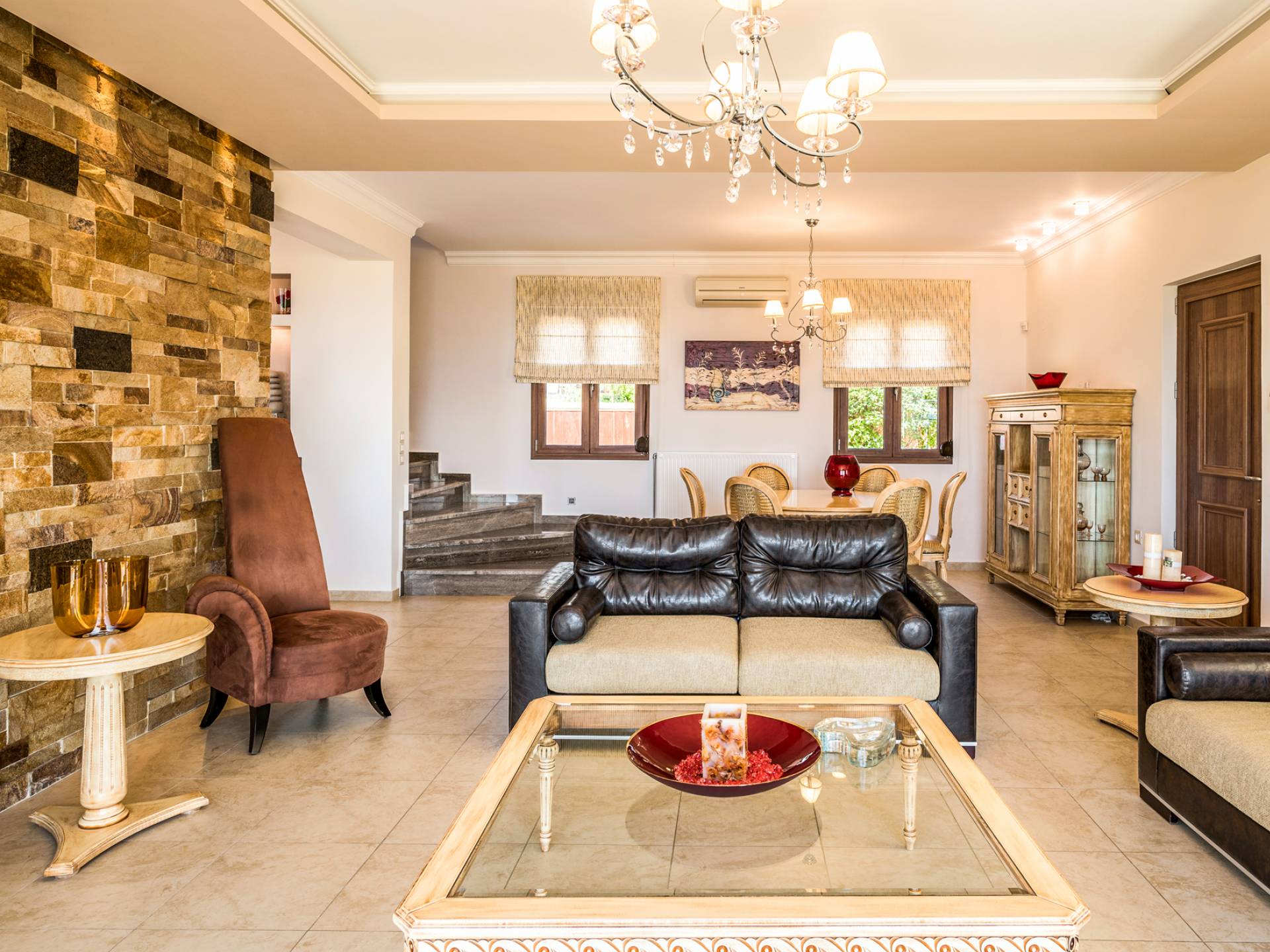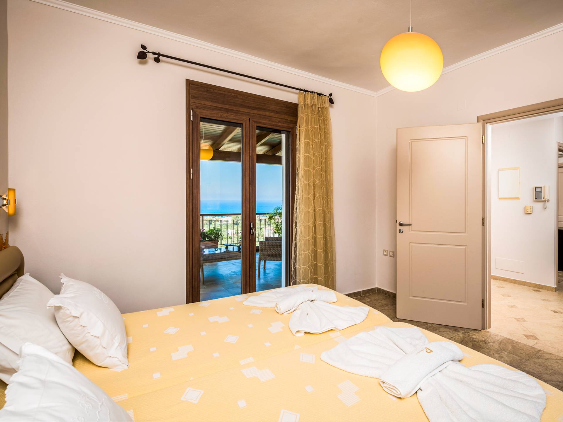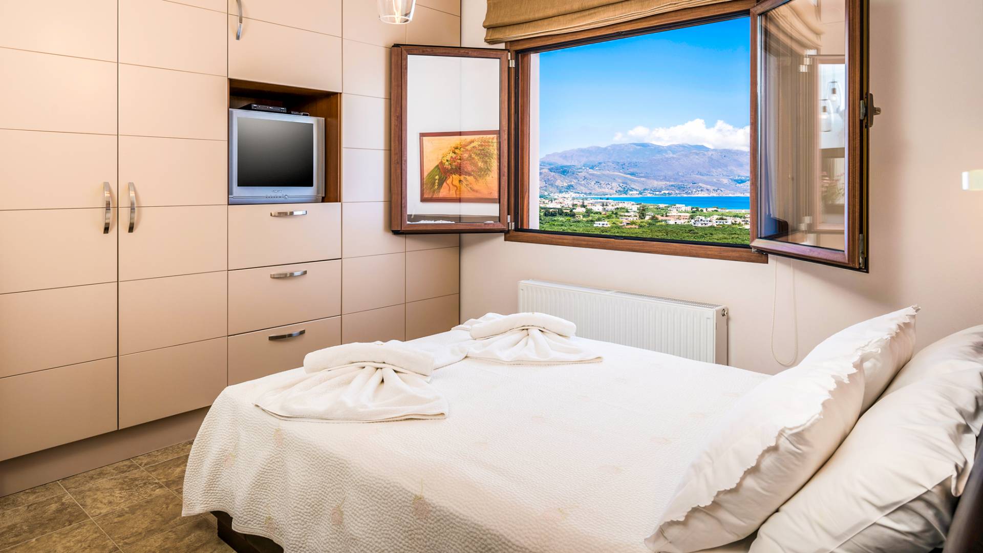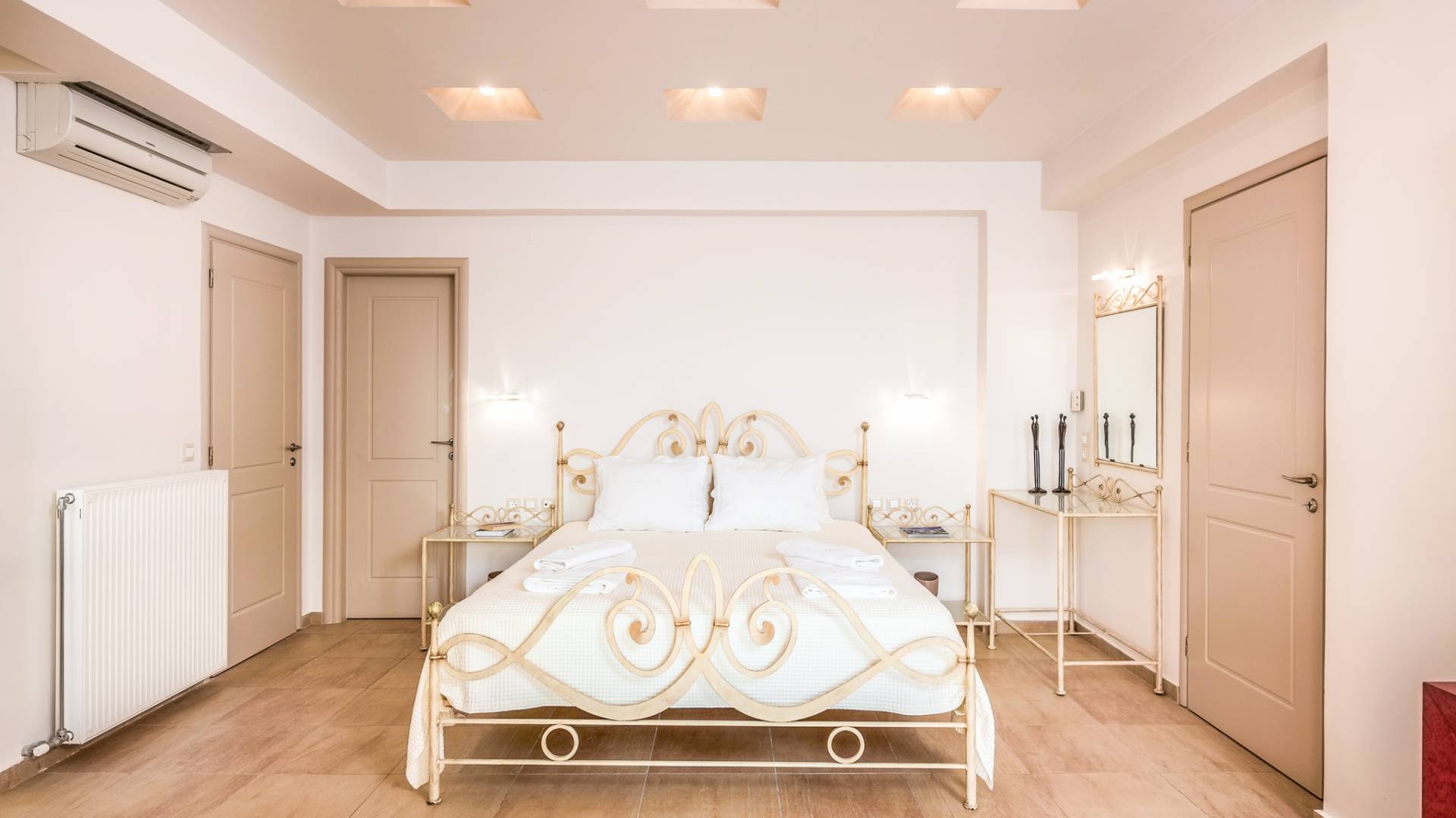 The walls are decorated with paintings inspired by the Minoan Palace. The perfect balance between modern and classical, the selection of high quality materials, the surrounding colours and hues, the spectacular view and the absolute calmness create an upscale atmosphere that guarantees a peaceful and pleasant stay.
