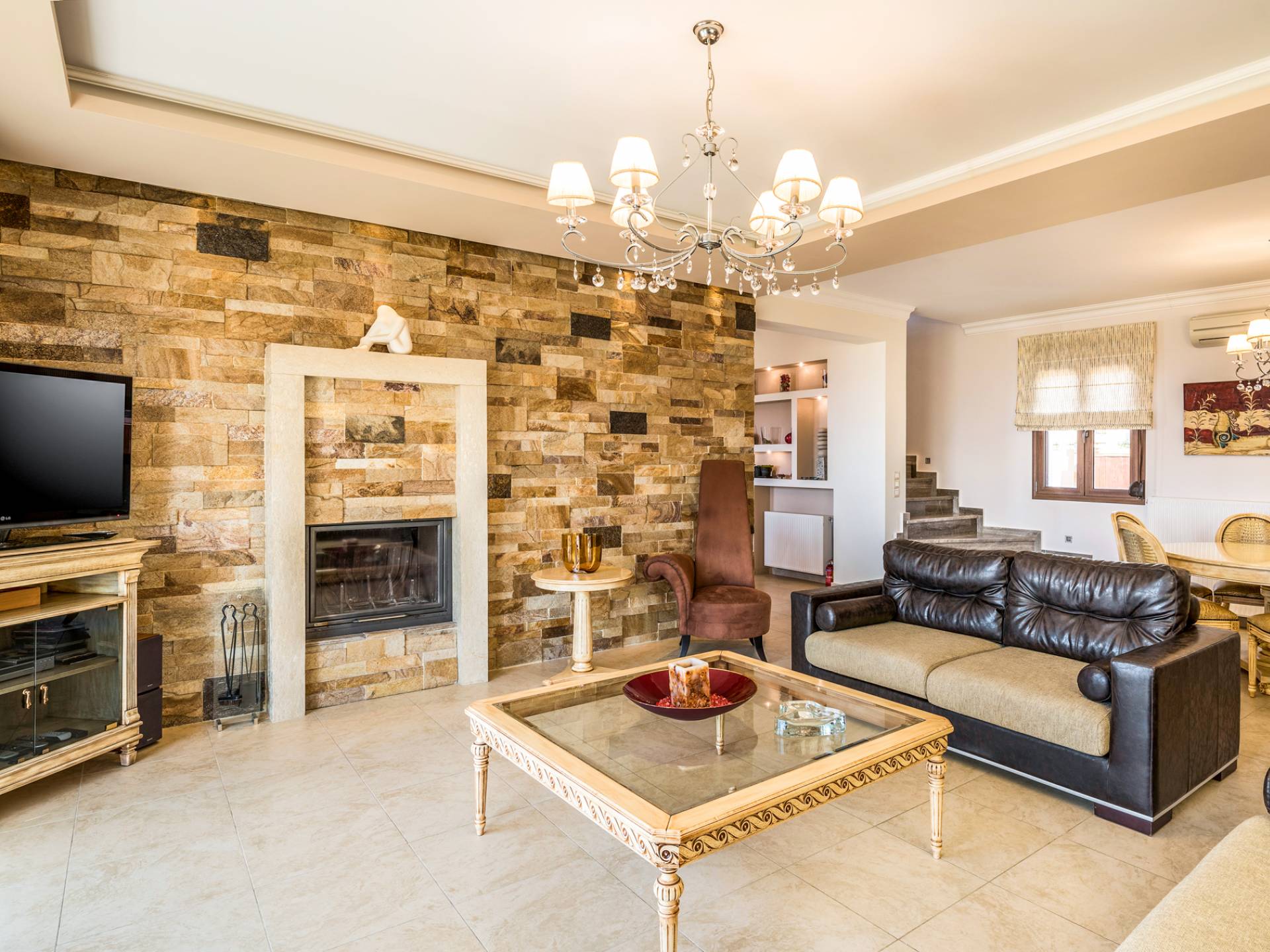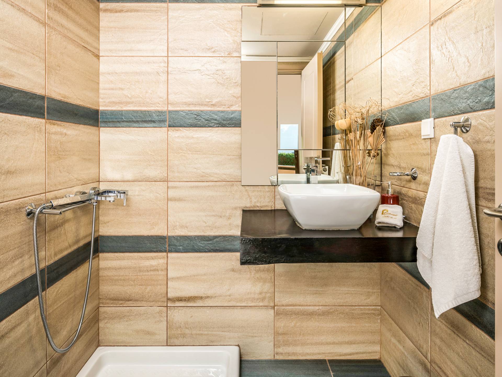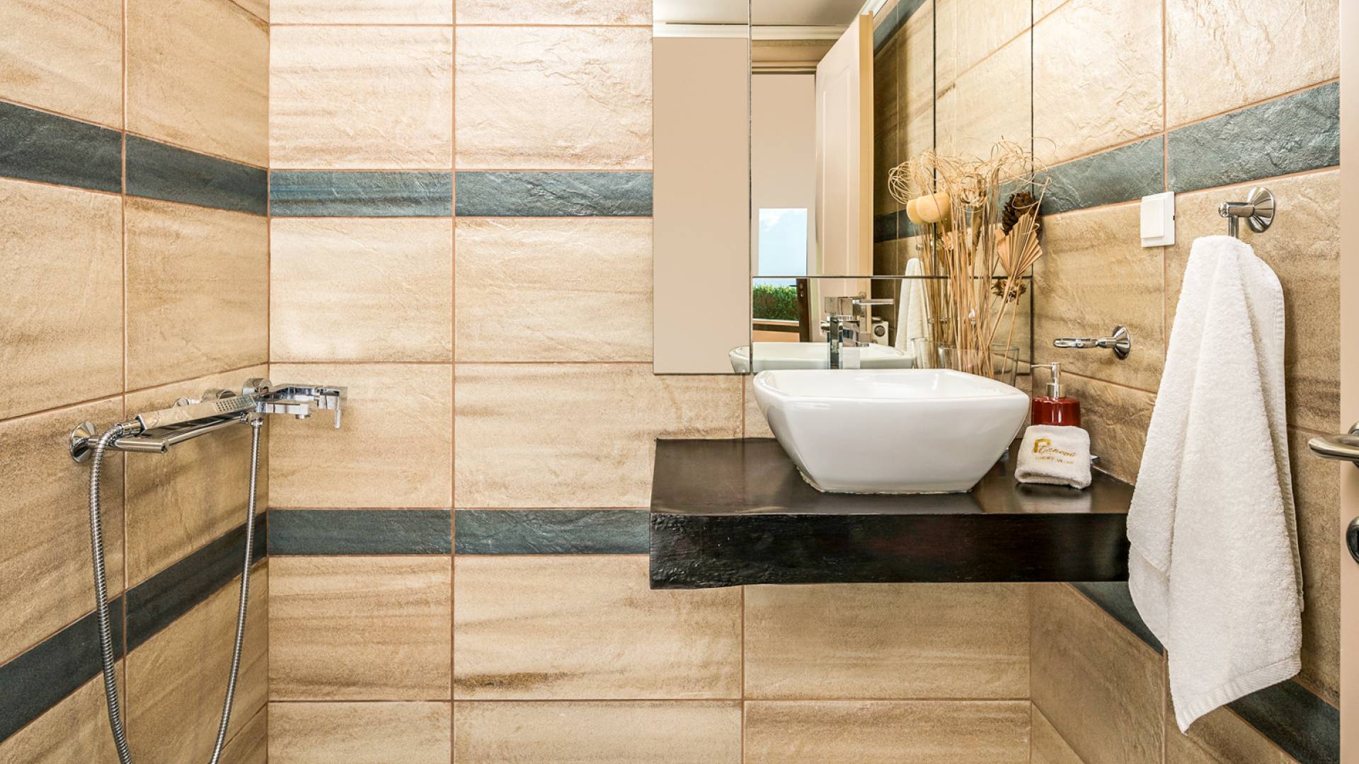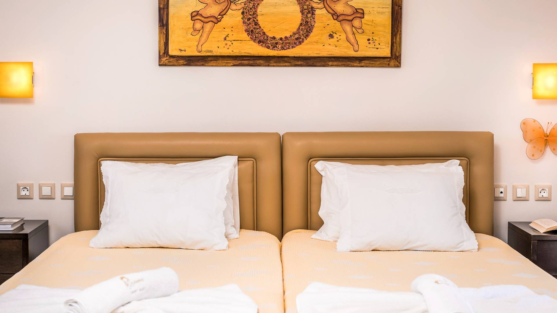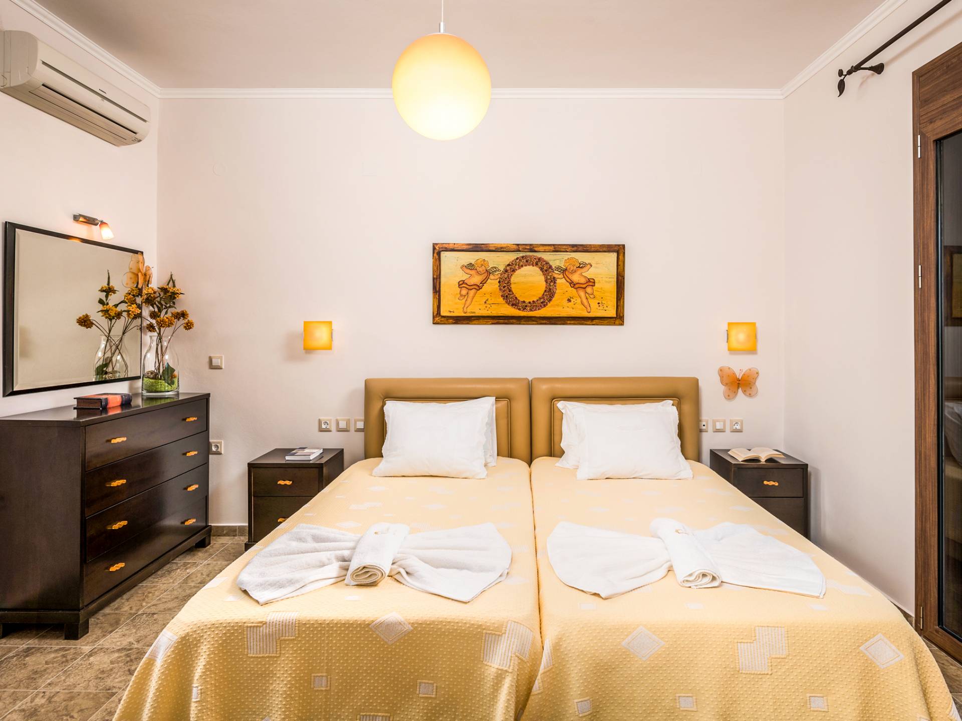 The walls are decorated with paintings inspired by the Minoan Palace. The perfect balance between modern and classical, the selection of high quality materials, the surrounding colours and hues, the spectacular view and the absolute calmness create an upscale atmosphere that guarantees a peaceful and pleasant stay.