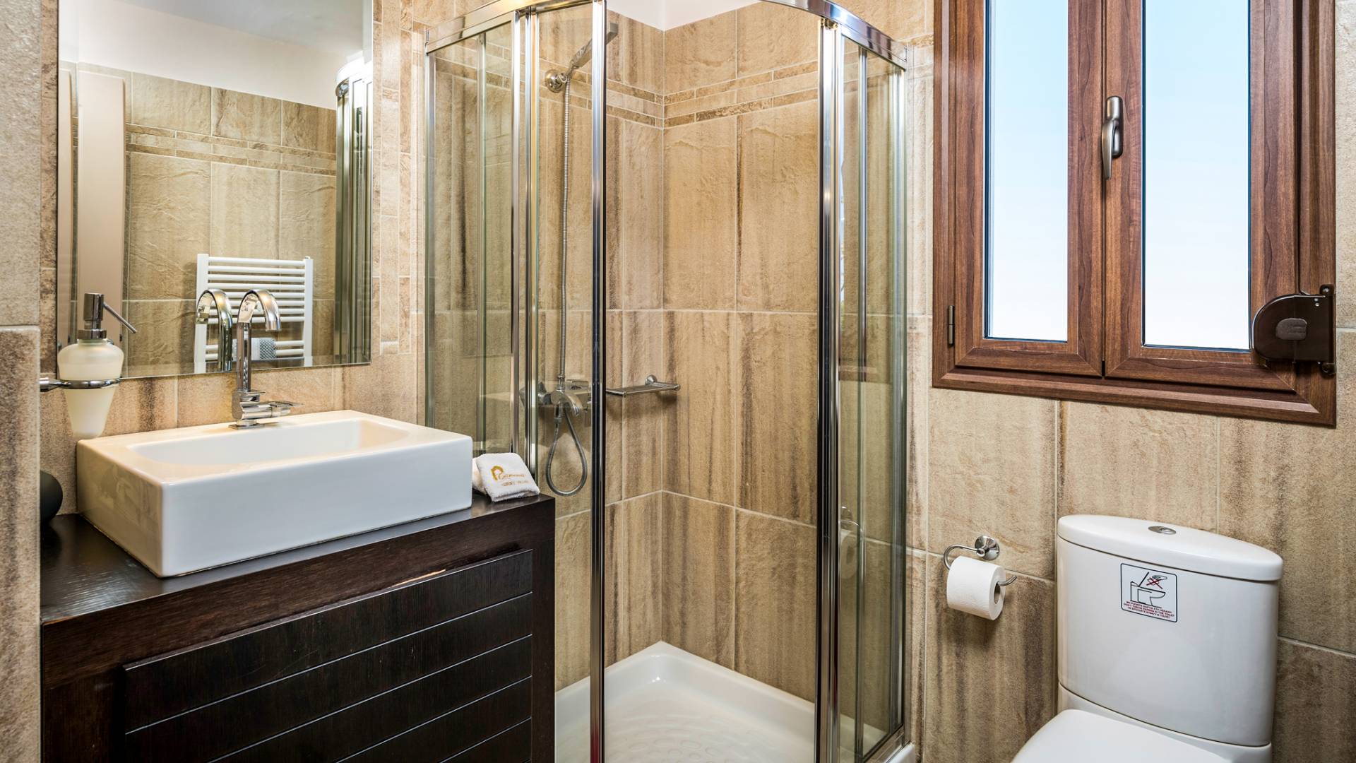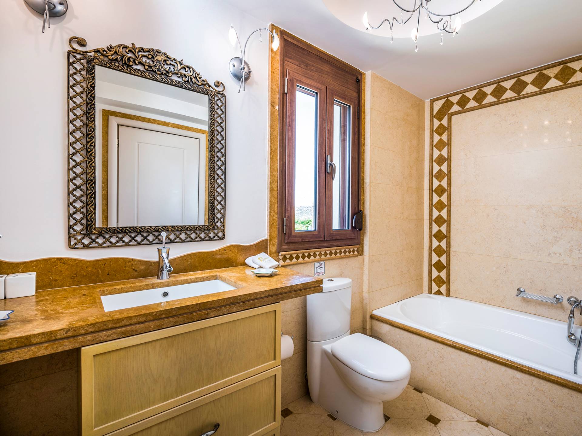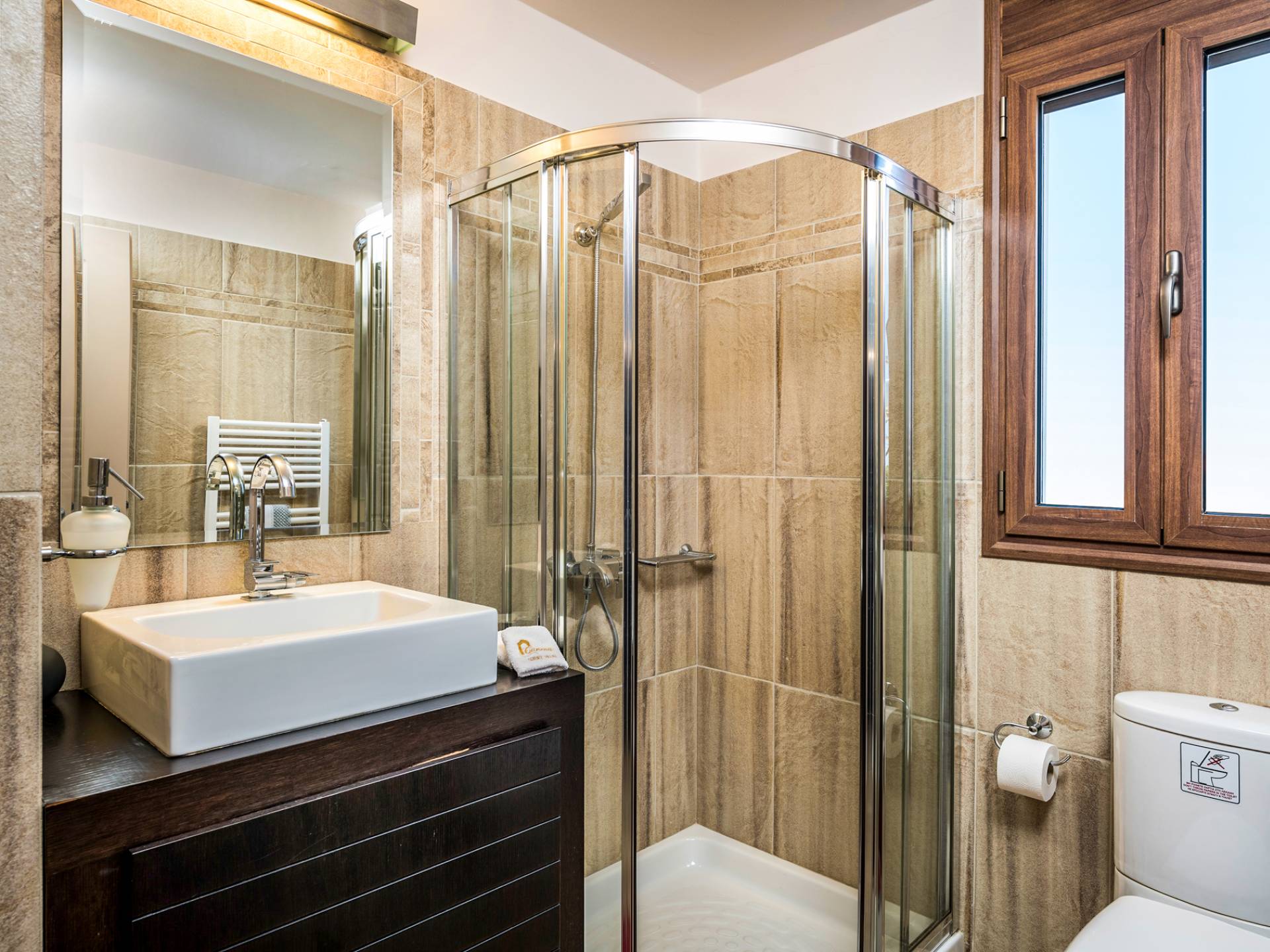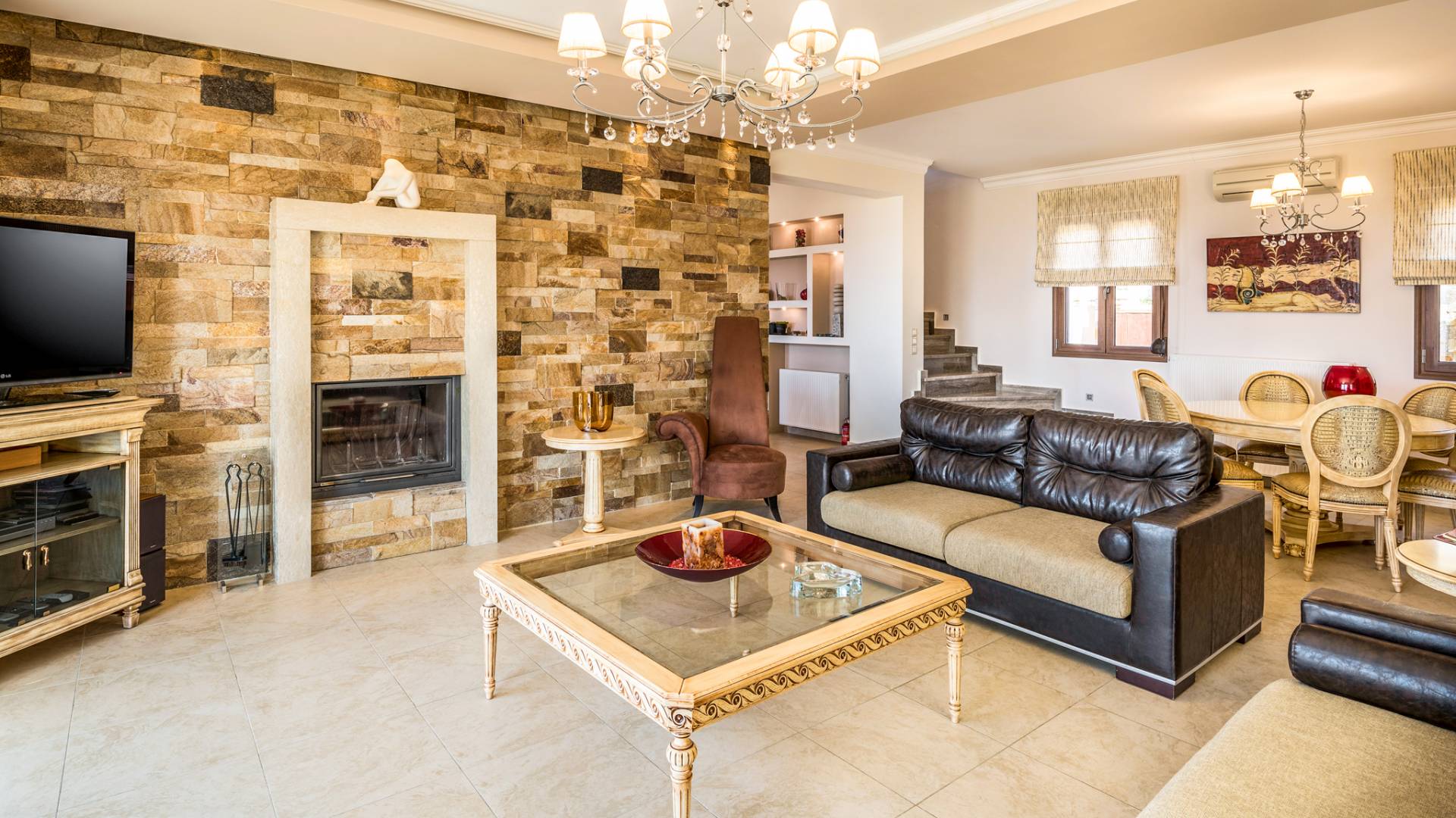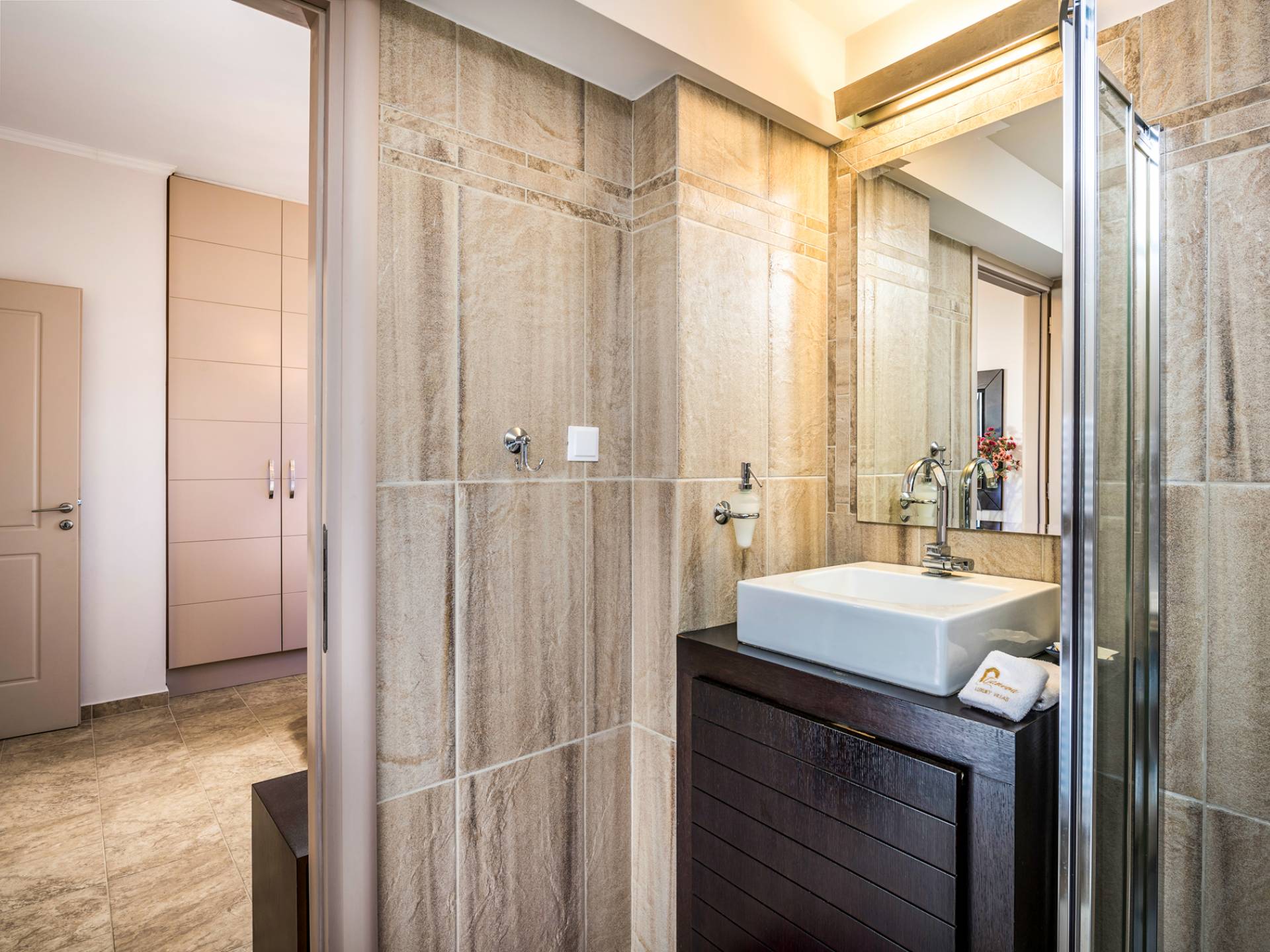 The walls are decorated with paintings inspired by the Minoan Palace. The perfect balance between modern and classical, the selection of high quality materials, the surrounding colours and hues, the spectacular view and the absolute calmness create an upscale atmosphere that guarantees a peaceful and pleasant stay.