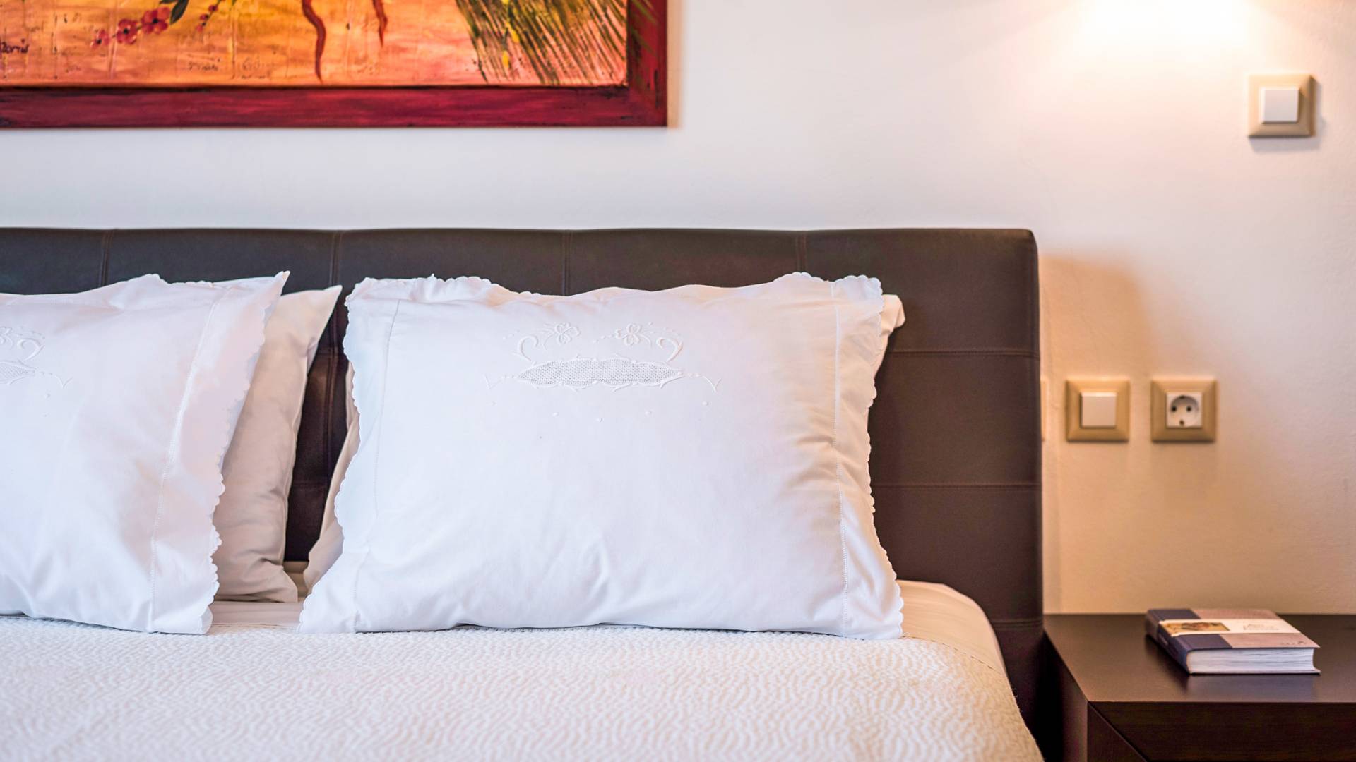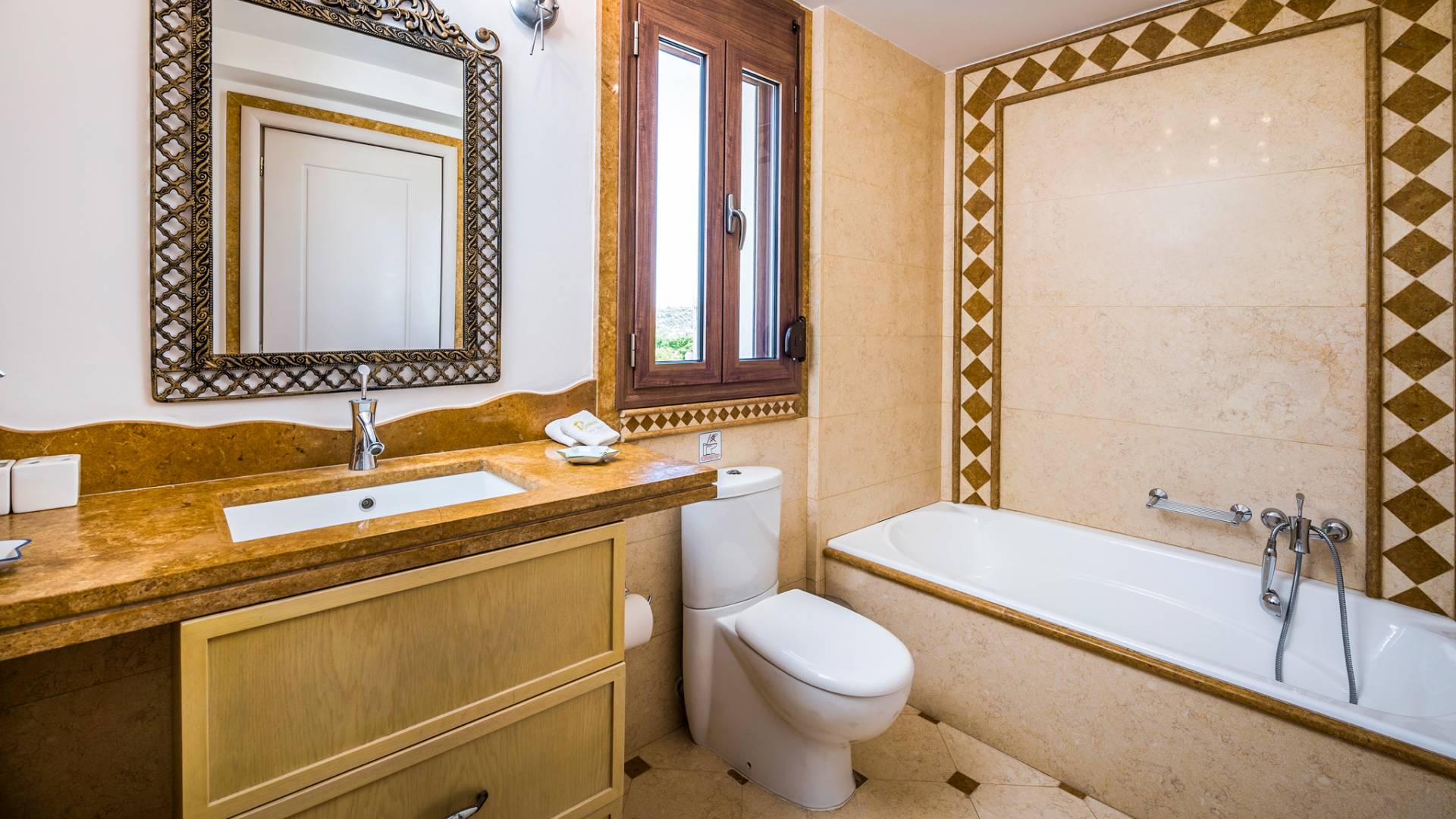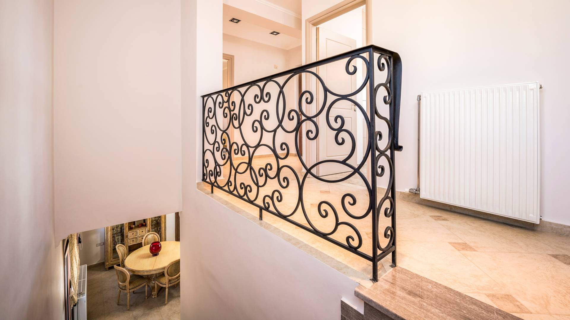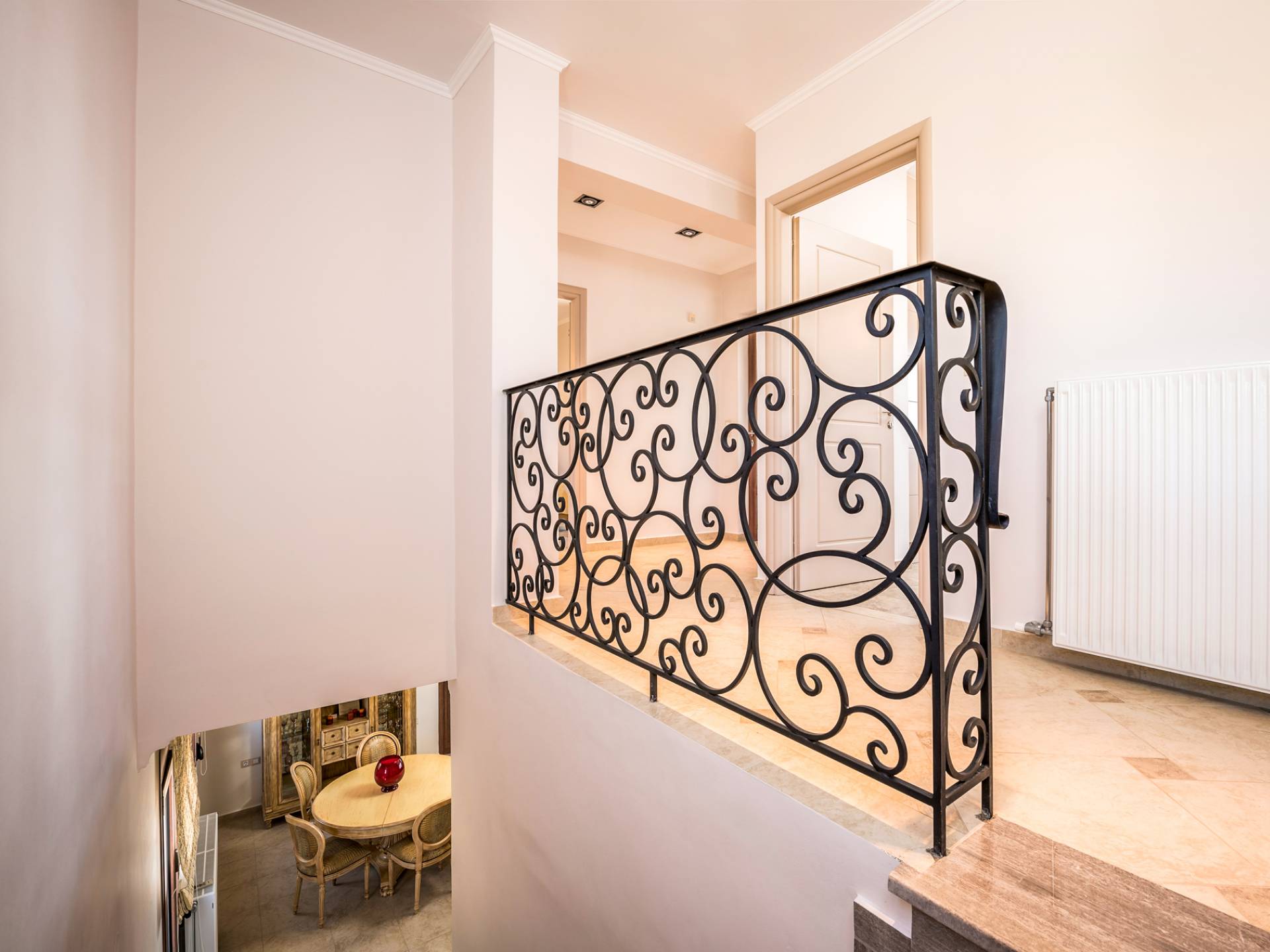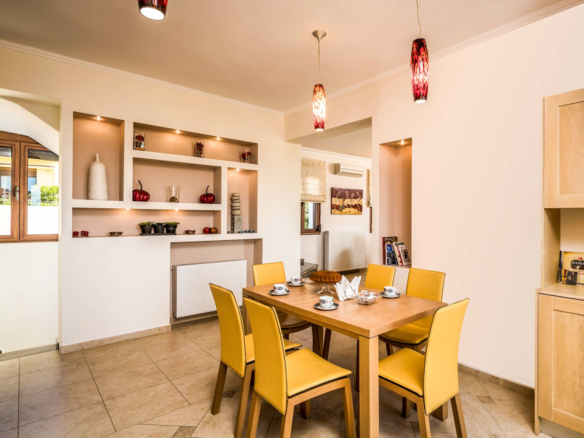 The walls are decorated with paintings inspired by the Minoan Palace. The perfect balance between modern and classical, the selection of high quality materials, the surrounding colours and hues, the spectacular view and the absolute calmness create an upscale atmosphere that guarantees a peaceful and pleasant stay.