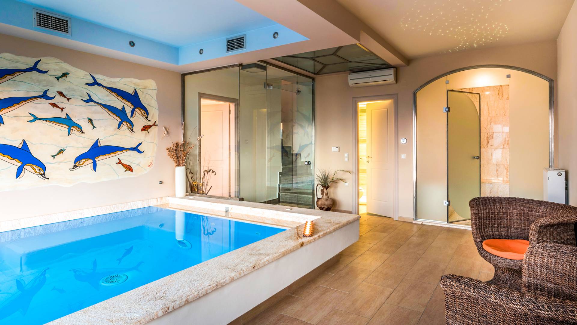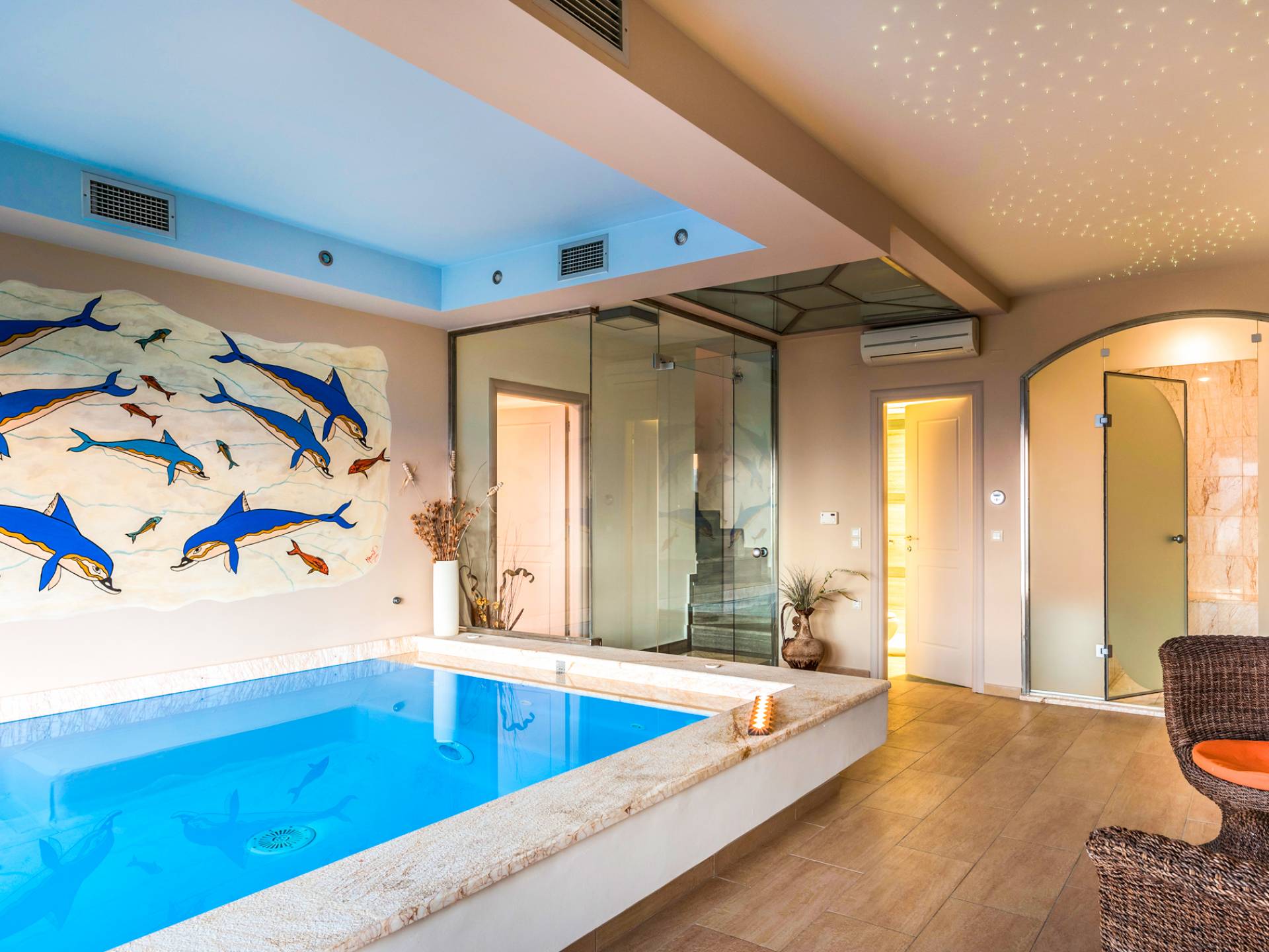 Color blue, sun and luxury, nothing can beat this combination. What else is there to ask for your vacation? Indulge yourself in a heated private pool in the coziness of your own villa, either an indoor or outdoor one. The water is healing and therapeutic…