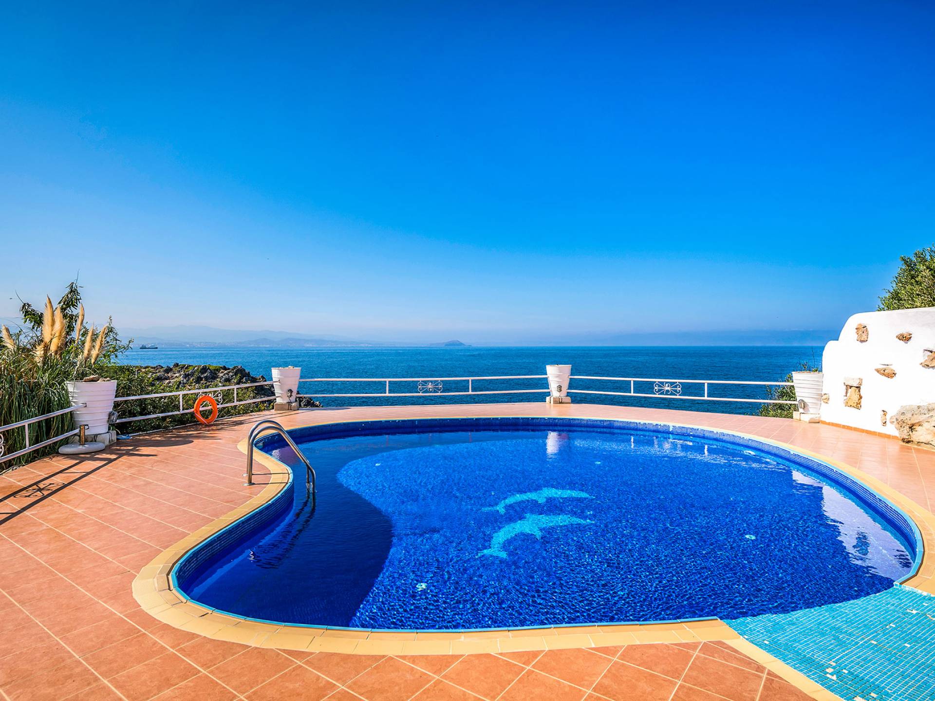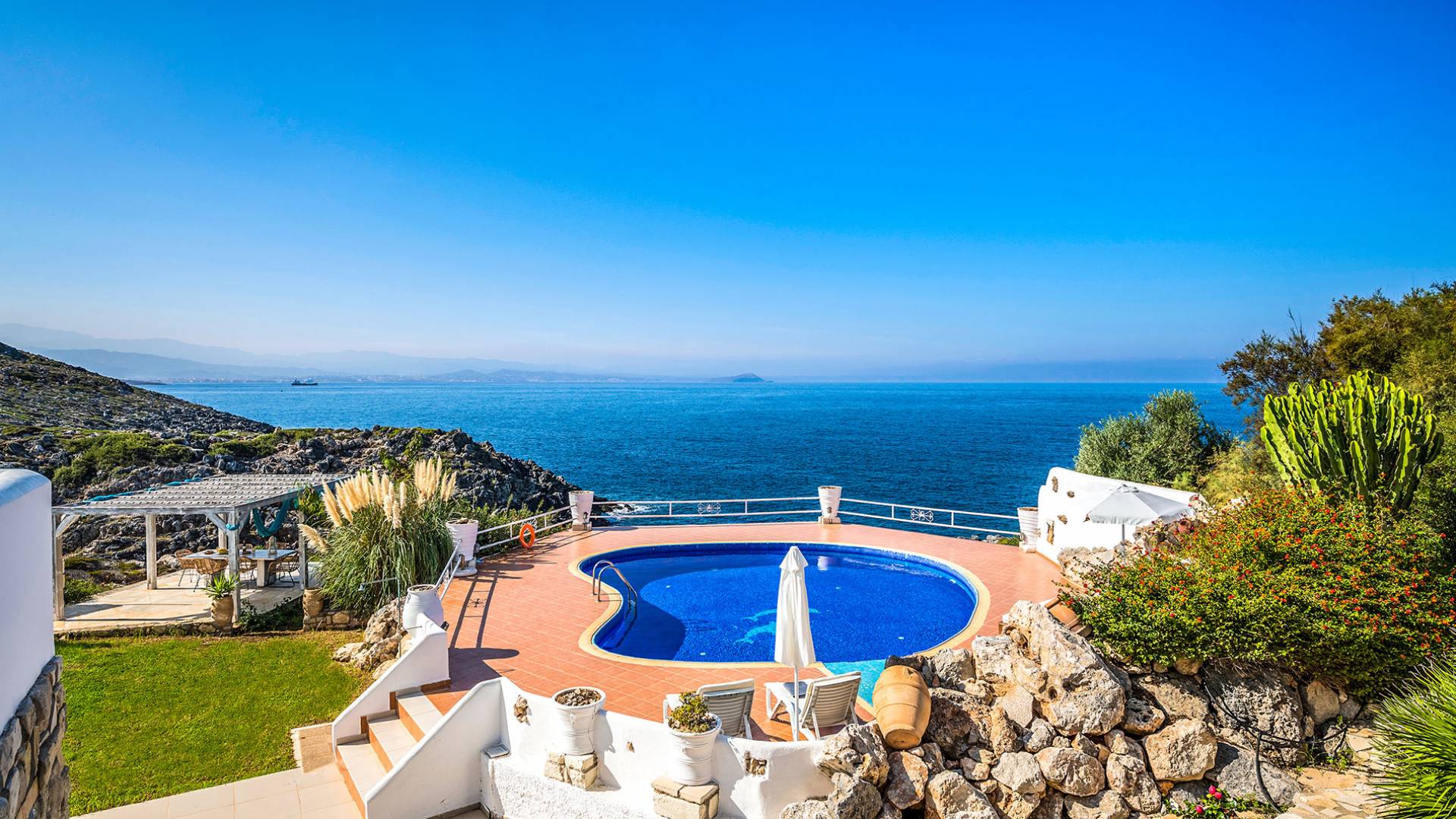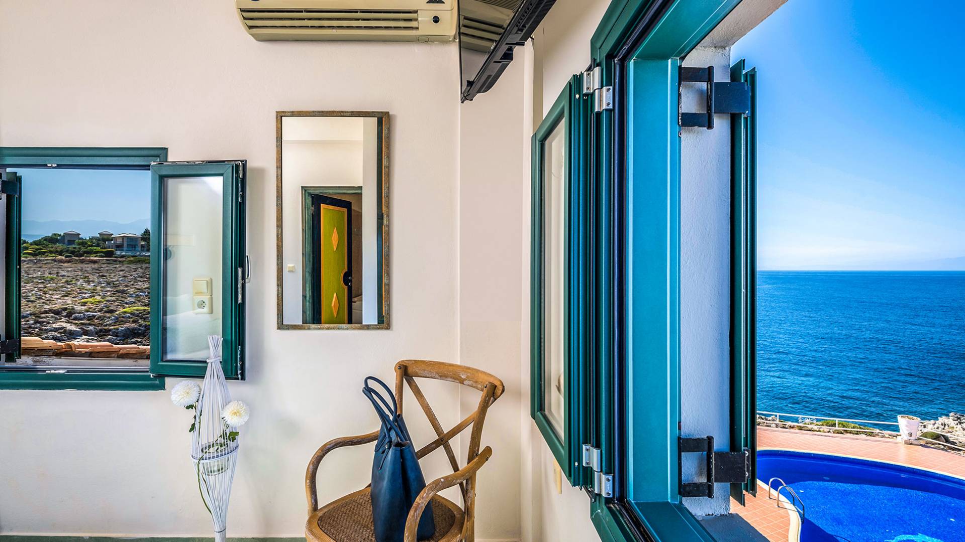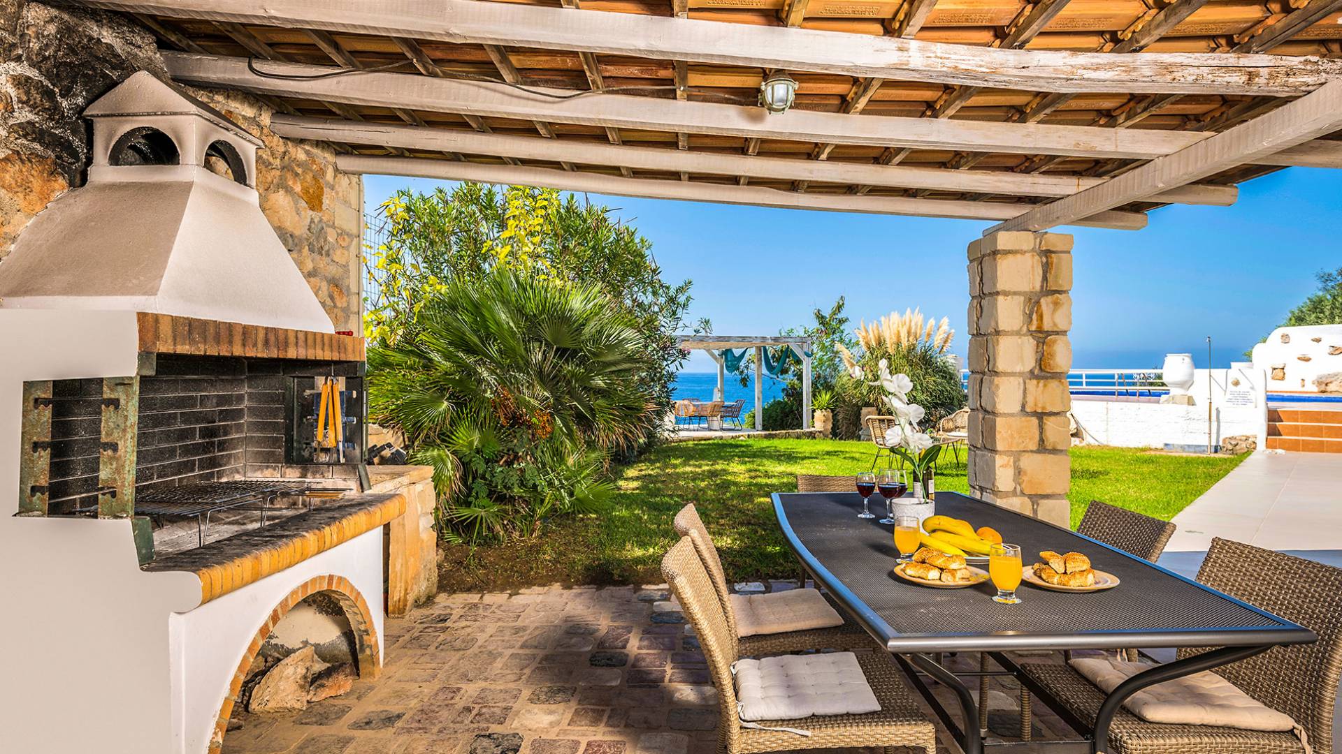 An open plan, fully equipped kitchen is placed on the ground floor along with the master living room. There is also a second kitchen at the pool level and this one can prove extremely useful for the preparation of meals when the residents are relaxing by the pool or when they want to have a barbeque evening. The surroundings of Villa Fedra Chania and its outdoor spaces will certainly amaze the visitors with their wonderful flowers and herbs, the lawn near the big built-in barbeque and the big dining area. But the best of all is the pool which stands exactly above the sea thus making the sunset from villa Fedra so magical that it is difficult to be described in words. The major advantage of the villa is that it lies on three levels and for this exact reason it allows guests to have privacy while enjoying their vacation with family and friends. Children and adults will be equally pleased by their stay and by the sense of freedom that the villa offers them.