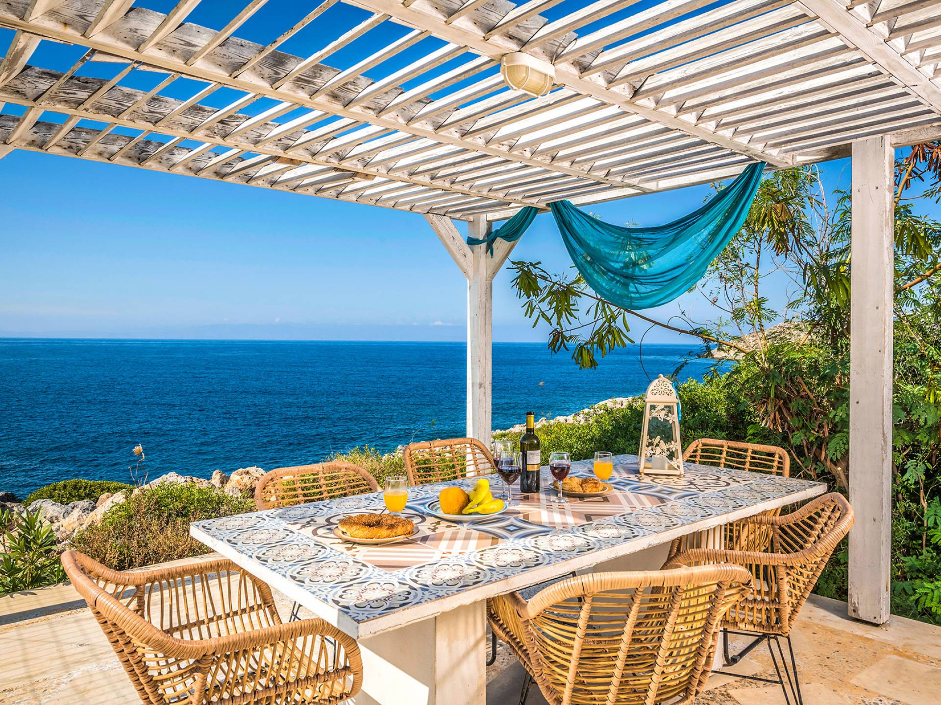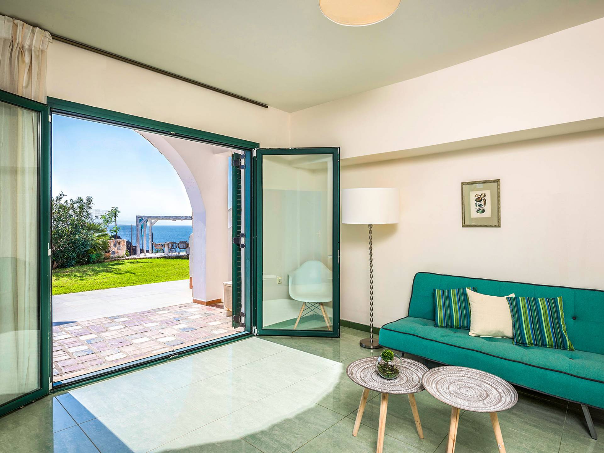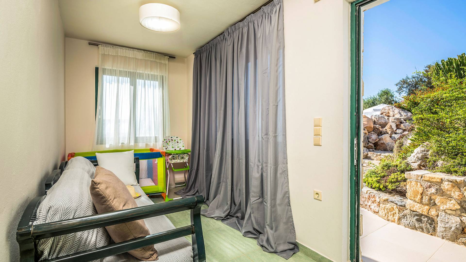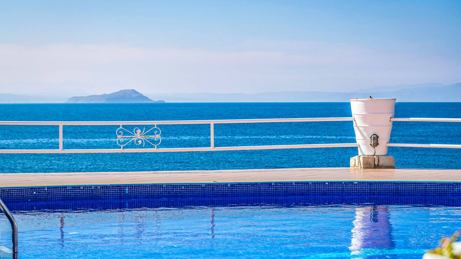 An open plan, fully equipped kitchen is placed on the ground floor along with the master living room. There is also a second kitchen at the pool level and this one can prove extremely useful for the preparation of meals when the residents are relaxing by the pool or when they want to have a barbeque evening. The surroundings of Villa Fedra Chania and its outdoor spaces will certainly amaze the visitors with their wonderful flowers and herbs, the lawn near the big built-in barbeque and the big dining area. But the best of all is the pool which stands exactly above the sea thus making the sunset from villa Fedra so magical that it is difficult to be described in words. The major advantage of the villa is that it lies on three levels and for this exact reason it allows guests to have privacy while enjoying their vacation with family and friends. Children and adults will be equally pleased by their stay and by the sense of freedom that the villa offers them.