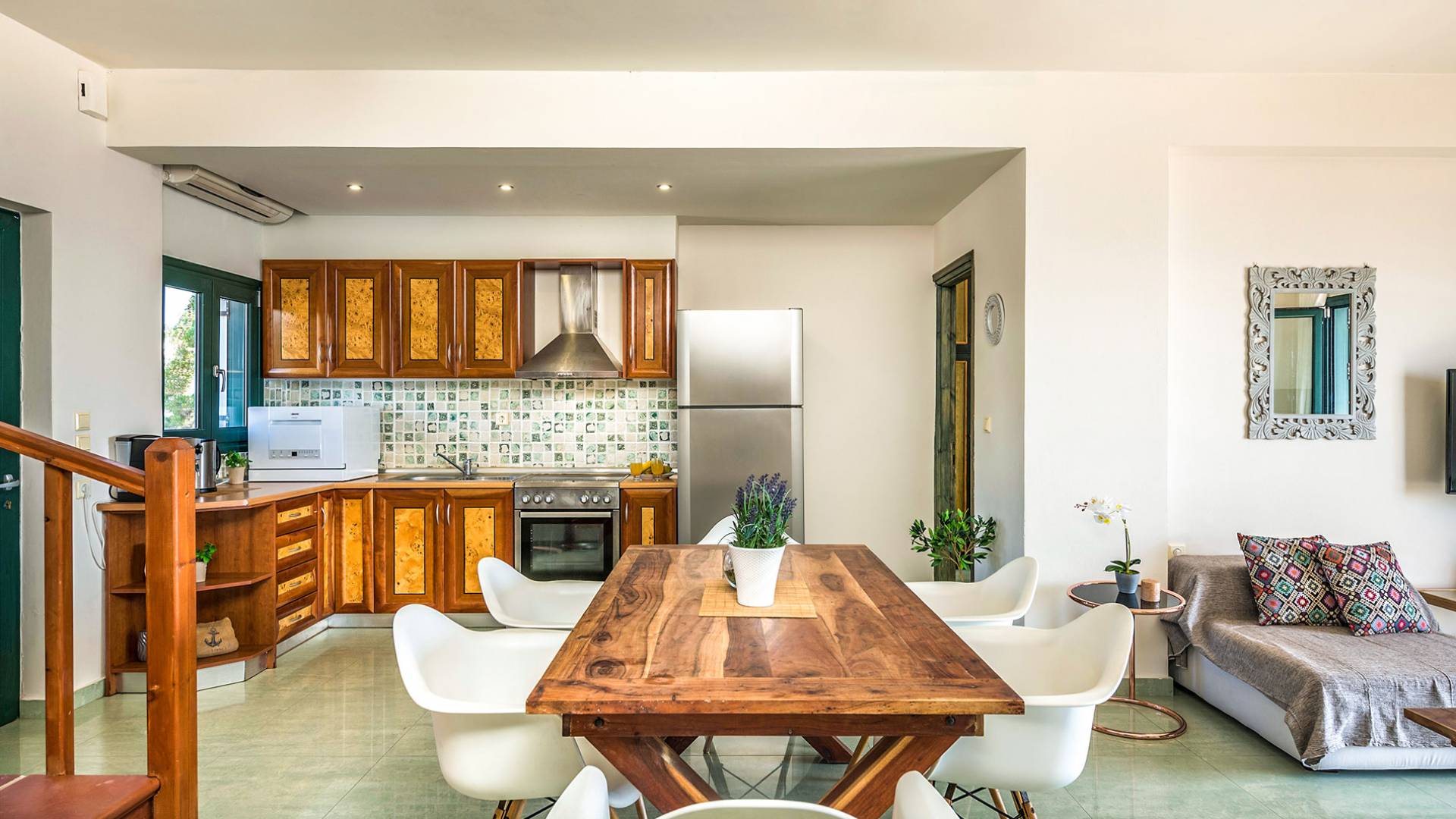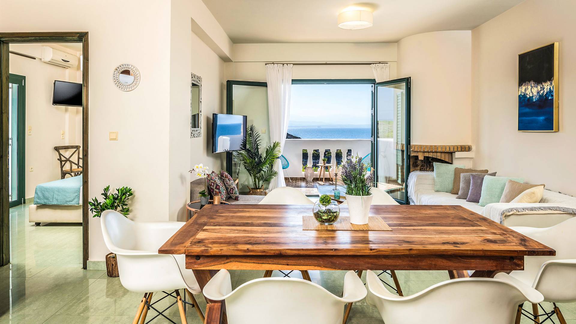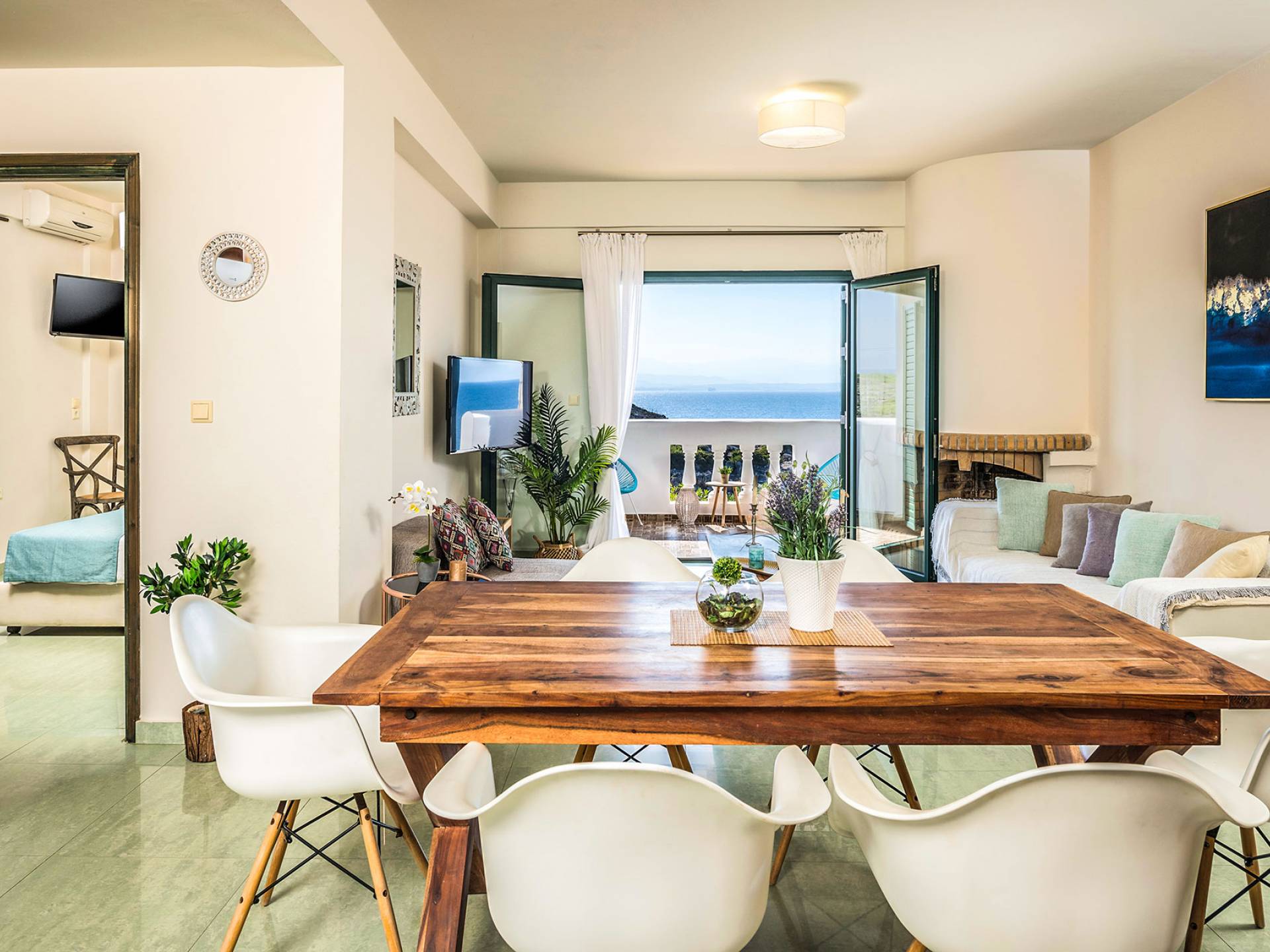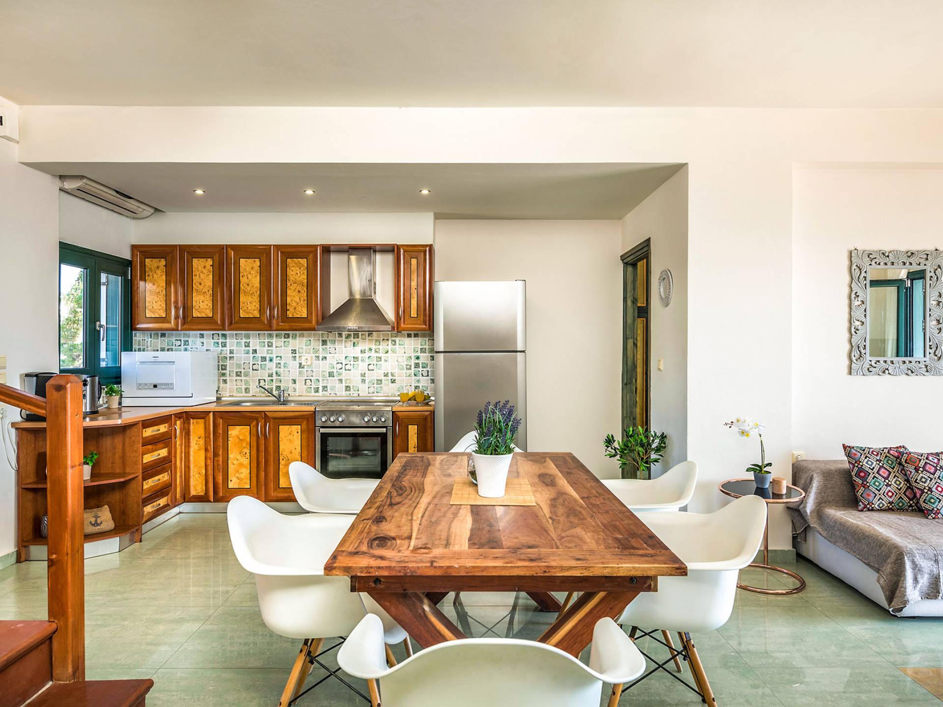 The location of the villa and superb views were magnificent. The fridge was full of all essentials when we arrived and there were lots of extra goodies too. The owner was very helpful and went. The village of Tersanas was a friendly place to eat and shop with lovely restaurants and shops. The airport is also just 10 minutes away. The villa has modern design and spacy rooms that we loved. I would highly recommend this villa.
